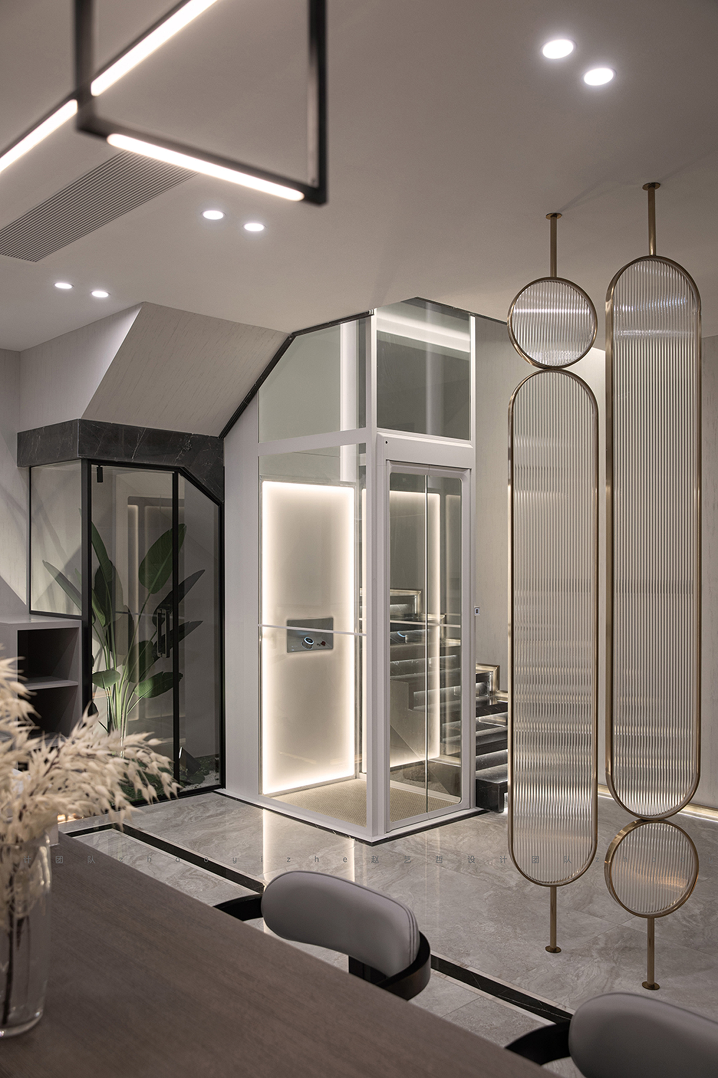 地下室设计运用艺术笔法,化繁为简。光滑的大理石墙面与地面能够充分反射光线,让地下室更加通透明亮。静谧的冷光开辟了安静的一隅,在此可逃开外在的喧嚣,静置时间。