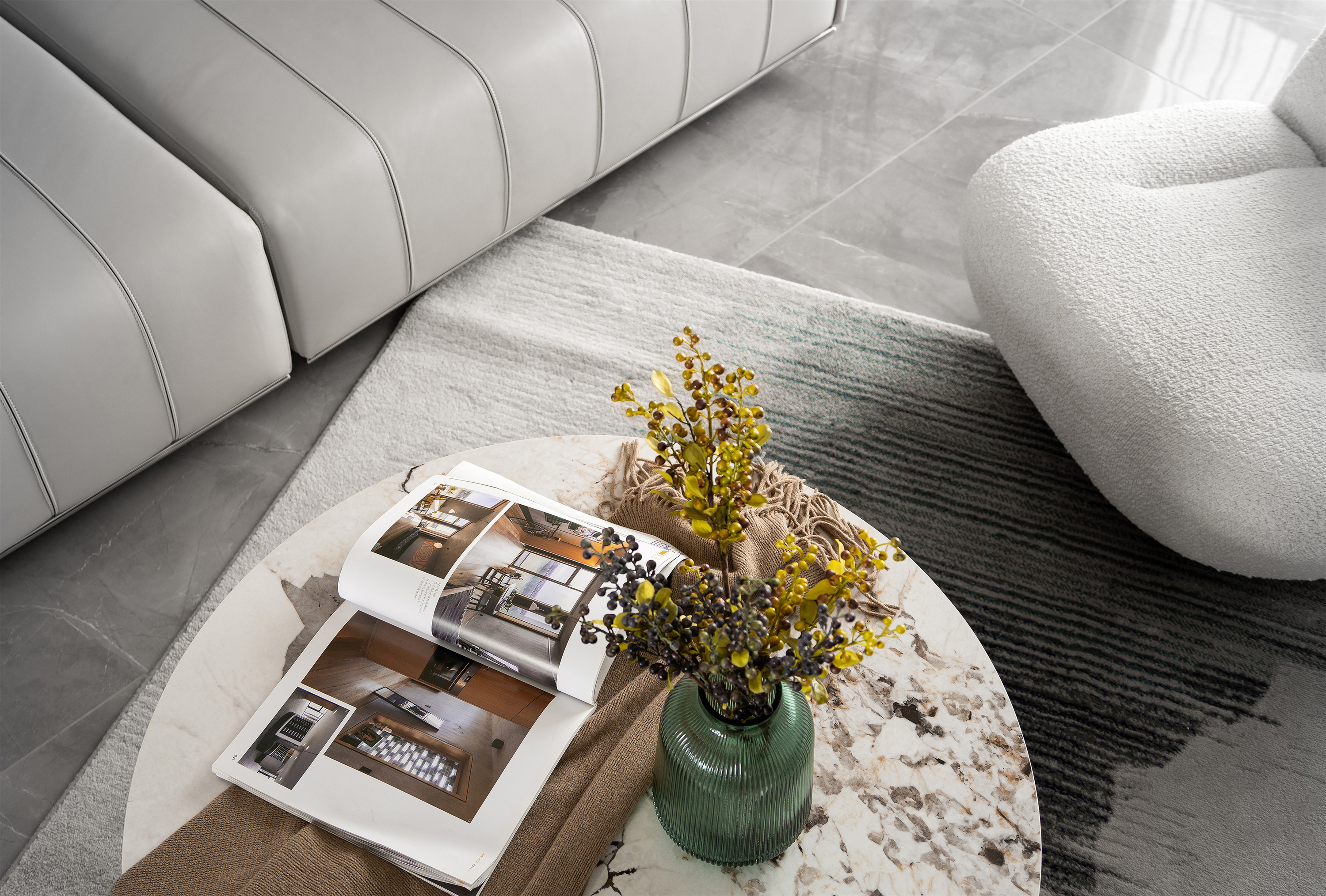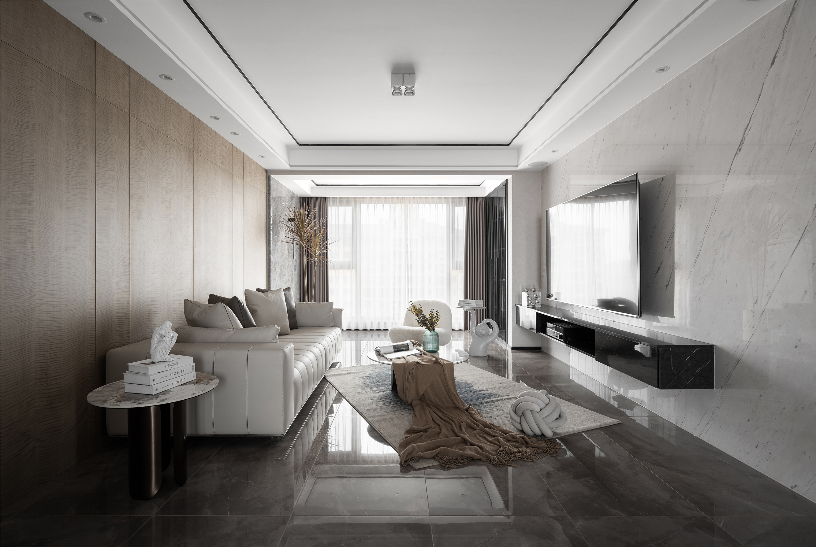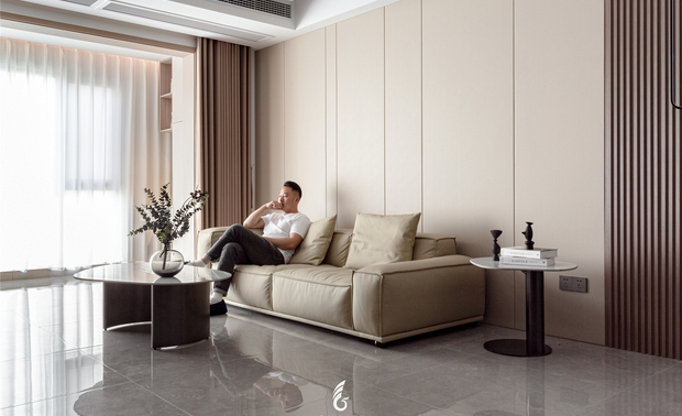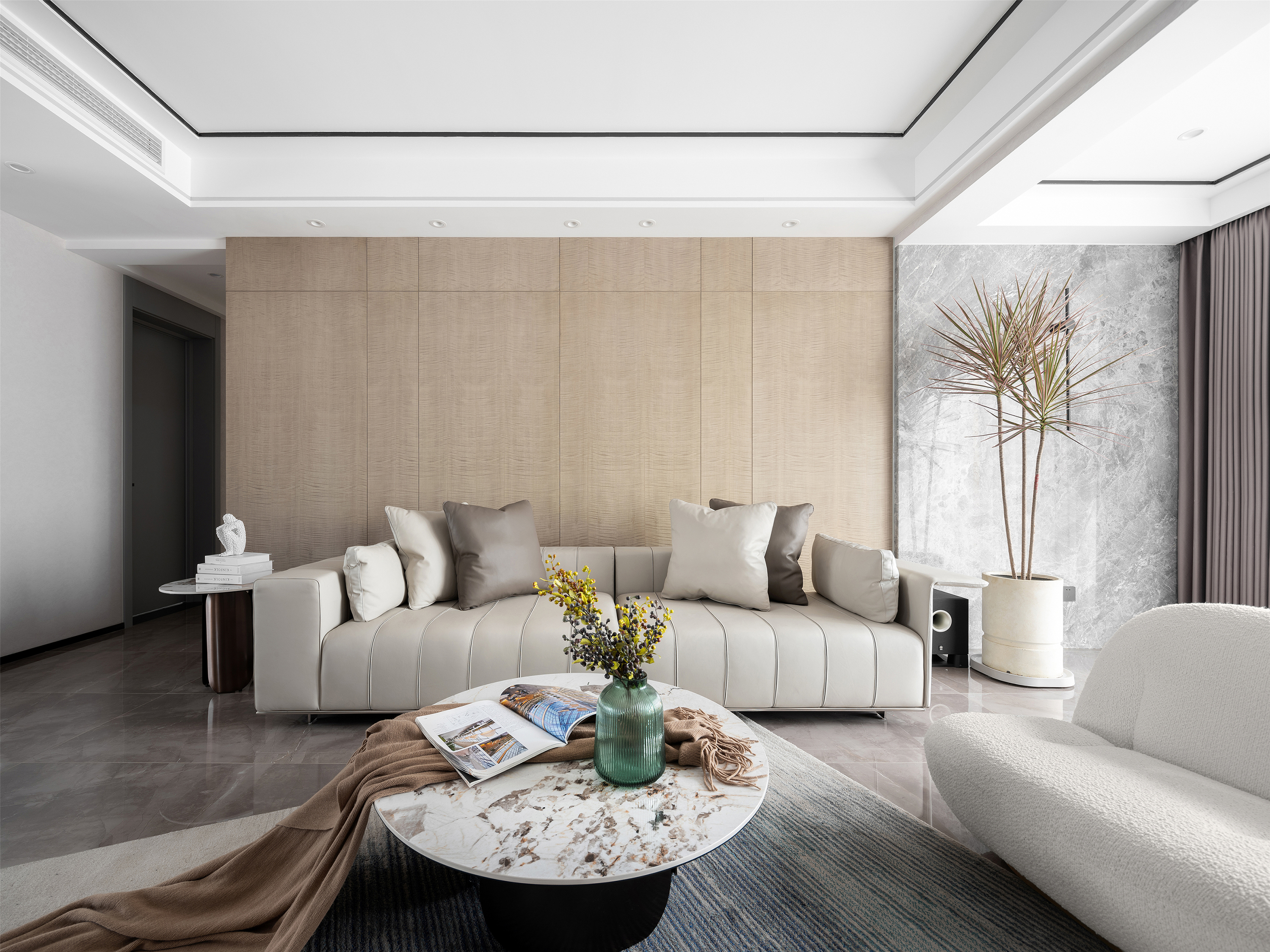 灰色奠定空间宁静的基调, 米白色意式沙发同色系的单人沙发 与大理石纹茶几与整体氛围和谐共生, 绿植、摆件...以细微处的变动打破沉闷,光影穿梭于室内, 与纯粹的木色一同展现出惬意安然的姿态。