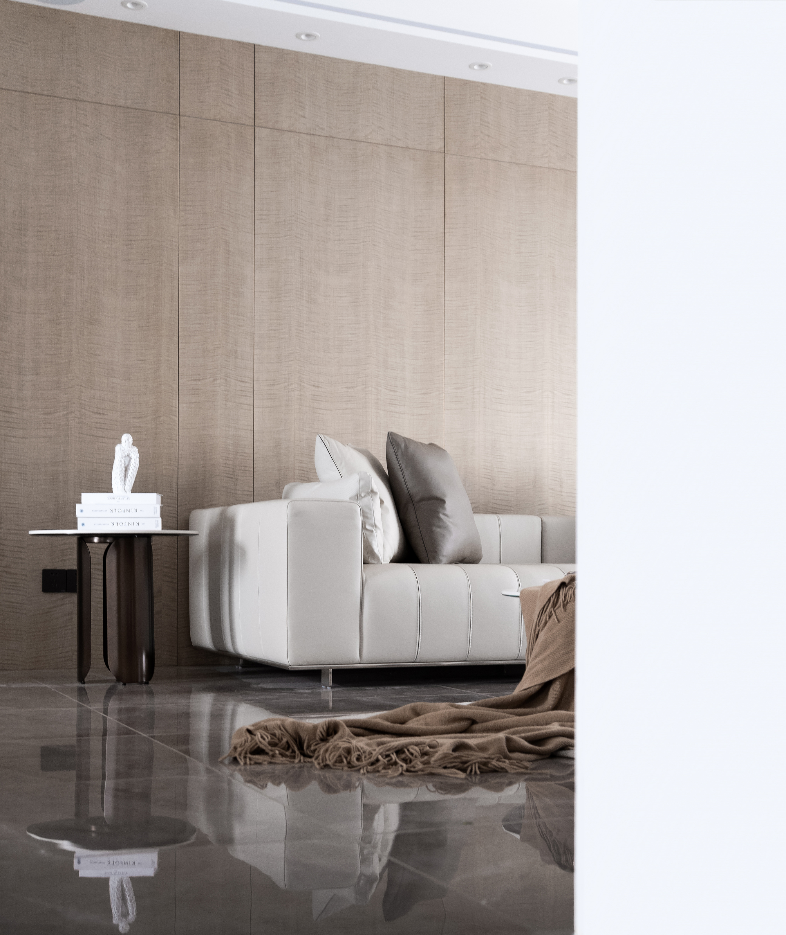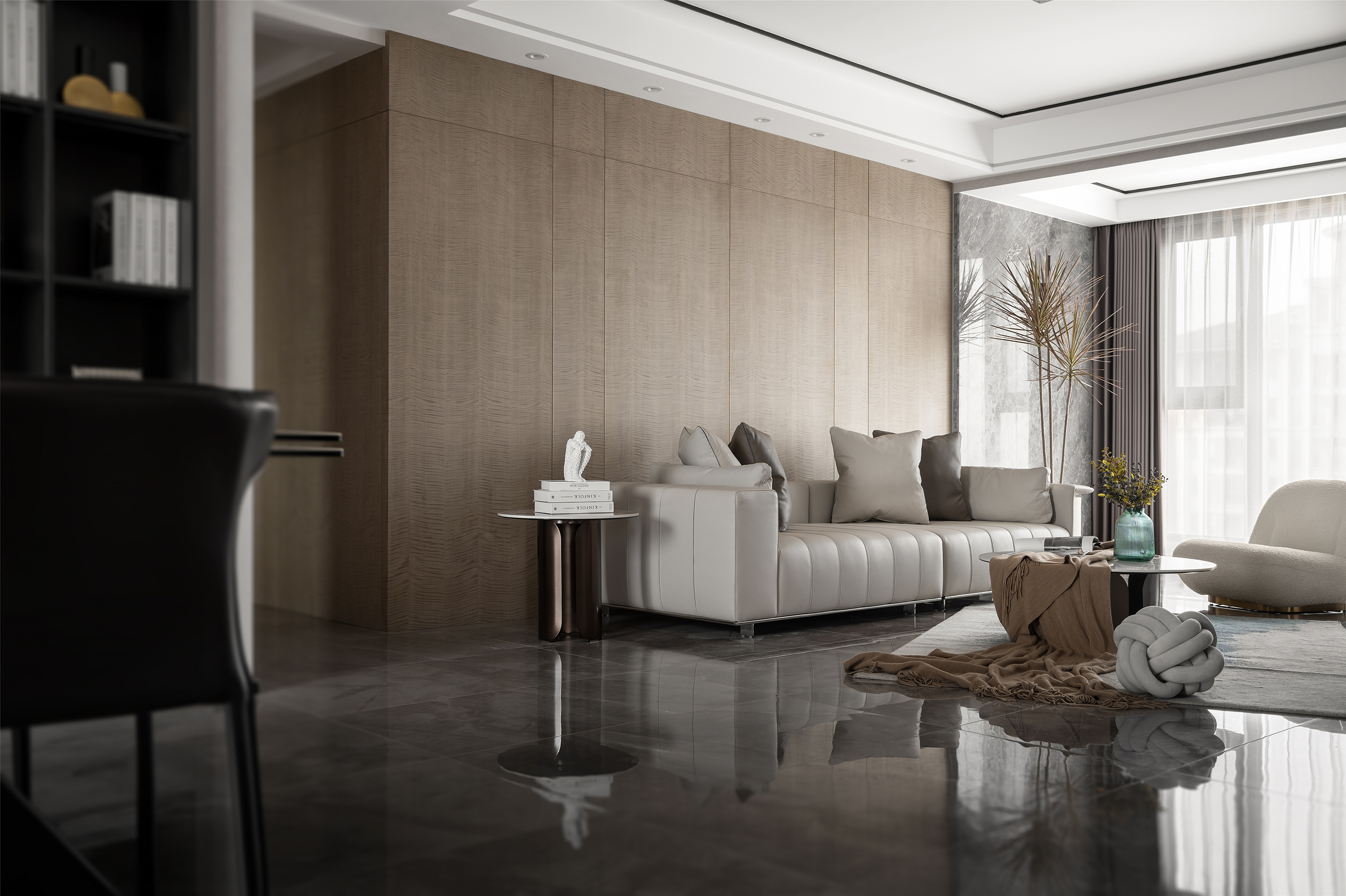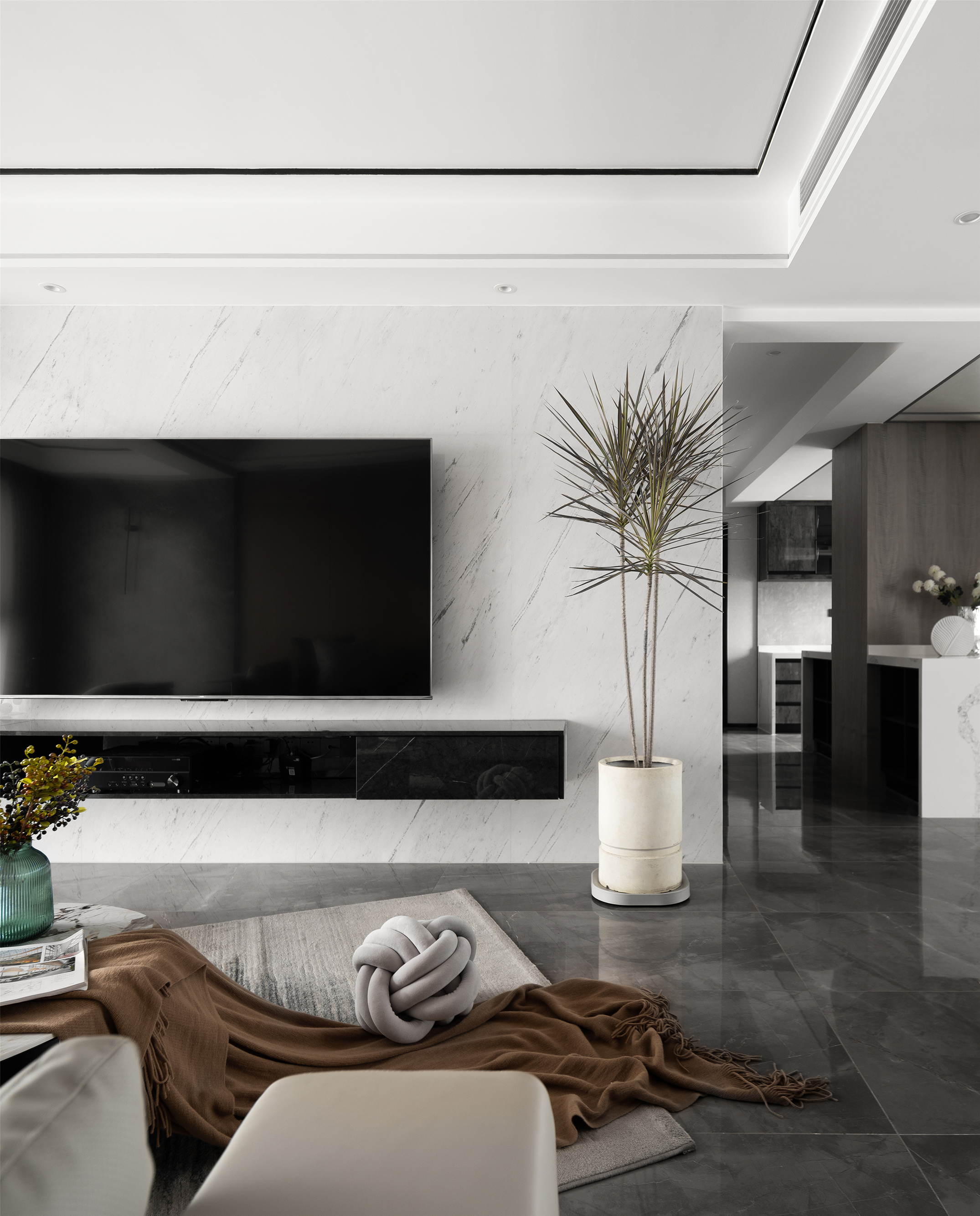 灰色奠定空间宁静的基调, 米白色意式沙发同色系的单人沙发 与大理石纹茶几与整体氛围和谐共生, 绿植、摆件...以细微处的变动打破沉闷,光影穿梭于室内, 与纯粹的木色一同展现出惬意安然的姿态。