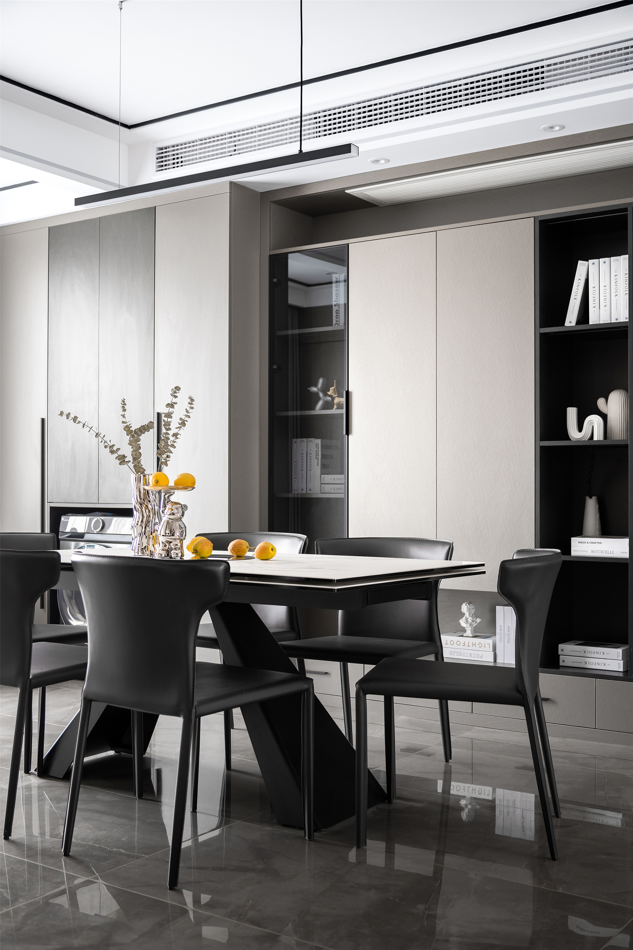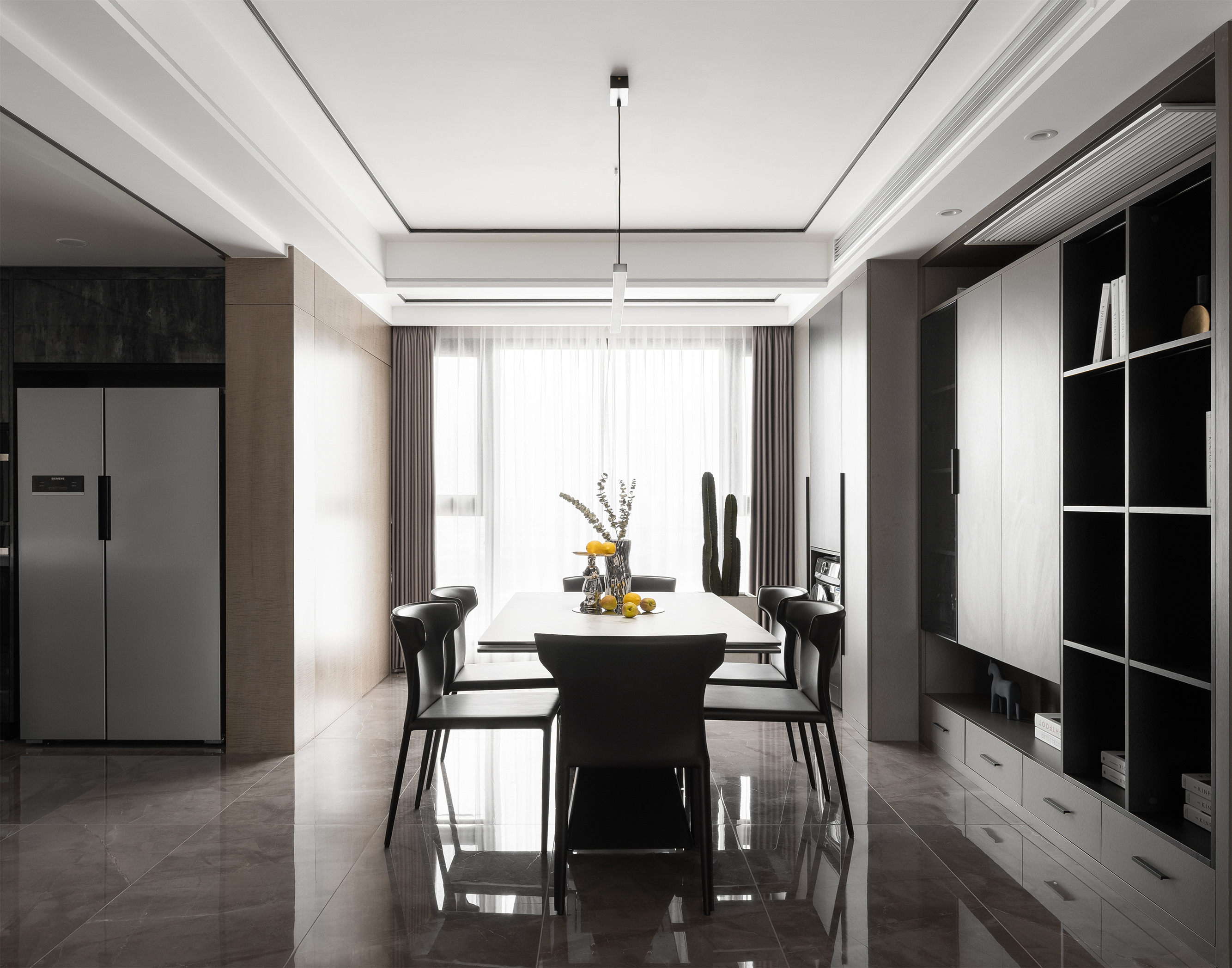 通透开阔的空间内, 黑白配色的餐桌椅搭配着同色系后现代极简个性吊灯, 温润的木作、葱茏的绿意,共同承载起餐厅的氛围营造。