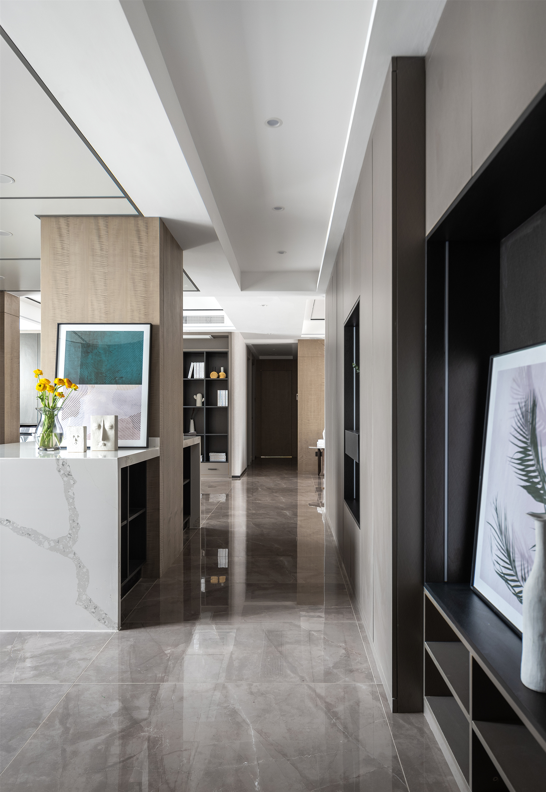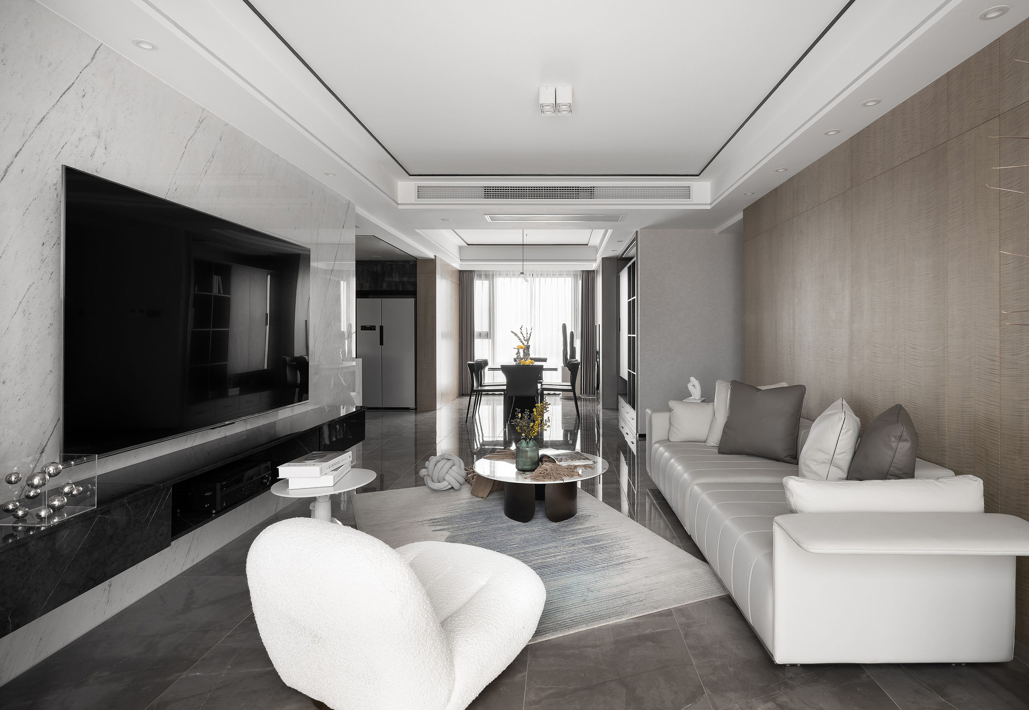 屋主心声:想要换一处稍微大一点的房子,是在我们二人有了孩子之后一直在计划的事情。源自多年的工作影响,希望居家氛围惬意自在,有着都会现代氛围格调,但一切的出发点又必须基于“围绕家庭日常生活上开展。” 在具有鲜明的现代风格色调的基础上,融合大理石材、木材、艺术漆、玻璃等多种材质,通过细致的布置,让空间富有阔达的精神气质。加强屋主对居住空间的认同感,在实用性与格调之间找到恰当的平衡,与孩子一起,完成一场成长中的陪伴与自我发现。 将住宅设计回归居住本身,以追求美学与舒适感的统一。 淡雅的素色空间里,流畅的曲线装饰带来更具起伏的韵律与节奏,与家具软装一同在温润的木色基底上,绘制出宁静和谐的画卷。