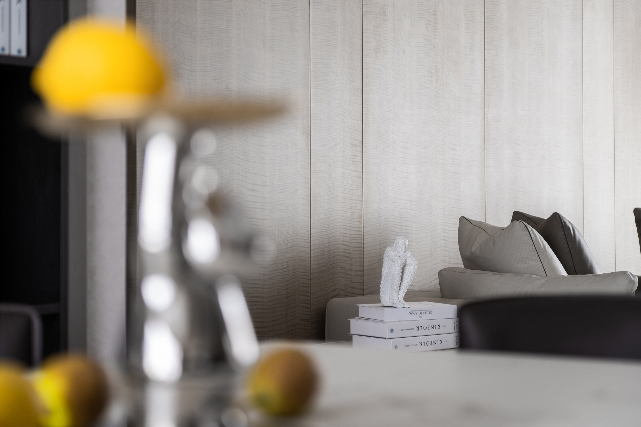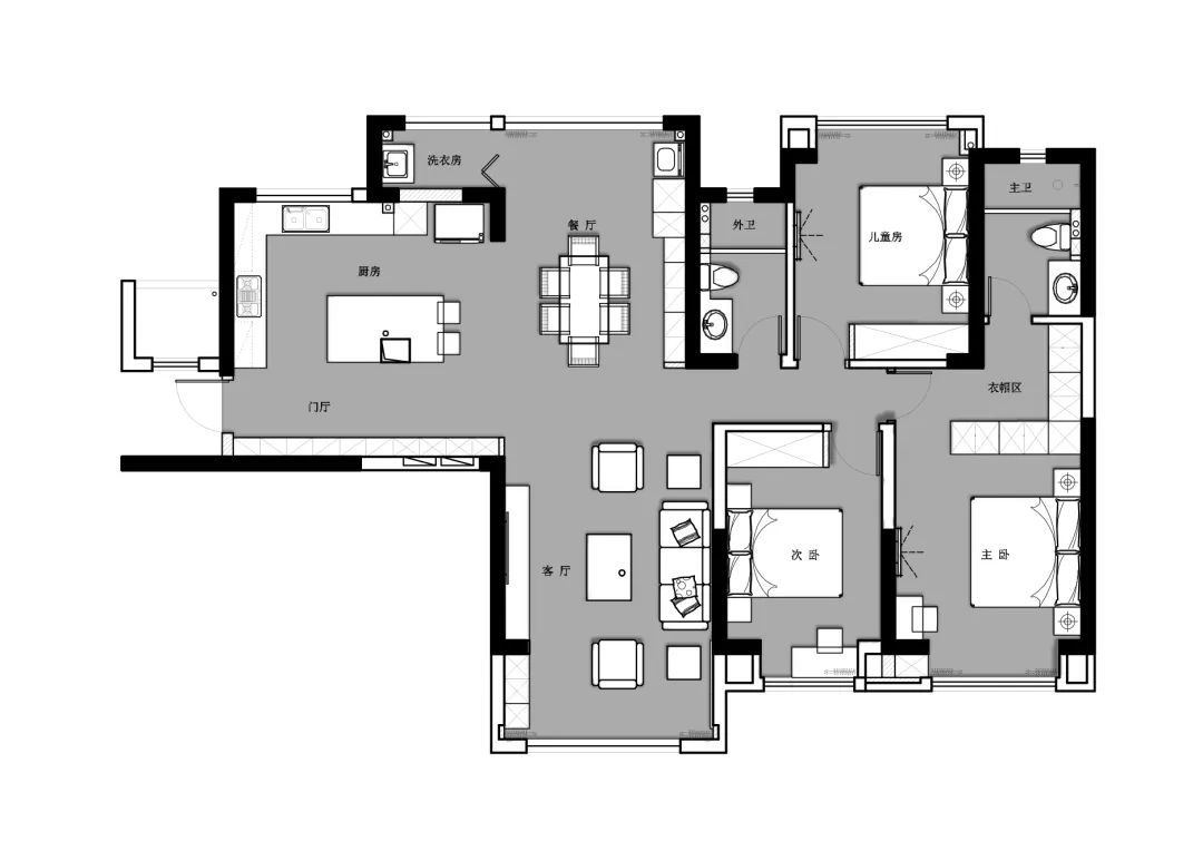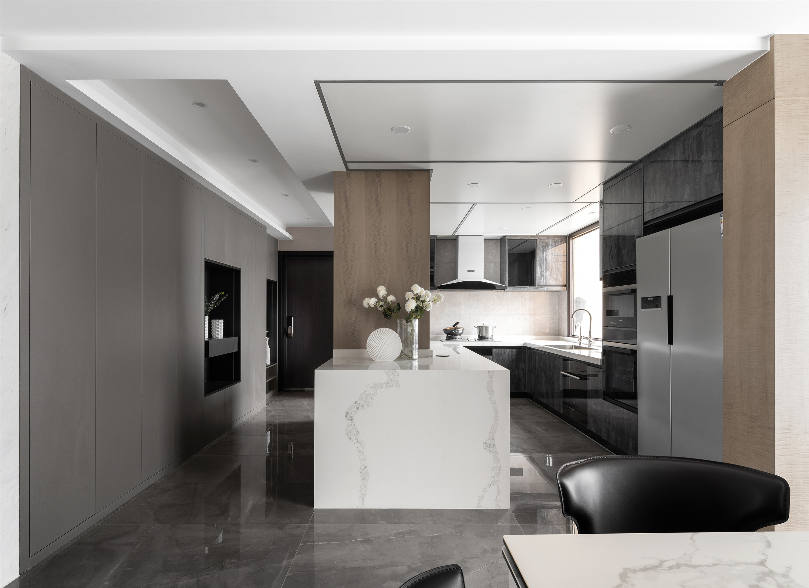 视线转换,餐厅与西厨,灰色与木色穿插组合; 开放式的中西厨与餐厅连为一个整体, 嵌入烤箱、冰箱等家电,以令人愉悦的美学方式整合空间。 素灰色的基底铺陈出简约的气质,酷感十足的黑灰色系, 呈现出极具质感的绅士派头。 长形白色的岛台让餐厨空间动线灵活流畅, 令空间多了丝不拘一格的随性。