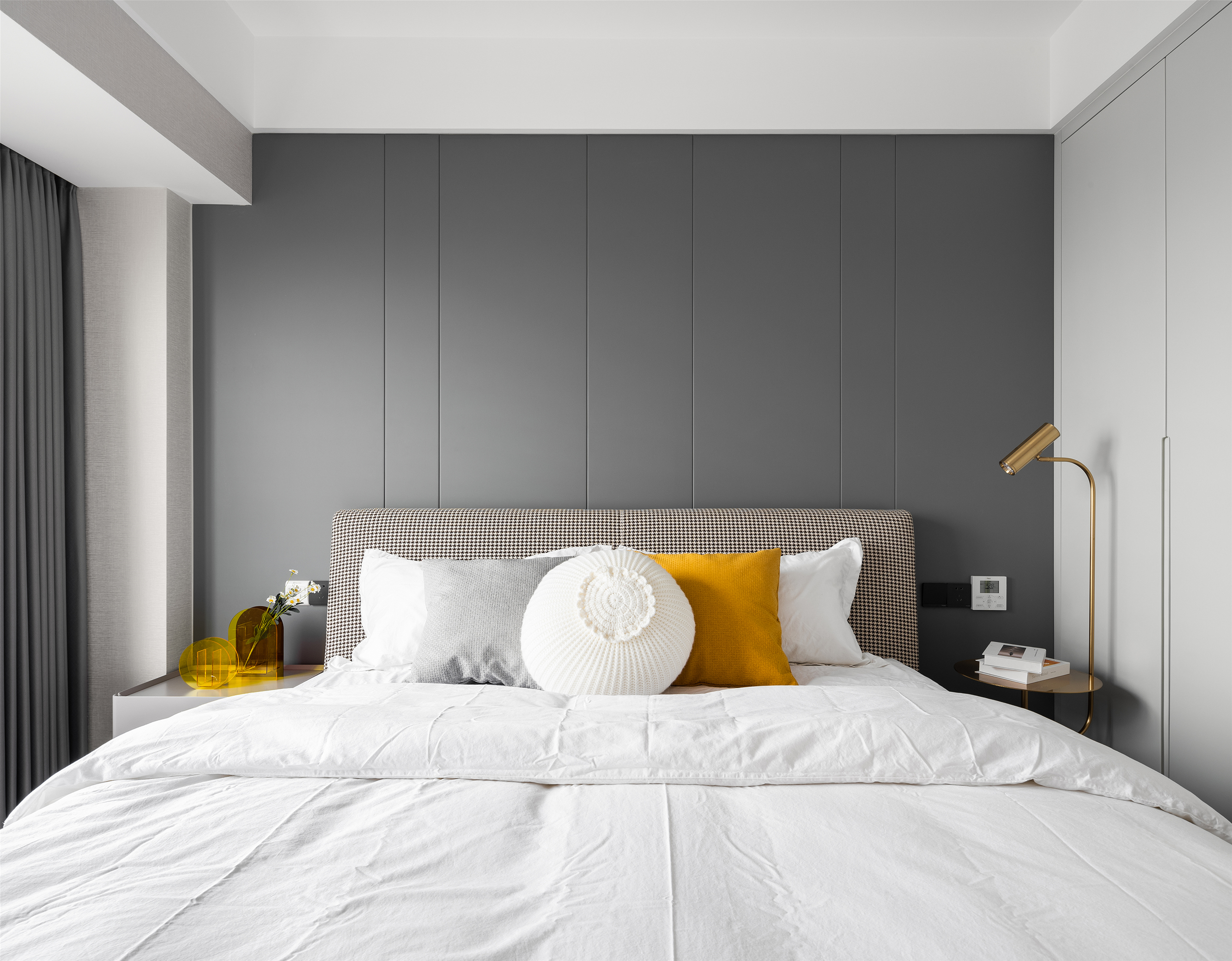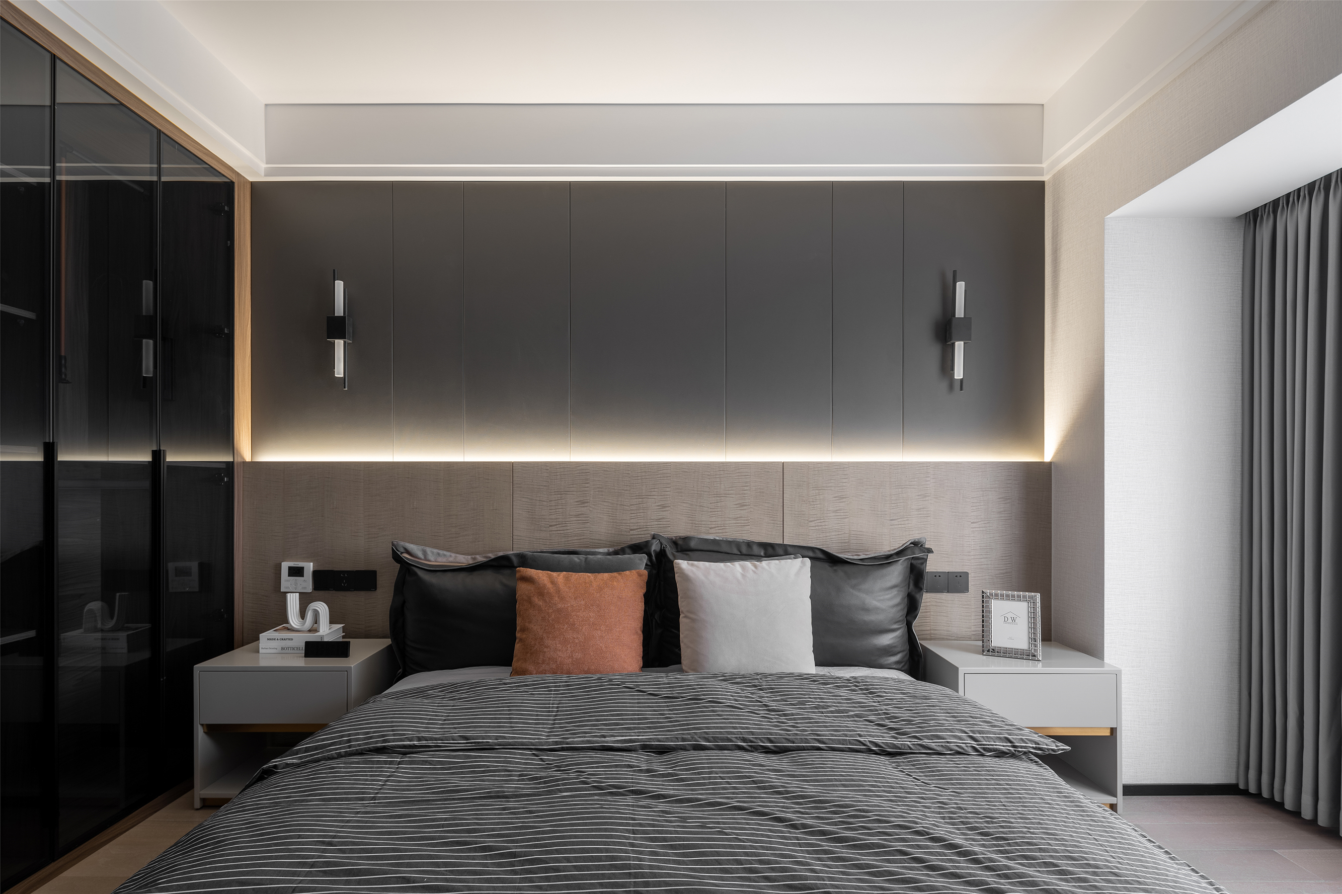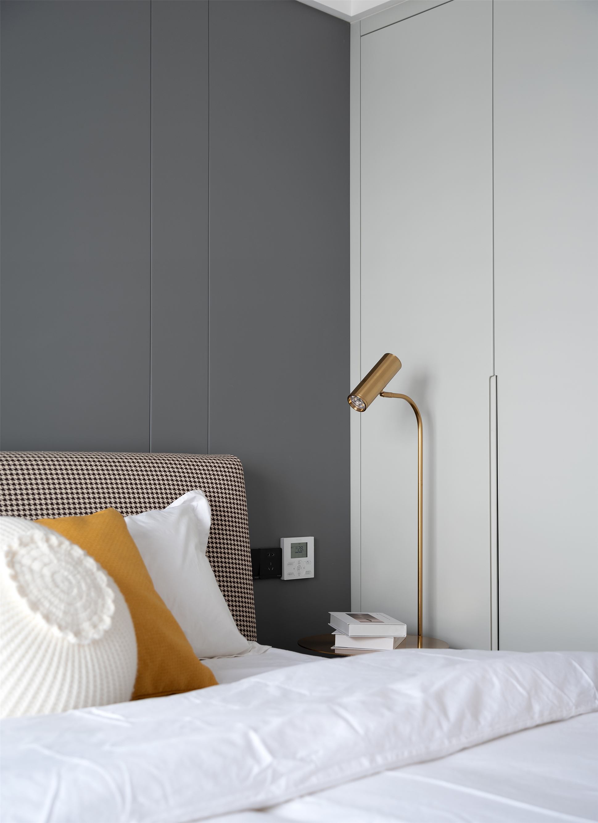 主卧,稍显低调的高级灰与质朴的木材搭配起来, 总是这样默契,经久耐看。