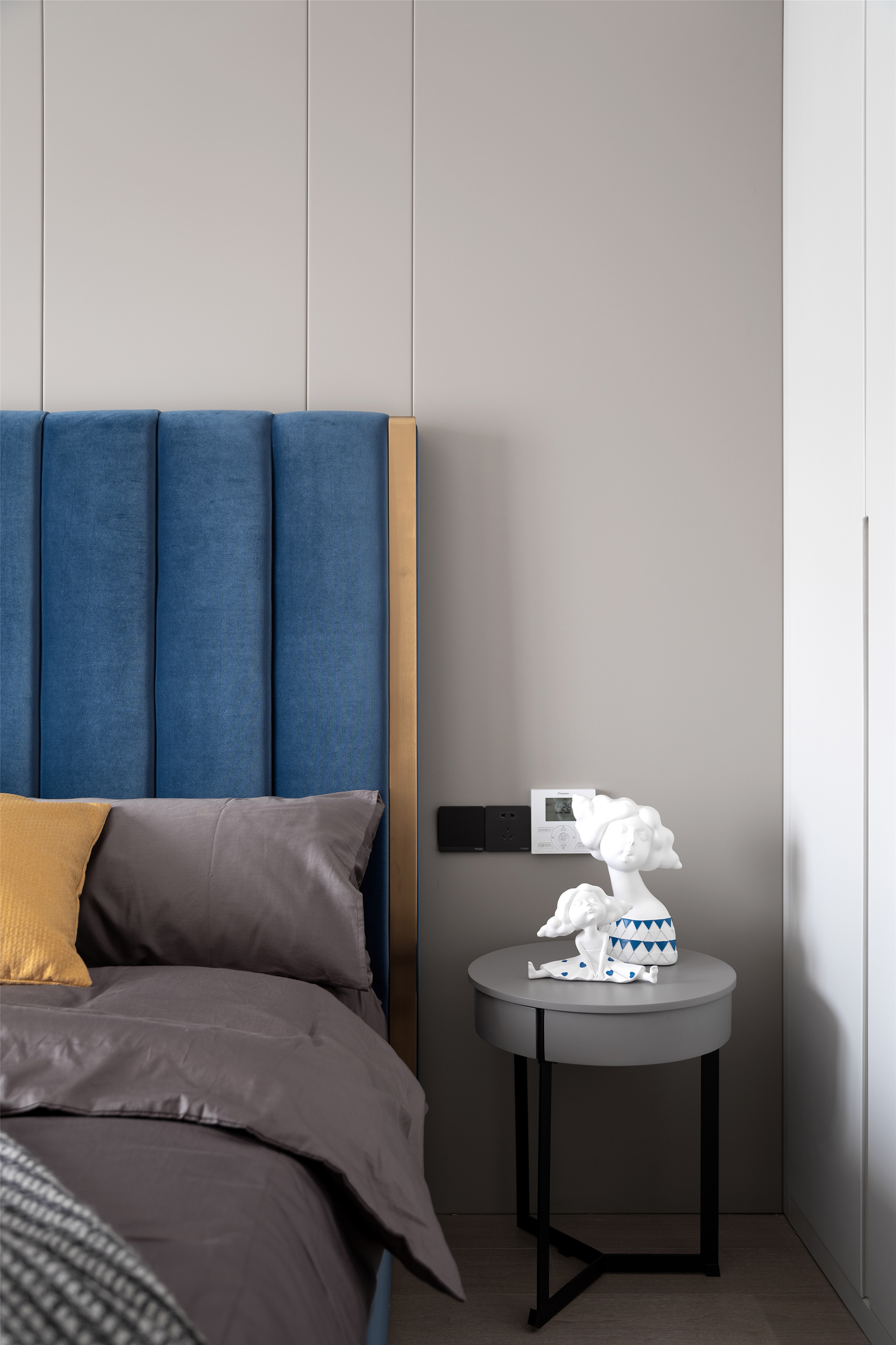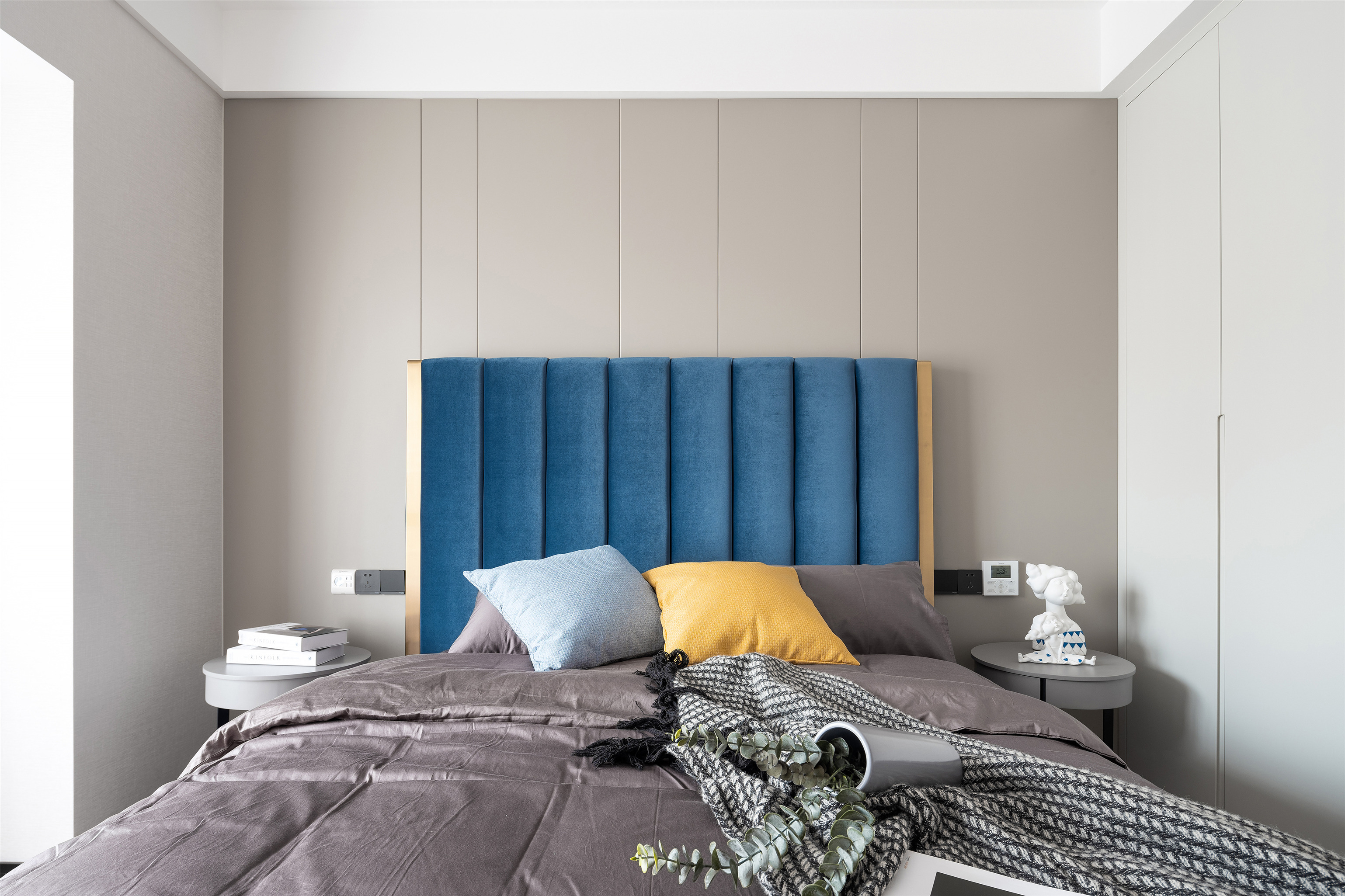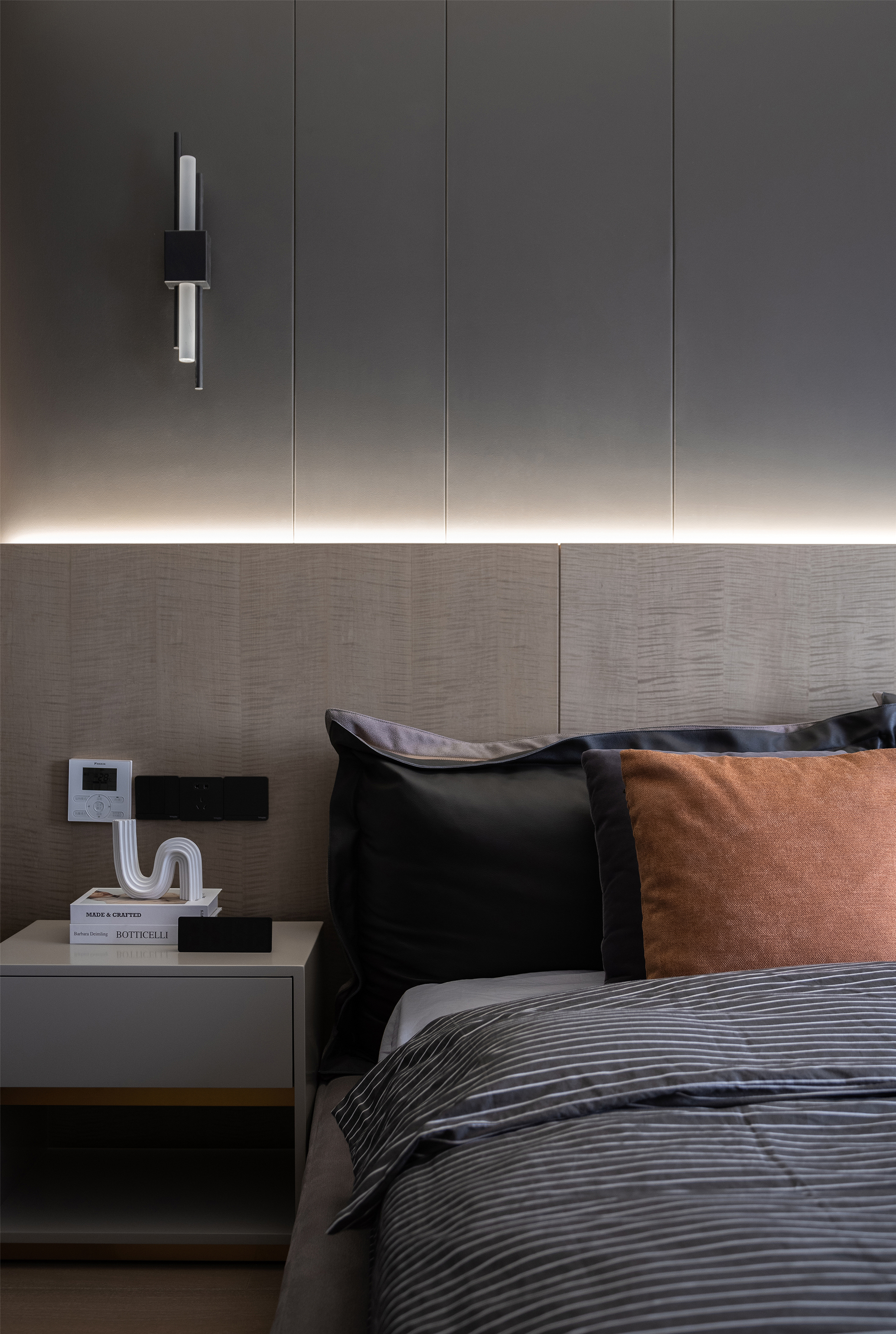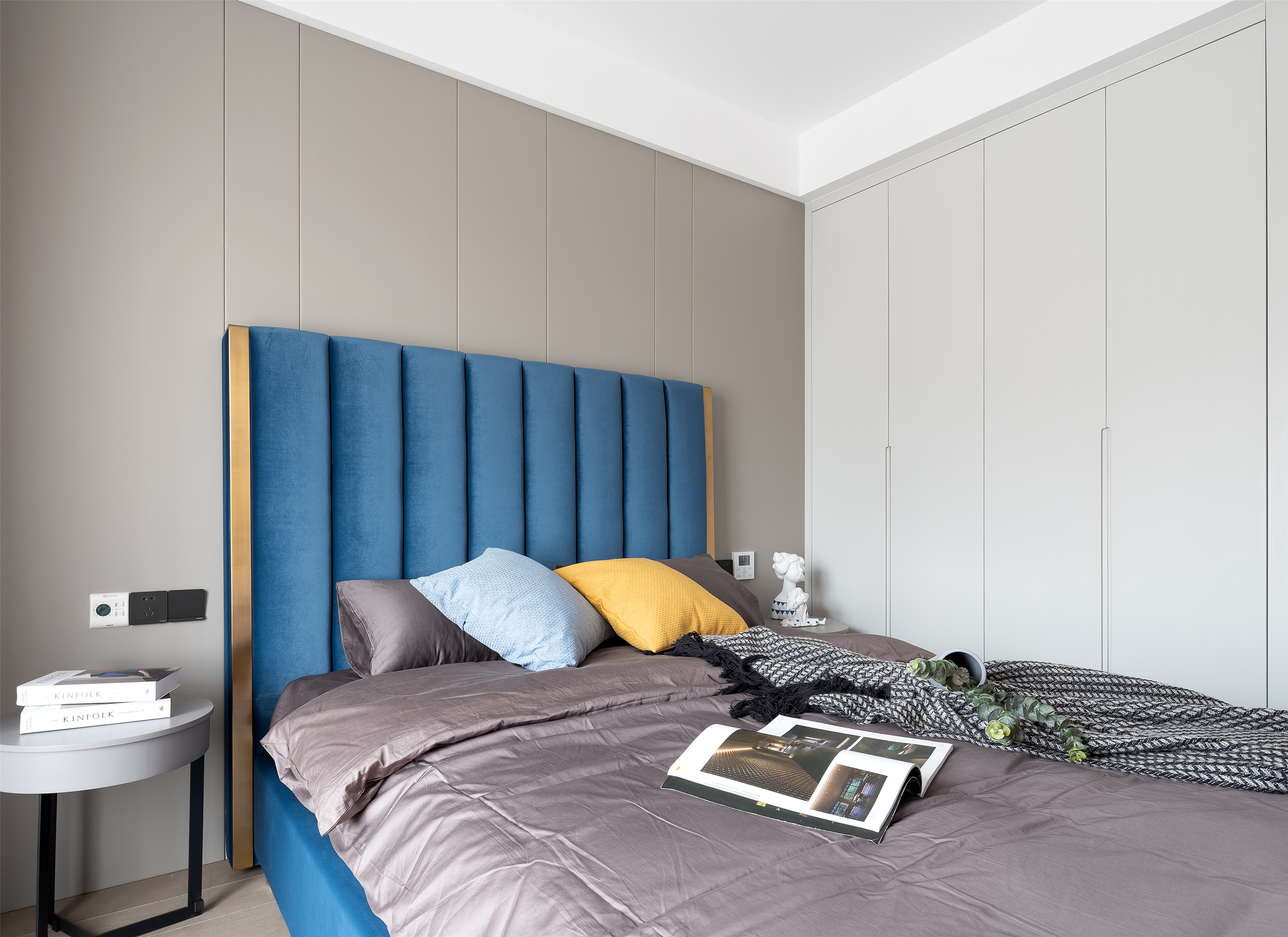 主卧,稍显低调的高级灰与质朴的木材搭配起来, 总是这样默契,经久耐看。