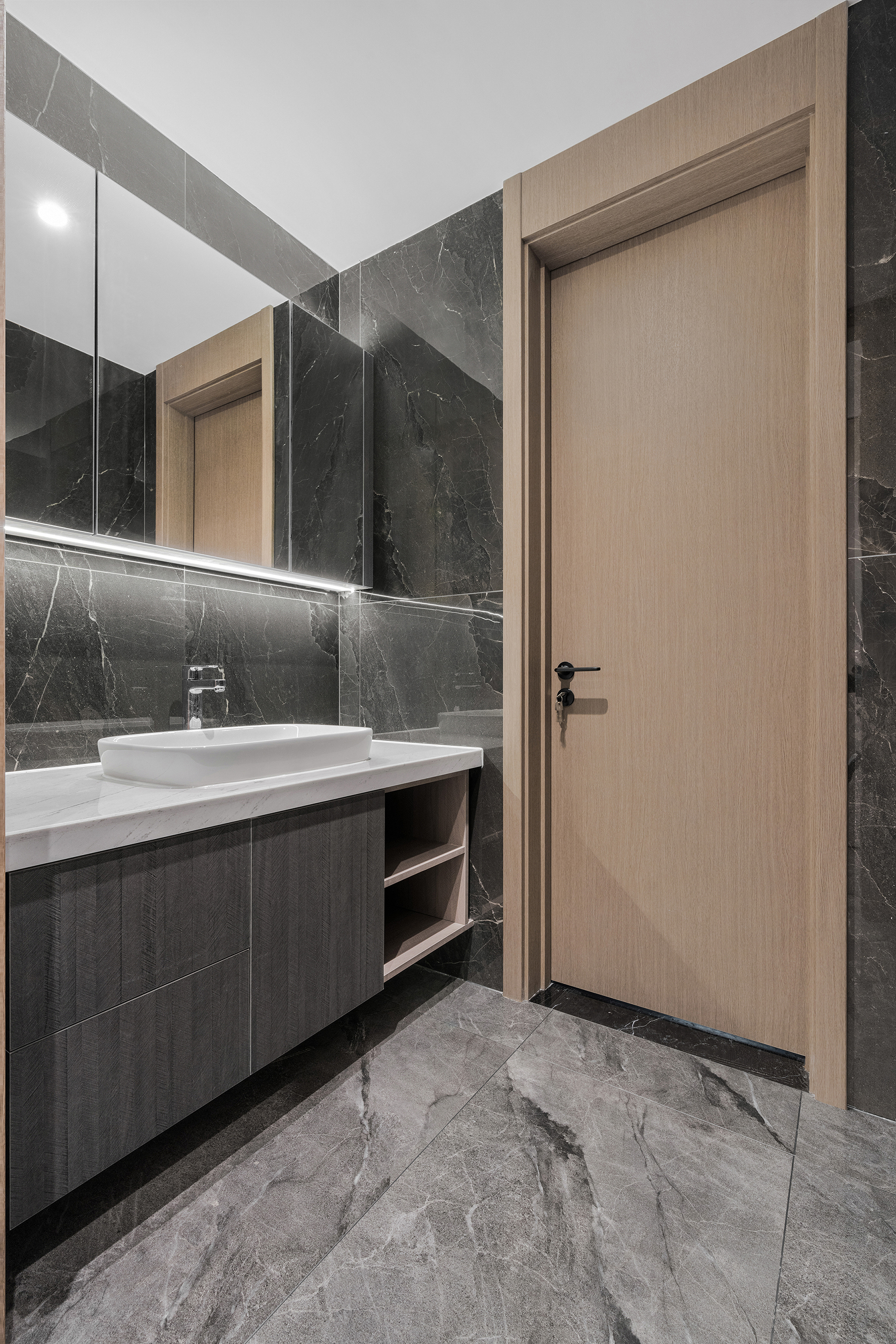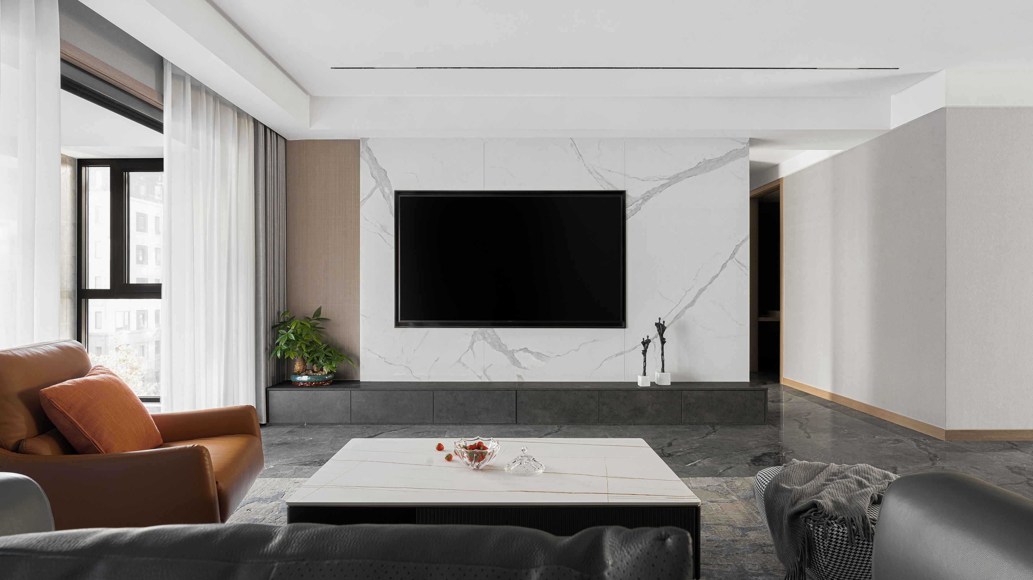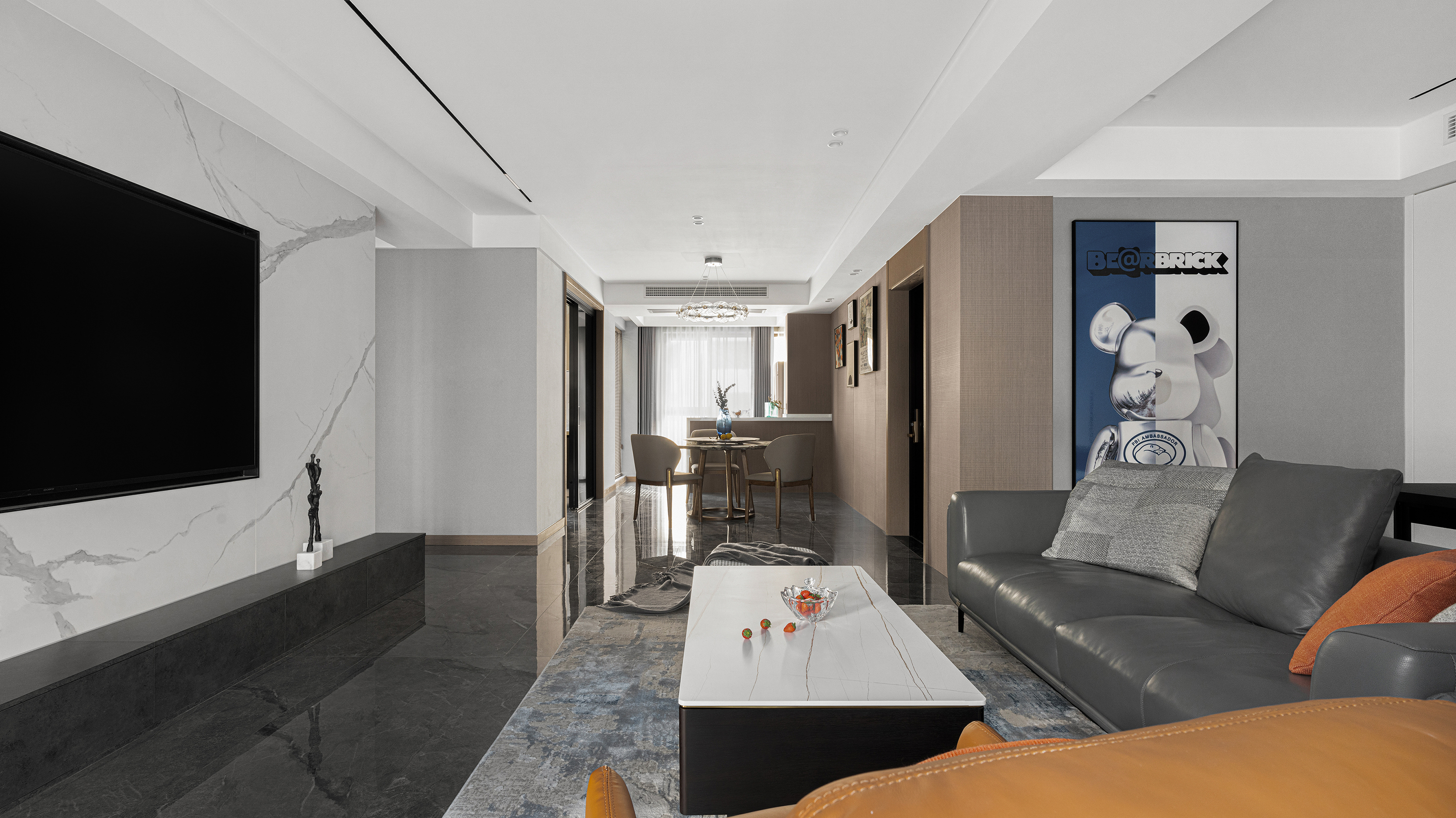 设计以现代格调为主旨,通过高级灰、质感棕等大地色系的加入,让钢筋铁泥浮现出根植自然的蓬勃生命力。 大理石石材的运用,更予以空间叠加式的原生态品味。软装所选用的高级面料,配合高级的装饰,无不在细节处渲染出精致的效果。