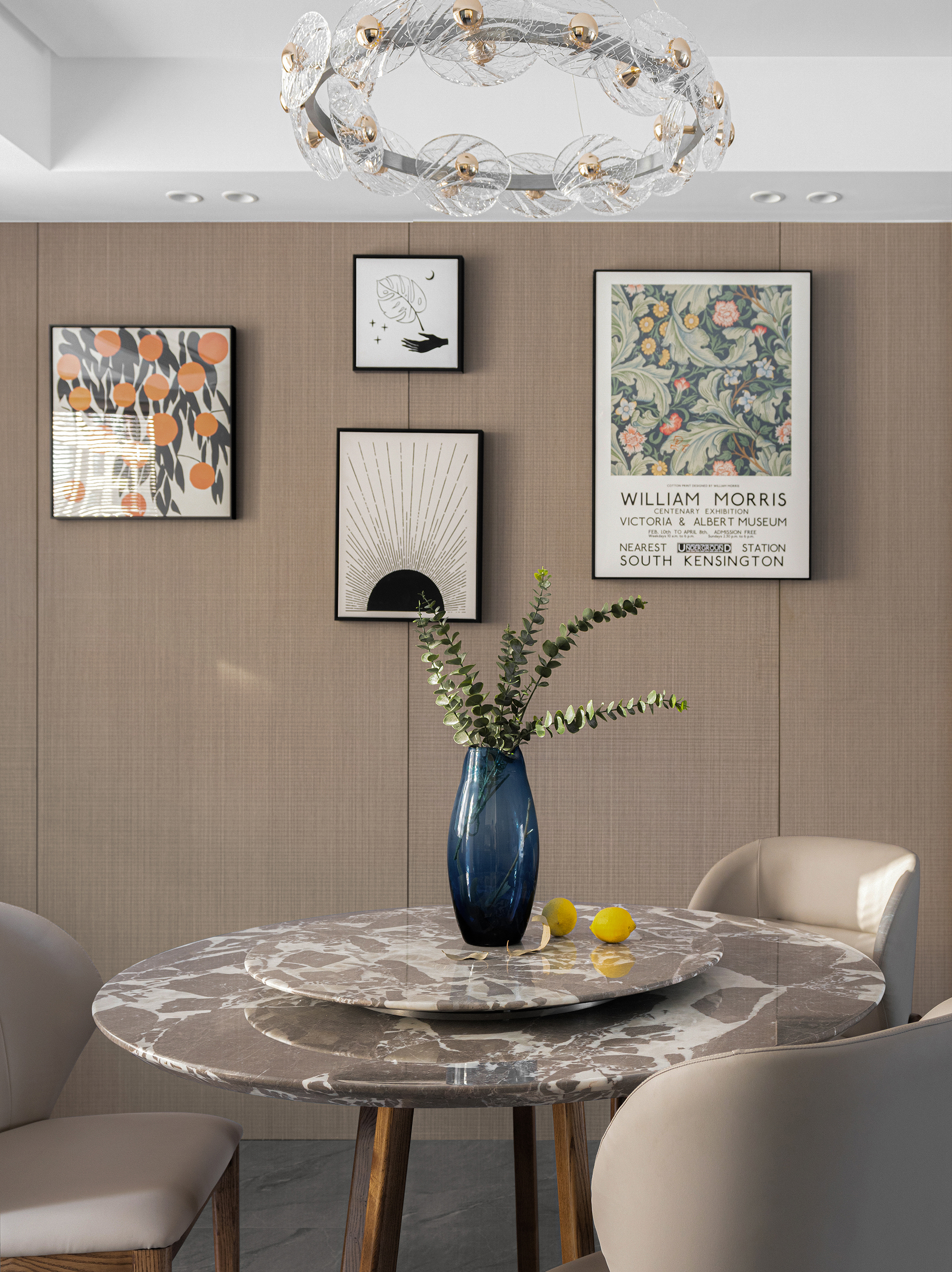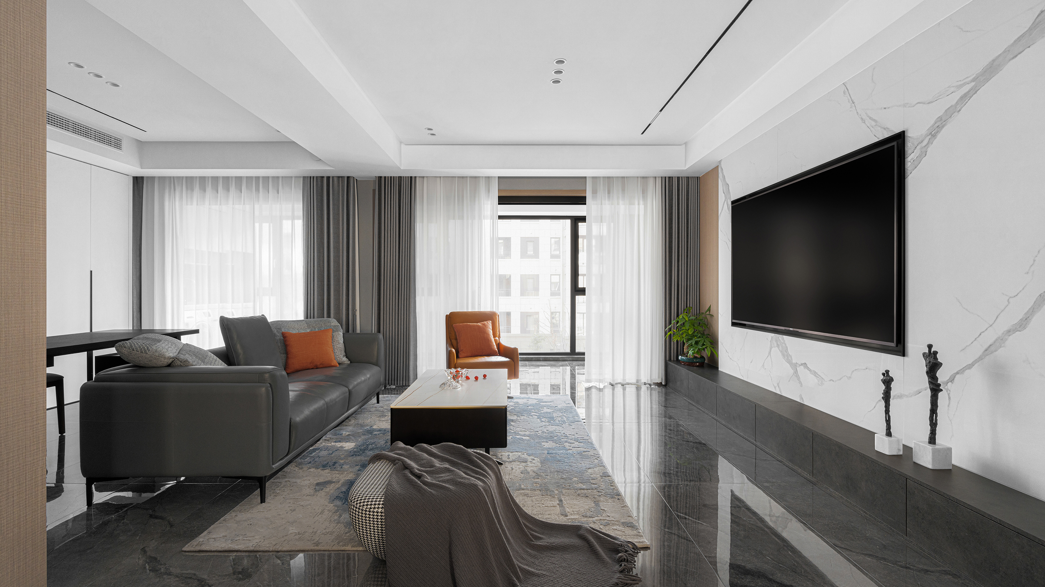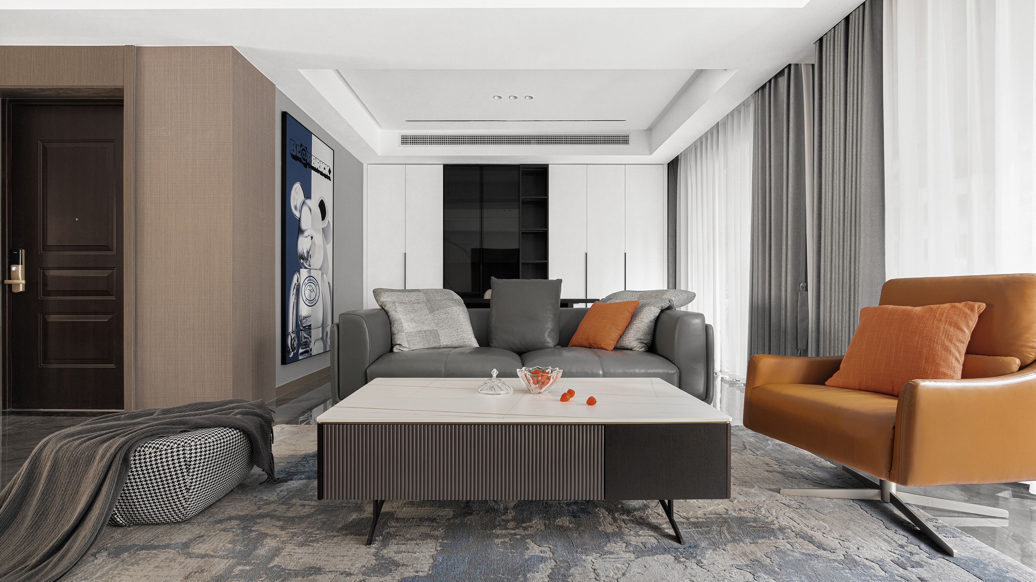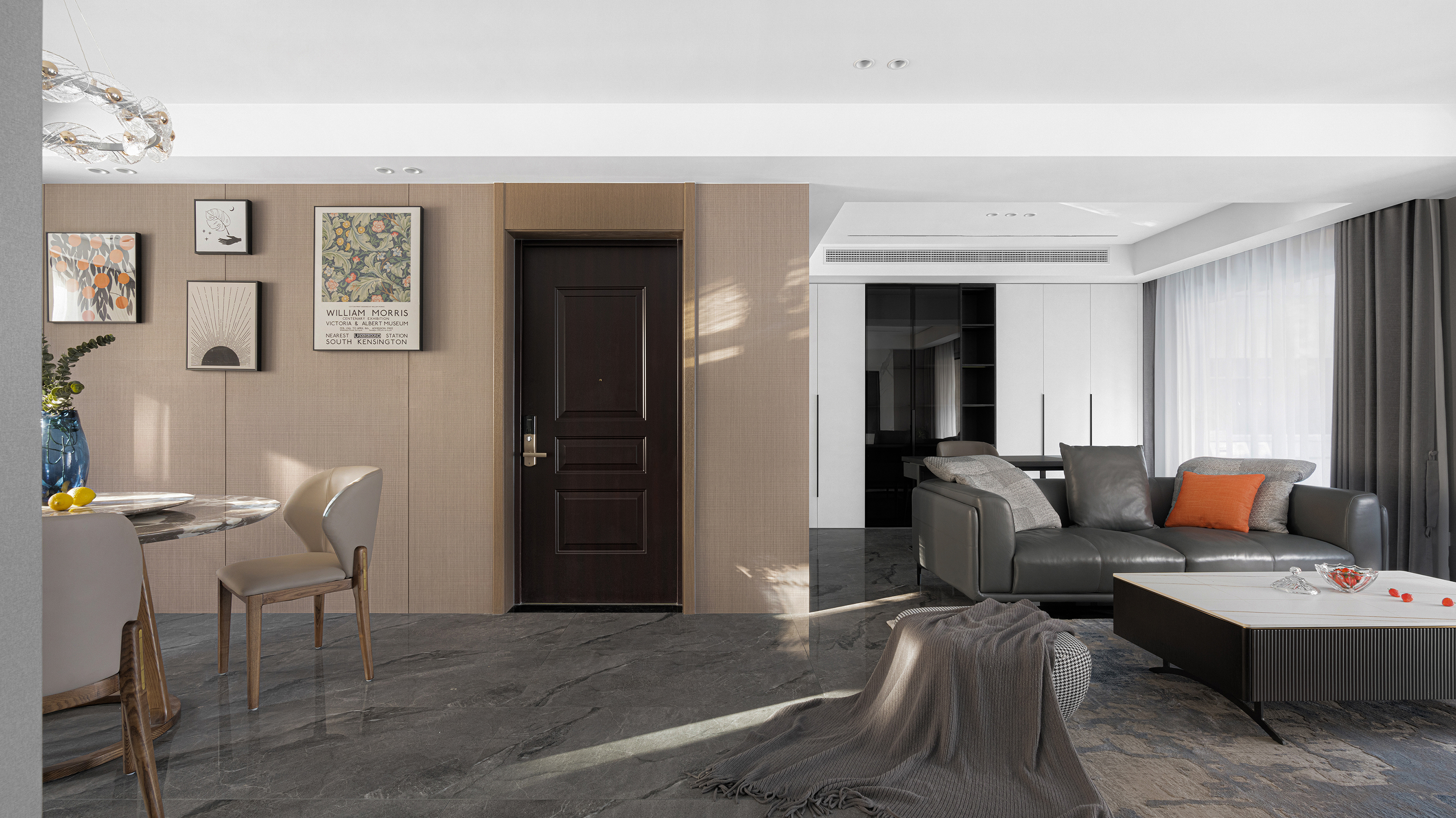 项目定位:设计以现代格调为主旨,通过高级灰、质感棕等大地色系的加入,让钢筋铁泥浮现出根植自然的蓬勃生命力。