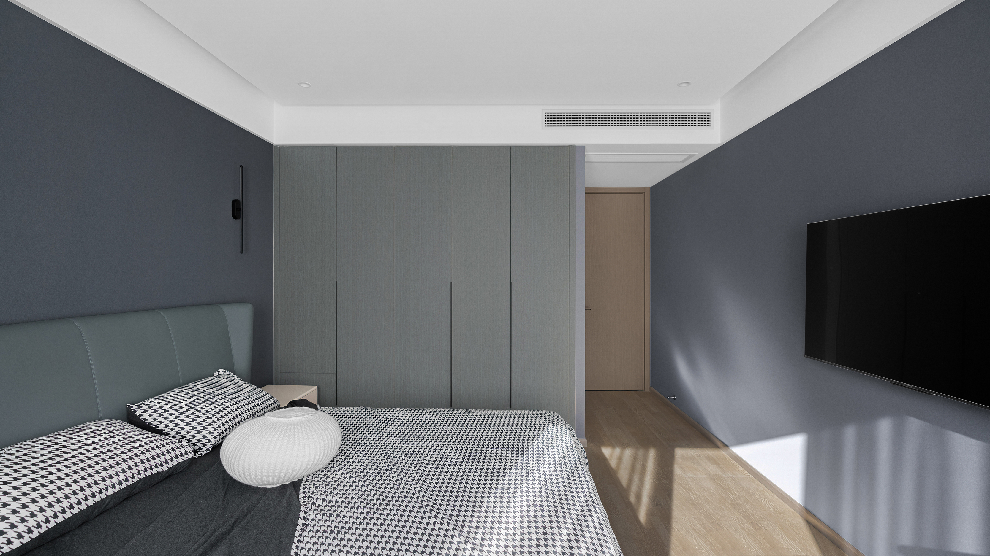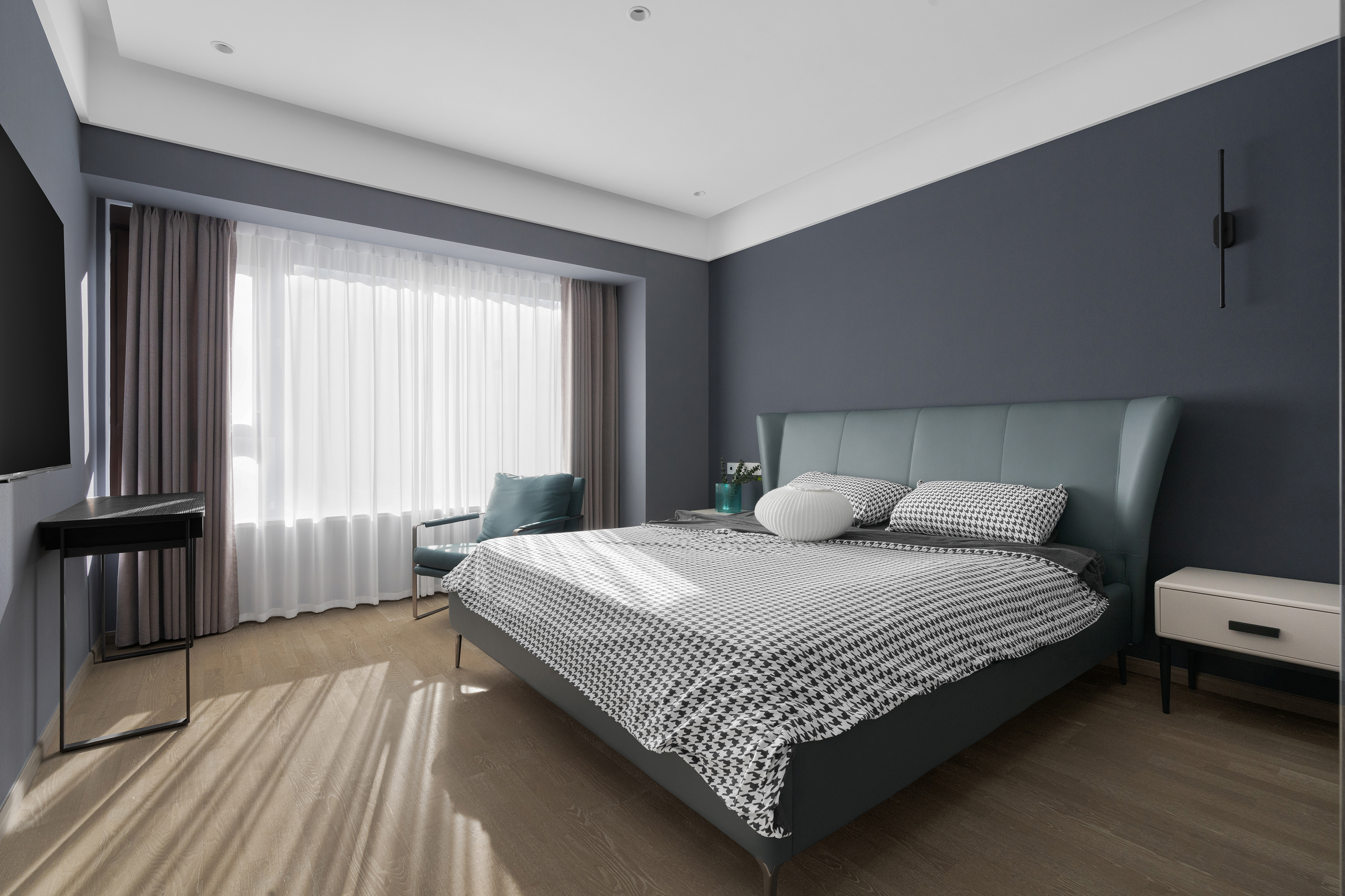 主卧采用理性的蓝色为背景,赋予空间沉稳静谧的基调。而绚烂的单人蓝色沙发又打破这一沉静感,让整个空间充满跳脱的氛围感。