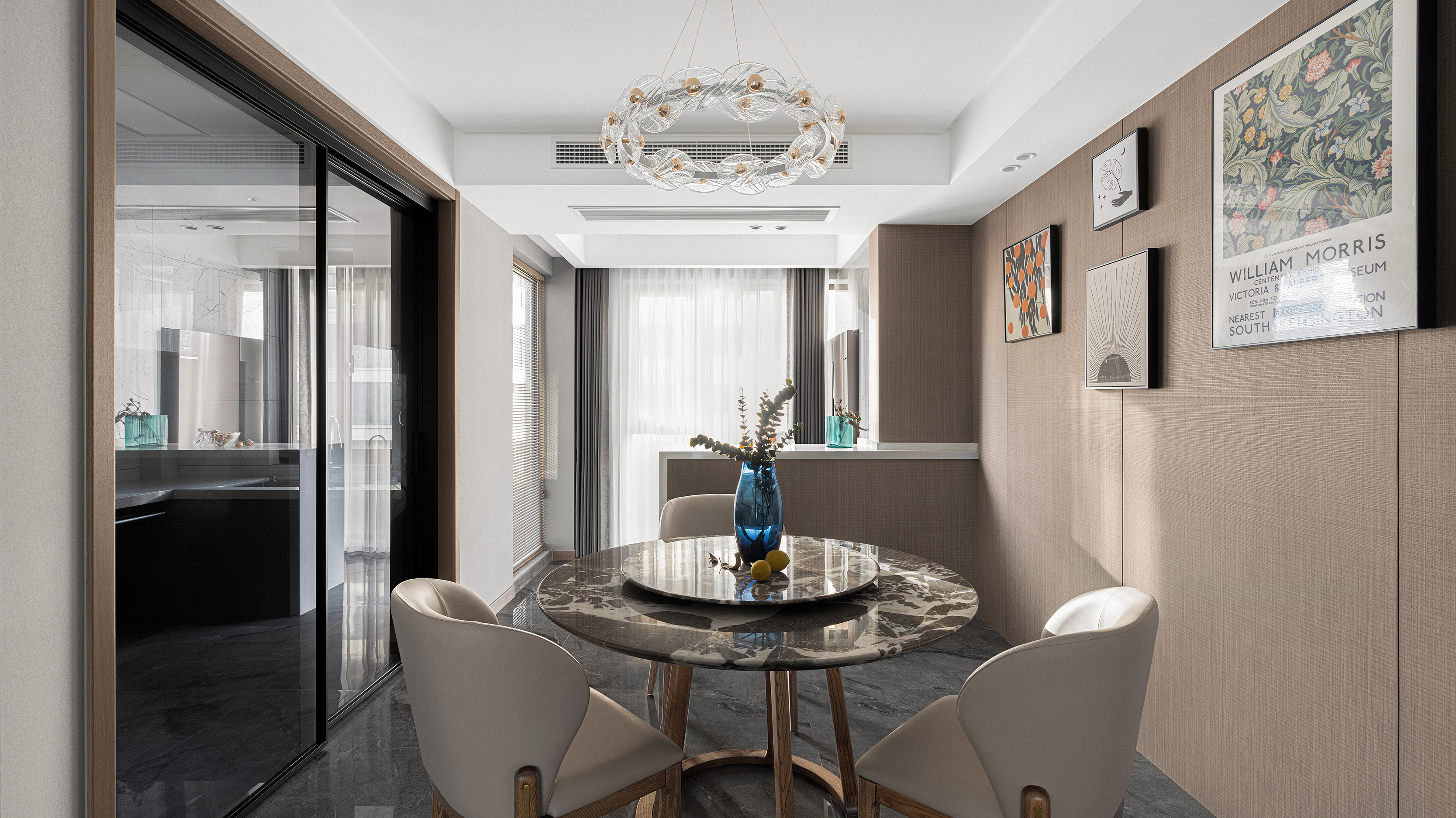 一抹暖色灯光在就餐上方晕染,墙上精致艺术的挂画,也让就餐氛围变得仪式感满满。每个屋檐下的生活气息,人与人之间的情感关系,都在厨餐厅凝聚与流动。生活中种种情感关系的复杂性,都能在厨房里变得纯粹,简单。