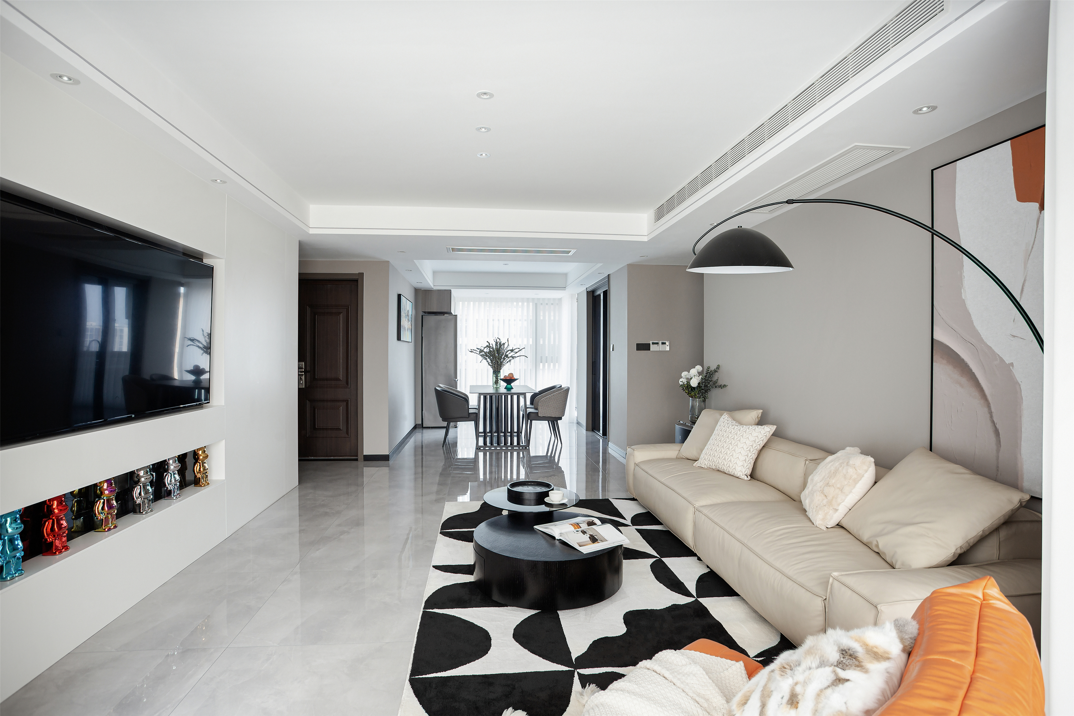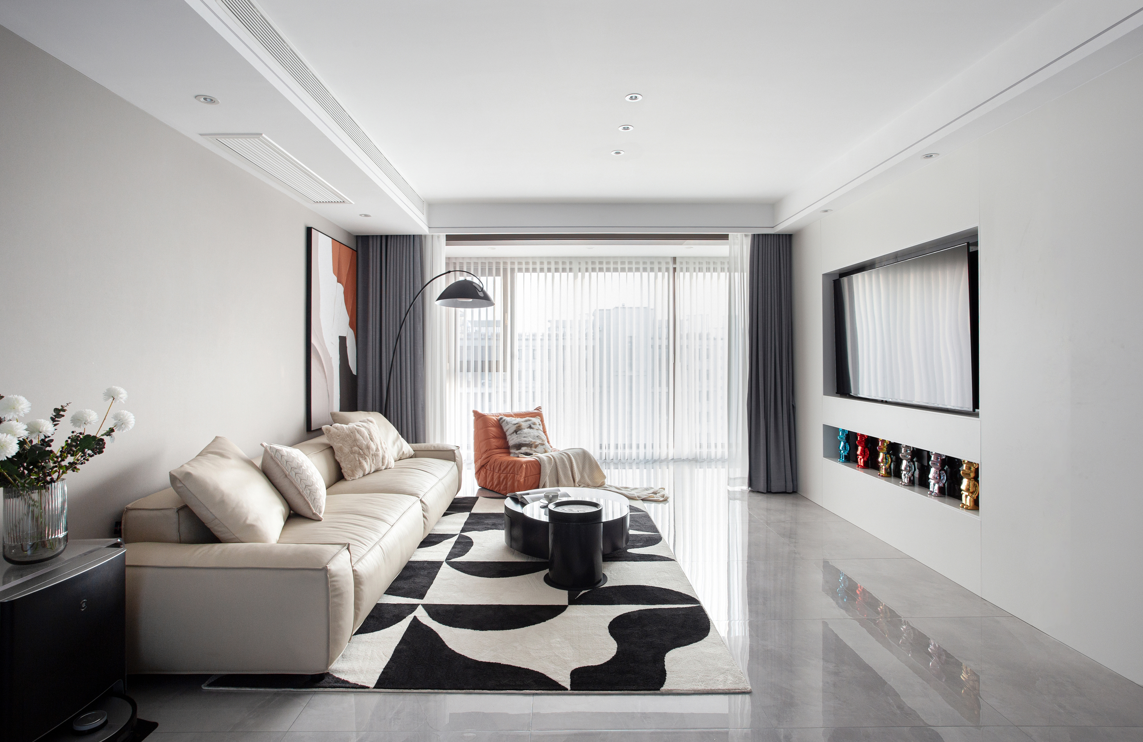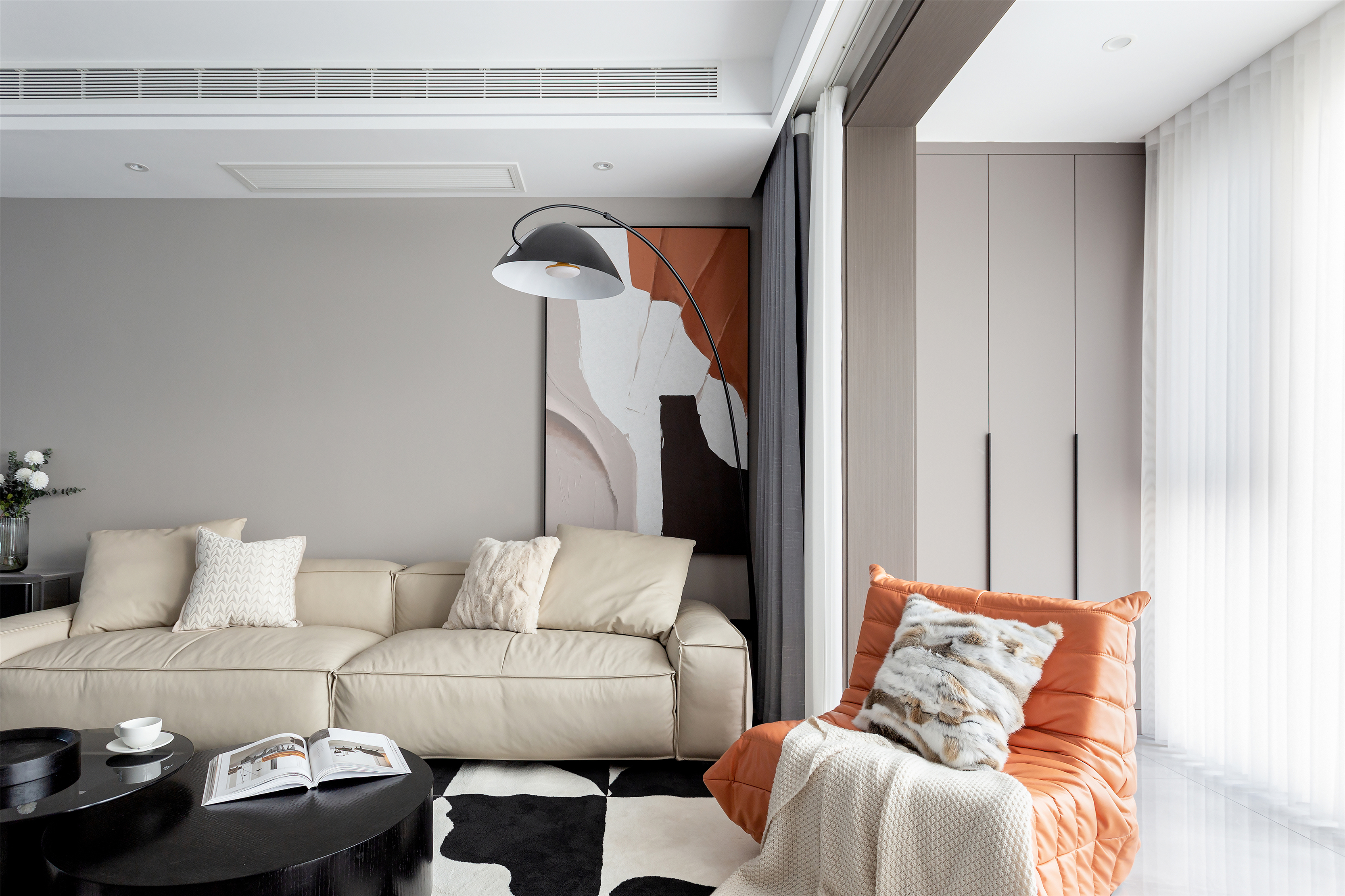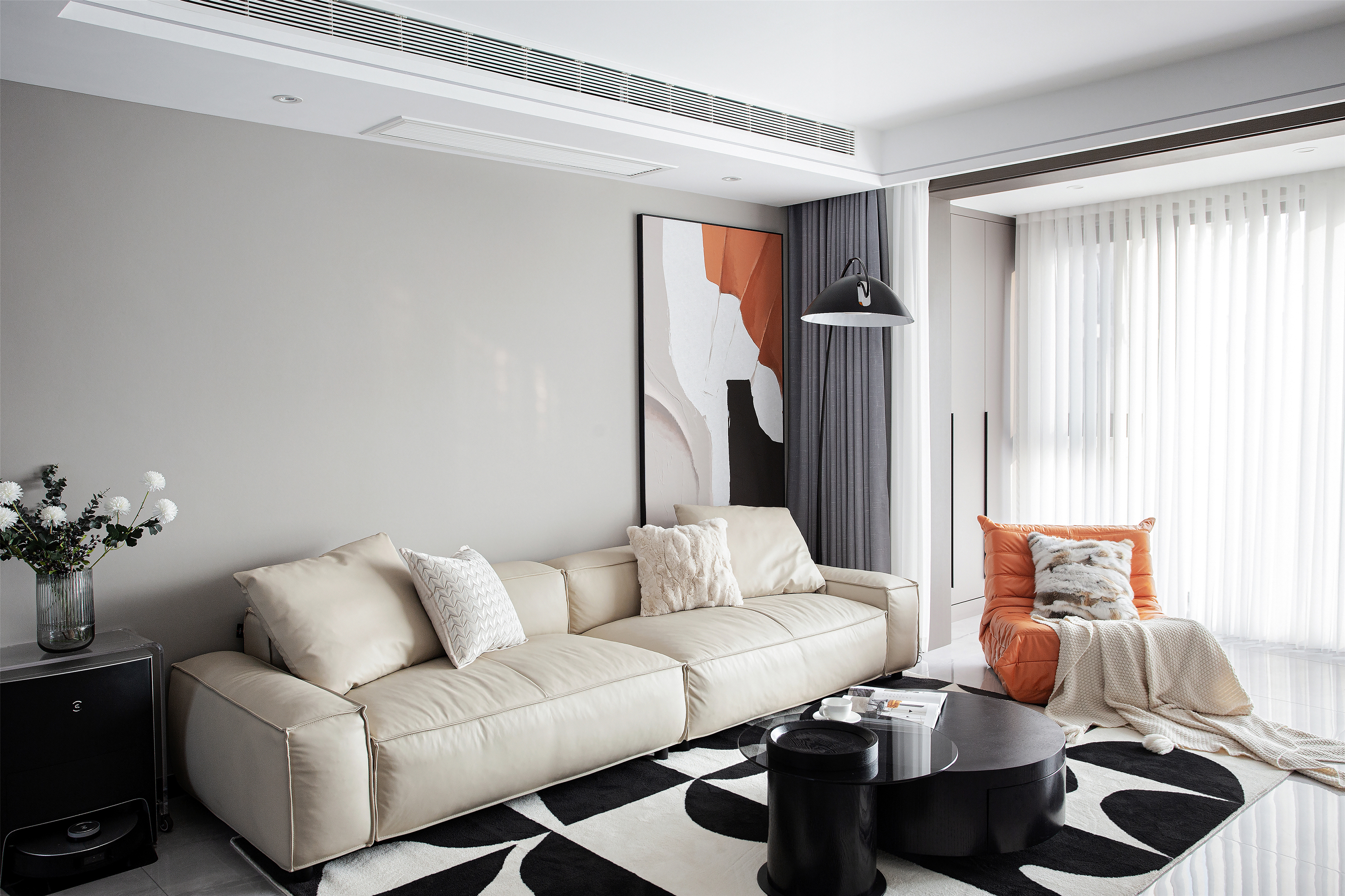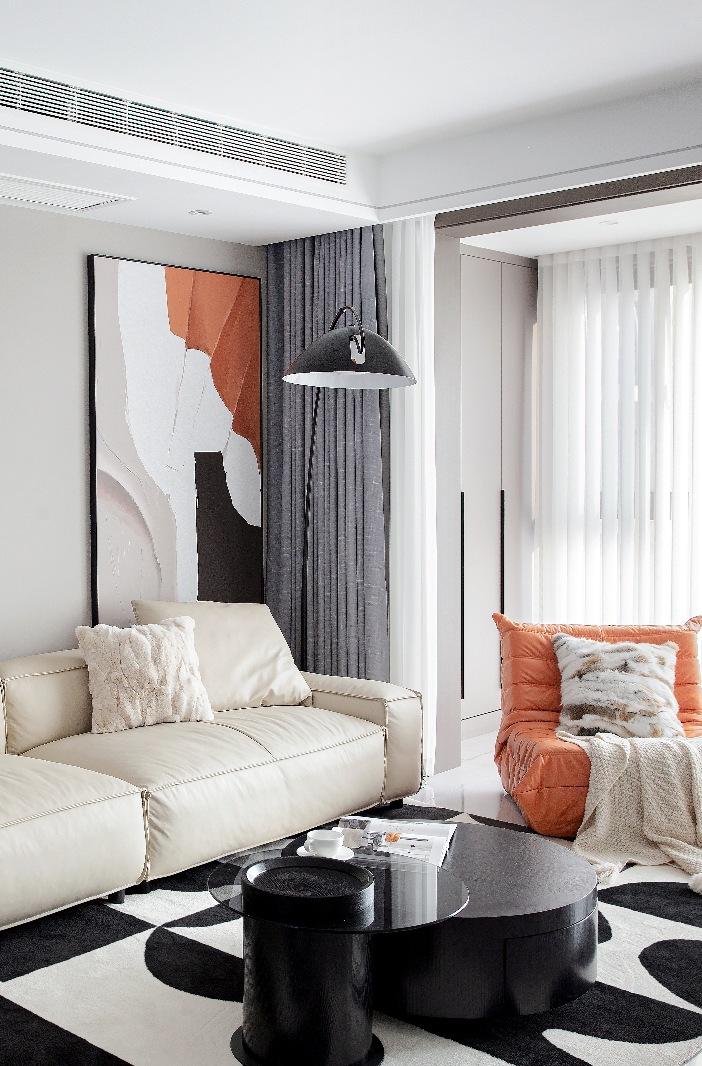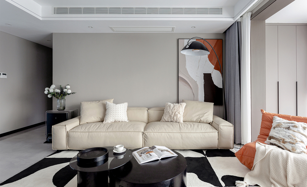 走进客厅,清爽的奶油白迎面袭来,色彩的点缀是客厅最强“软装”,温馨的暖意给灰白基调带来了许多生机与活泼,不再单调乏味。 奶白色豆腐块皮沙发,搭配一盏简约线条感落地灯,黑白花色地毯,客厅空间多了些艺术感。一幅抽象装饰画如同平静水面上的粼粼波光,为空间注入灵动魅力。