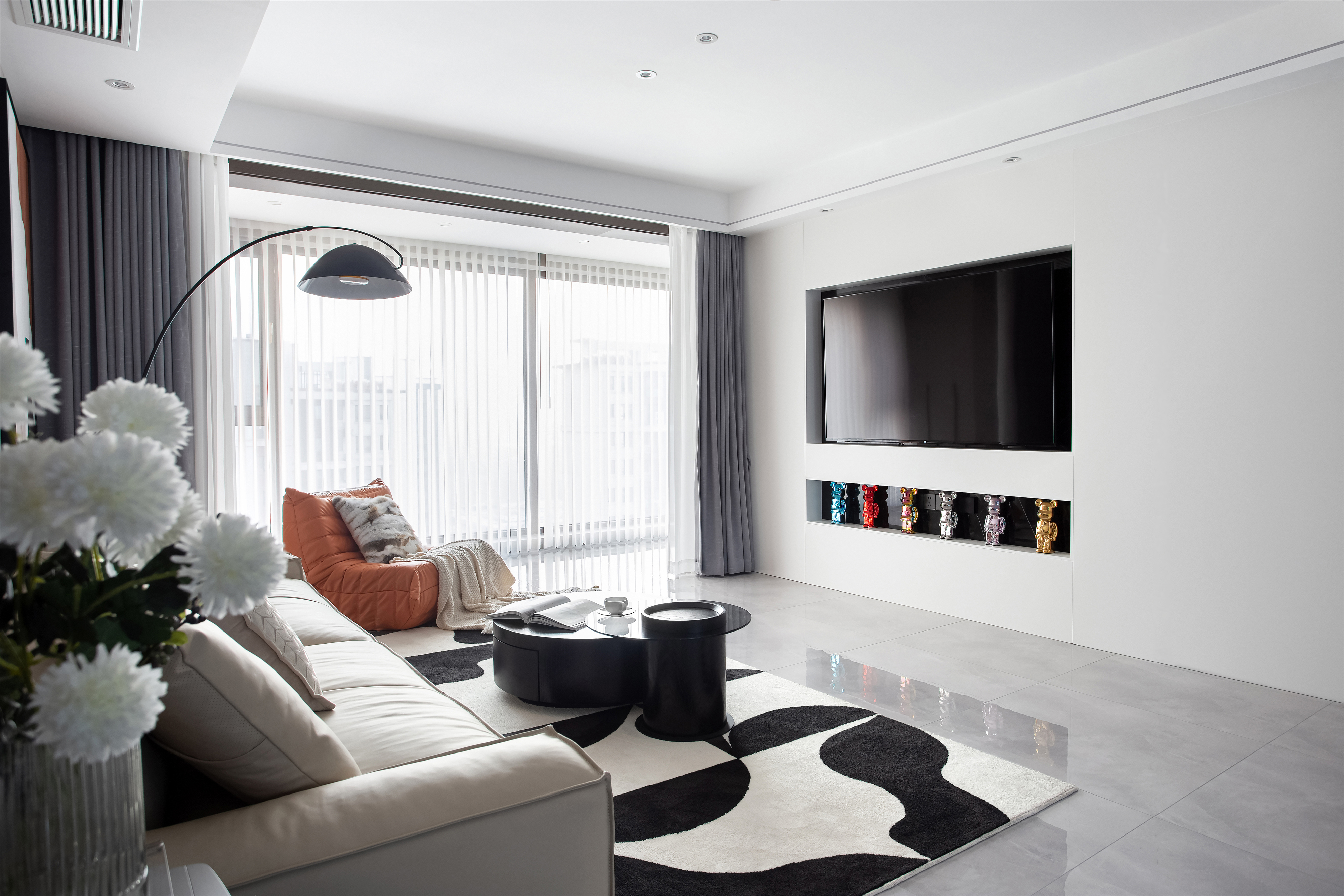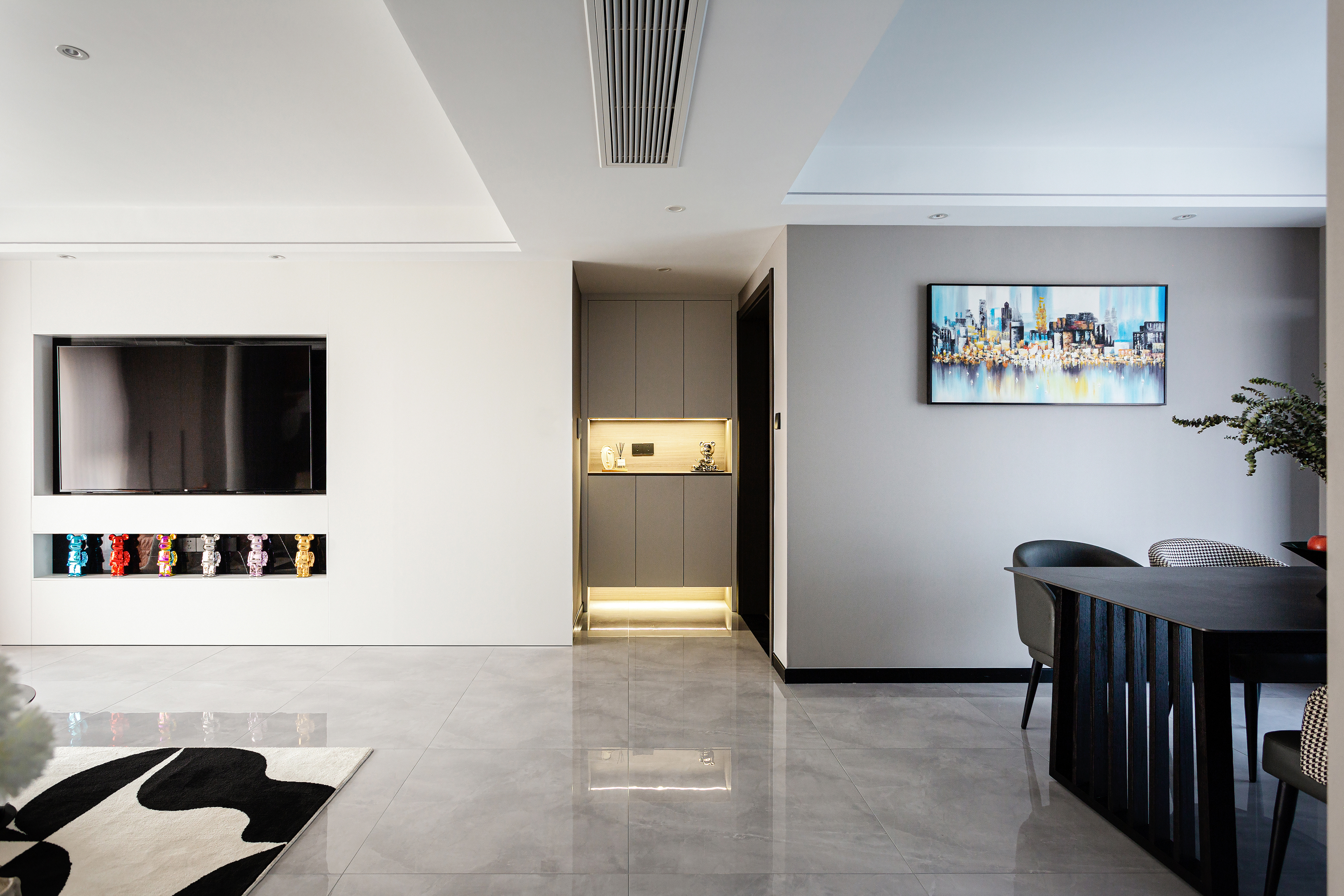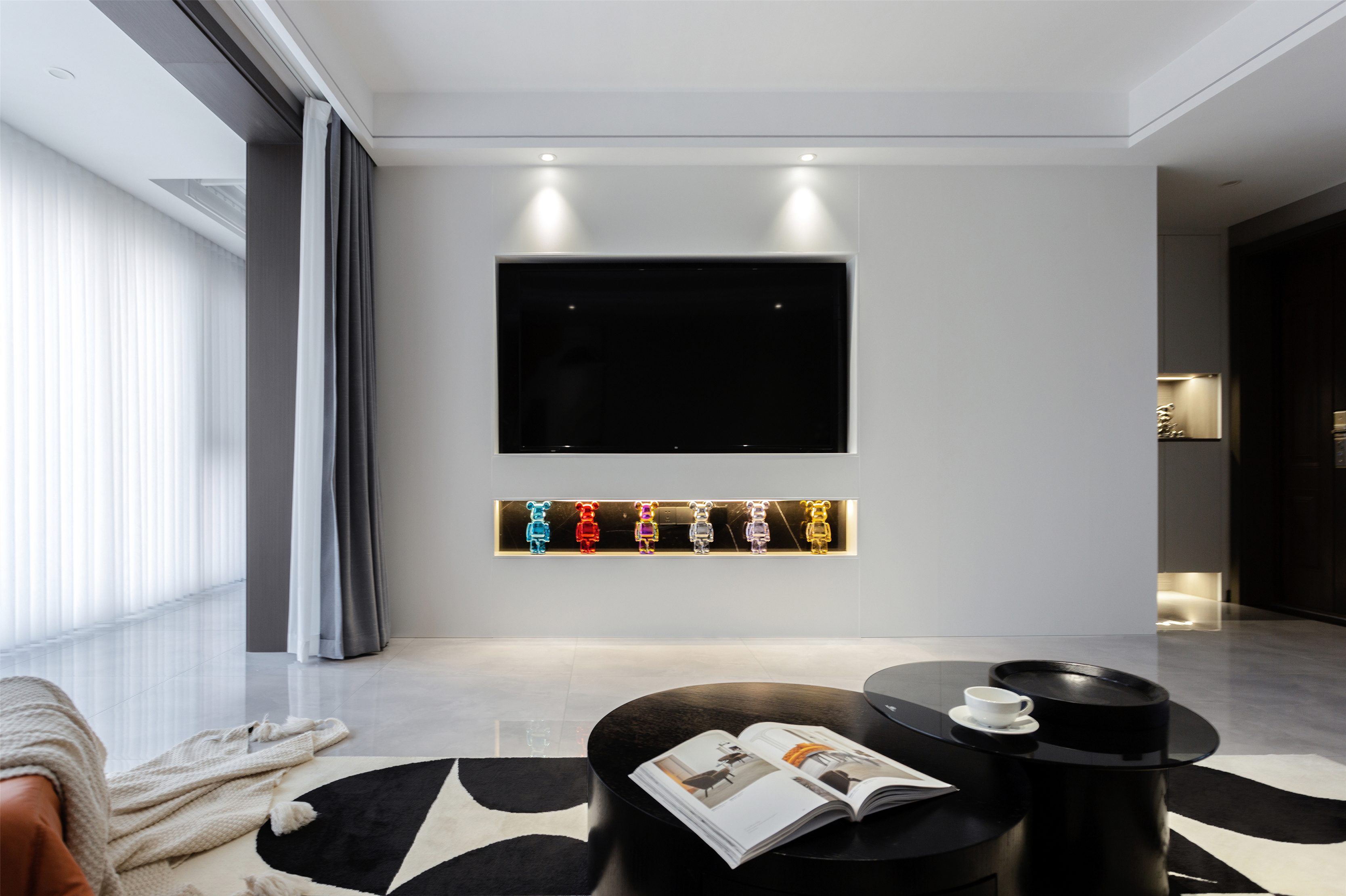 设计选材:电视背景墙没有繁杂的背景墙与墙面装饰,黑色大理石块融入其中,打破了简白木饰面的单调,呈现黑与白相互平衡的舒适感。中间摆上BearBrick装饰,内嵌灯带增加氛围感。为了不破坏电视背景墙的整体性,次卧选择了隐形门设计,流畅简约的设计语言更增添了些许艺术感。