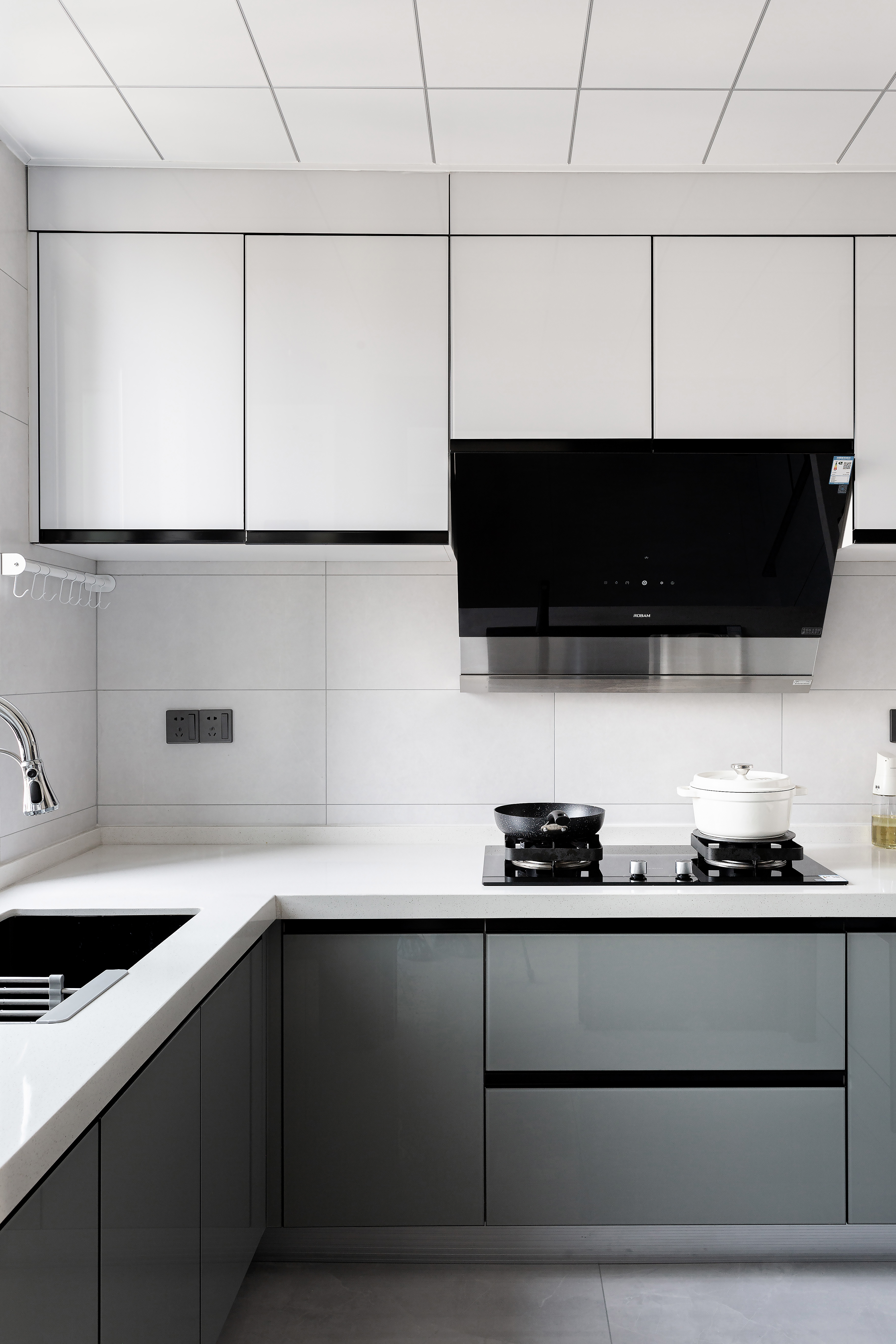 厨房空间虽然不大,但功能齐全,使用感极佳。U型操作台面确保了操作空间,白色吊柜搭配灰色地柜,连厨房都散发一丝丝精致感。