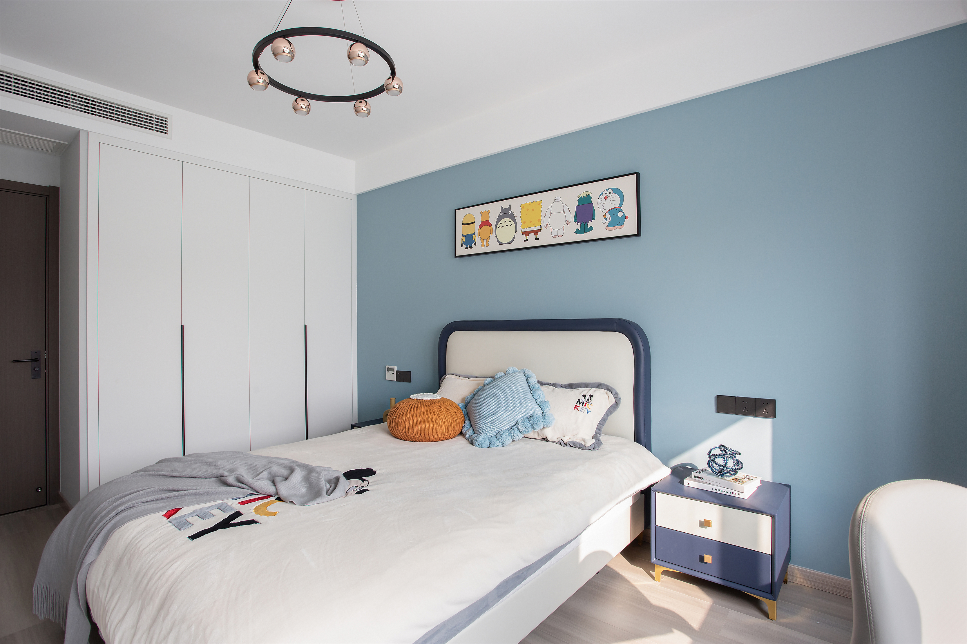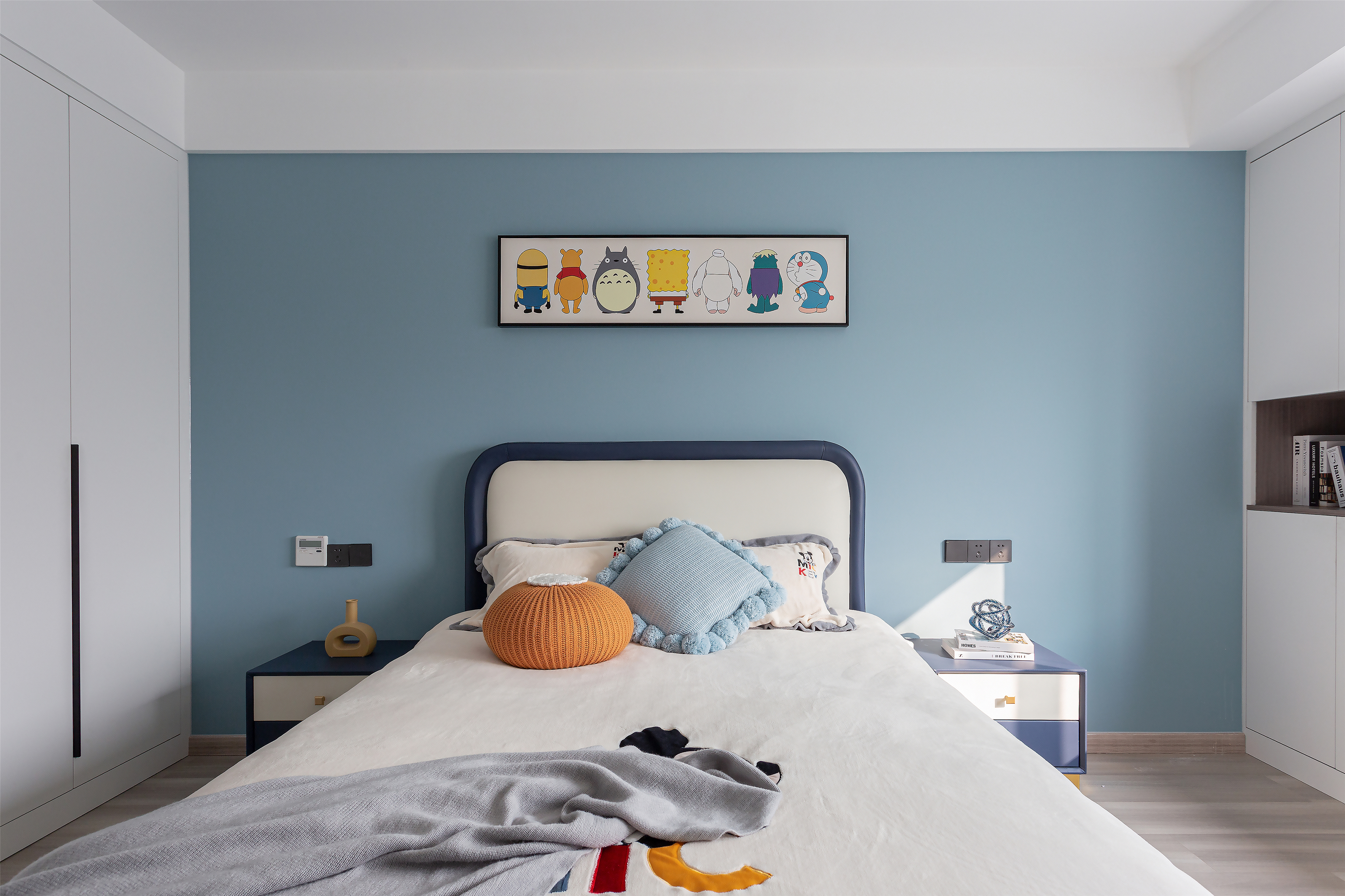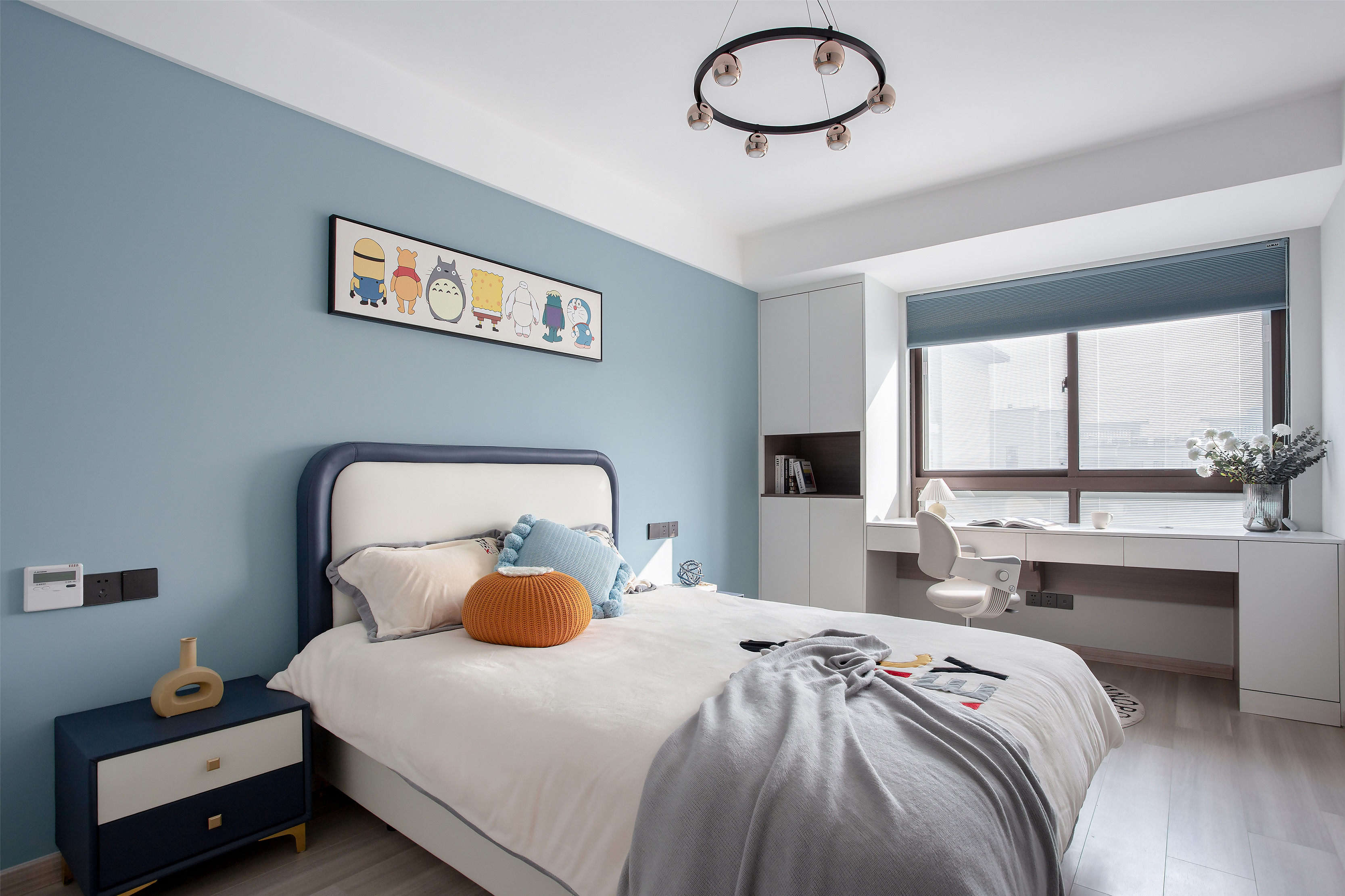 蓝色调的儿童房,有趣的装饰挂画配合同色系床品。简洁的色彩更利于培养孩子的审美,形成舒适的空间氛围。靠窗做组合书柜书桌一体,给孩子独立的学习环境,培养良好的行为习惯。