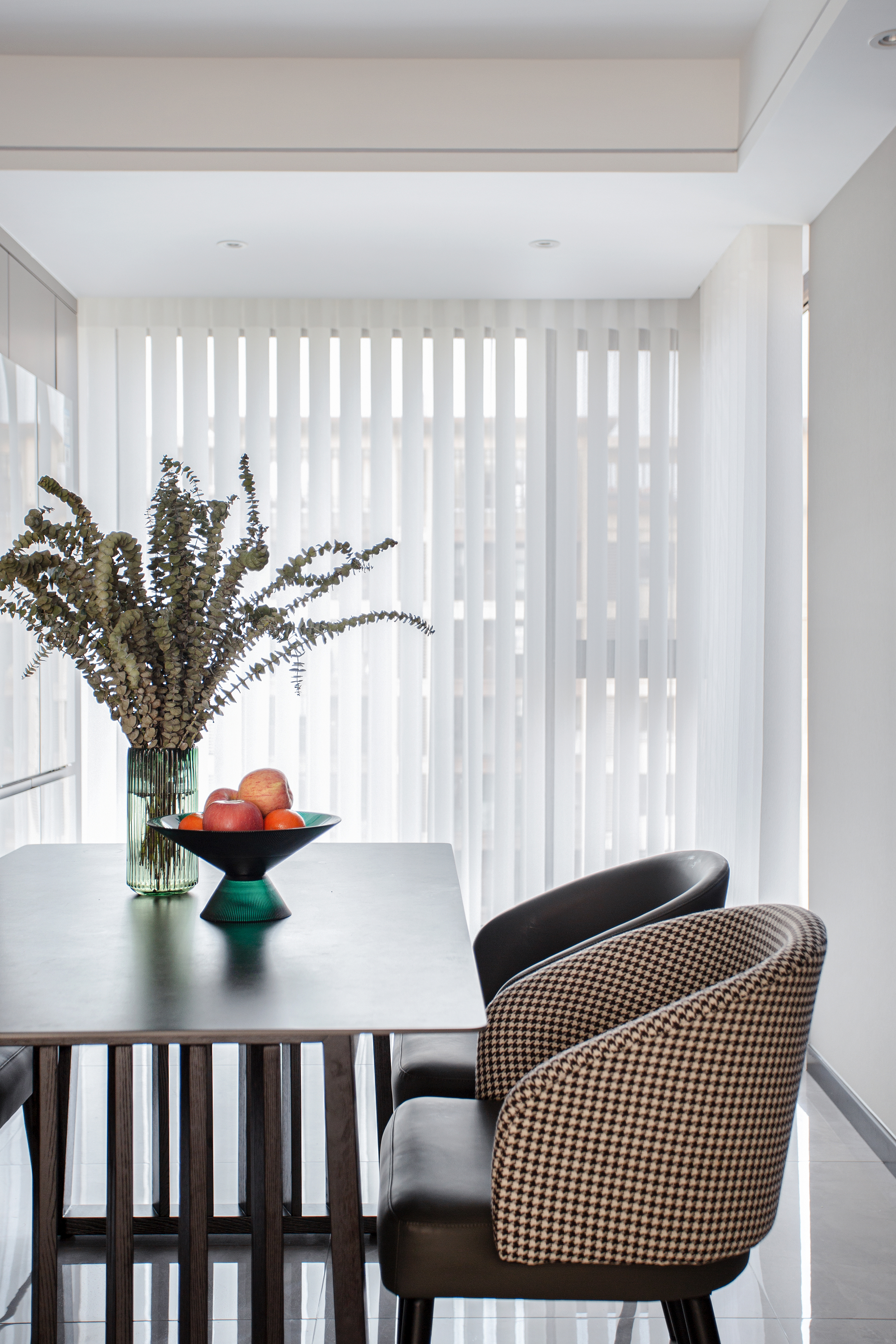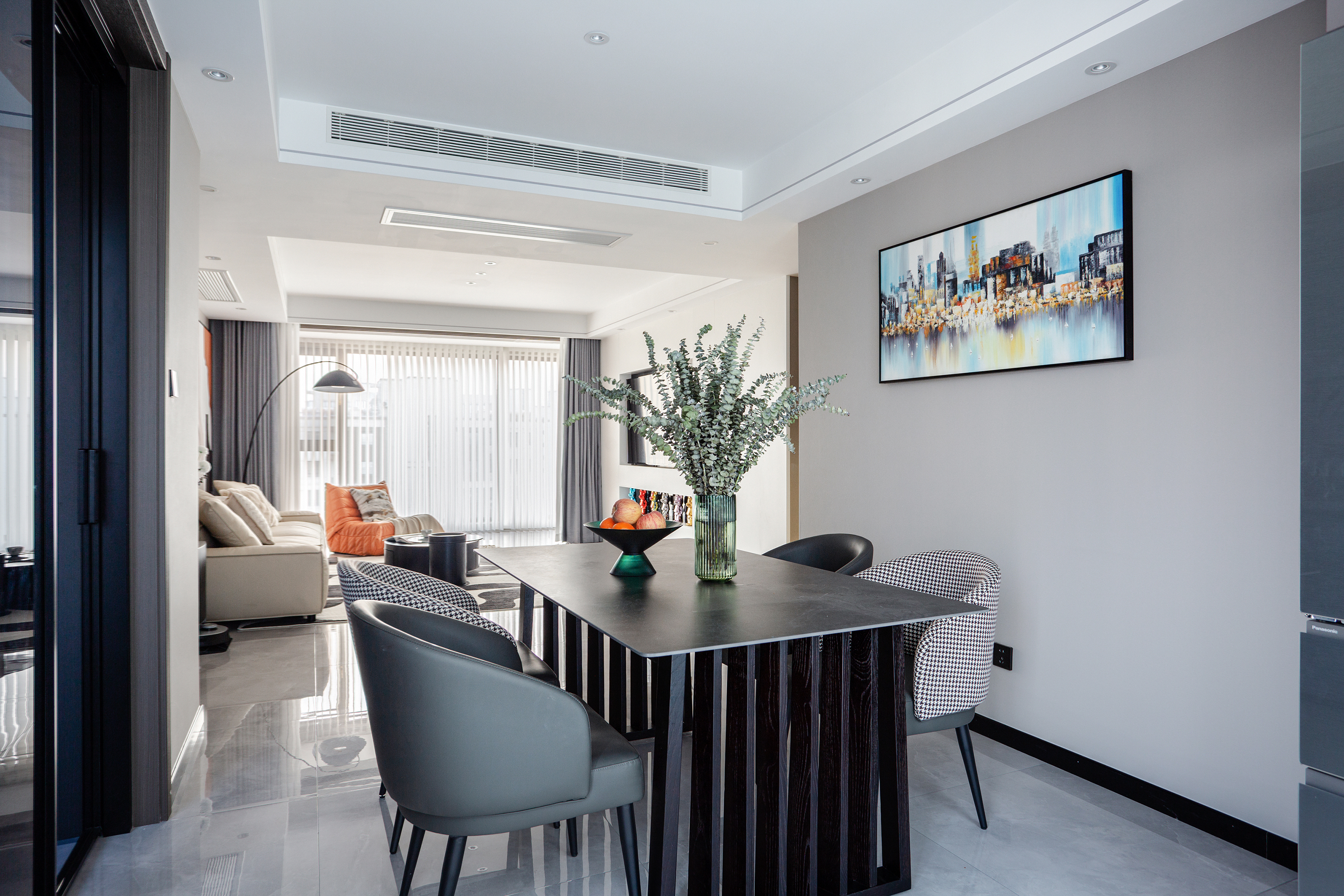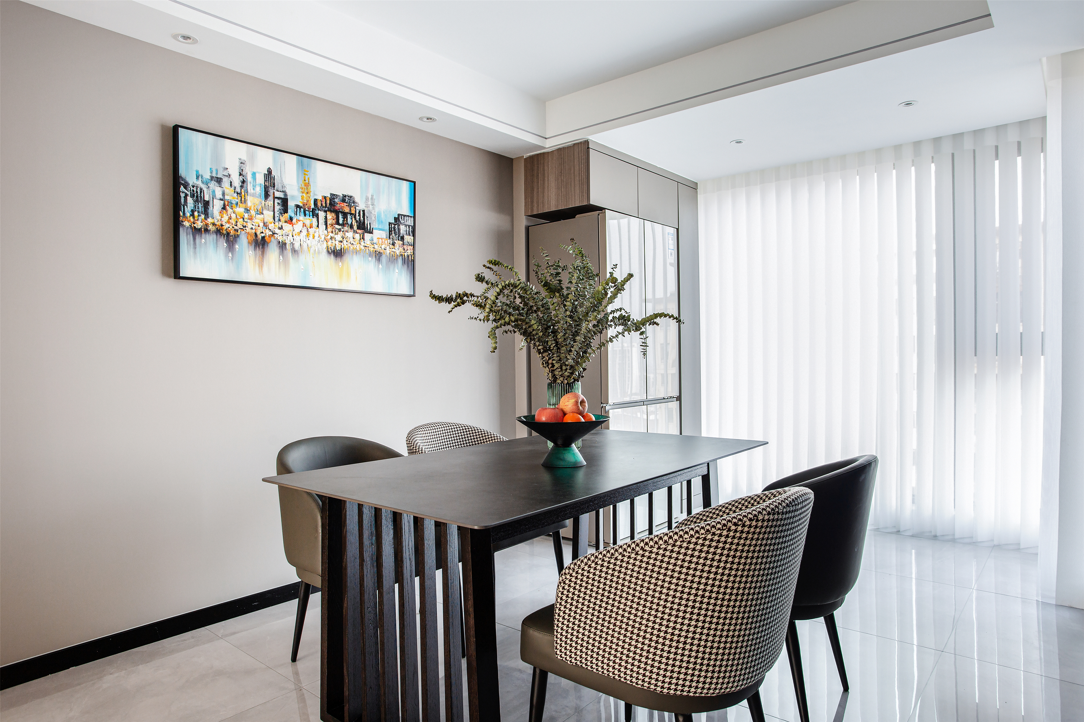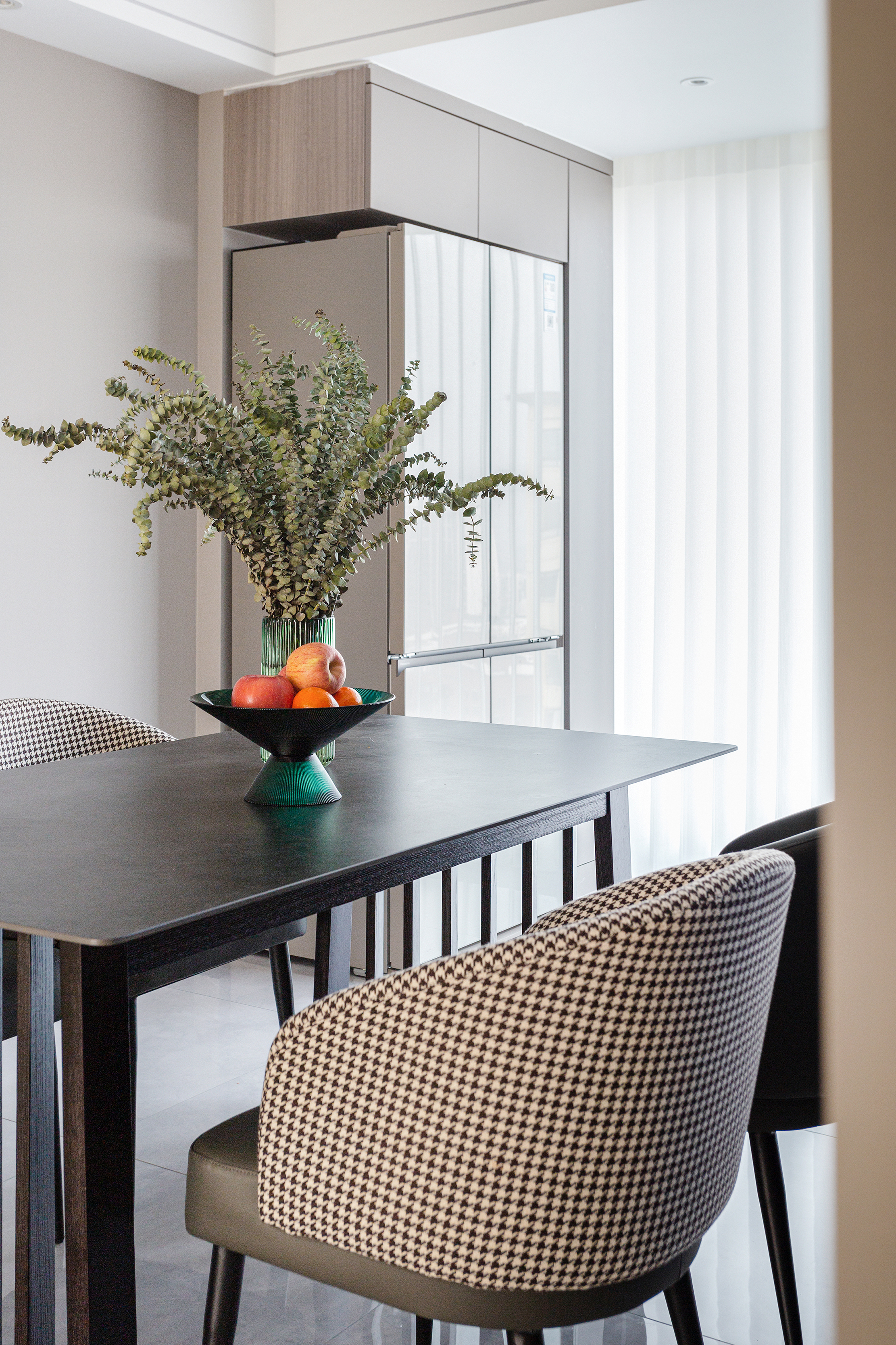 原餐厅没有配置柜体,在综合考虑收纳需求和尺寸后,沿阳台墙面做柜体,嵌入冰箱,补充餐厅的收纳。延续黑白主色调的餐桌椅让空间更为硬朗,艺术。