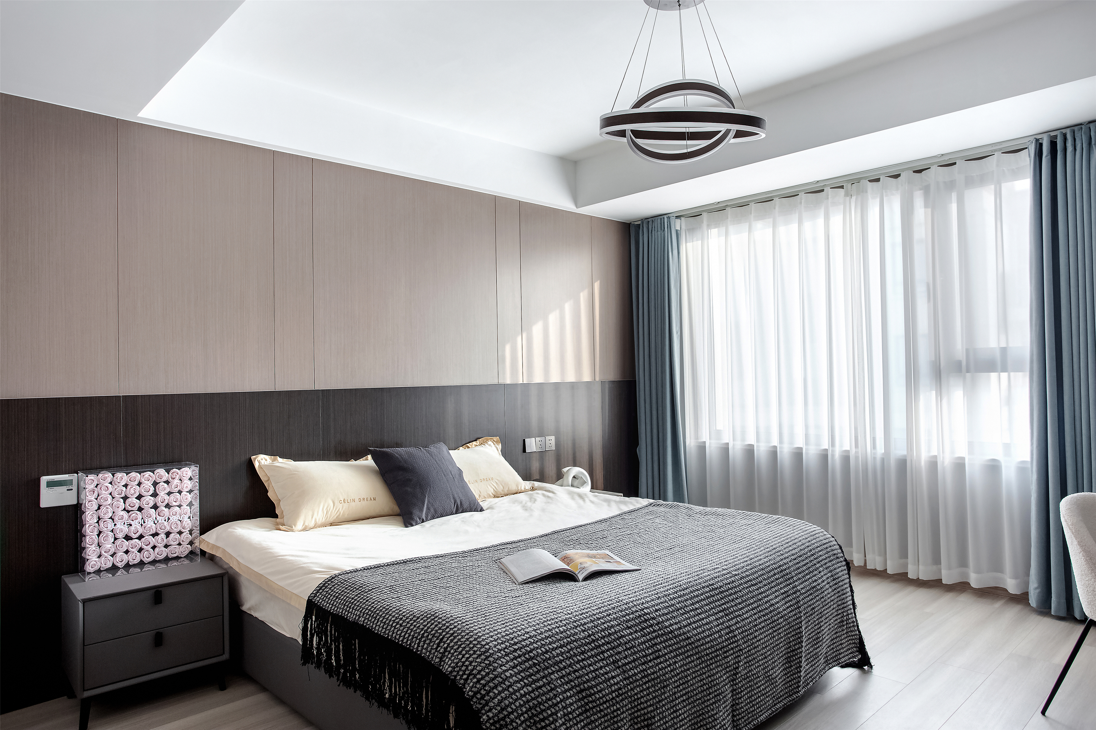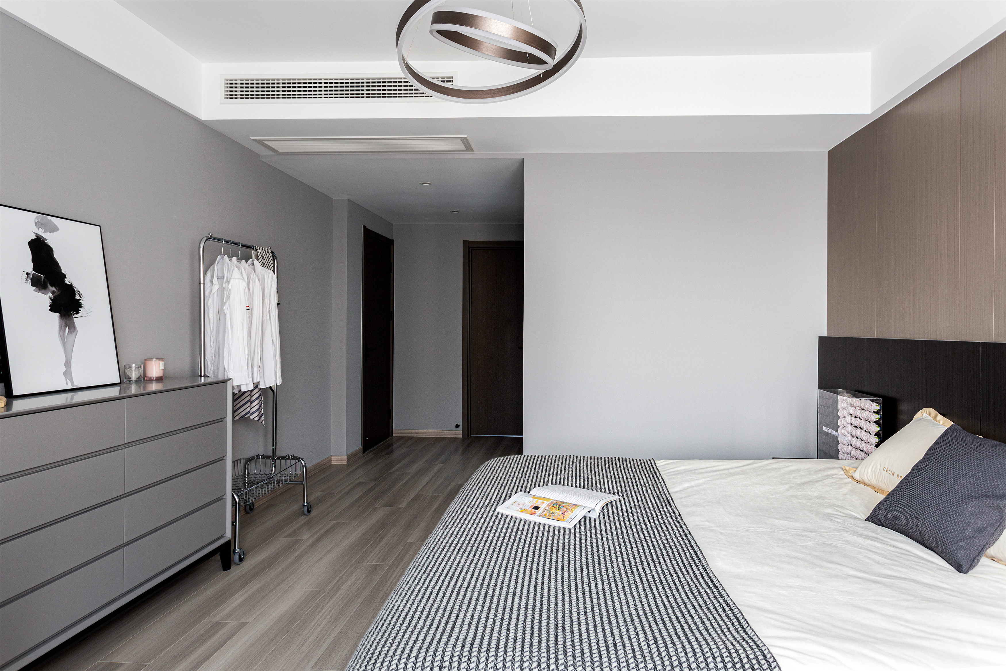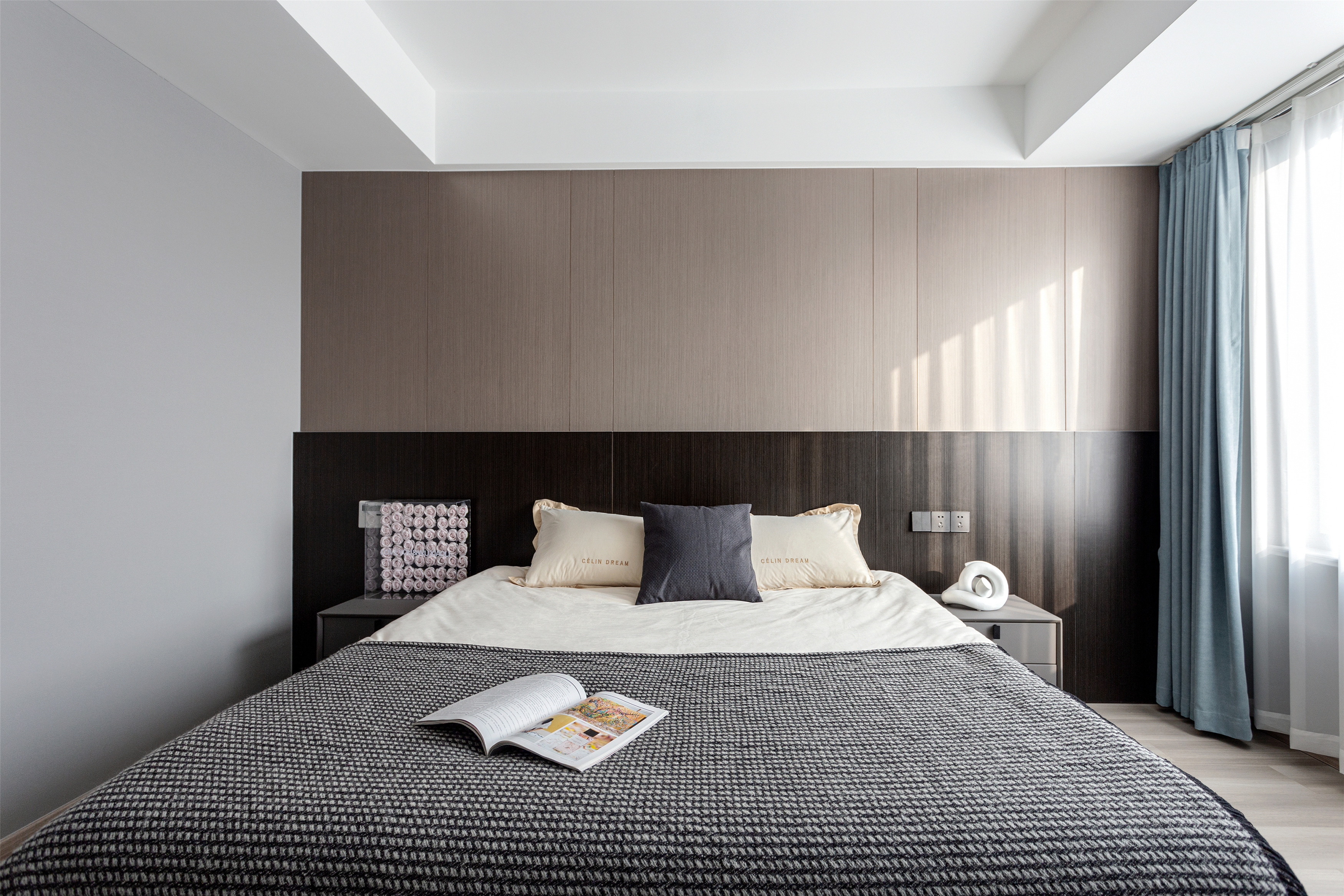 卧室延续着低饱和度的色彩,极简的线条、浅色与深咖色木饰面,内敛而素净,通过不规则抽缝处理彰显出主人的生活品味,从材质和造型上放大卧室的美学意义,为屋主营造舒适的休憩时光。