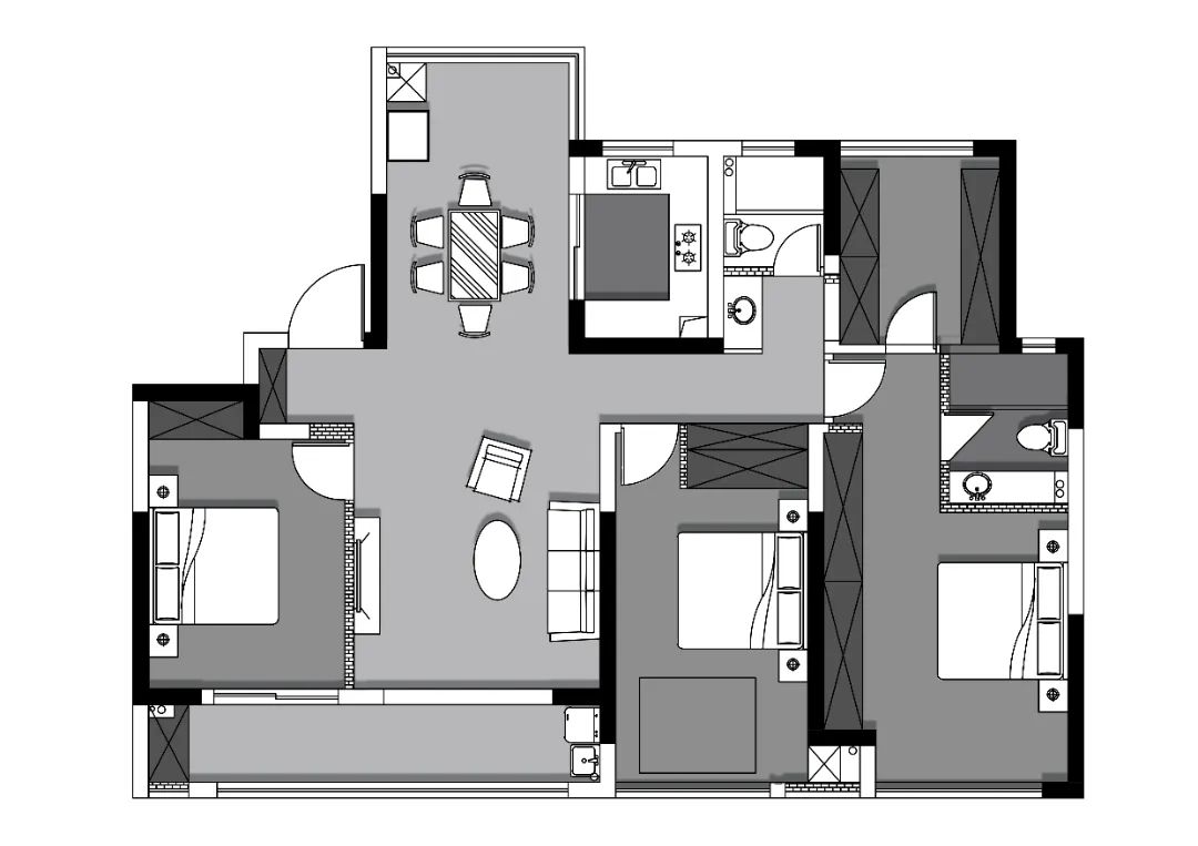 空间布局:设计思路/设计亮点: 本案一梯一户,黑牡丹经典户型,在户型改动方面把原来大横厅改成更实用的三房朝南,最小的北房间划入主卧室改造成衣帽间,比例过于大的内卫恢复到该有的状态。能利用的区域统统敲掉合理分配,在空间和功能上处理更合理。