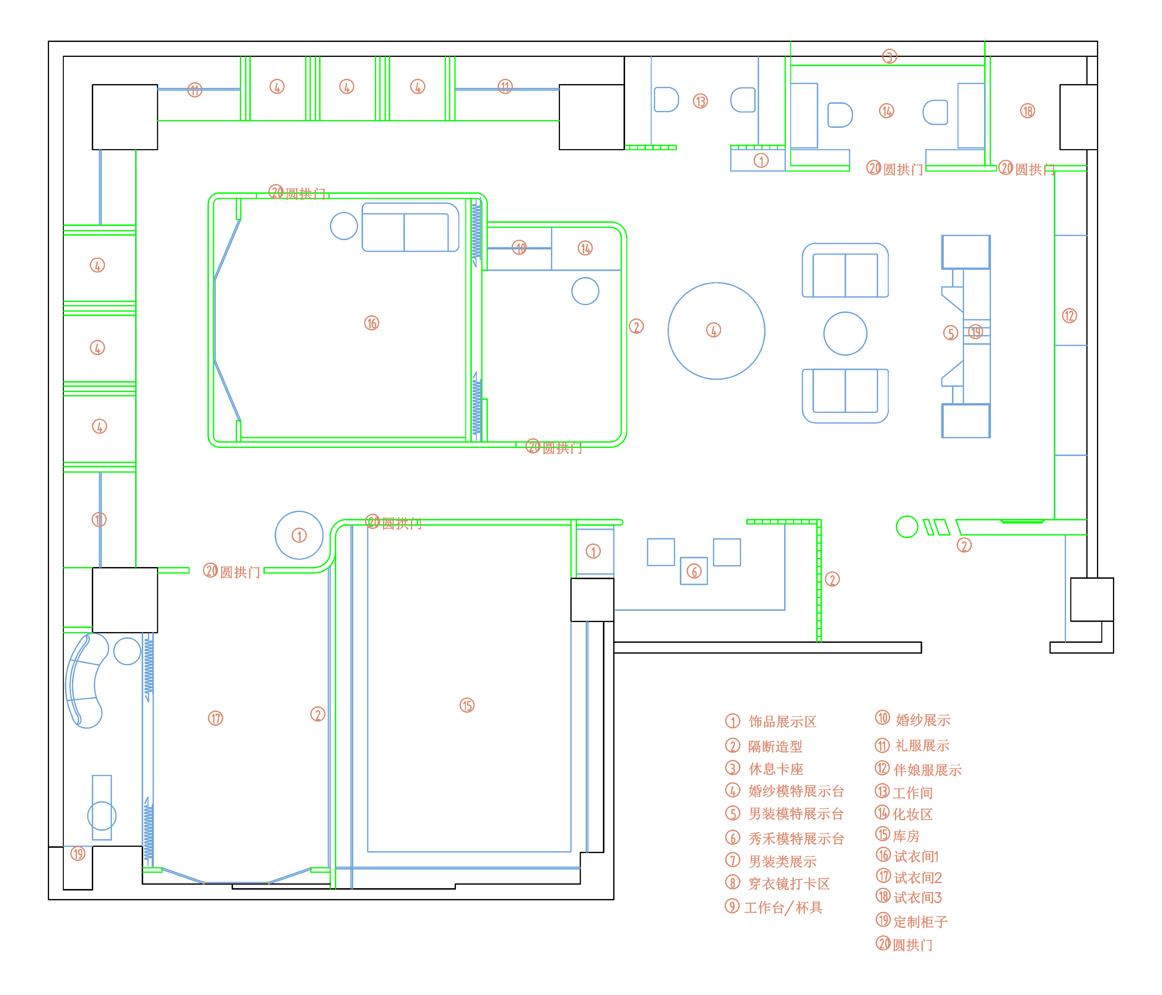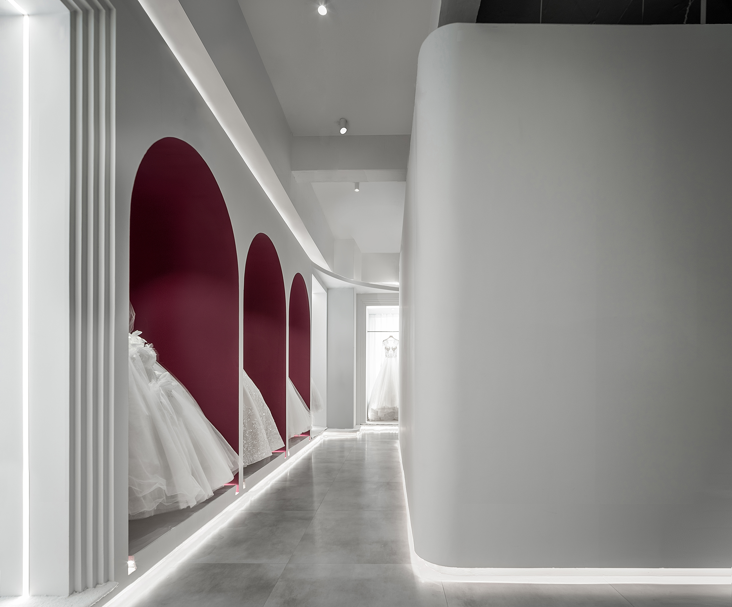 空间布局:主题展位背面采用镜面,增大空间视觉延伸感,暗藏光漫反射洒在婚纱背部,让婚纱增次更加立体,上方主光源,投射到下方,主体层次更加凸显。灯光在试纱间的重要性不言而喻,追求亮度,但不能丧失质感,所以在灯光设计上极为考究。被照射主体层次分明,婚纱质感才能更好的呈现。