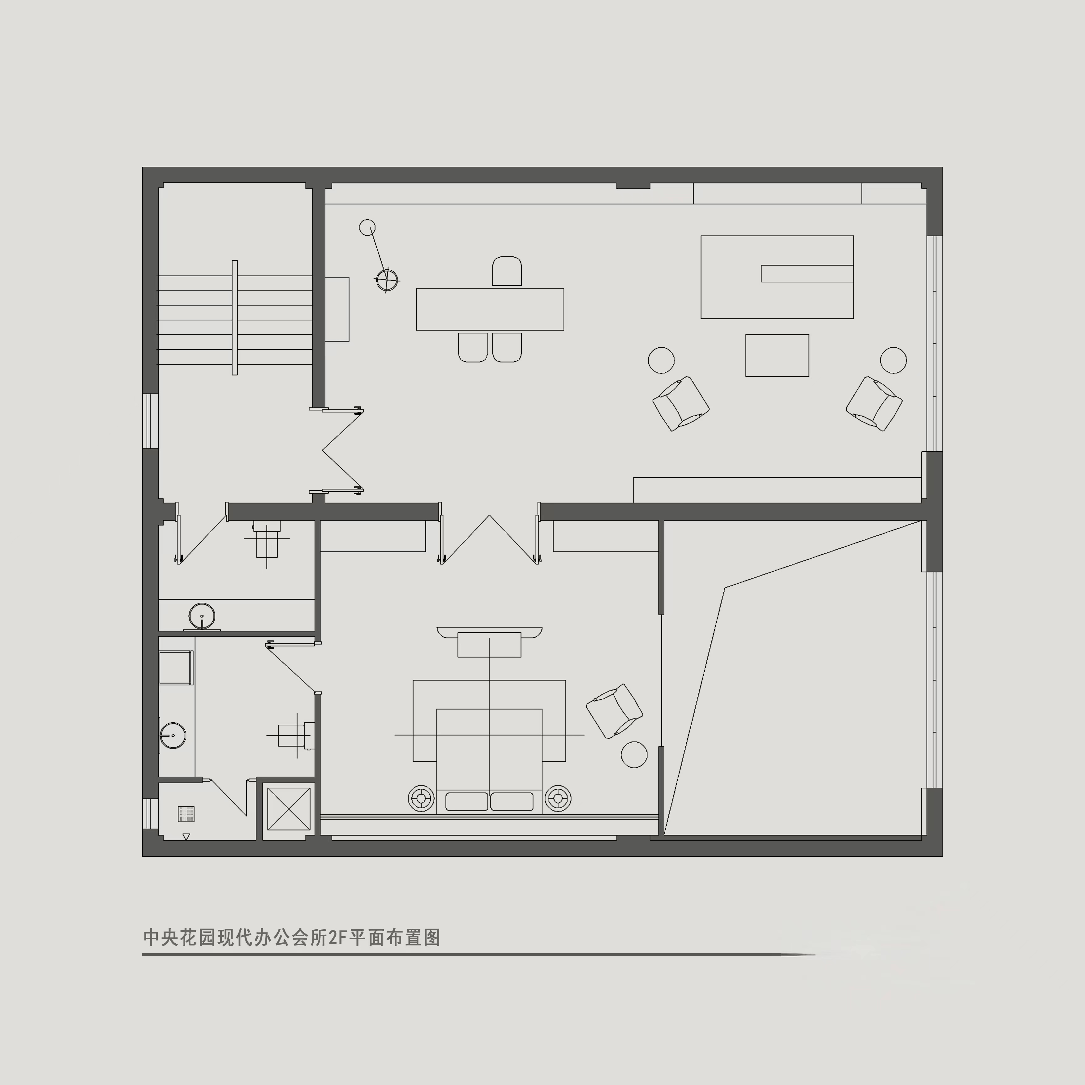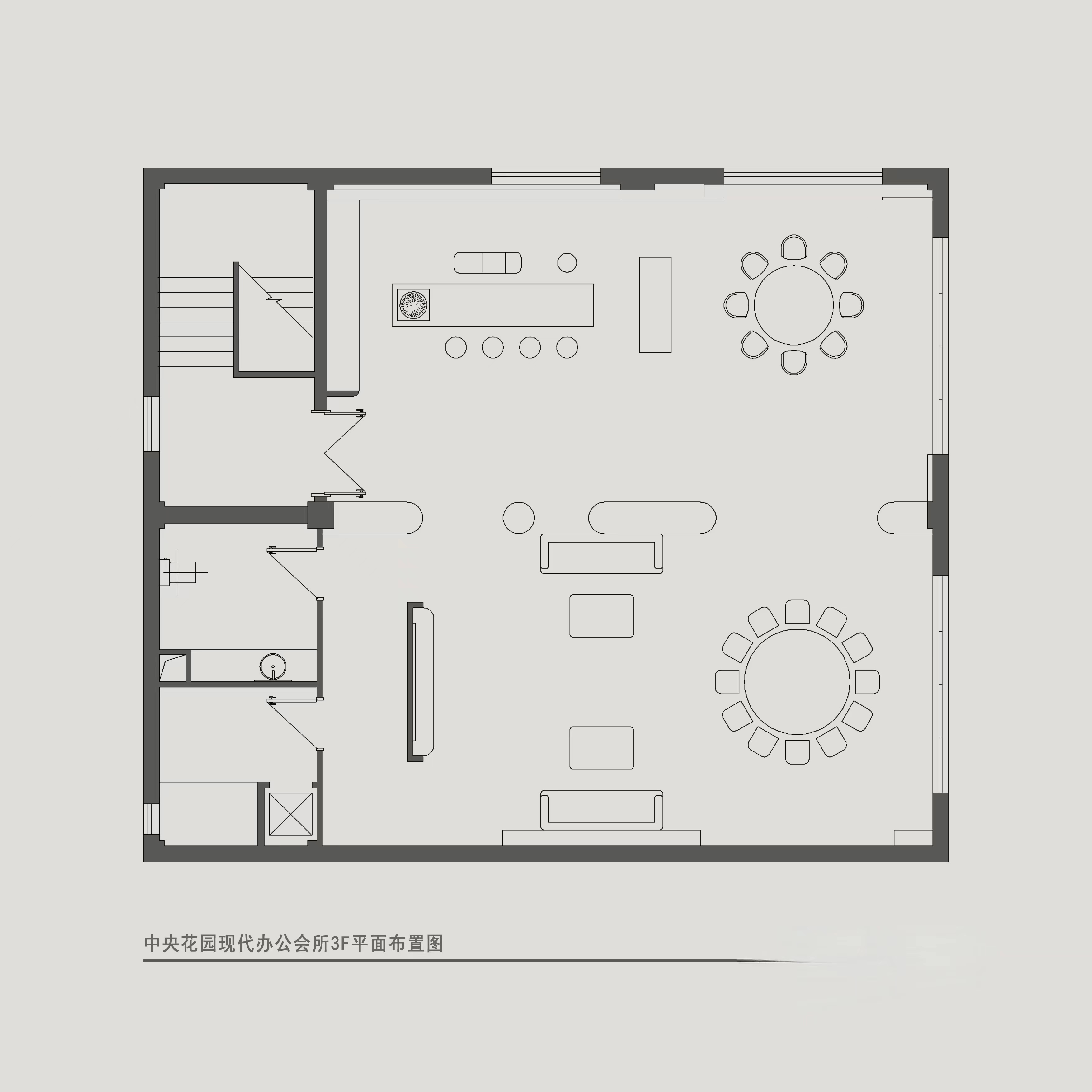 空间布局:一层调控区域使原本黑暗的二层同样享受到了自然光,三层会所接待区则做到了空间区分的同时又有一定的私密性