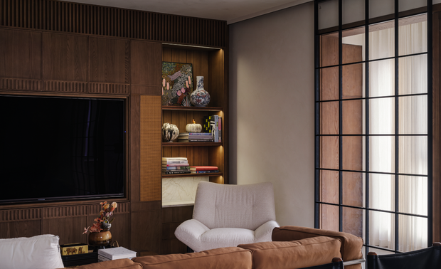 空间意境:我们希望这里是纯粹的、舒适的,可以让身体享受度假般的愉悦,也能承载丰富精神世界,为屋主找到居住空间中最理想的状态。我们选择度假侘寂风表达空间语境,同时在细节上表现出屋主对精致生活品质的追求。