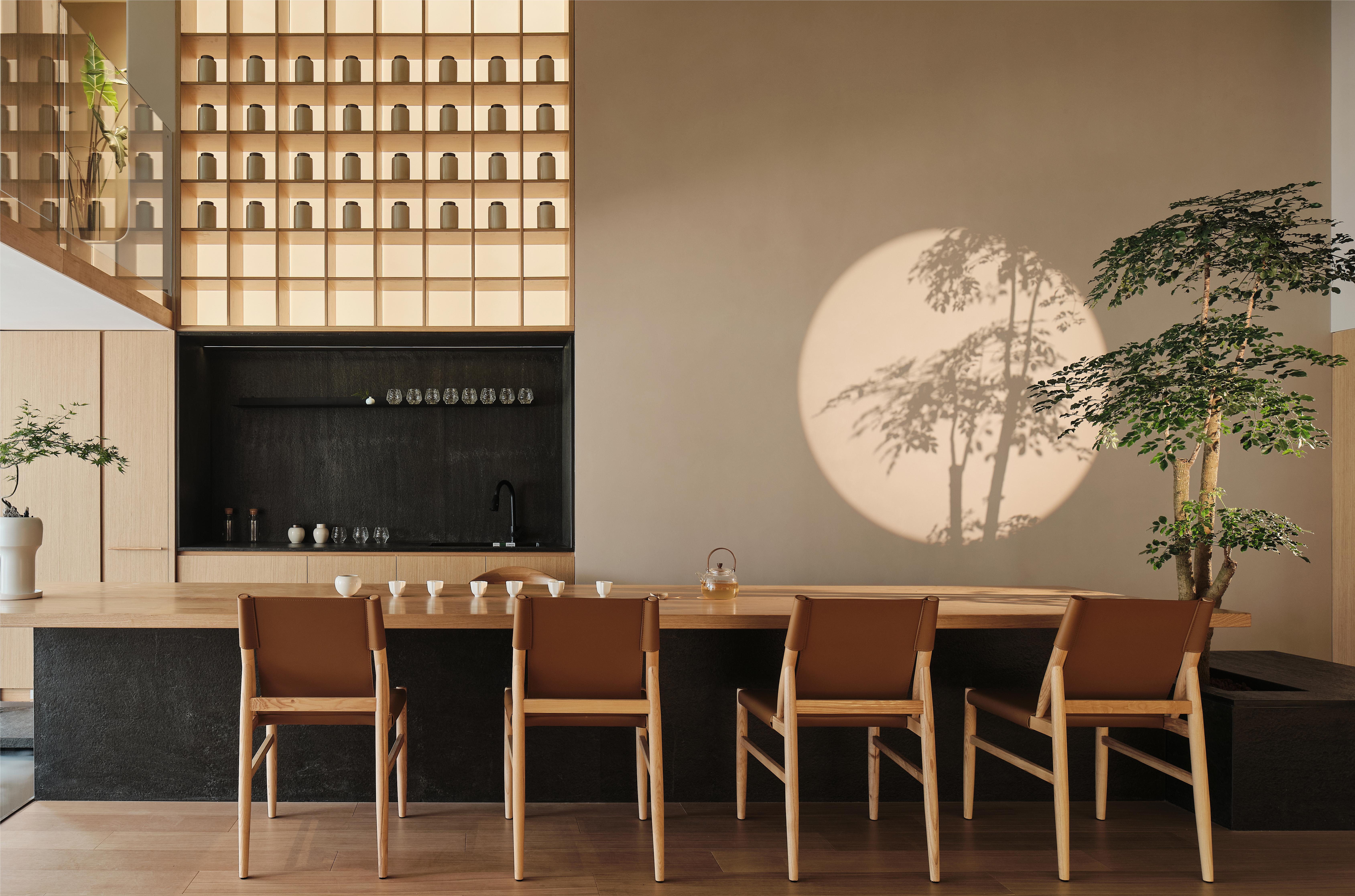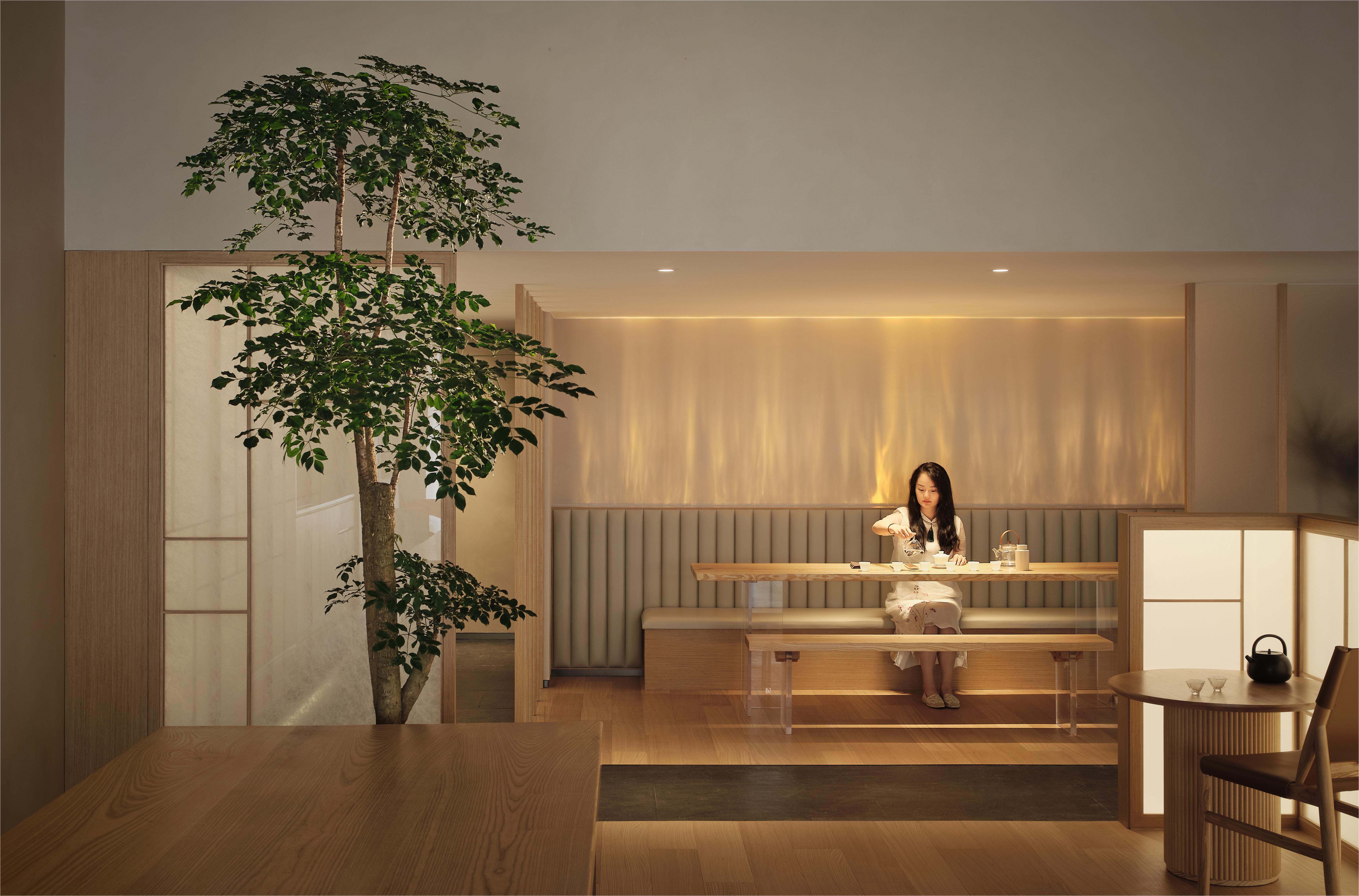 有关灯光:在解决自然光的同时,我们还需要防止天公不作美时,室内环境的不可控。因为高度我们减少了顶面点状光的表达,而是在人与人的区隔处理上使用了半透材质,赋予材质光的属性,以面光的形式塑造了空间和空间中的人。“珀”在无光的环境中就是石头一枚,正是有了光它的韵味才得以体现。 -