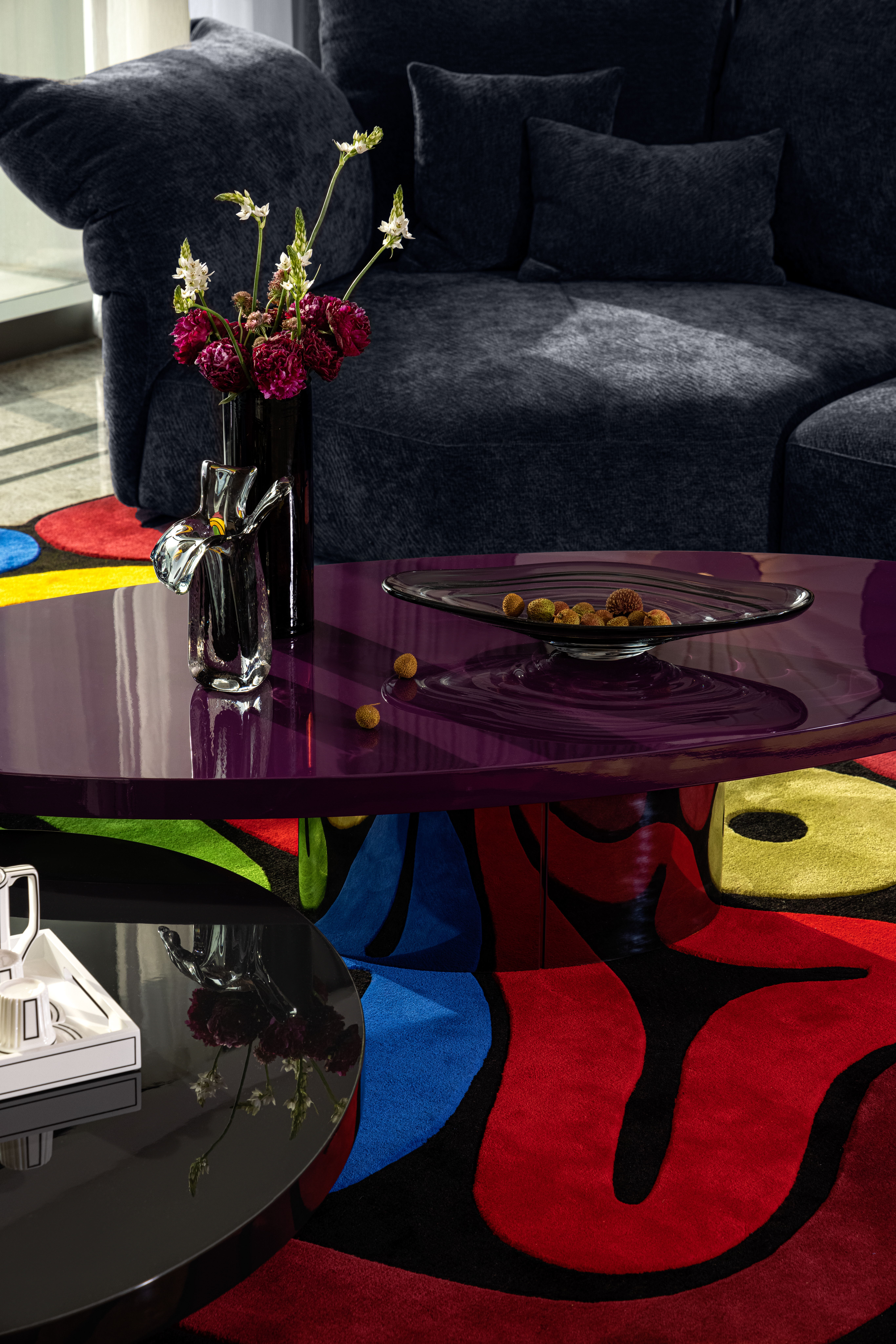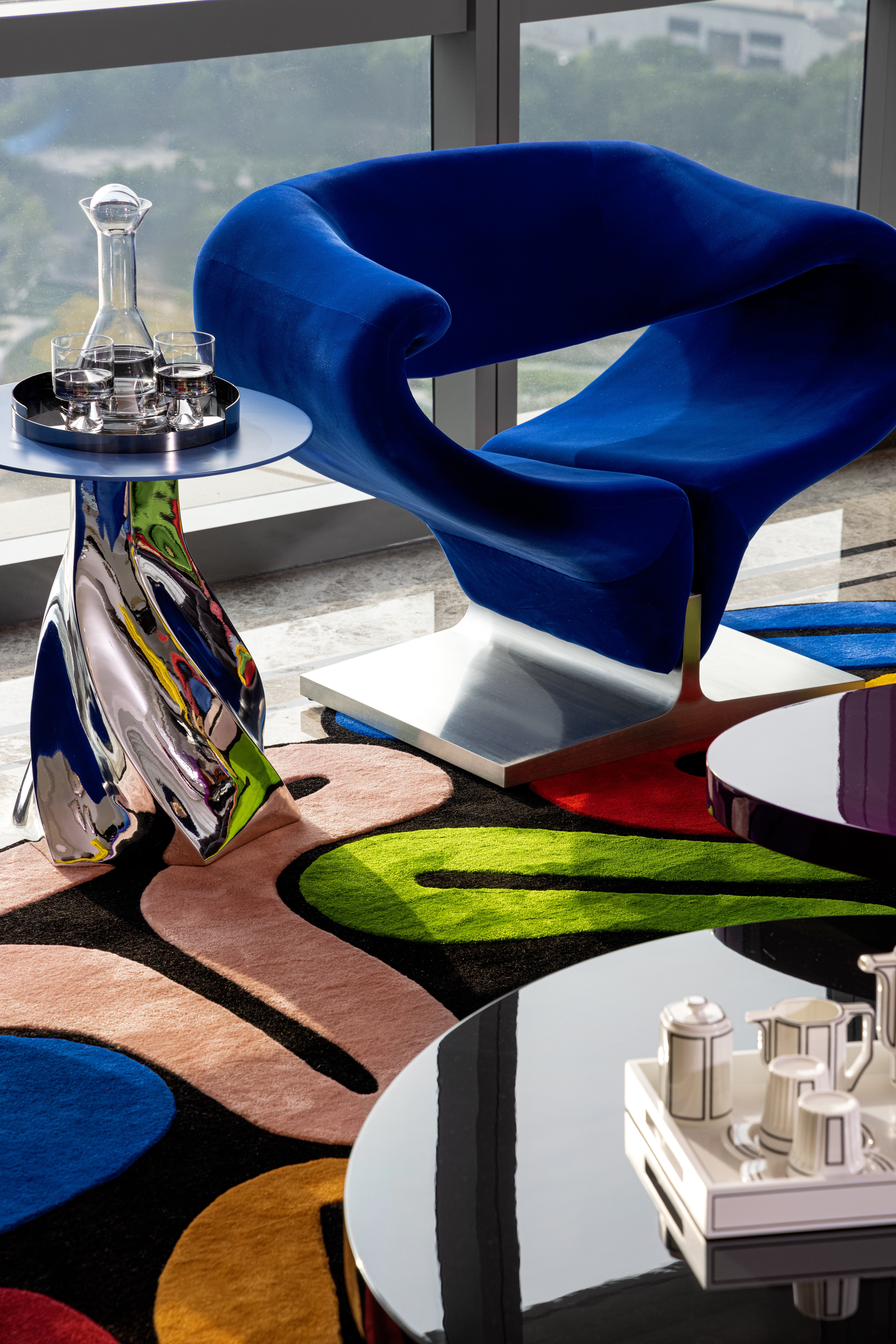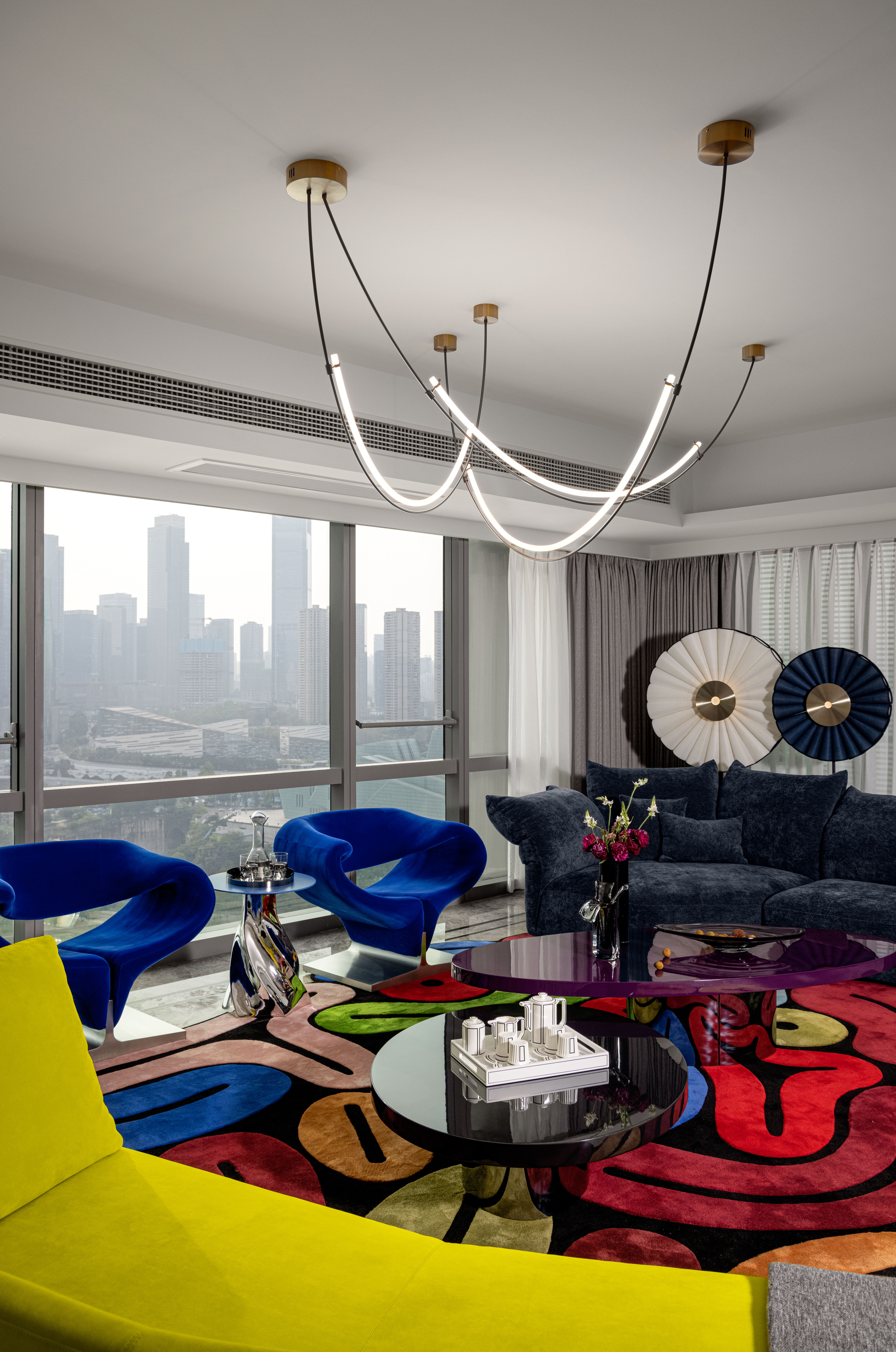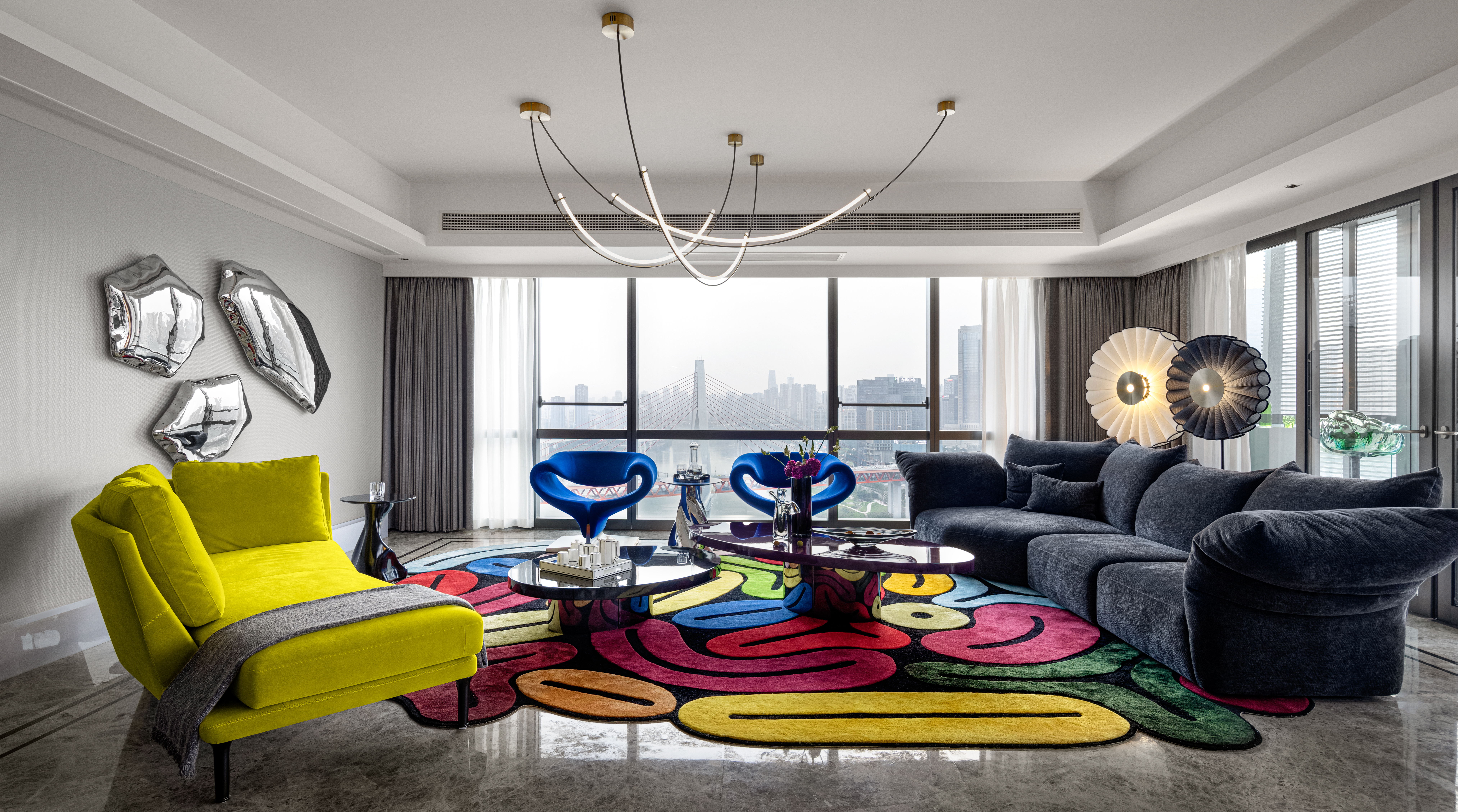 纯正的克莱因蓝与铬黄为主色,敞开的明亮与深灰沙发的内敛低沉在矛盾中合二为一,展开绚丽而精致的浪漫韵味;为全面而深入的呼应《红色浪漫》,客厅地毯以不同形状的红橙黄绿青蓝紫的彩虹色,倒映在纯黑与极光紫的茶几上,勾勒出鎏金岁月的魅惑质感,跟随昼夜流转,在光影堆叠中感受一种沉浸式的居住体验。