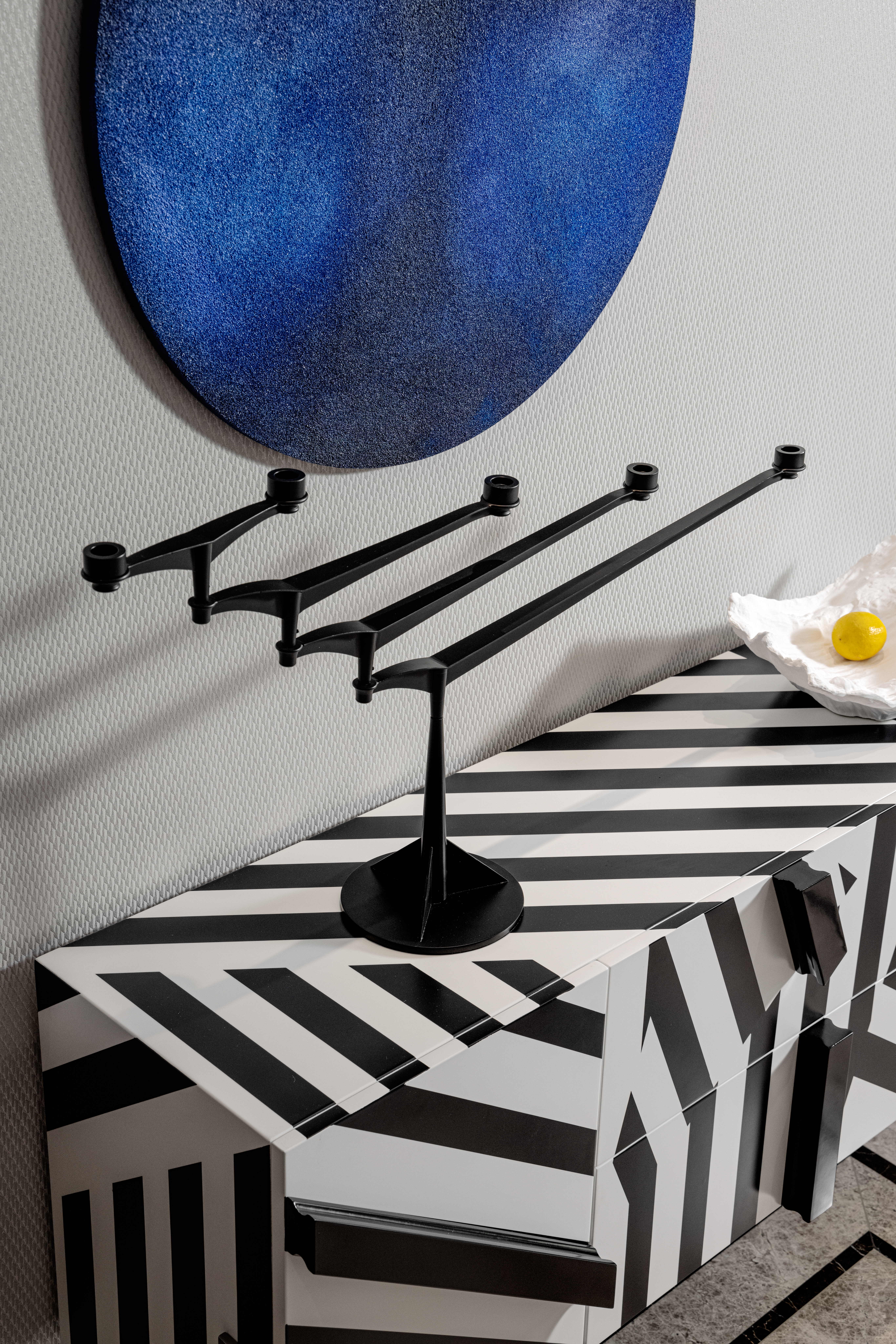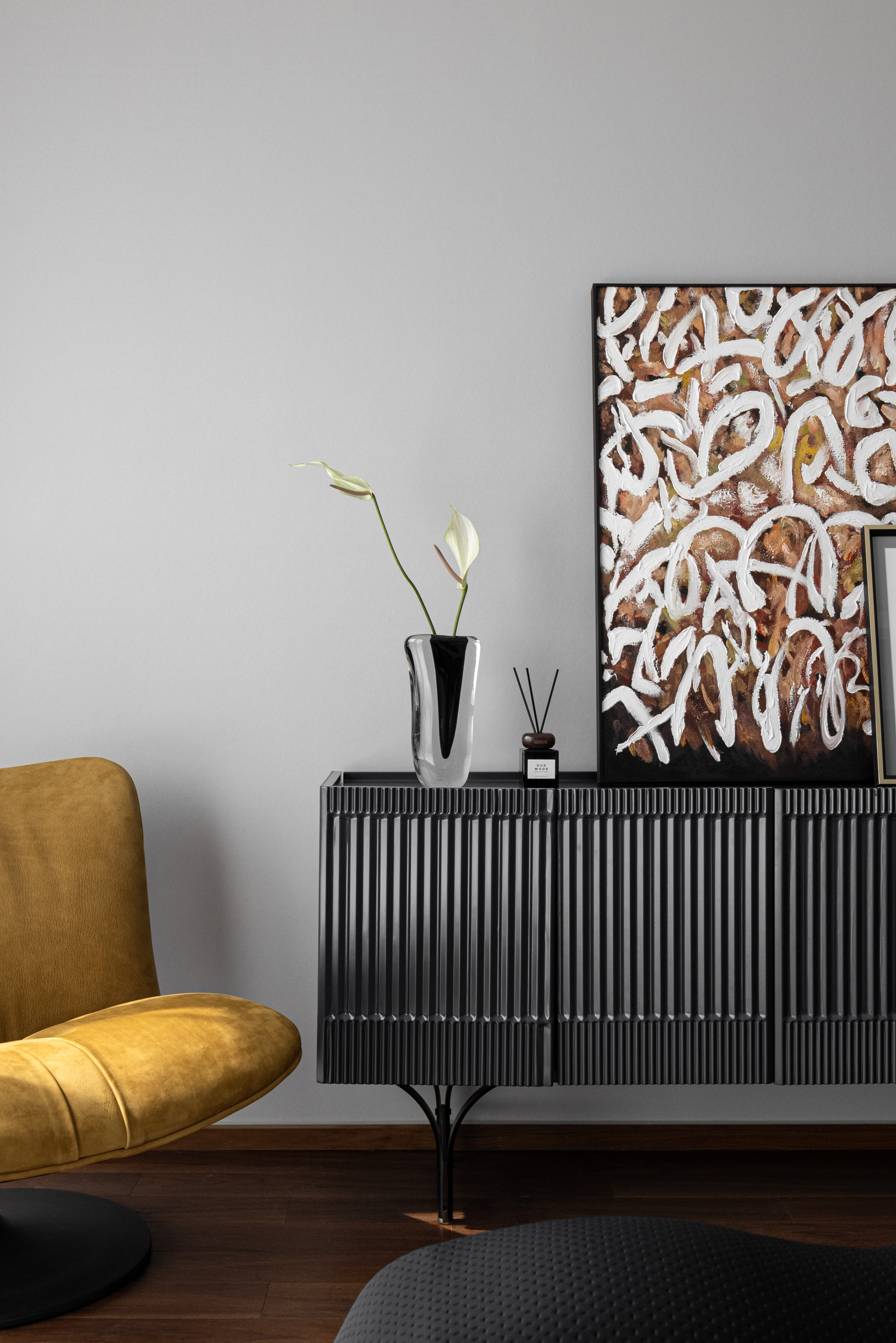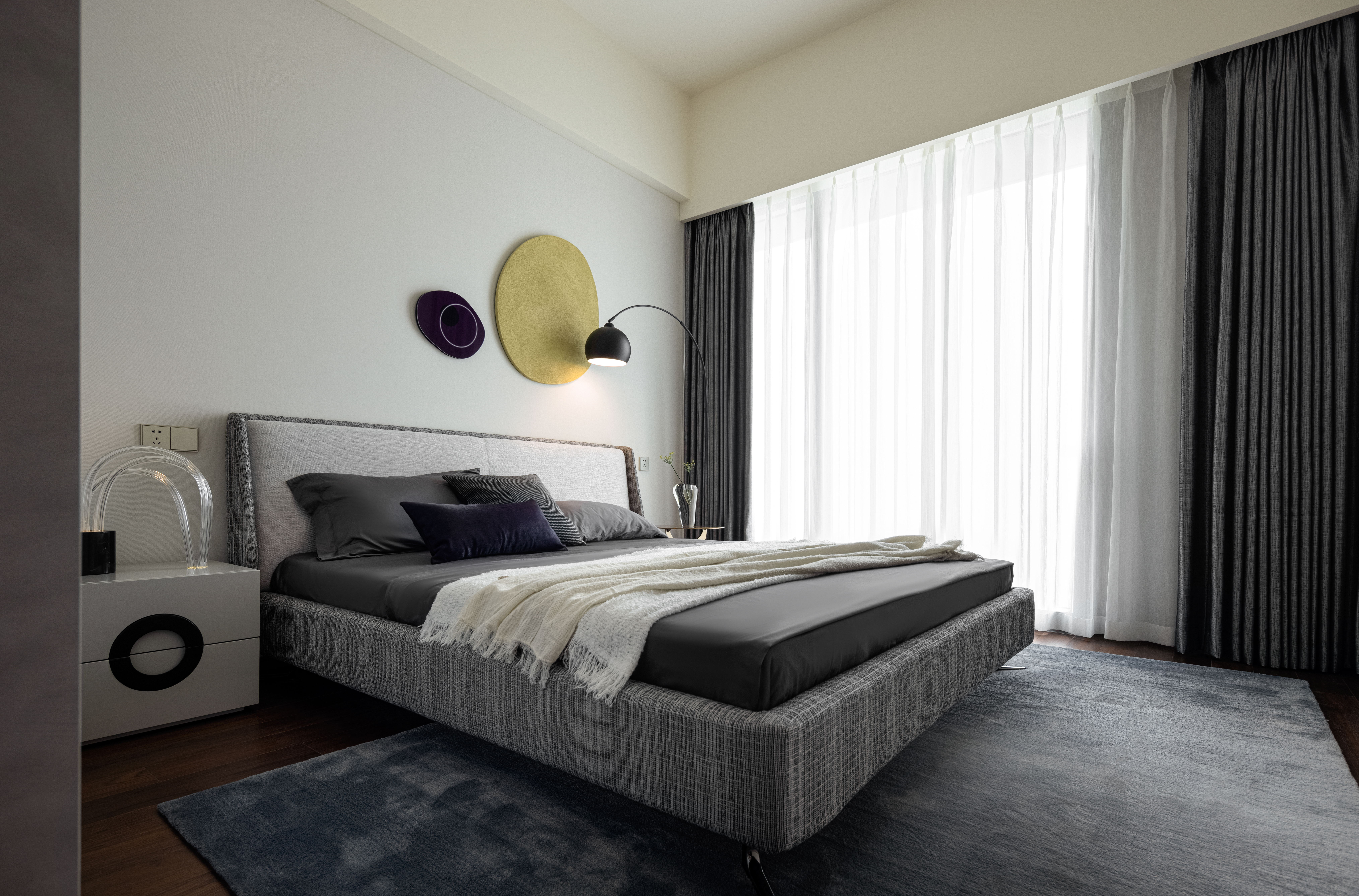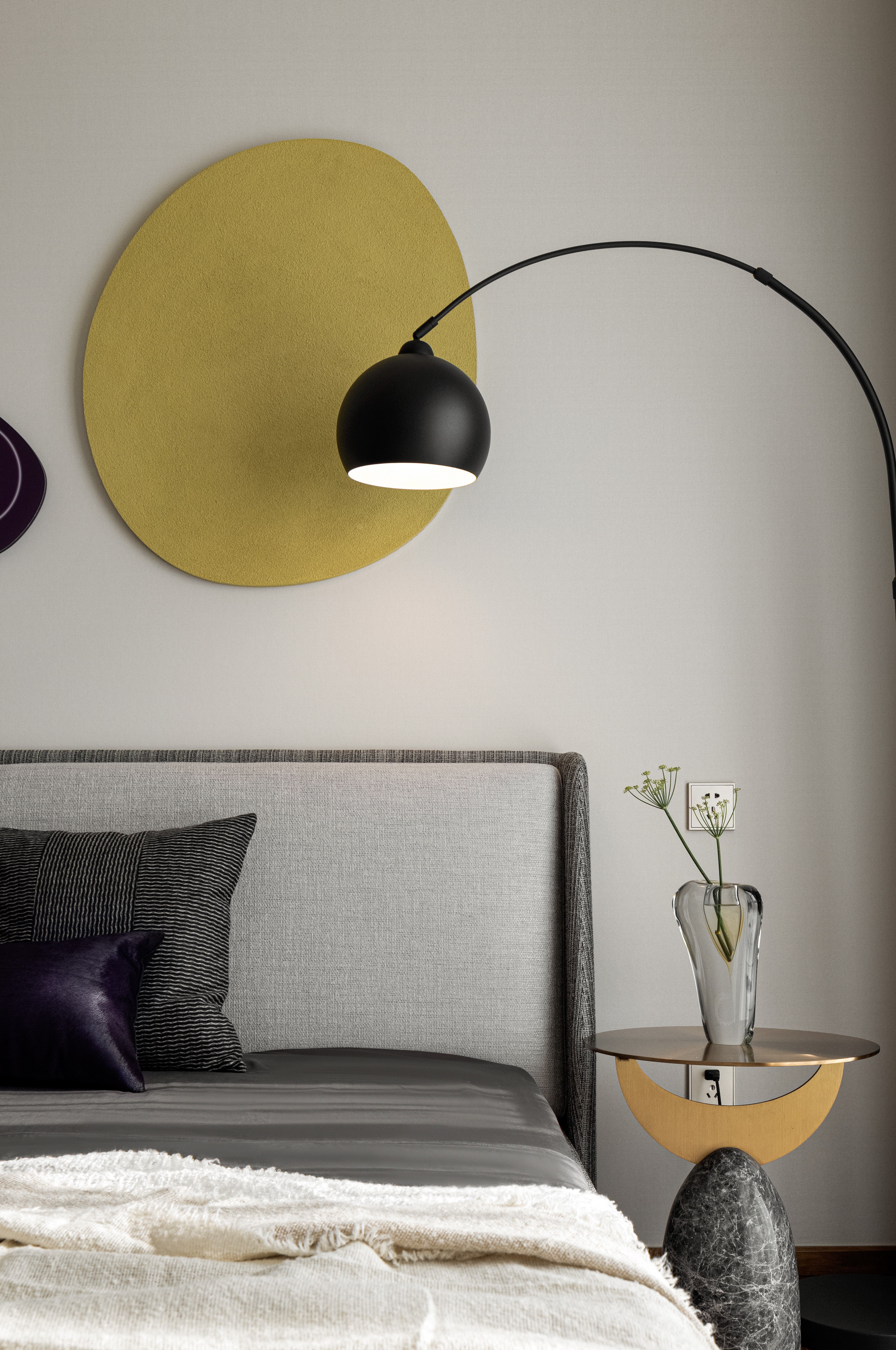 纯正的克莱因蓝与铬黄为主色,敞开的明亮与深灰沙发的内敛低沉在矛盾中合二为一,展开绚丽而精致的浪漫韵味;为全面而深入的呼应《红色浪漫》,客厅地毯以不同形状的红橙黄绿青蓝紫的彩虹色,倒映在纯黑与极光紫的茶几上,勾勒出鎏金岁月的魅惑质感,跟随昼夜流转,在光影堆叠中感受一种沉浸式的居住体验。