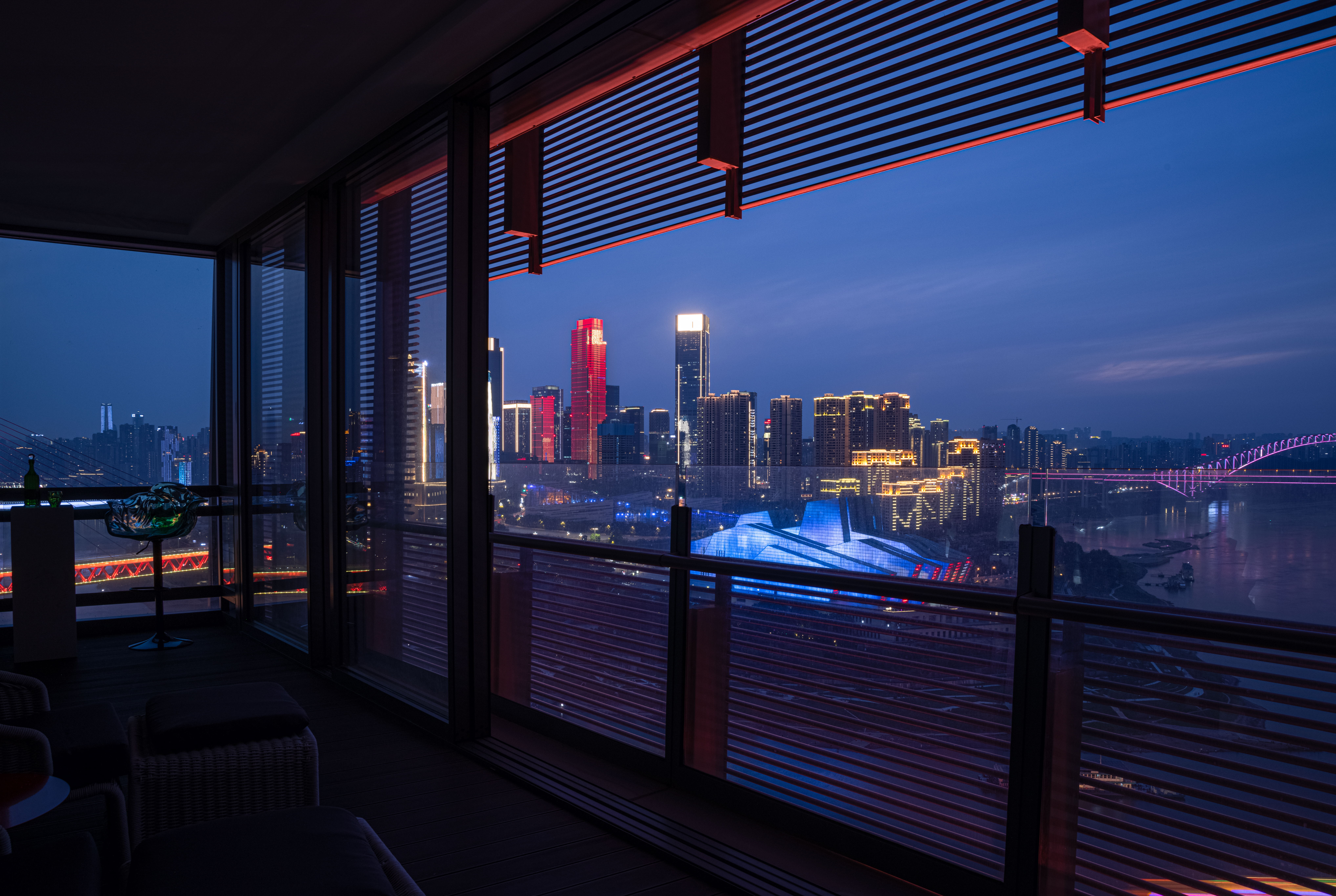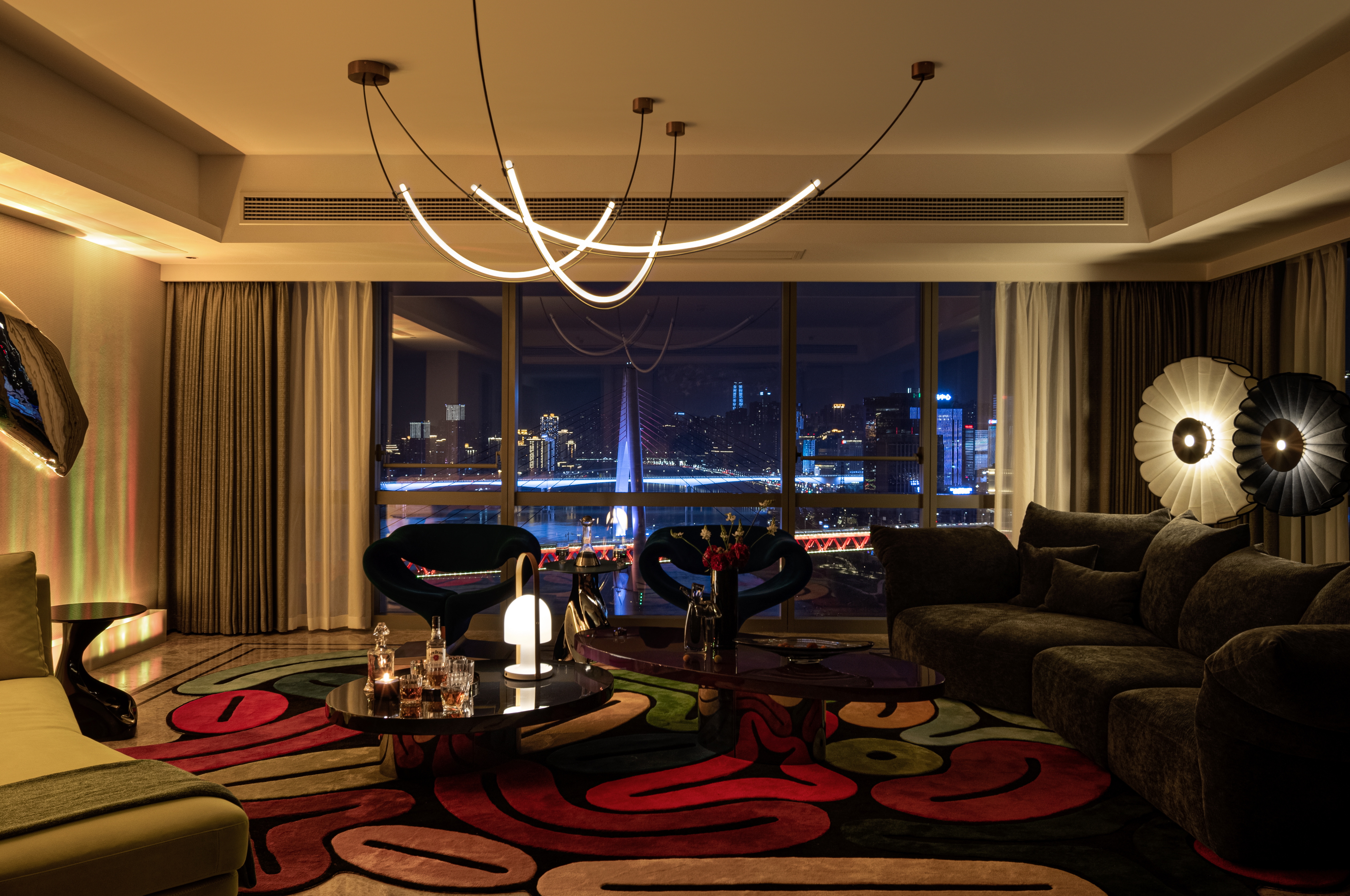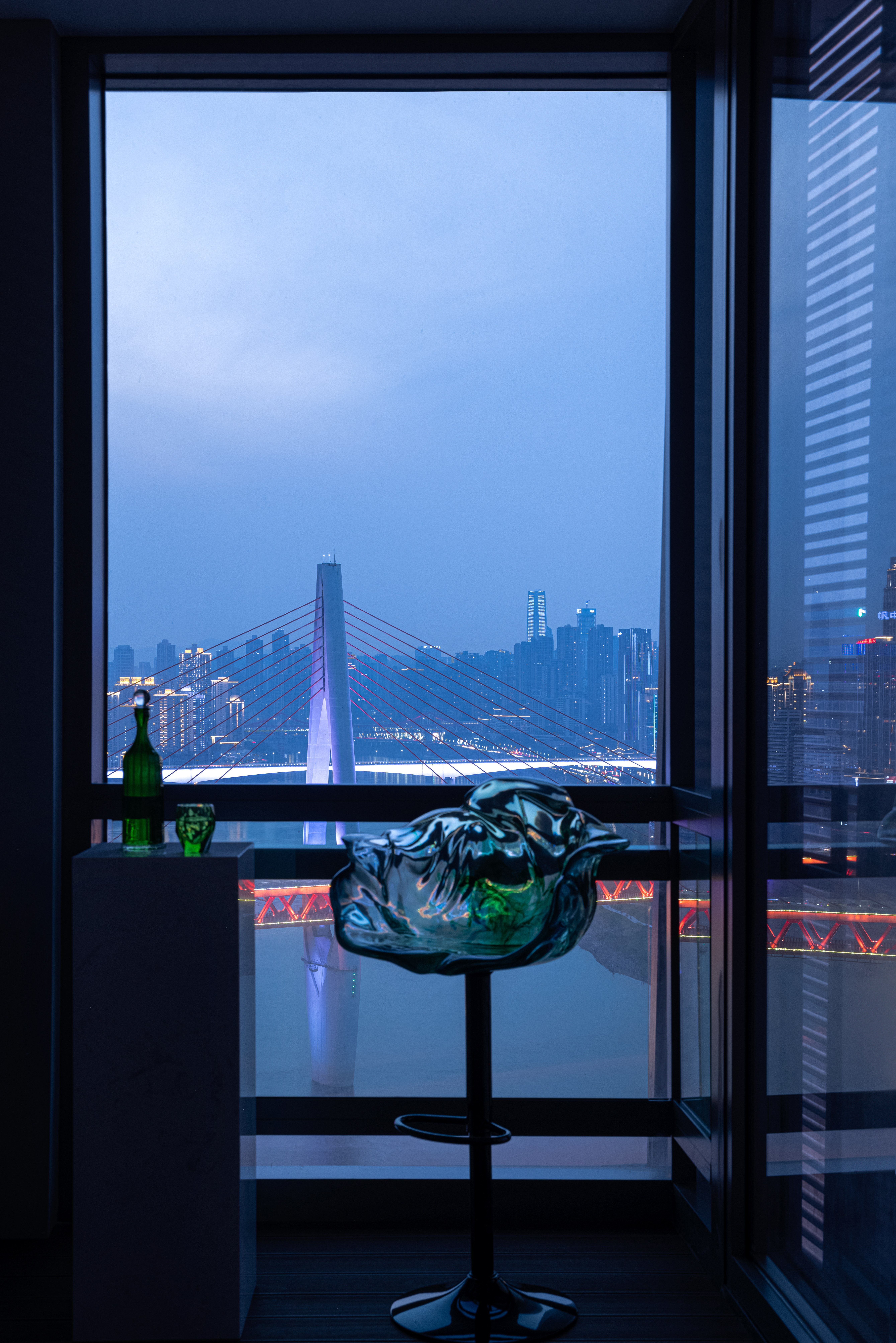 本案位于朝天门来福士,作为“新旧重叠”的地理位置,整个作品的设计语言也通过多种色彩的交汇去囊括居者的情绪——业主生长于重庆,但长期居住于美国和上海,这个空间是业主对家乡、对一座城市、 对内心深处最遥远记忆的呼唤,亦是融于当下华灯而仍独享自我的【乌托邦】——大胆奔放的选色带来视觉冲击,浓烈而又细腻的情感则被设计师一点点从深处唤醒。