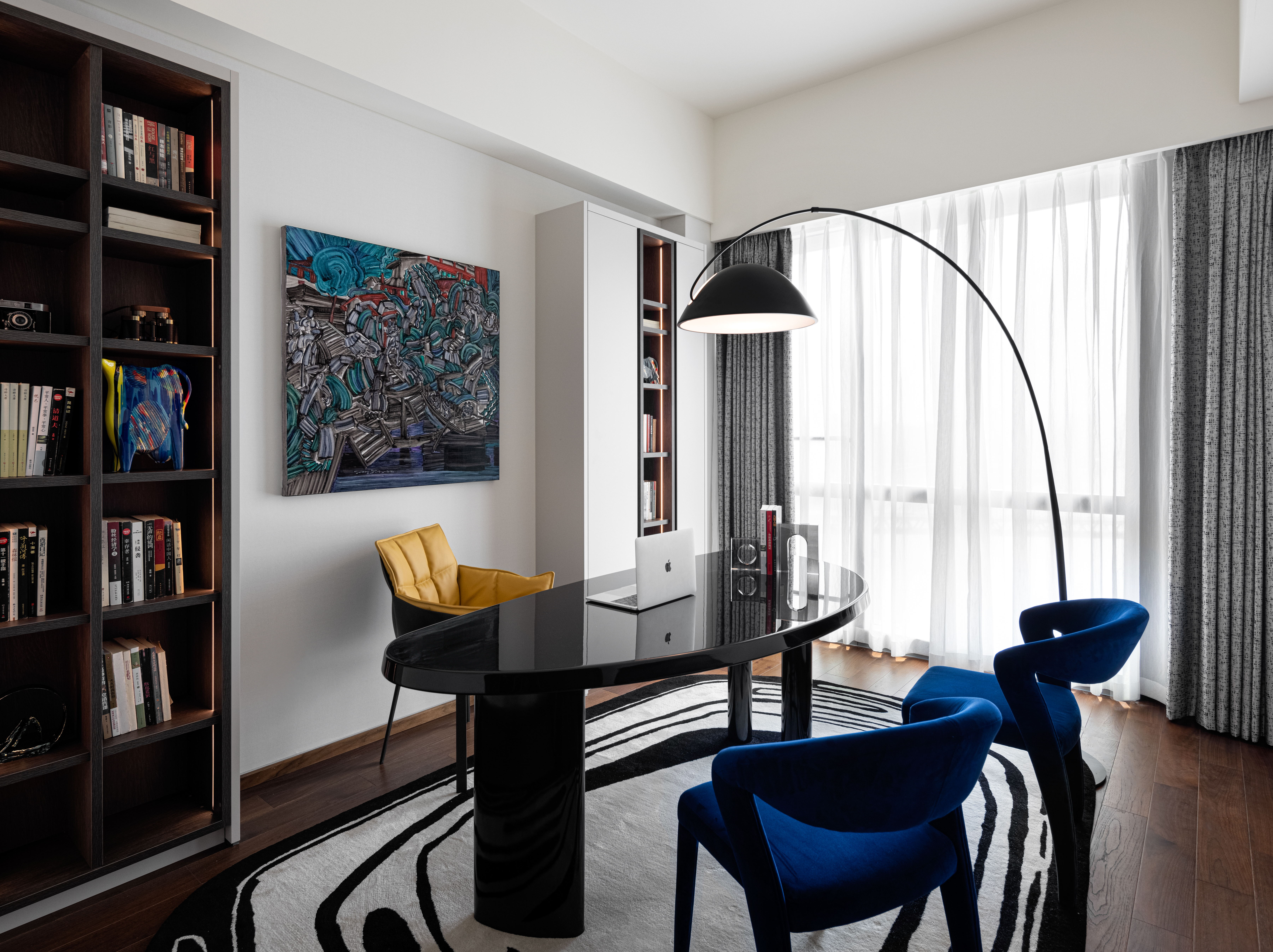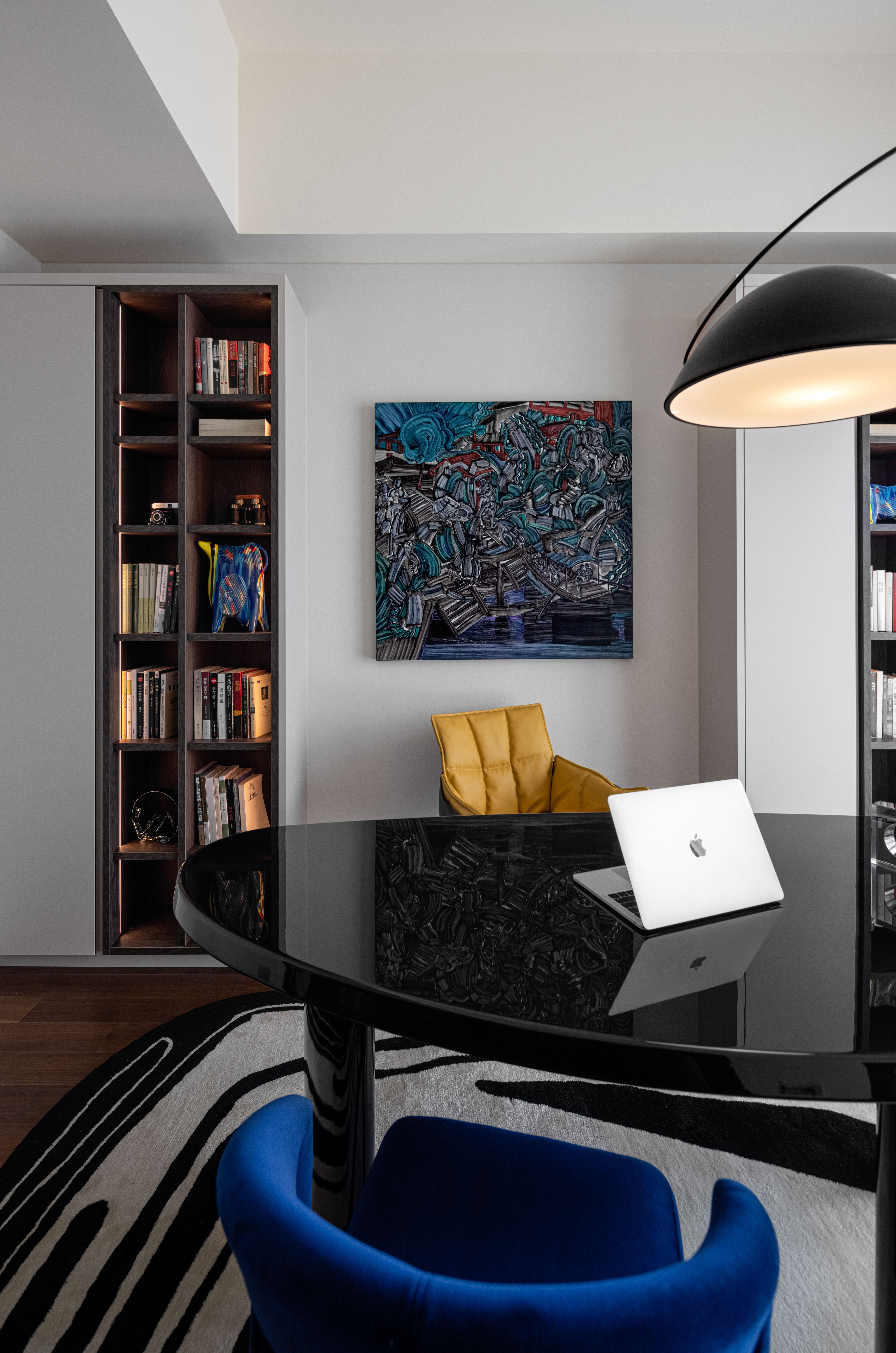 书房完美延续客厅般跳跃的色彩,克莱因蓝、铬黄、些许的魅惑红,成为居者缩小版的精神世界,从视觉到触感,唤醒心灵深处的能量感知。