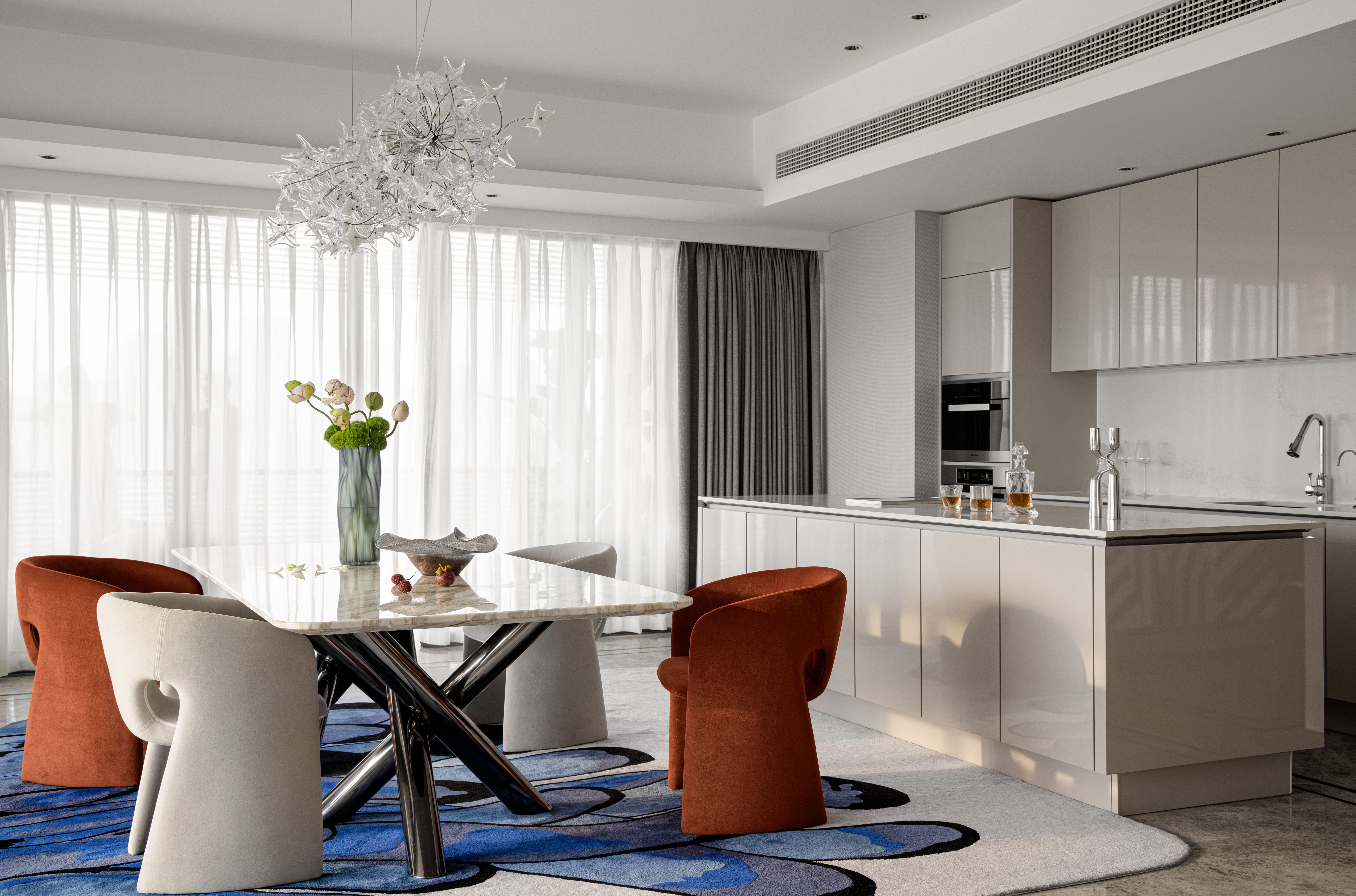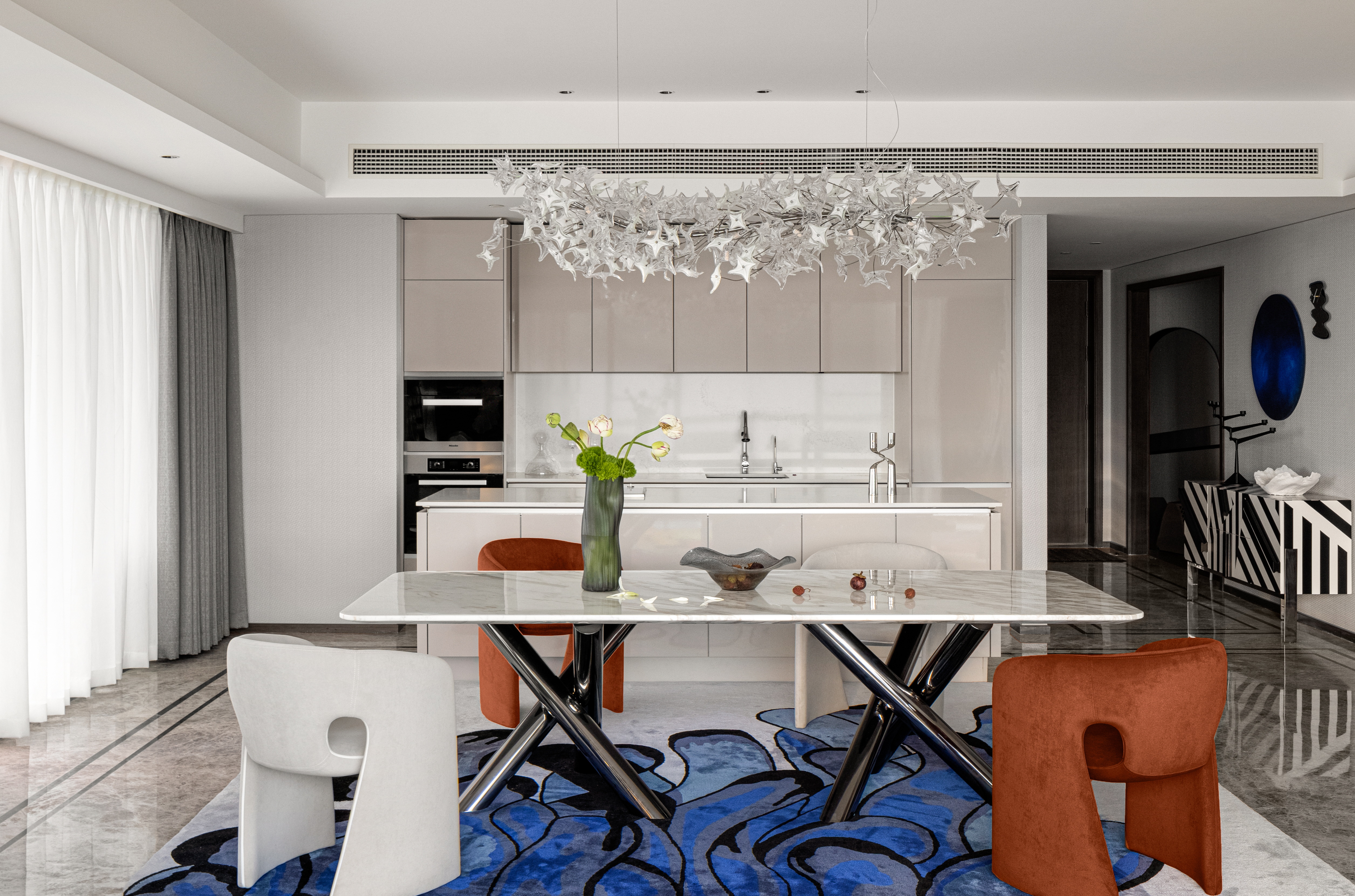 开放式的格局将客餐厅巧妙连接,大胆且充满想象力的斑斓地毯加强了更加丰富的视觉冲击。来自意大利品牌的餐桌以奢石为底,不锈钢桌脚造型呼应空间主题氛围,极简又精致;简约大气的西厨设计保持经典雅致的气质,与客厅形成鲜明对比的同时,三个区域却又因优雅的线条而彼此吻合。