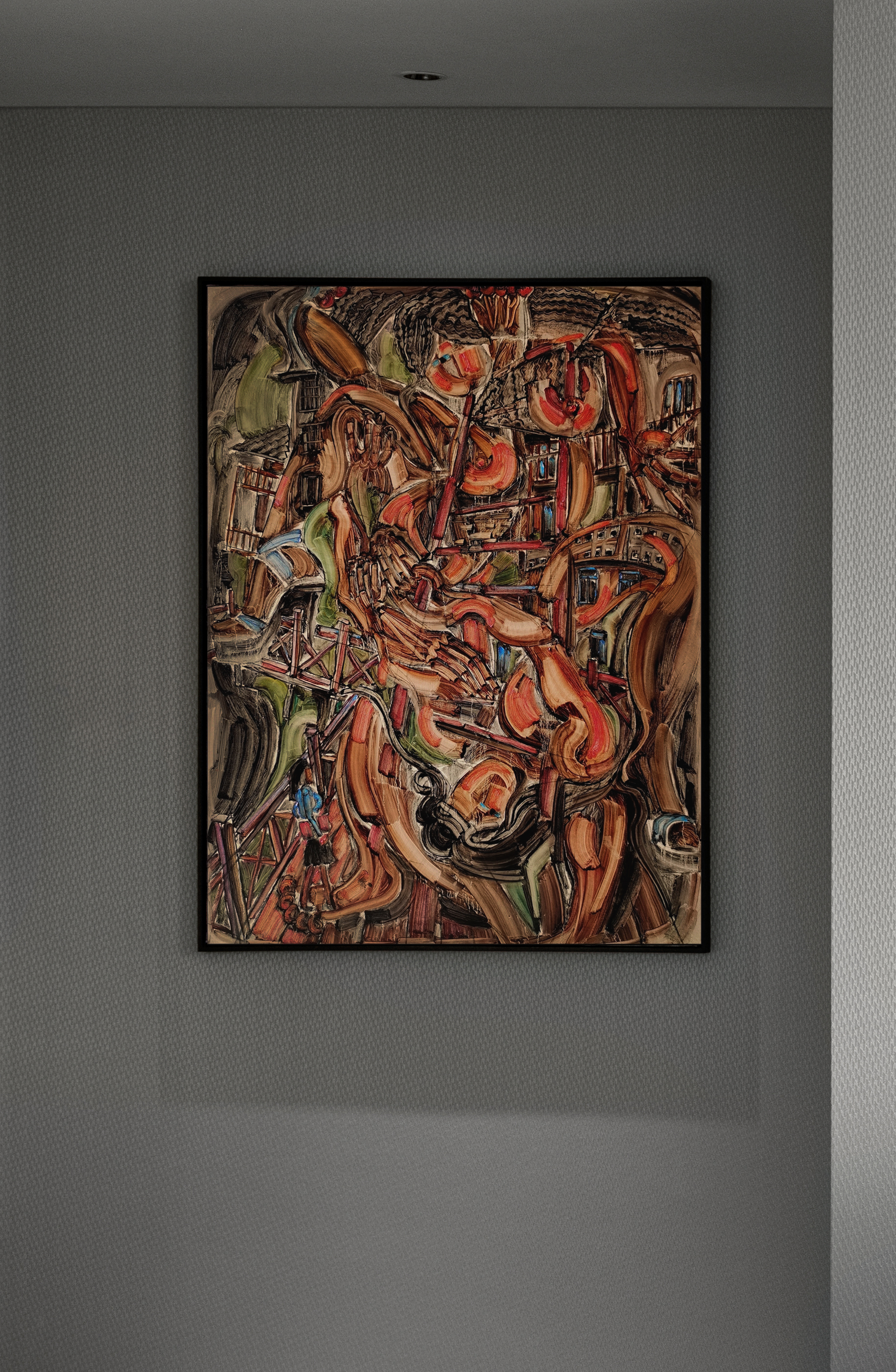 设计师选用原创艺术画——著名画家邓语光老师的经典名作——《红色浪漫》作为整个空间的基调,一切以它开始,延伸,又归于其中。《红色浪漫》,整体背景以红色为底,画面是重庆特有的建筑吊脚楼为主元素。红色,是火热炽烈,是心底最赤诚的喜爱;吊脚楼,其独特的魔幻感和记忆,是过往岁月情感在此画中的凝结。整个山城无论如何演变,当居者立于其间,便能感受到它最初的温暖和成长的轨迹,而这也恰恰也是此空间之于人的意义。