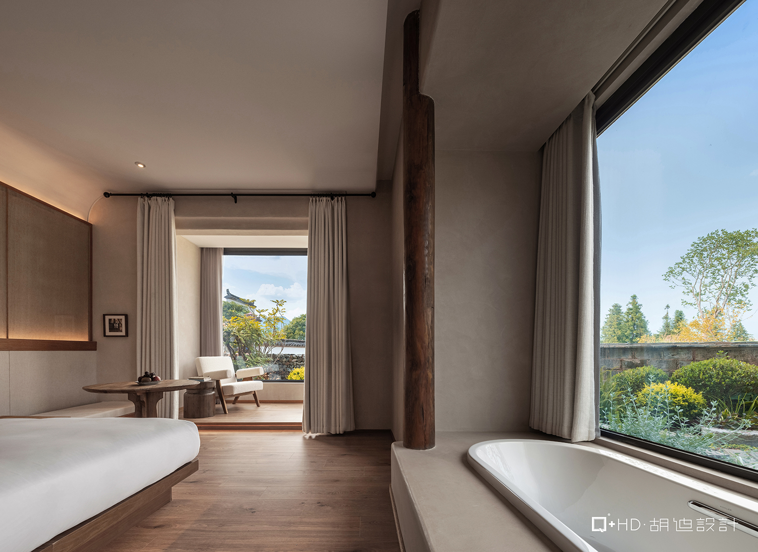 空间布局:空间强有力的老徽州质感融合当代性明亮,面朝田园,背靠南屏山,在建筑体块中最大化开出一道道水平玻璃窗,能从各个角落望见窗外的风景,尽最大可能地与自然进行对话,四周大开窗的玻璃设计将景色引入室内,以景喻情,让你离开浮躁的城市,悠然躺在床上,眺望远方风景,放松和放空。