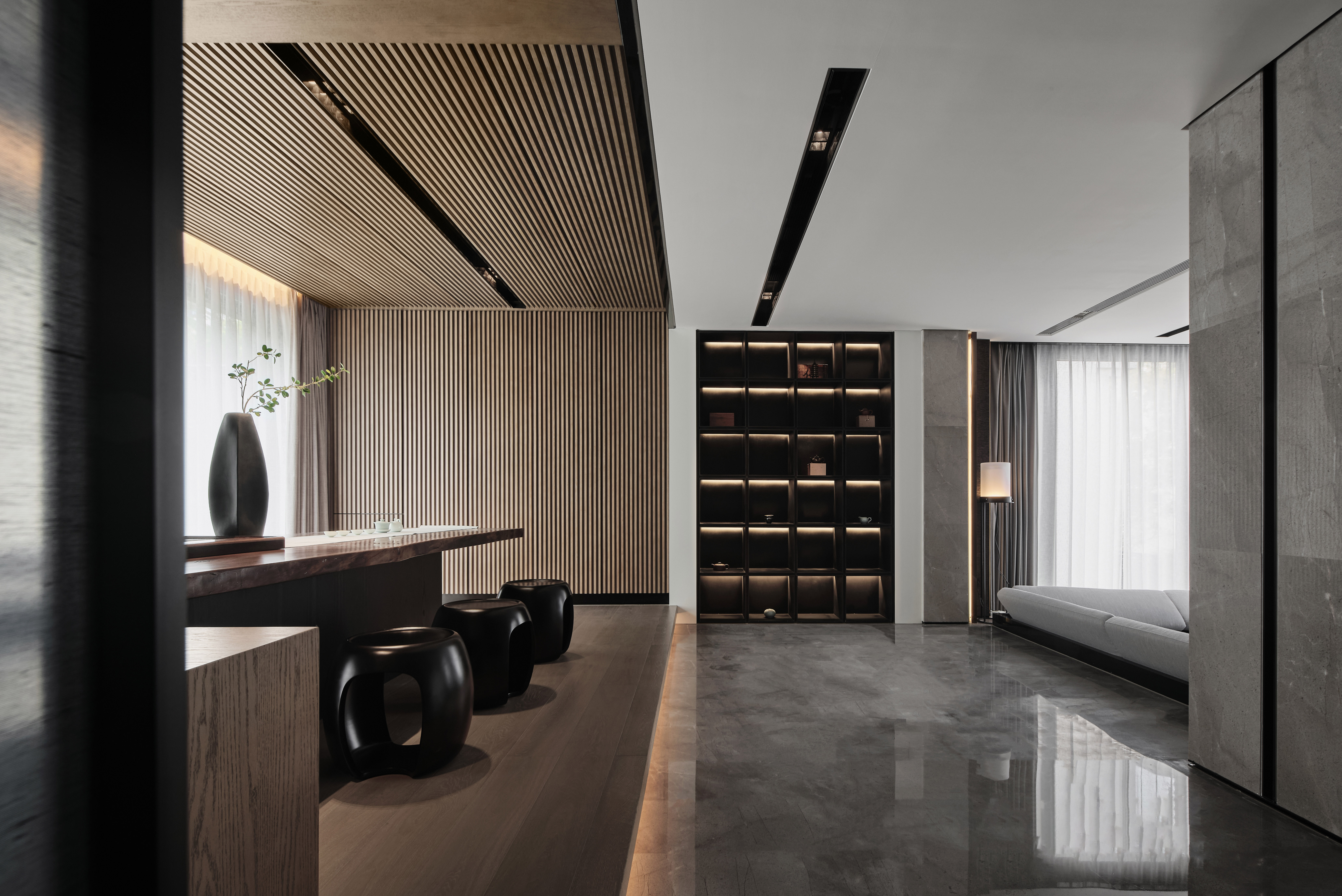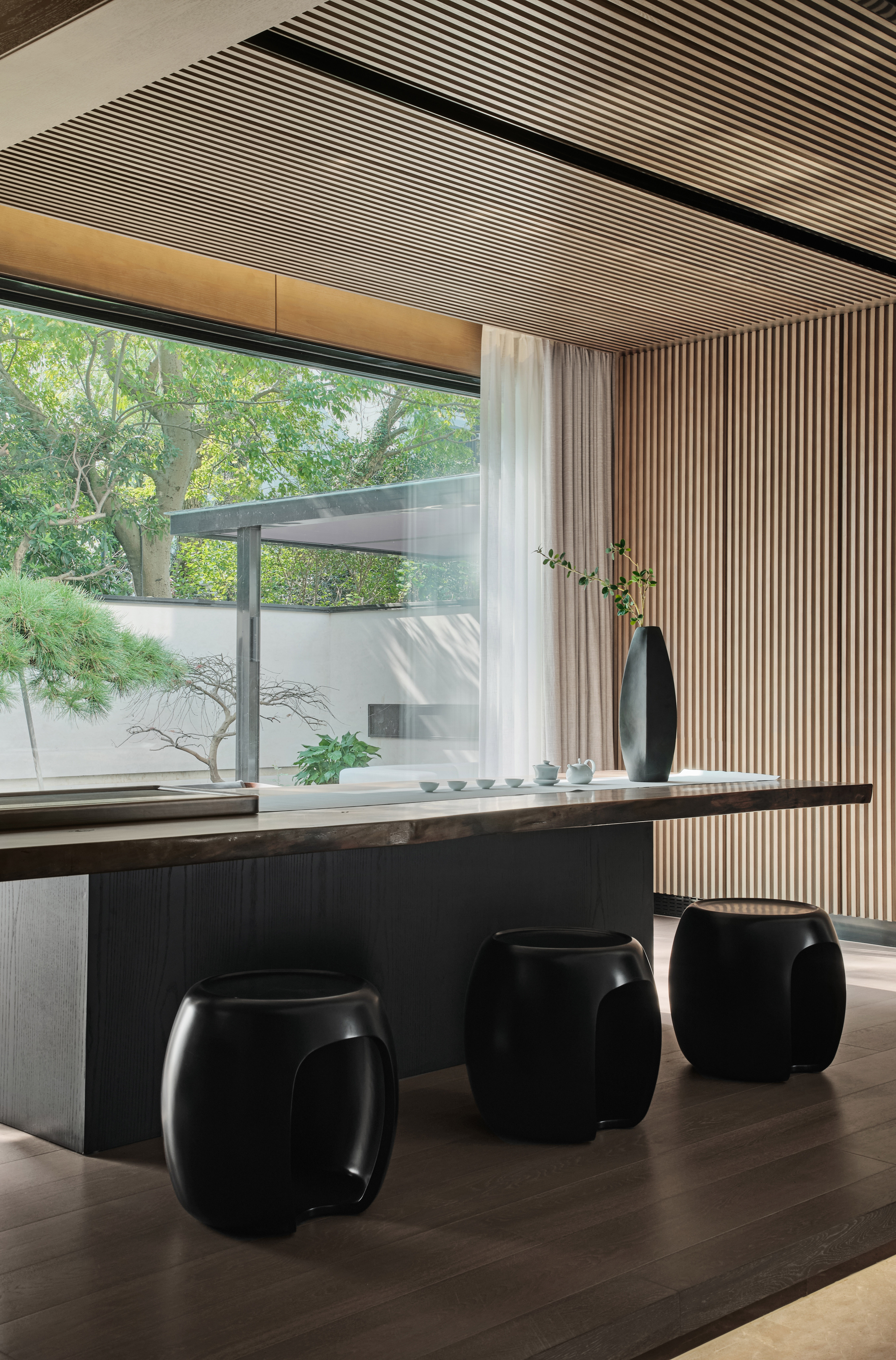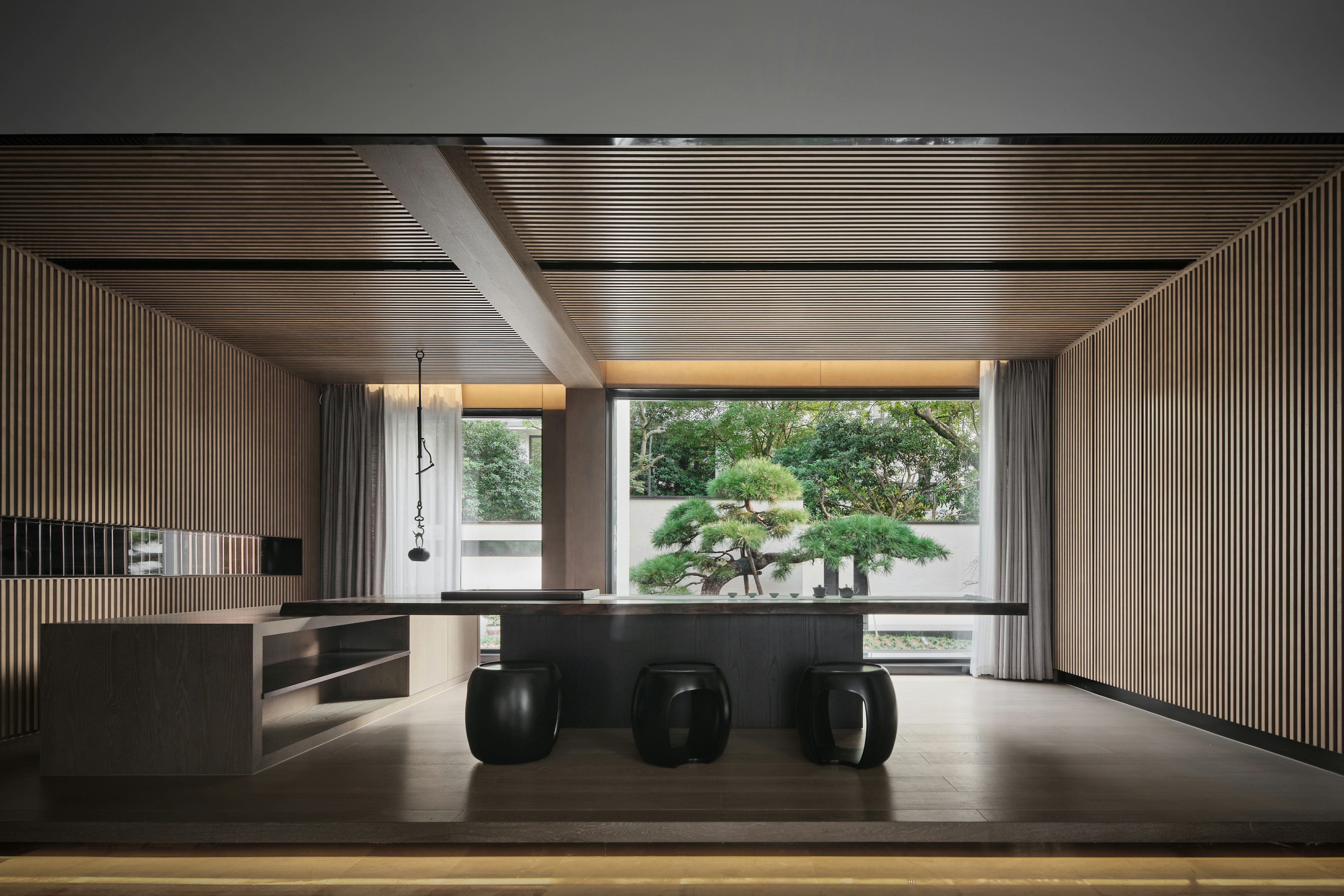 2、茶室临窗,天然木材的肌理搭配纵向排布的线性,极简影像渗于其内。艺术装置、仿古鼓凳、中式瓶器、内嵌灯带、隐藏式音箱、多宝格与庭院青松的点缀,使得空间在东方式风雅里又徽显着超越物表的现代兴味。