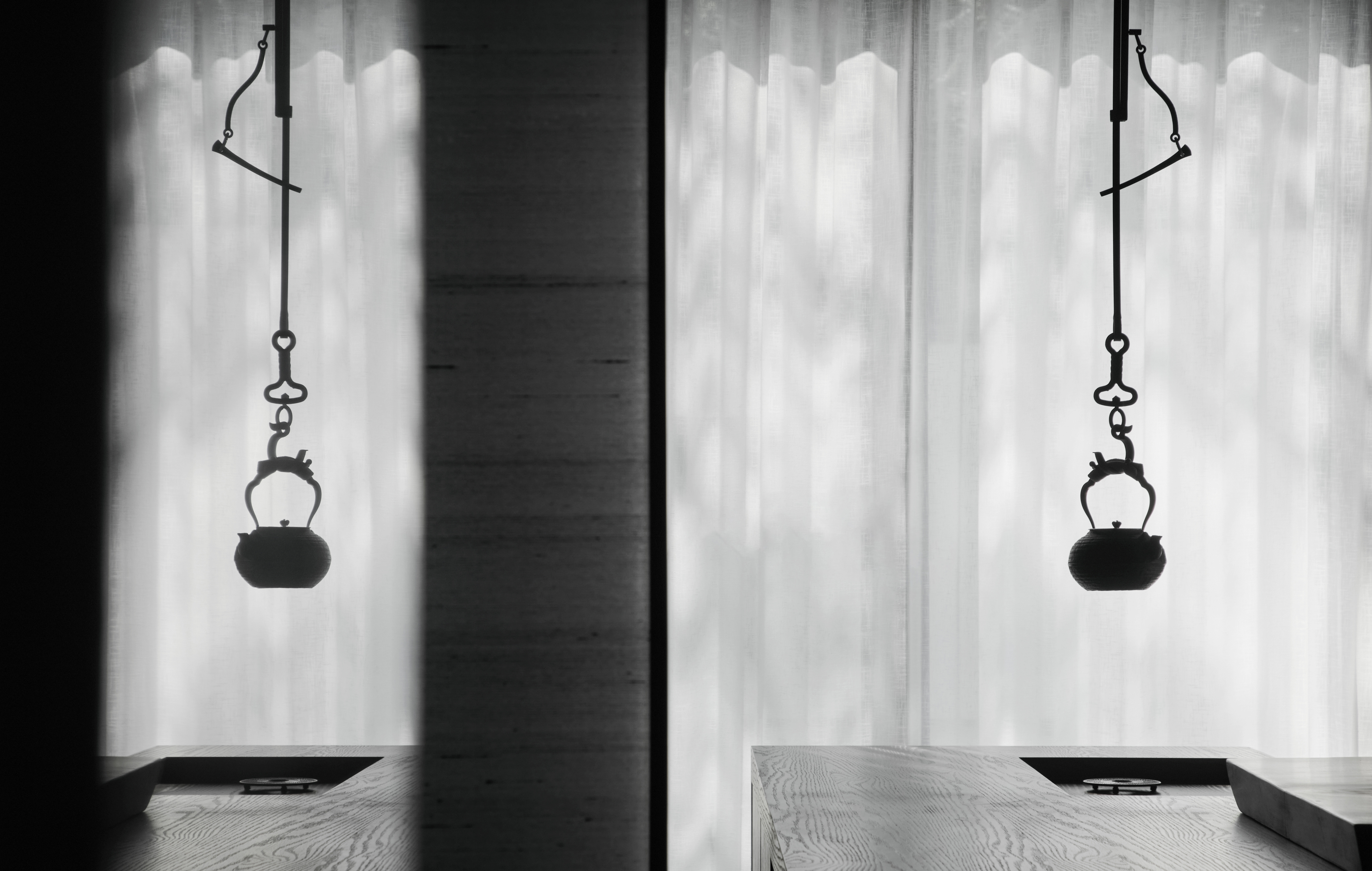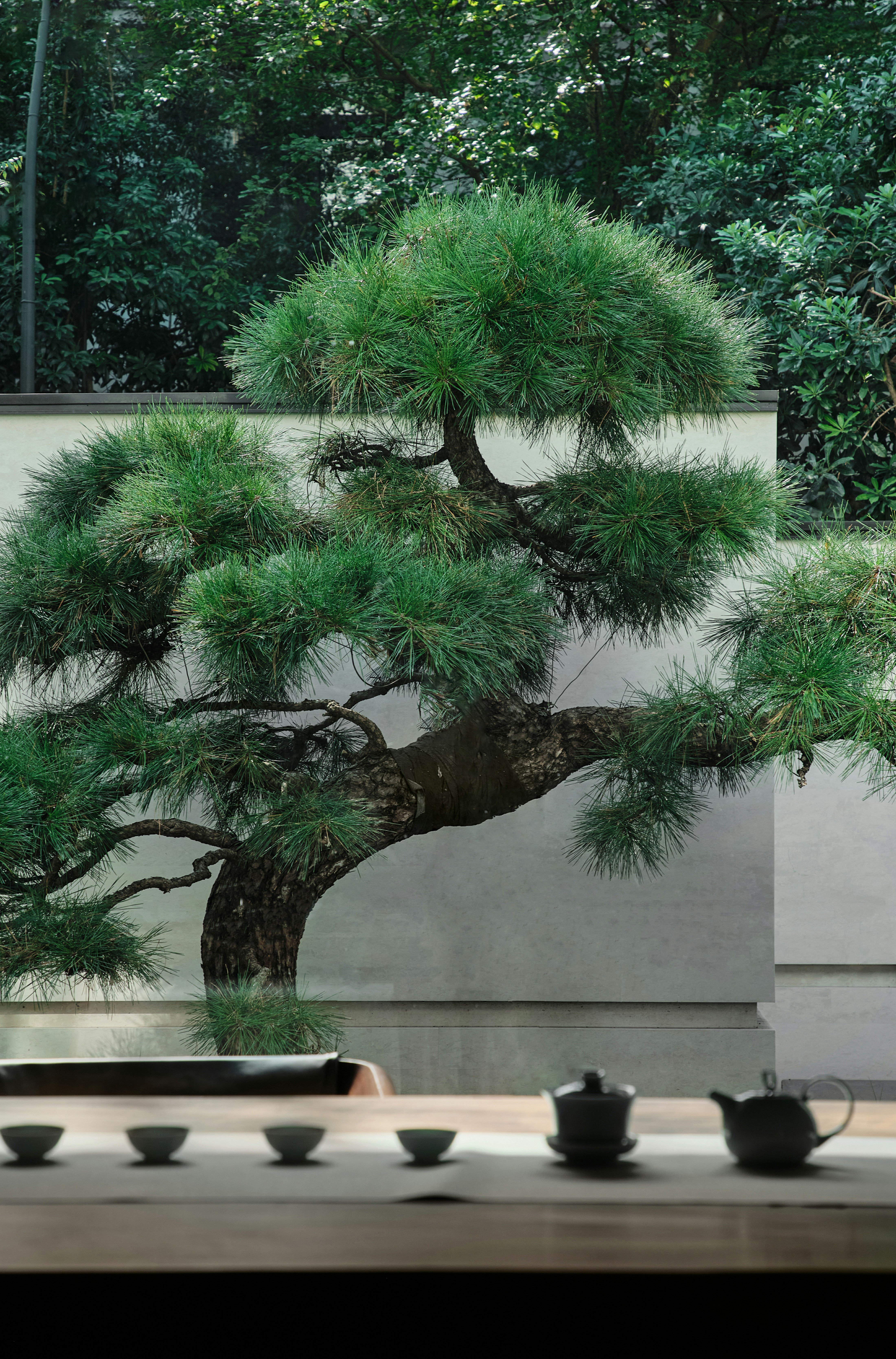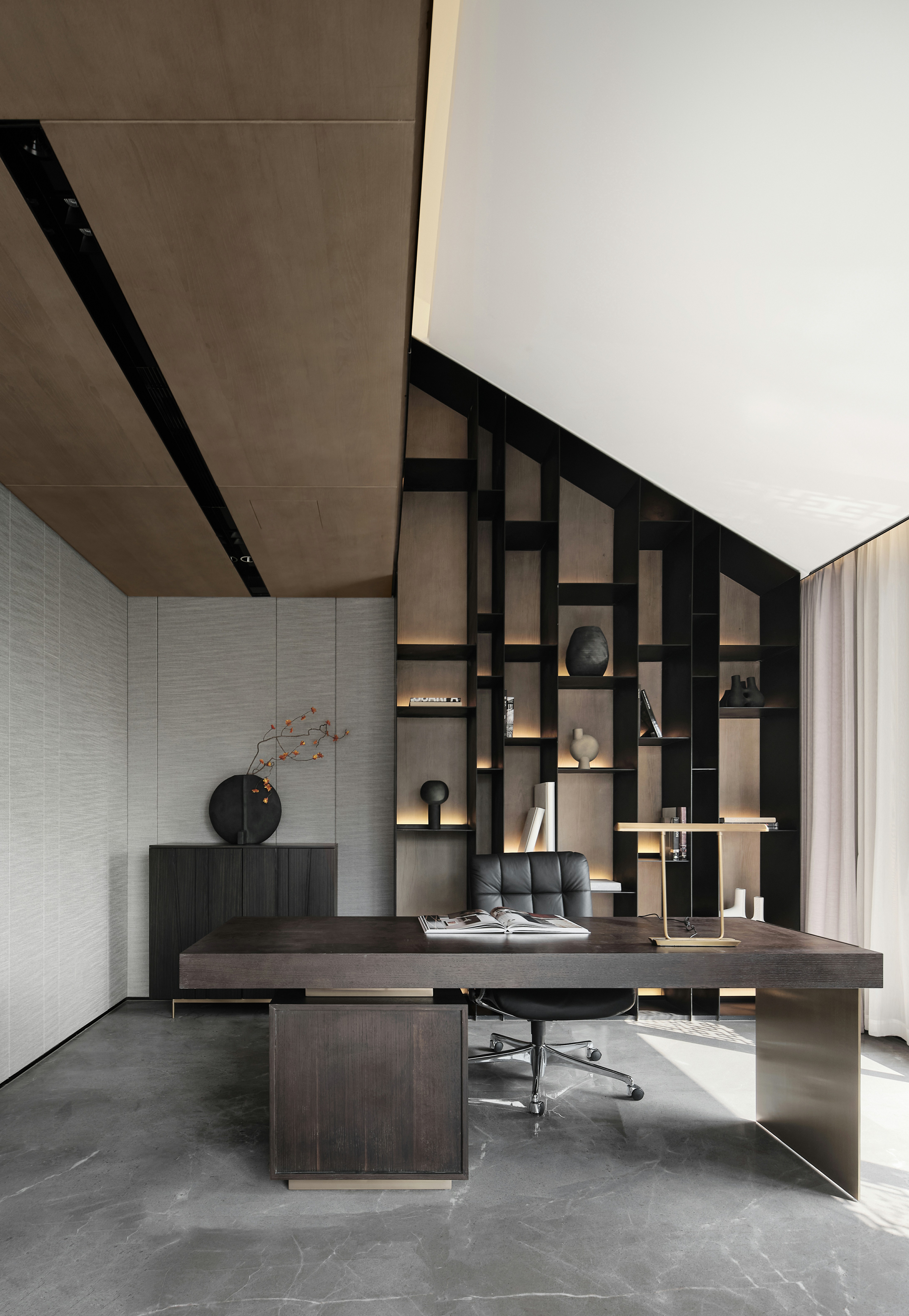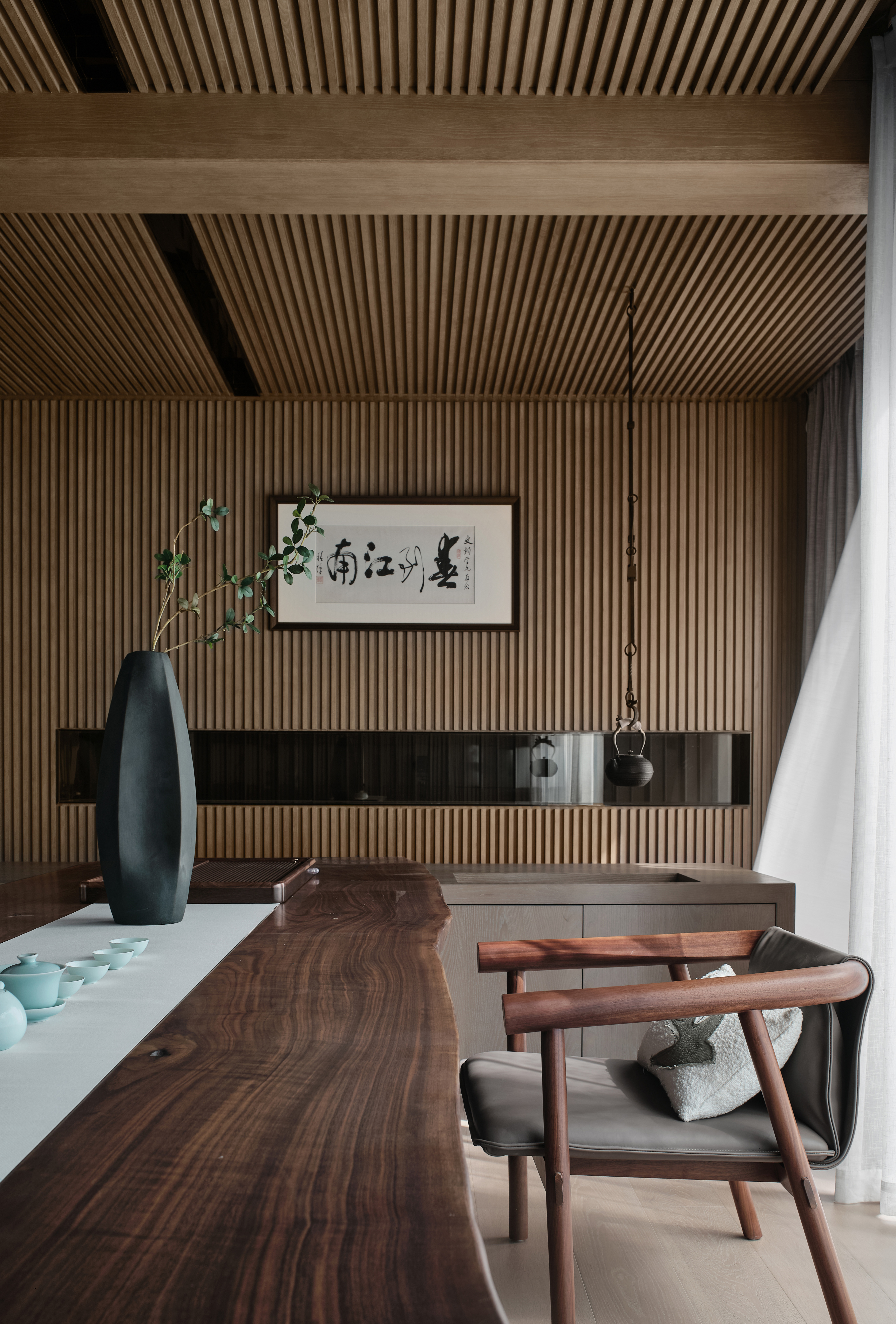 2、茶室临窗,天然木材的肌理搭配纵向排布的线性,极简影像渗于其内。艺术装置、仿古鼓凳、中式瓶器、内嵌灯带、隐藏式音箱、多宝格与庭院青松的点缀,使得空间在东方式风雅里又徽显着超越物表的现代兴味。