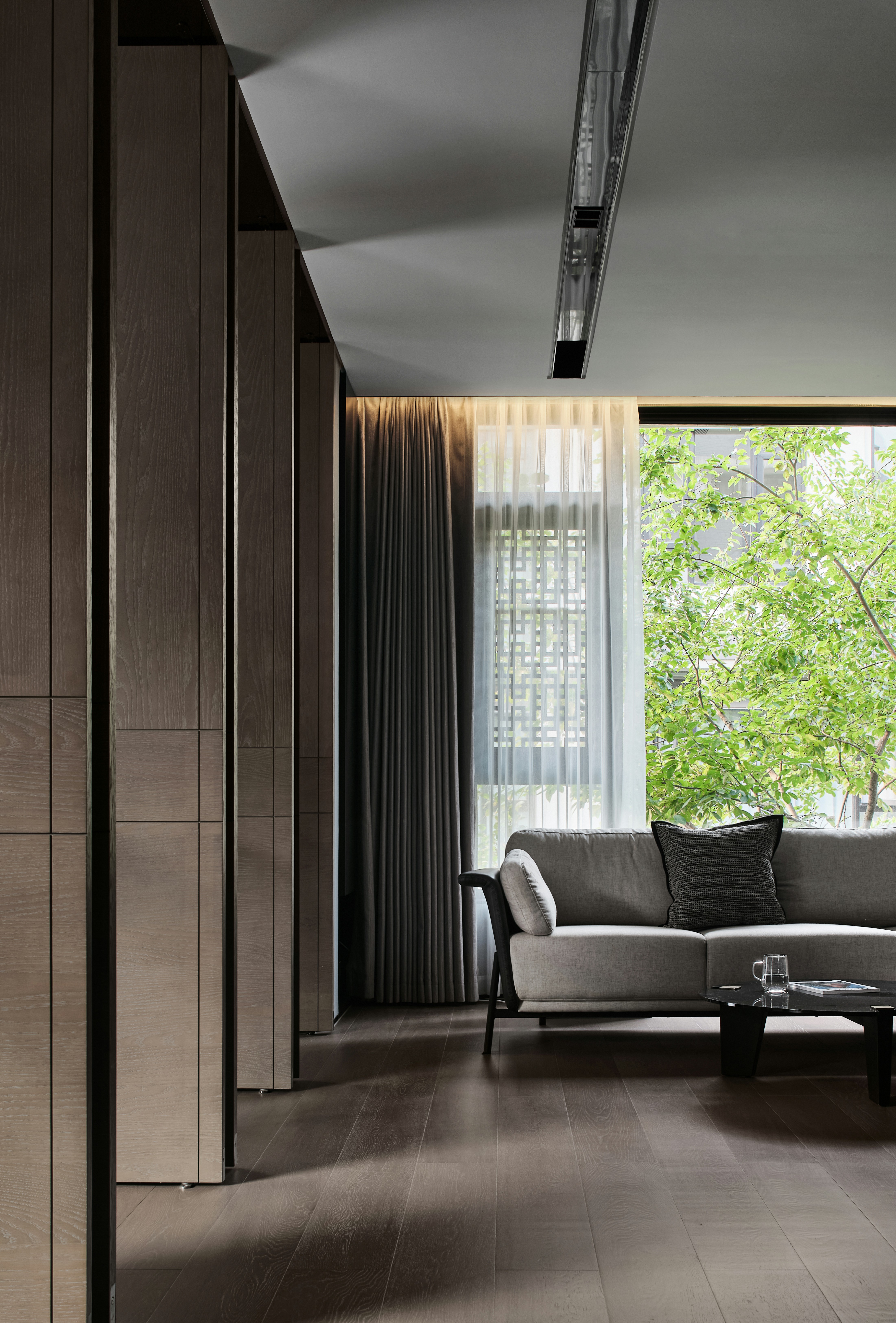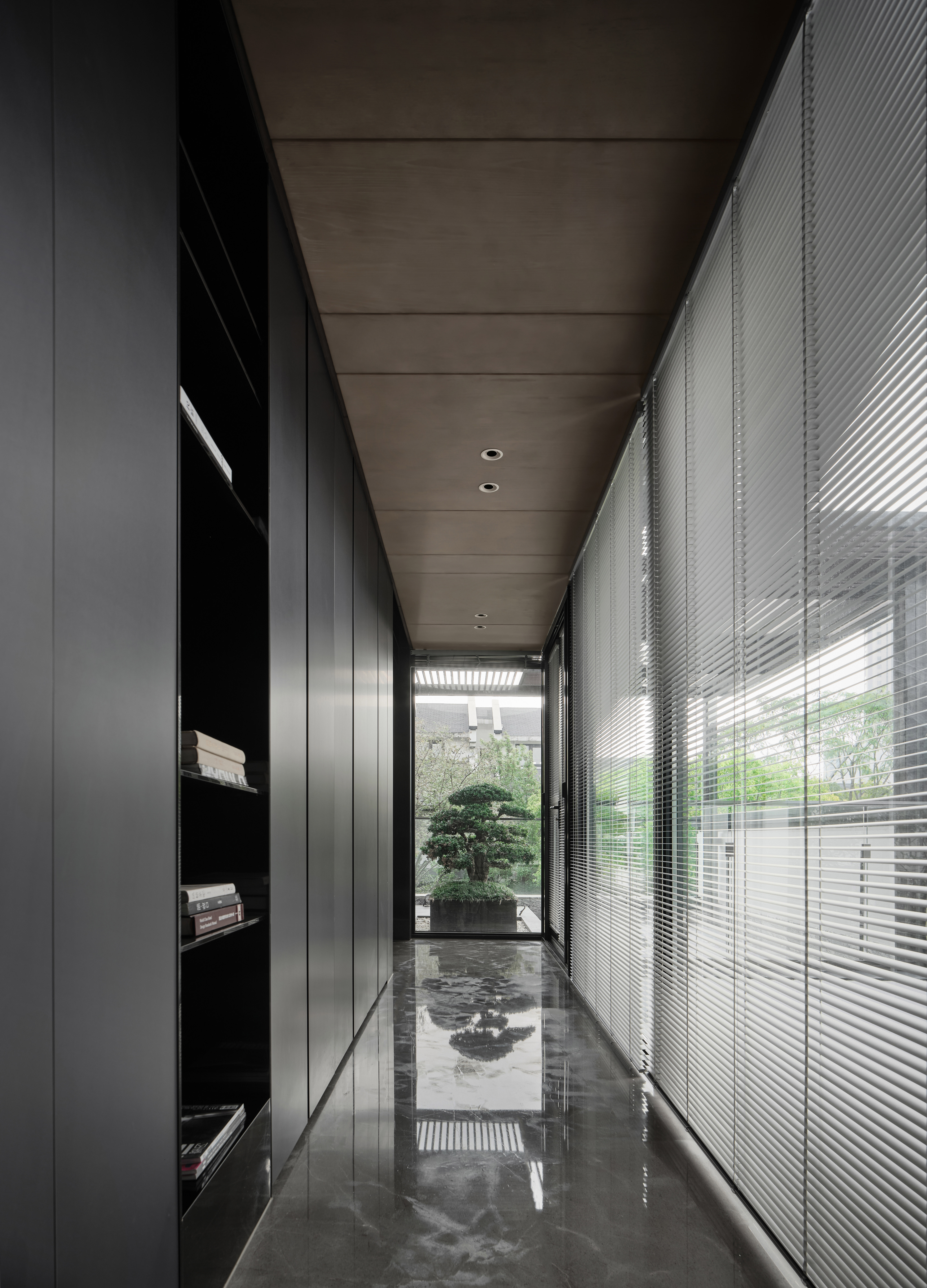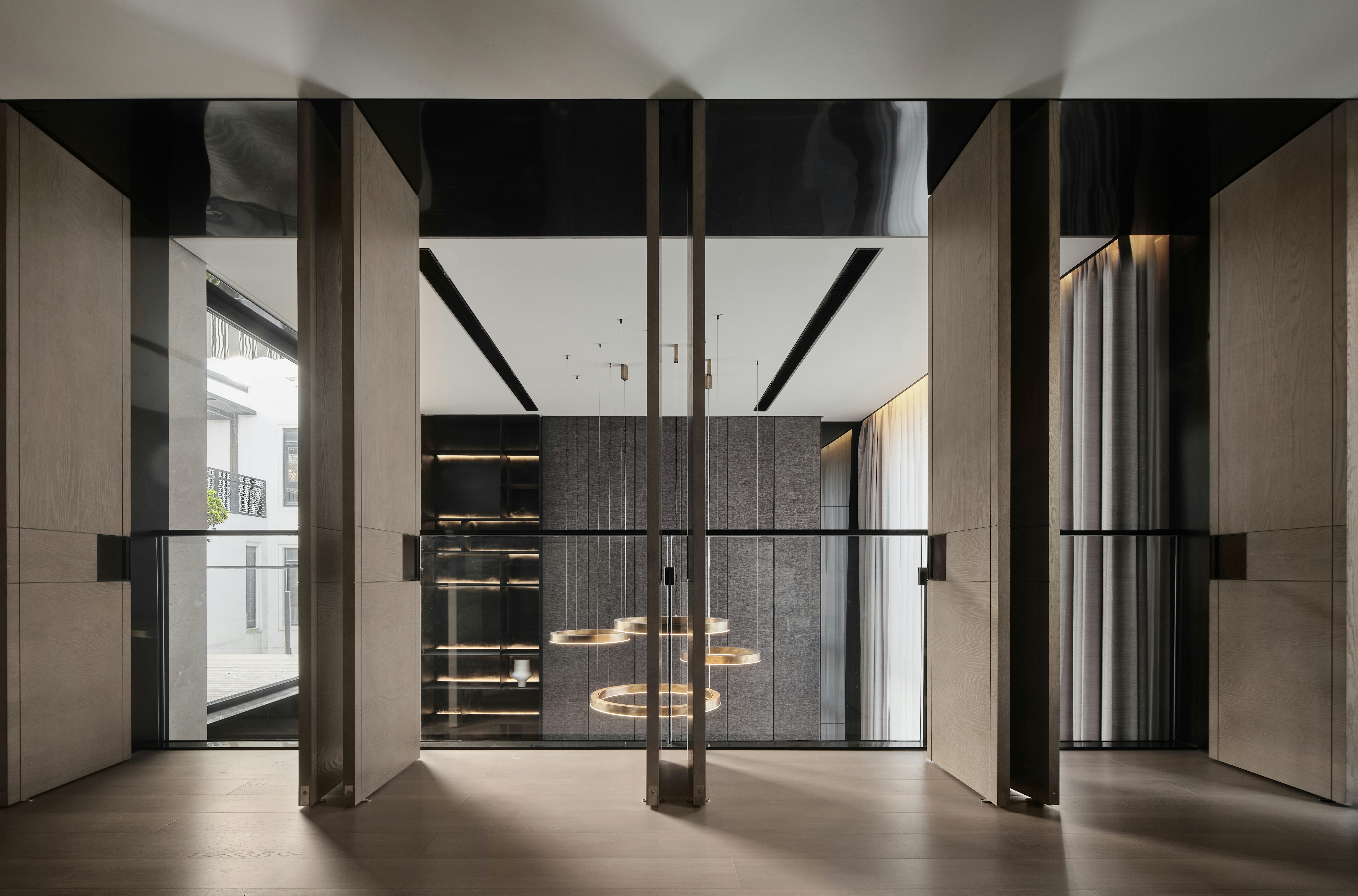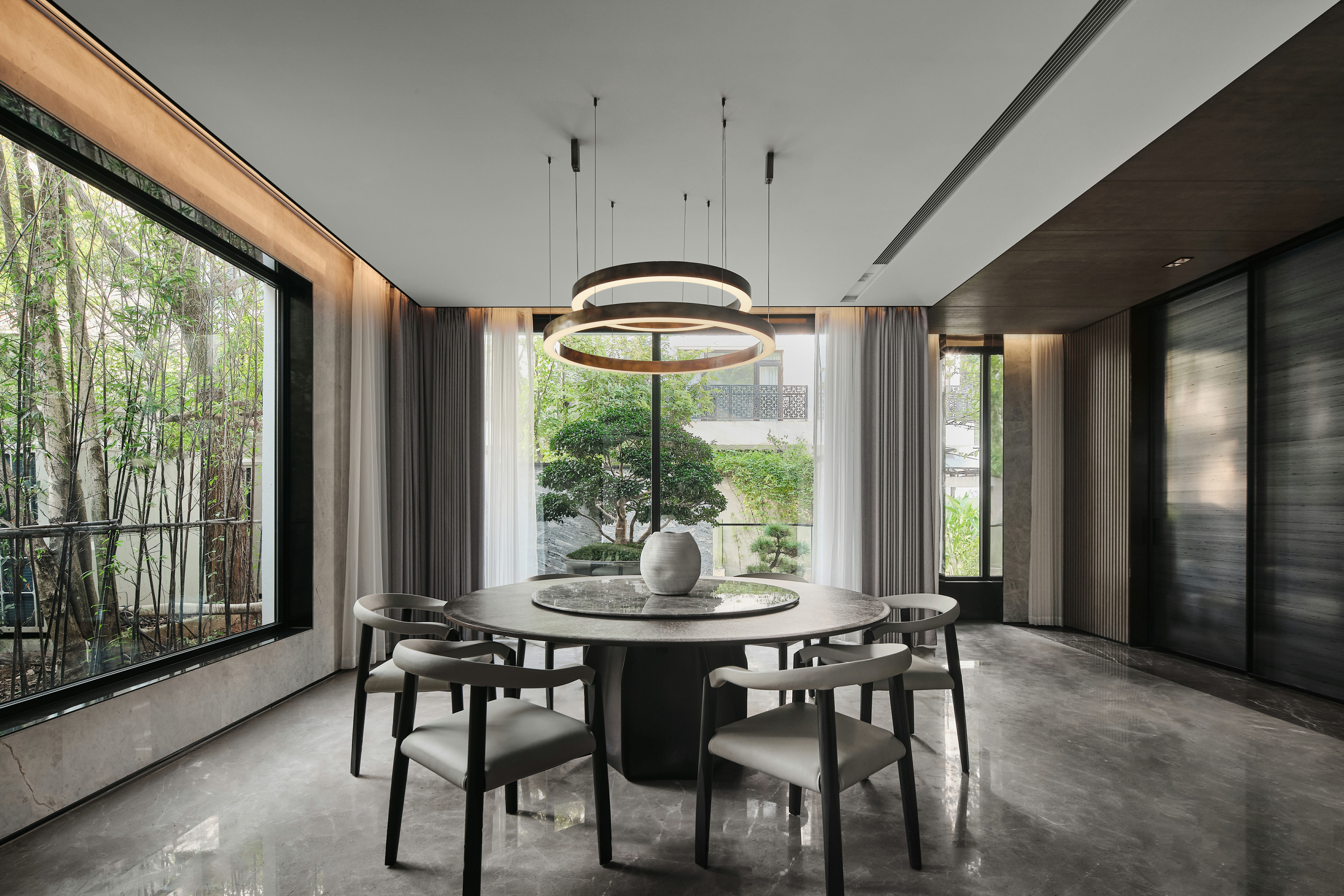 从地下车库入户,负一楼以开放的姿态迎接主人归家,借用框景、借景等建筑语言将外在景观收揽为室内画面,声音、日影、光热、空气、水雾等自然元素被导入室内且加以控制,形塑空间氛围及居住质地。自二楼向上,设计趋于探索私人空间的内在向量,露台、花窗、走廊、过道、书房渐次深入更核心的生活领域,抽离世俗的拘束和繁琐,构筑一种乘物游心的超然态度。