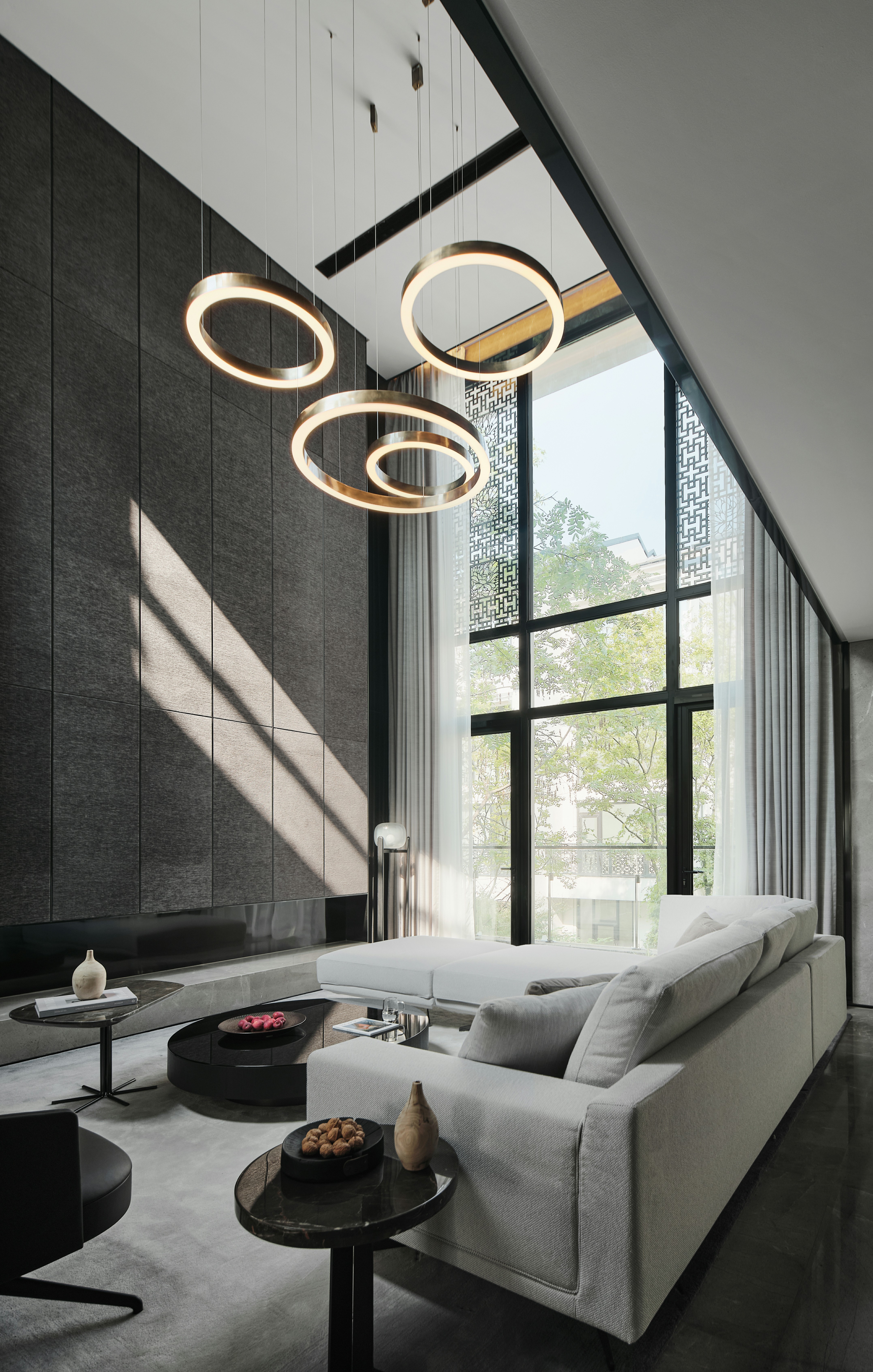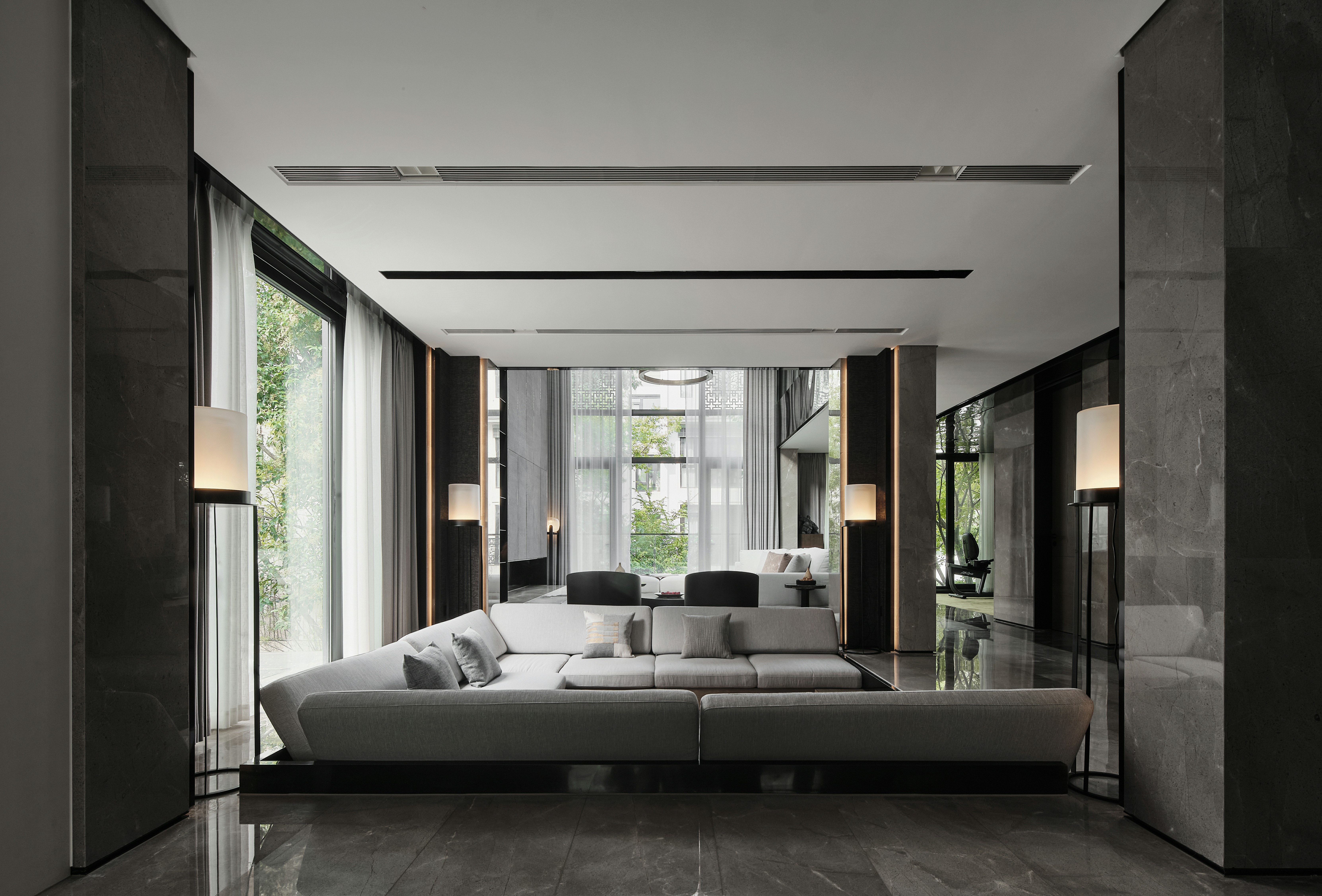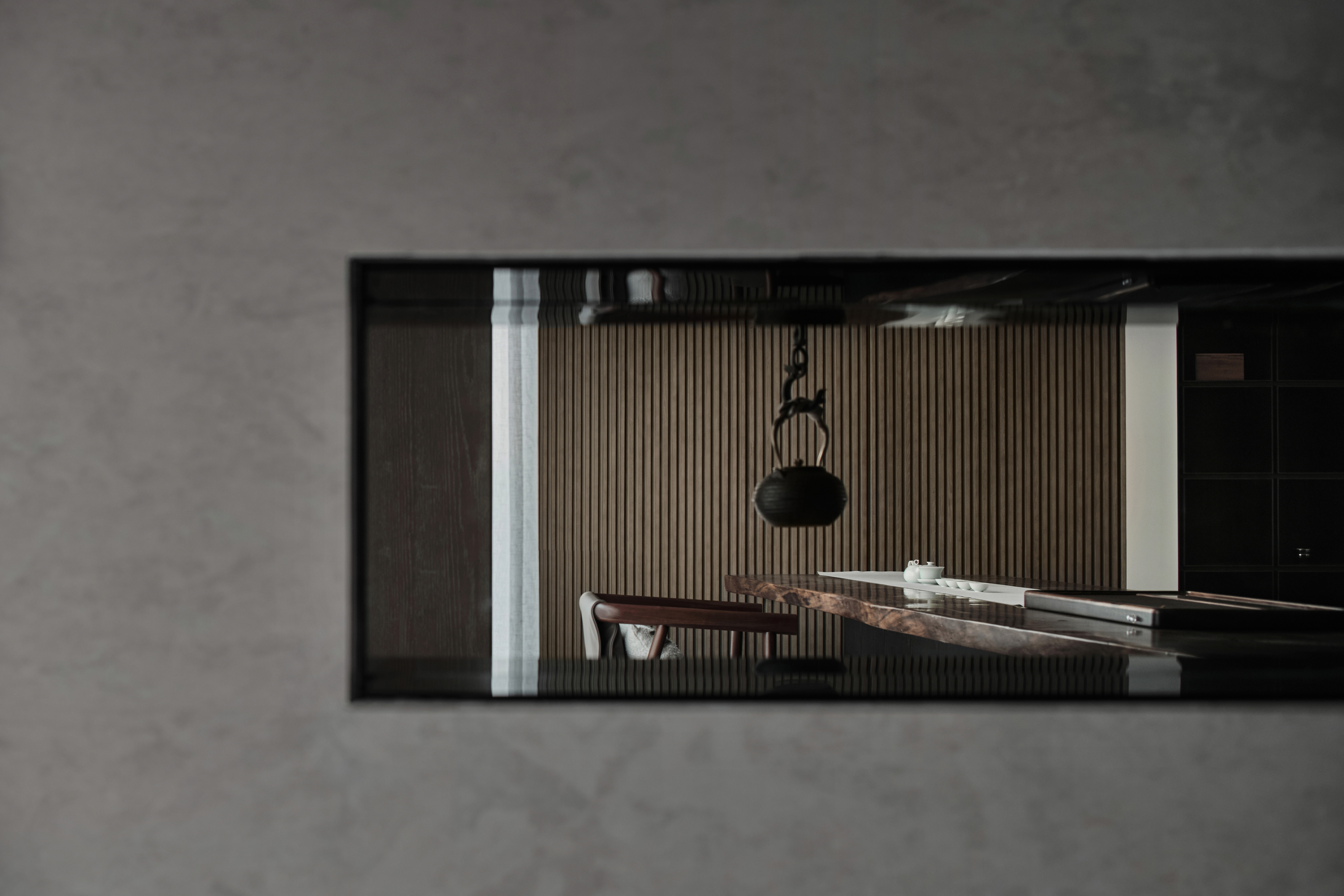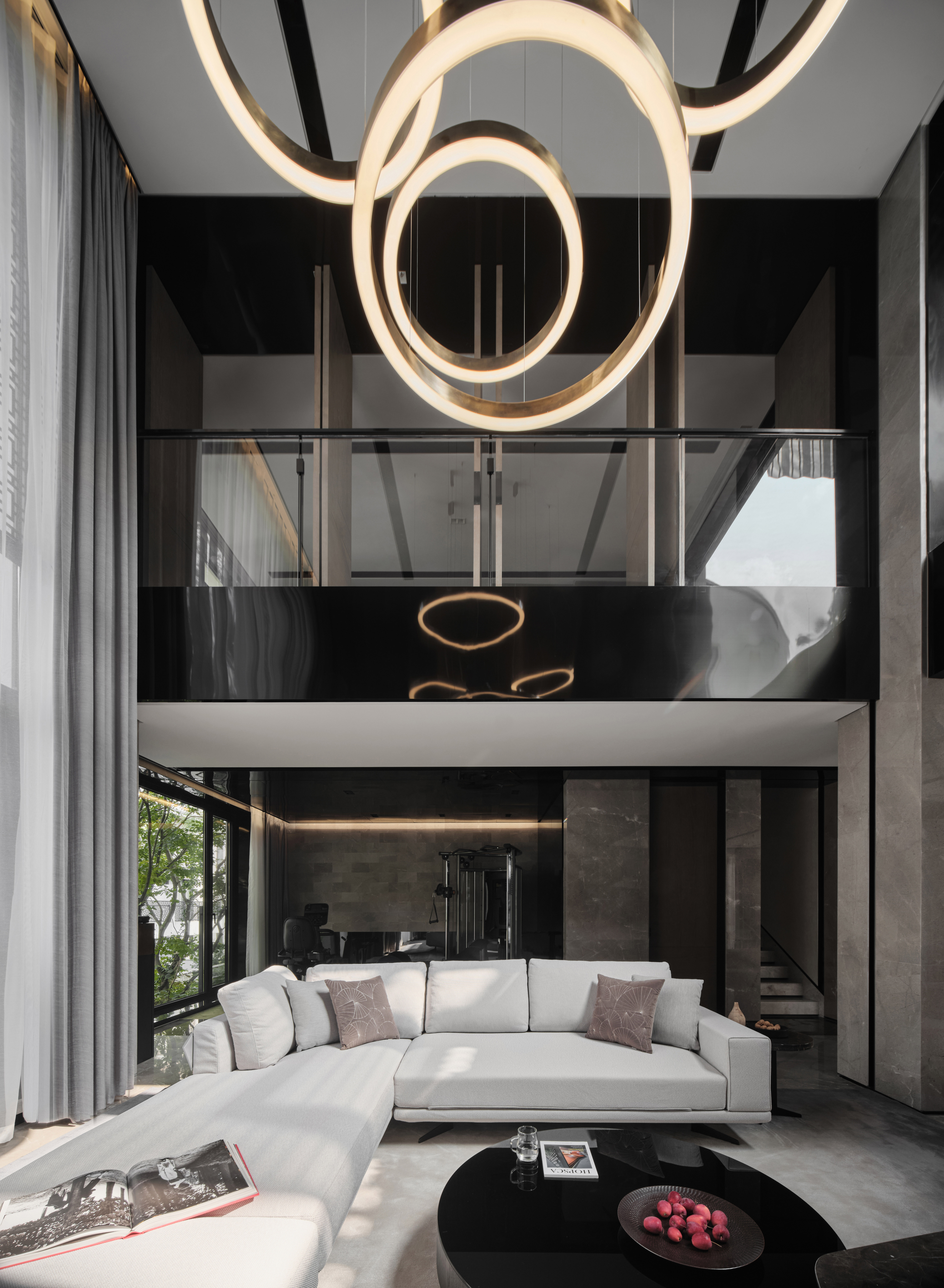 从地下车库入户,负一楼以开放的姿态迎接主人归家,借用框景、借景等建筑语言将外在景观收揽为室内画面,声音、日影、光热、空气、水雾等自然元素被导入室内且加以控制,形塑空间氛围及居住质地。自二楼向上,设计趋于探索私人空间的内在向量,露台、花窗、走廊、过道、书房渐次深入更核心的生活领域,抽离世俗的拘束和繁琐,构筑一种乘物游心的超然态度。