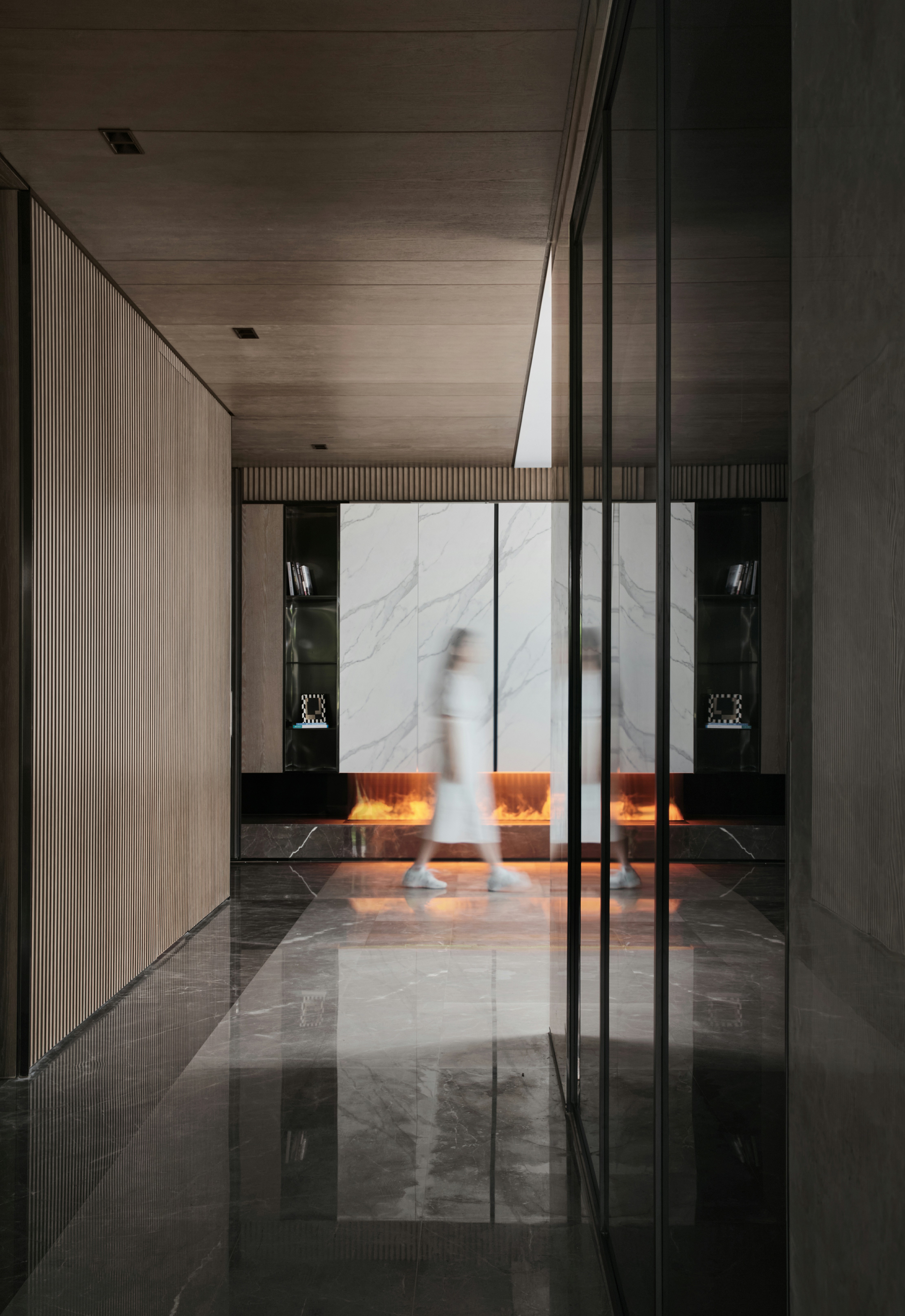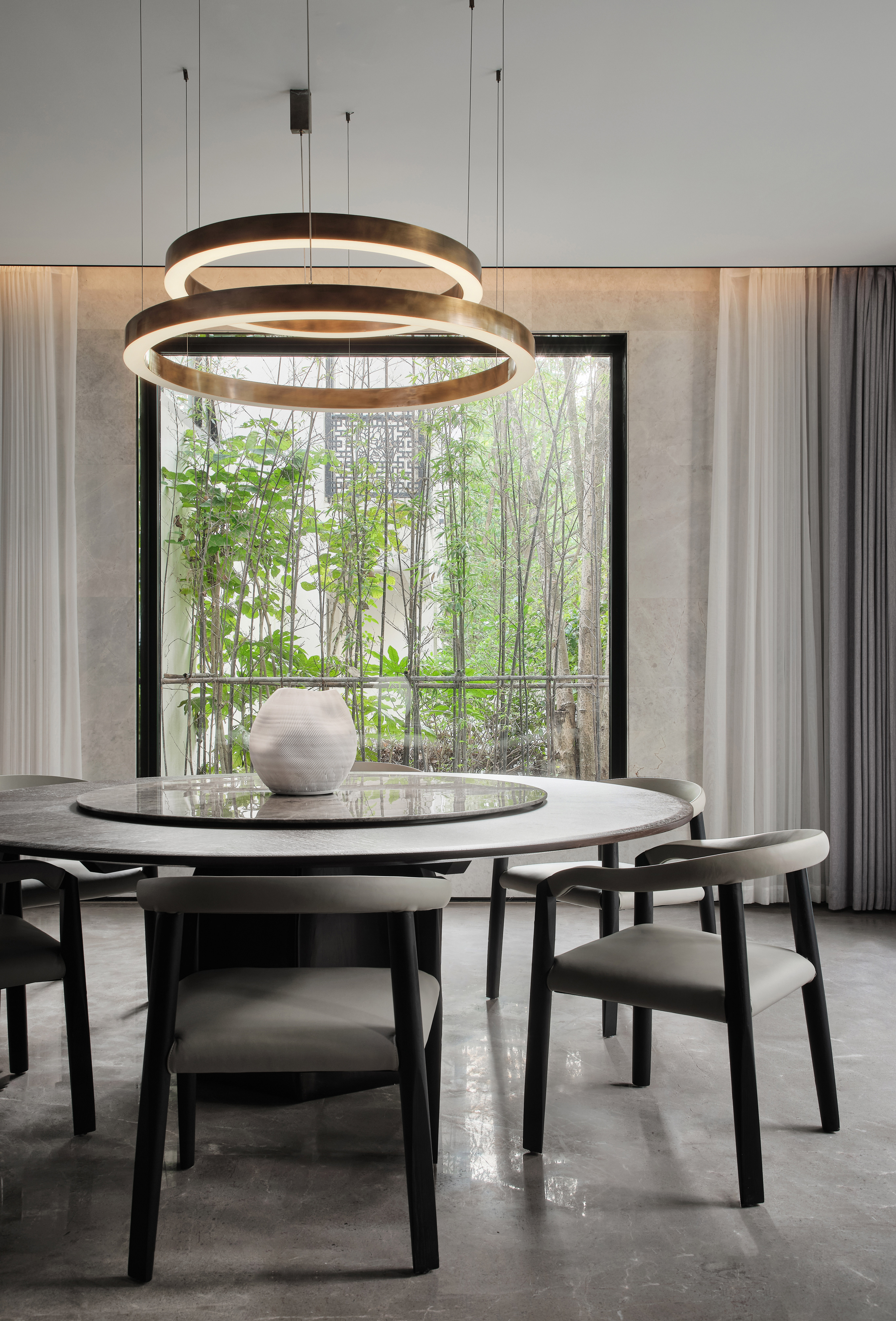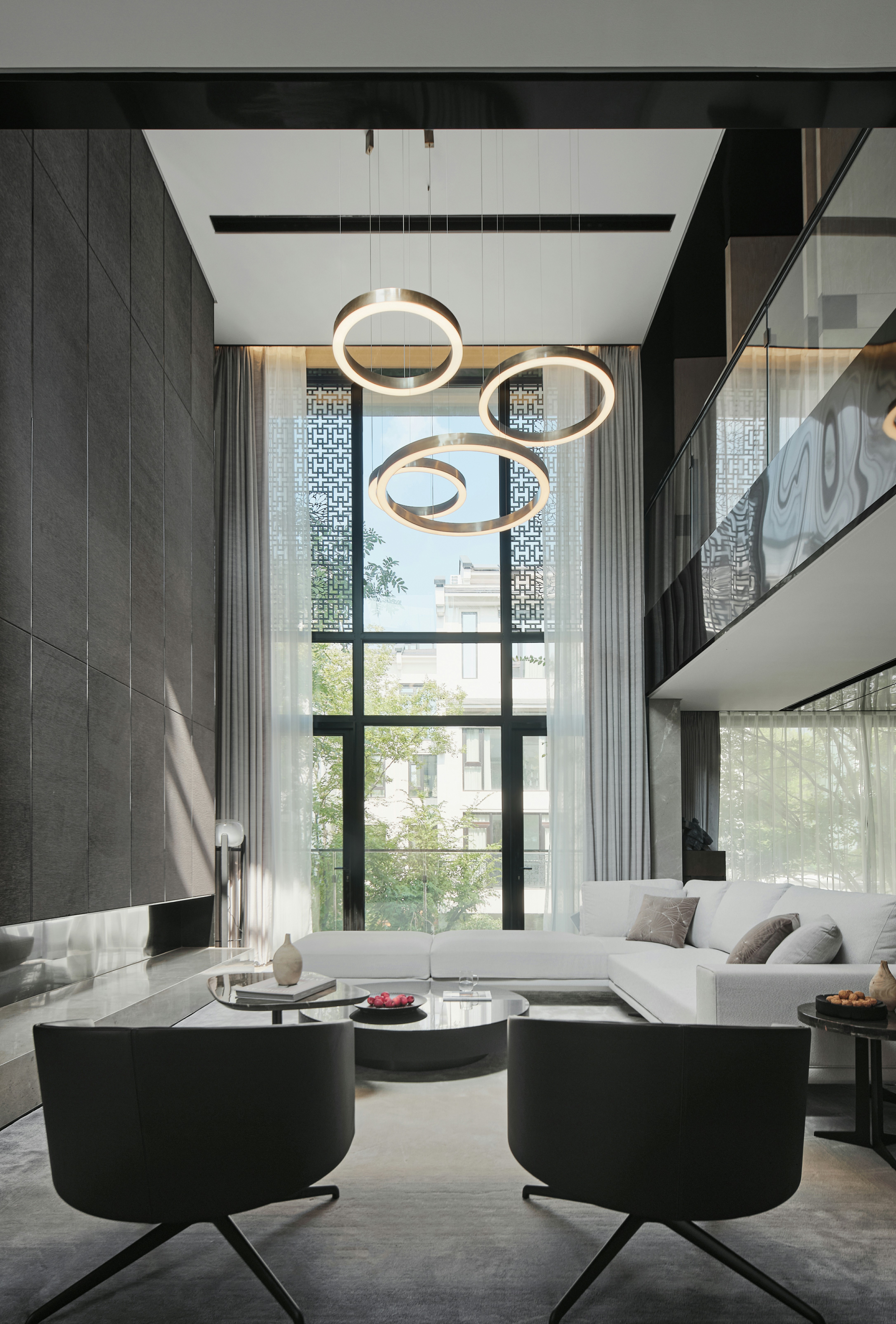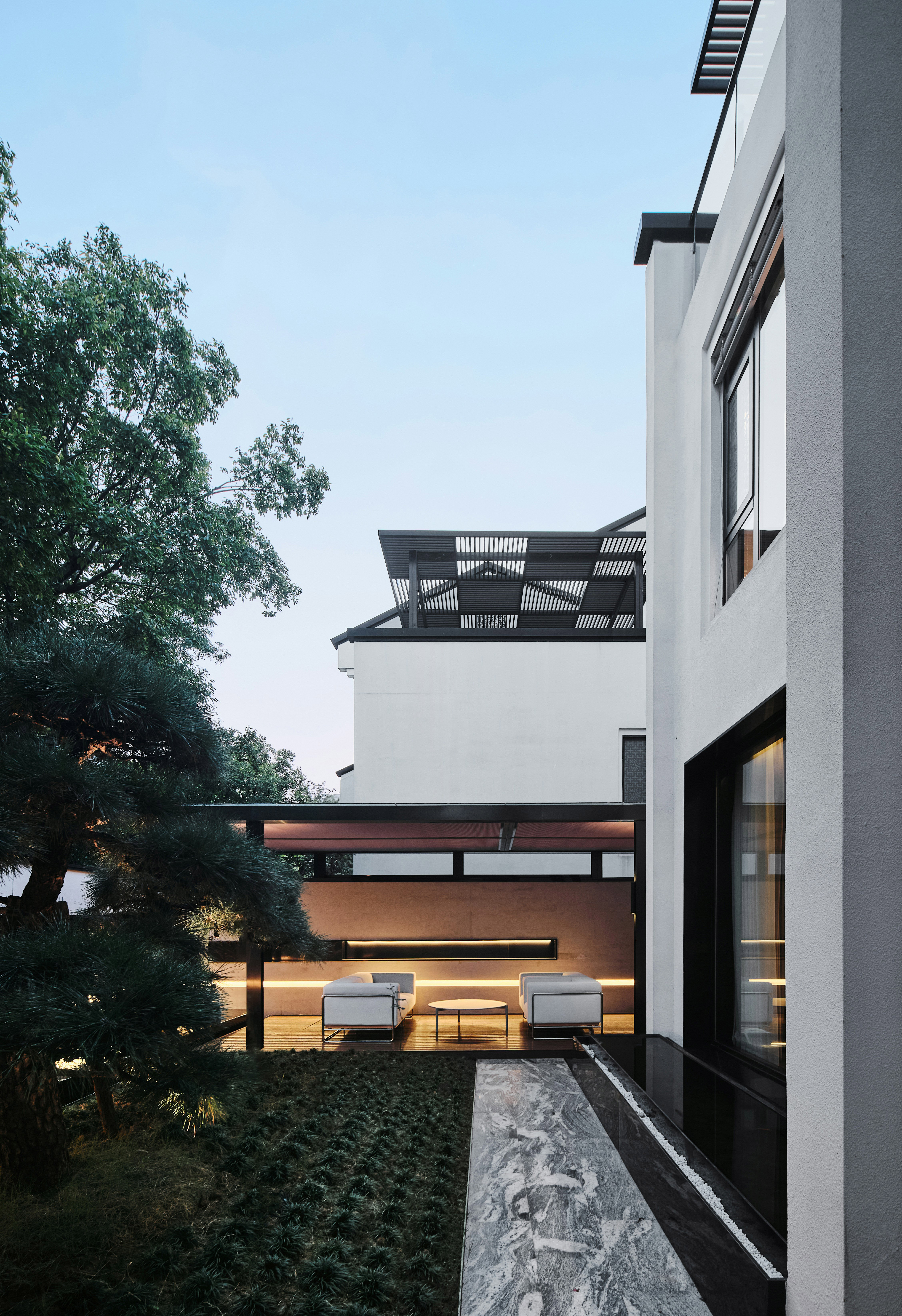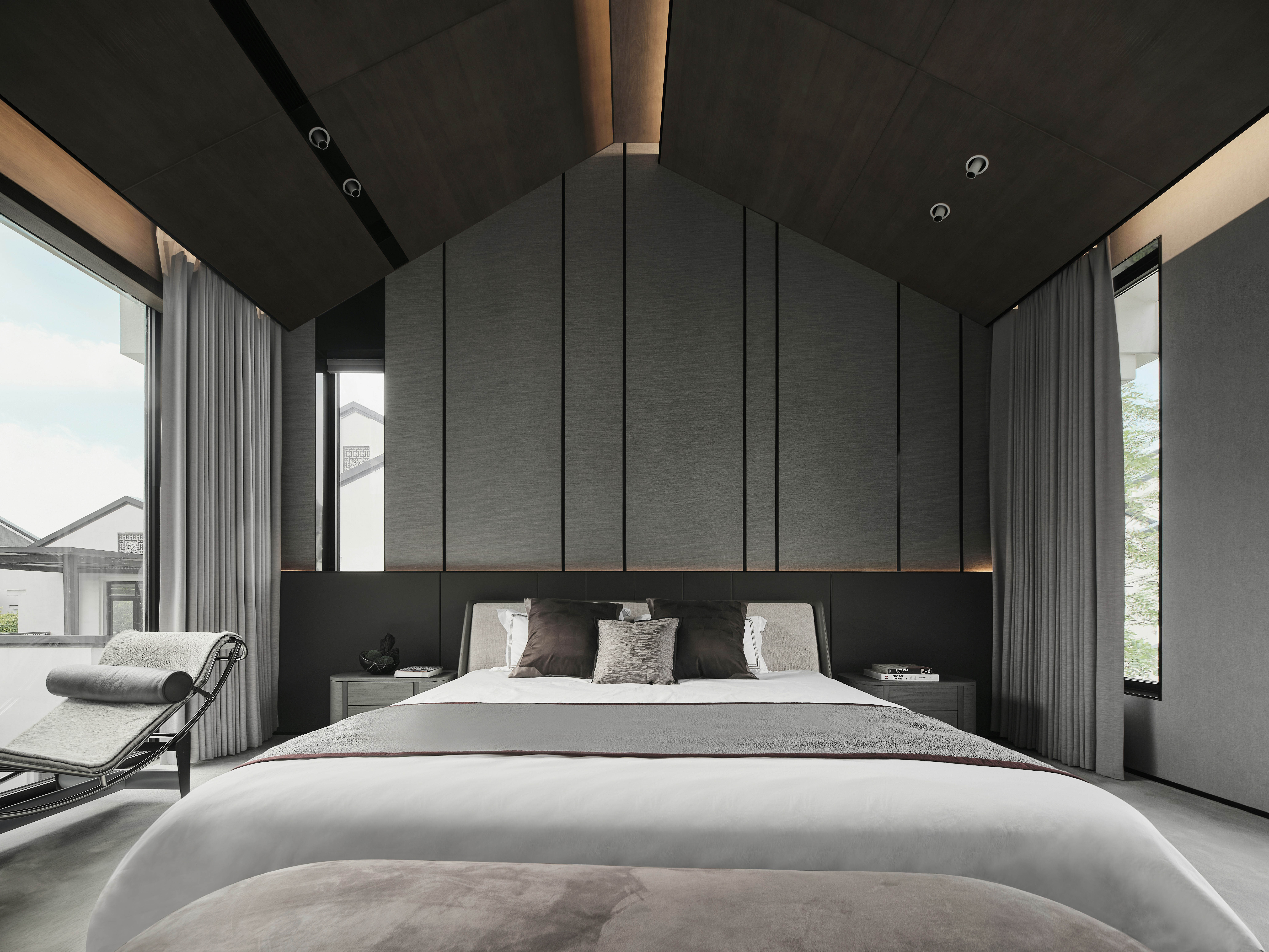 从地下车库入户,负一楼以开放的姿态迎接主人归家,借用框景、借景等建筑语言将外在景观收揽为室内画面,声音、日影、光热、空气、水雾等自然元素被导入室内且加以控制,形塑空间氛围及居住质地。自二楼向上,设计趋于探索私人空间的内在向量,露台、花窗、走廊、过道、书房渐次深入更核心的生活领域,抽离世俗的拘束和繁琐,构筑一种乘物游心的超然态度。