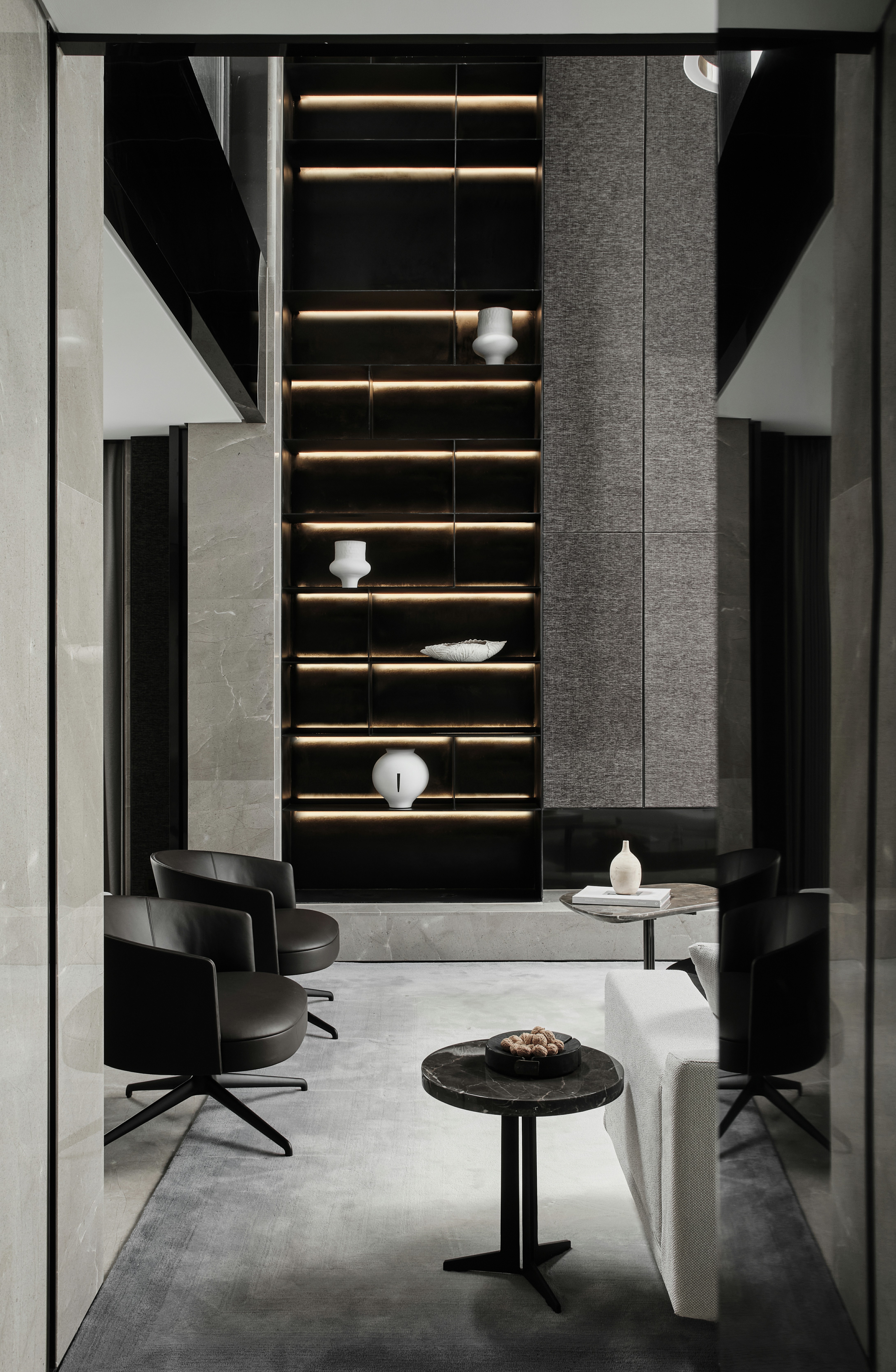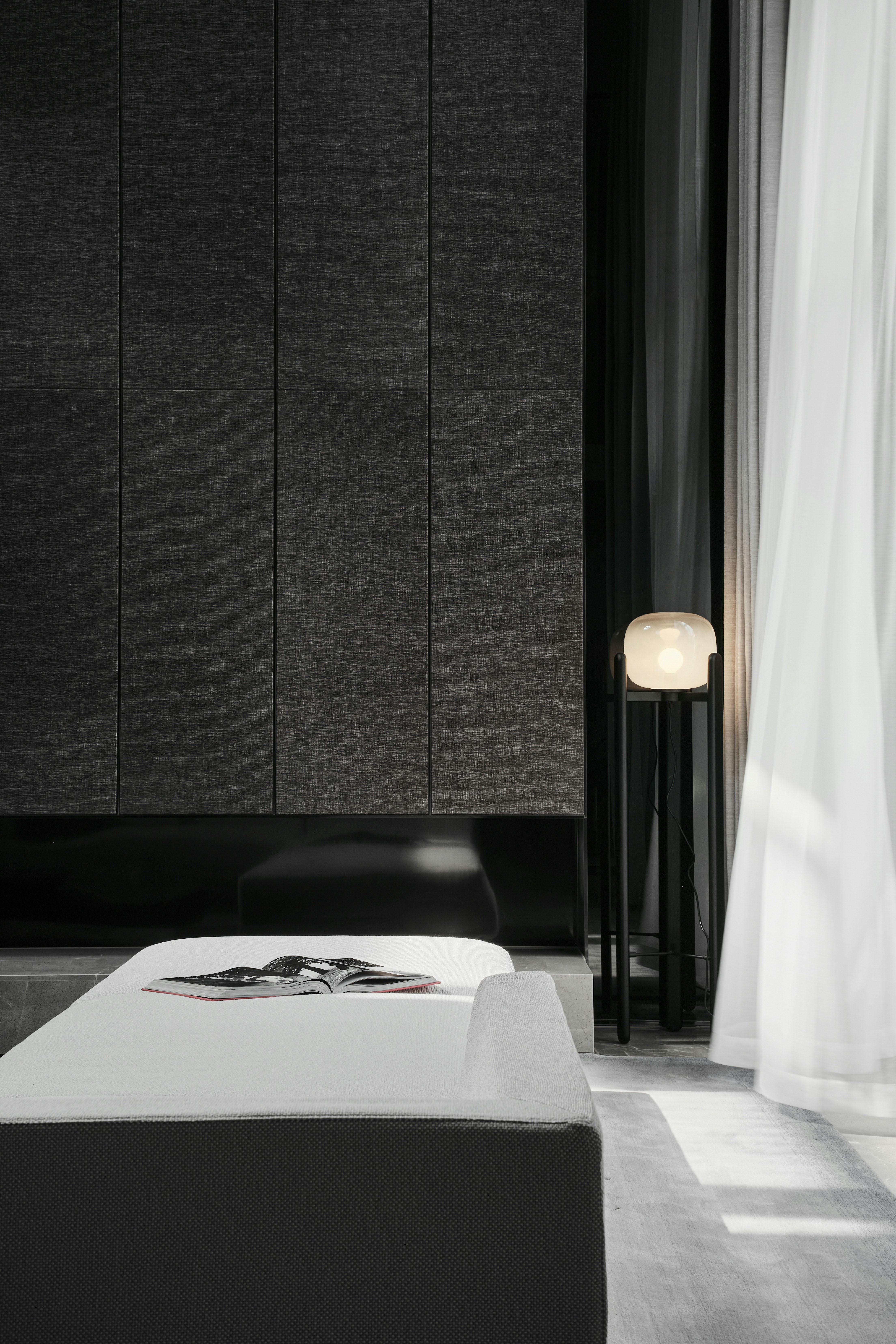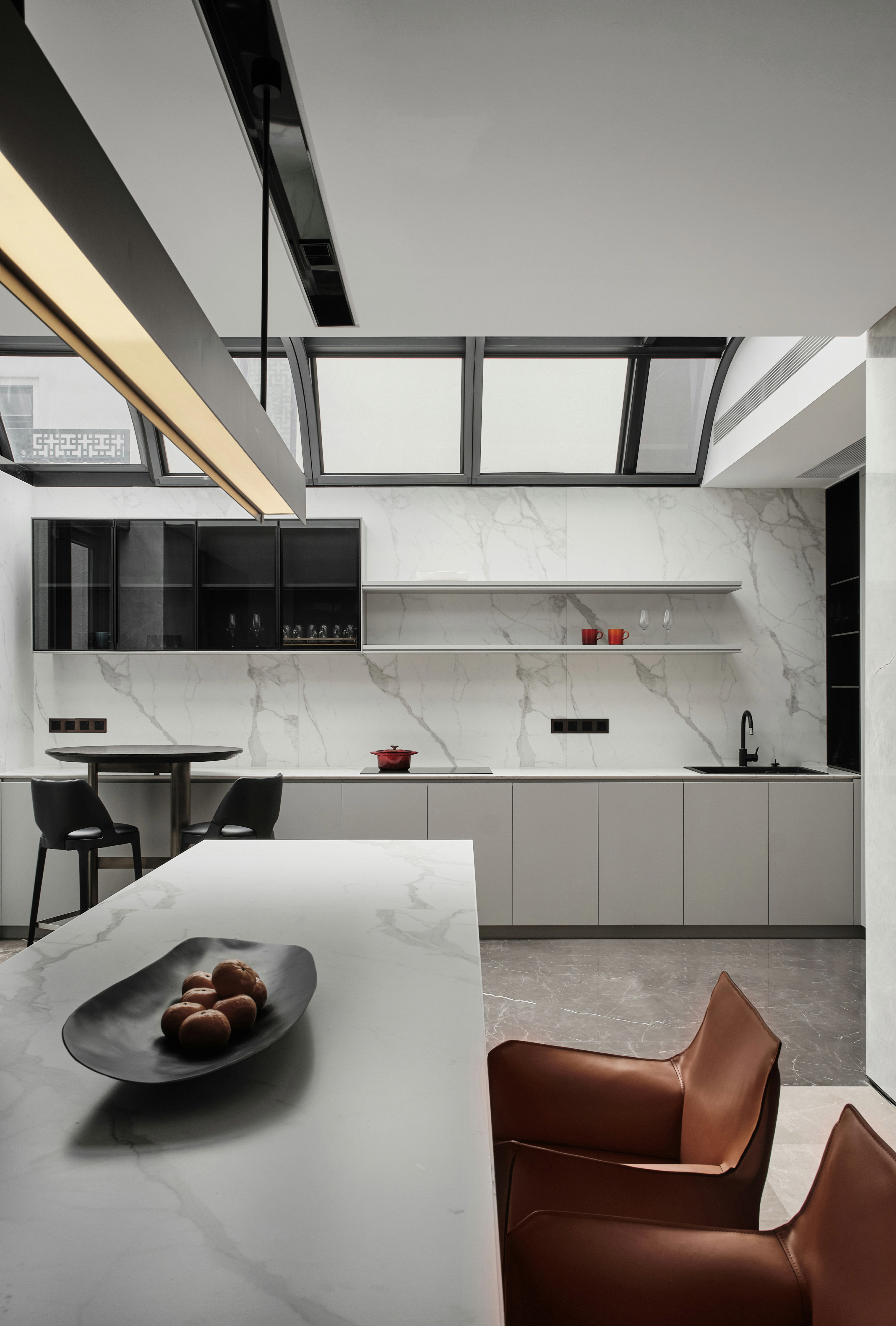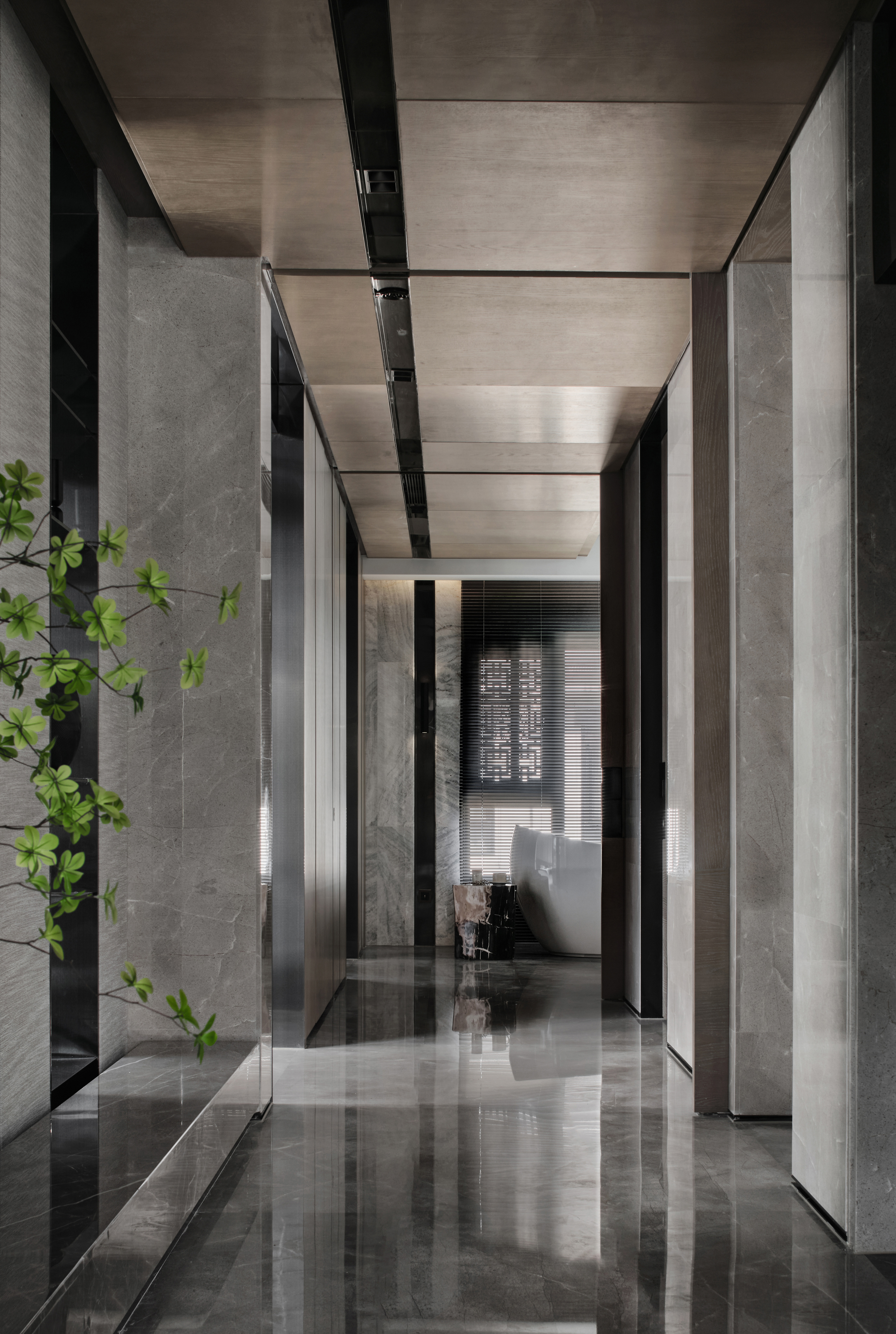 从地下车库入户,负一楼以开放的姿态迎接主人归家,借用框景、借景等建筑语言将外在景观收揽为室内画面,声音、日影、光热、空气、水雾等自然元素被导入室内且加以控制,形塑空间氛围及居住质地。自二楼向上,设计趋于探索私人空间的内在向量,露台、花窗、走廊、过道、书房渐次深入更核心的生活领域,抽离世俗的拘束和繁琐,构筑一种乘物游心的超然态度。