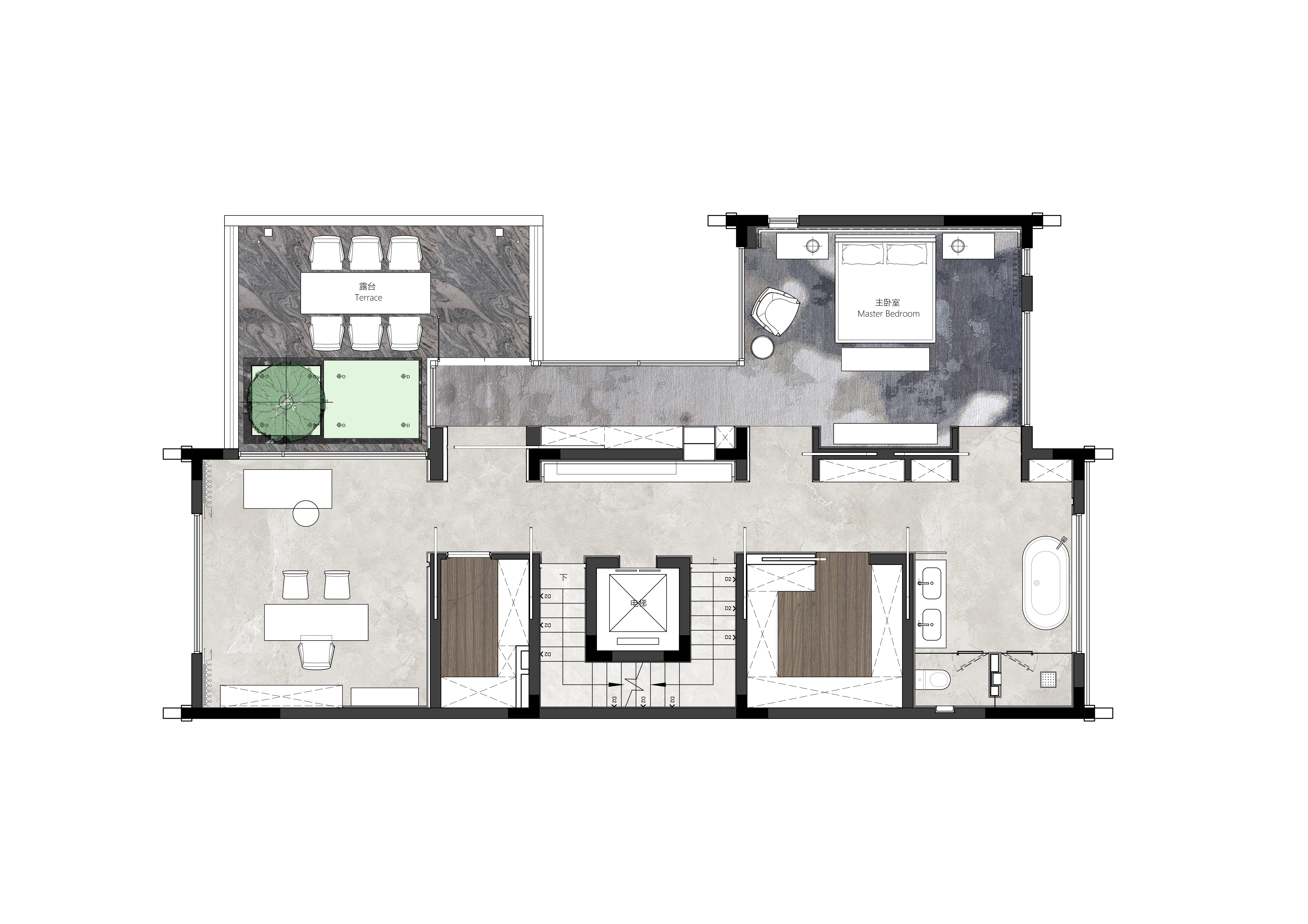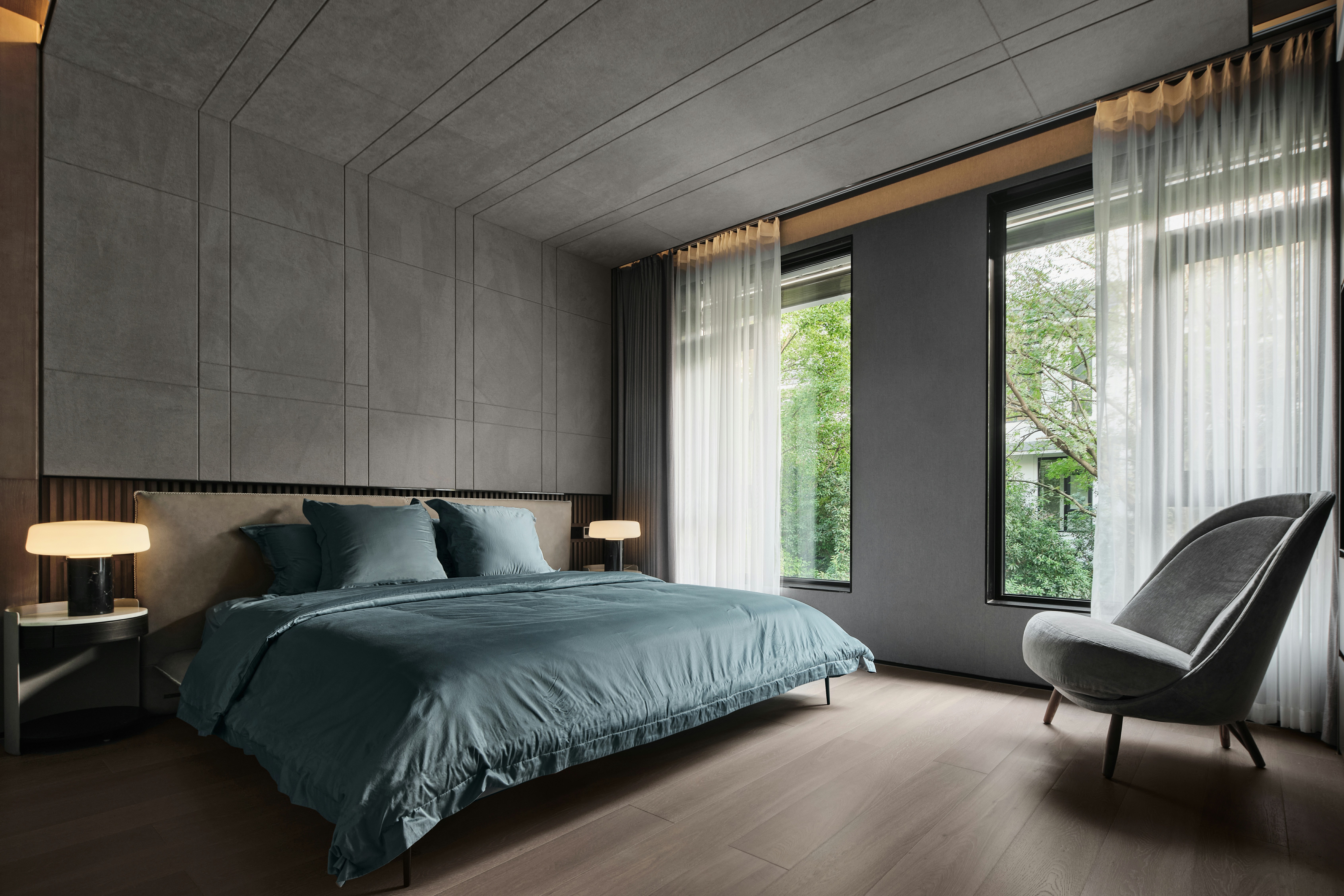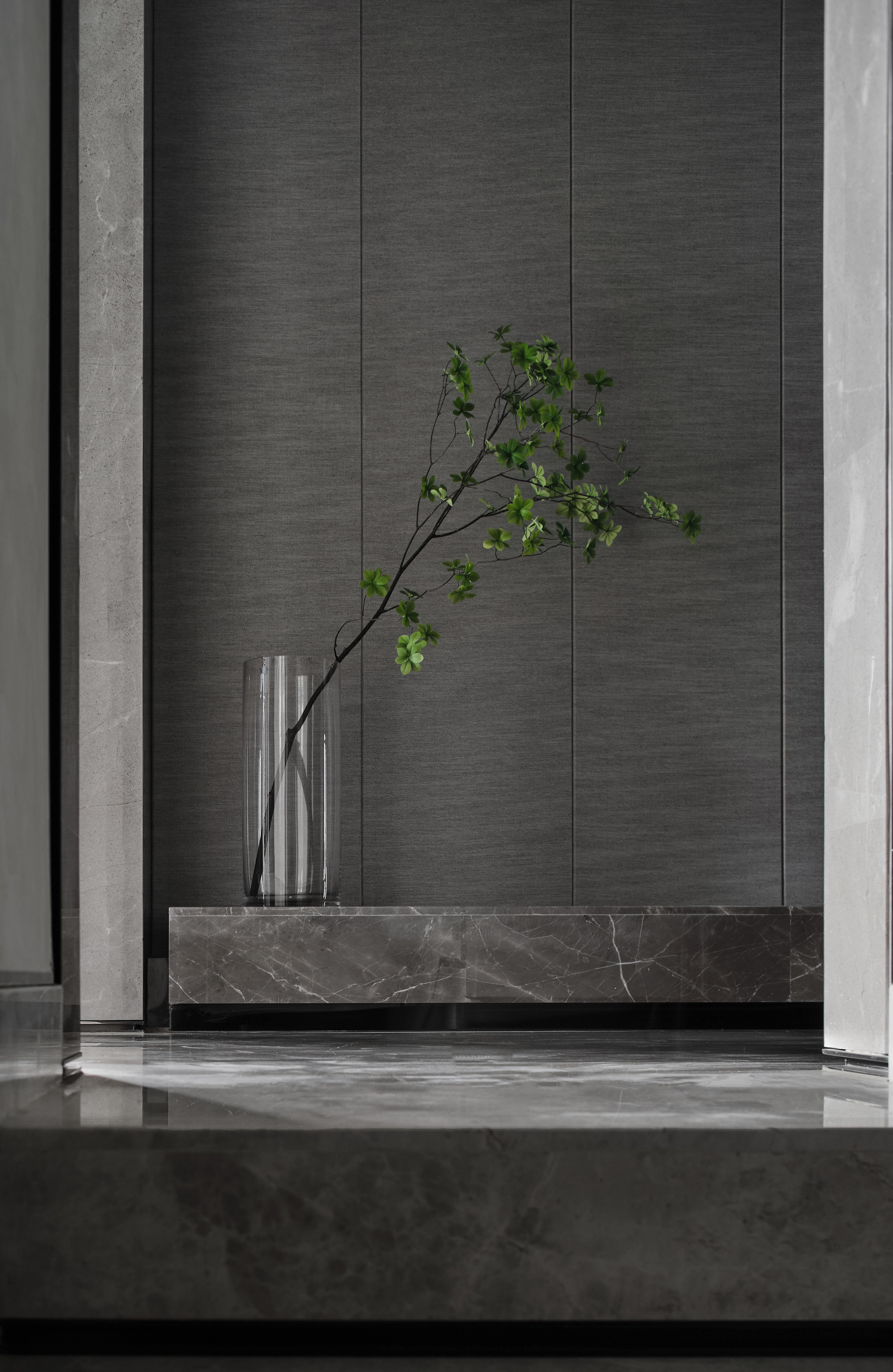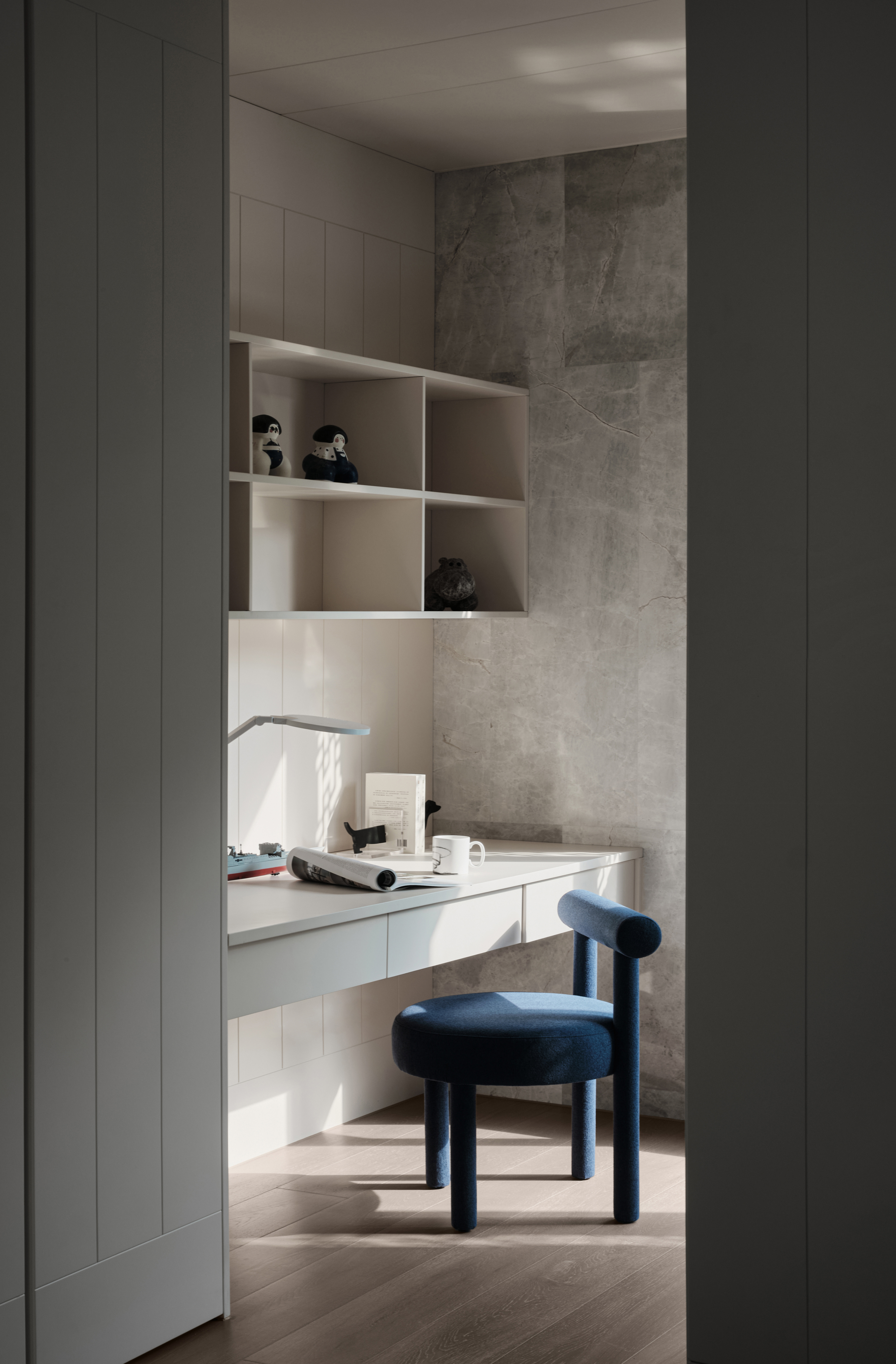 从地下车库入户,负一楼以开放的姿态迎接主人归家,借用框景、借景等建筑语言将外在景观收揽为室内画面,声音、日影、光热、空气、水雾等自然元素被导入室内且加以控制,形塑空间氛围及居住质地。自二楼向上,设计趋于探索私人空间的内在向量,露台、花窗、走廊、过道、书房渐次深入更核心的生活领域,抽离世俗的拘束和繁琐,构筑一种乘物游心的超然态度。