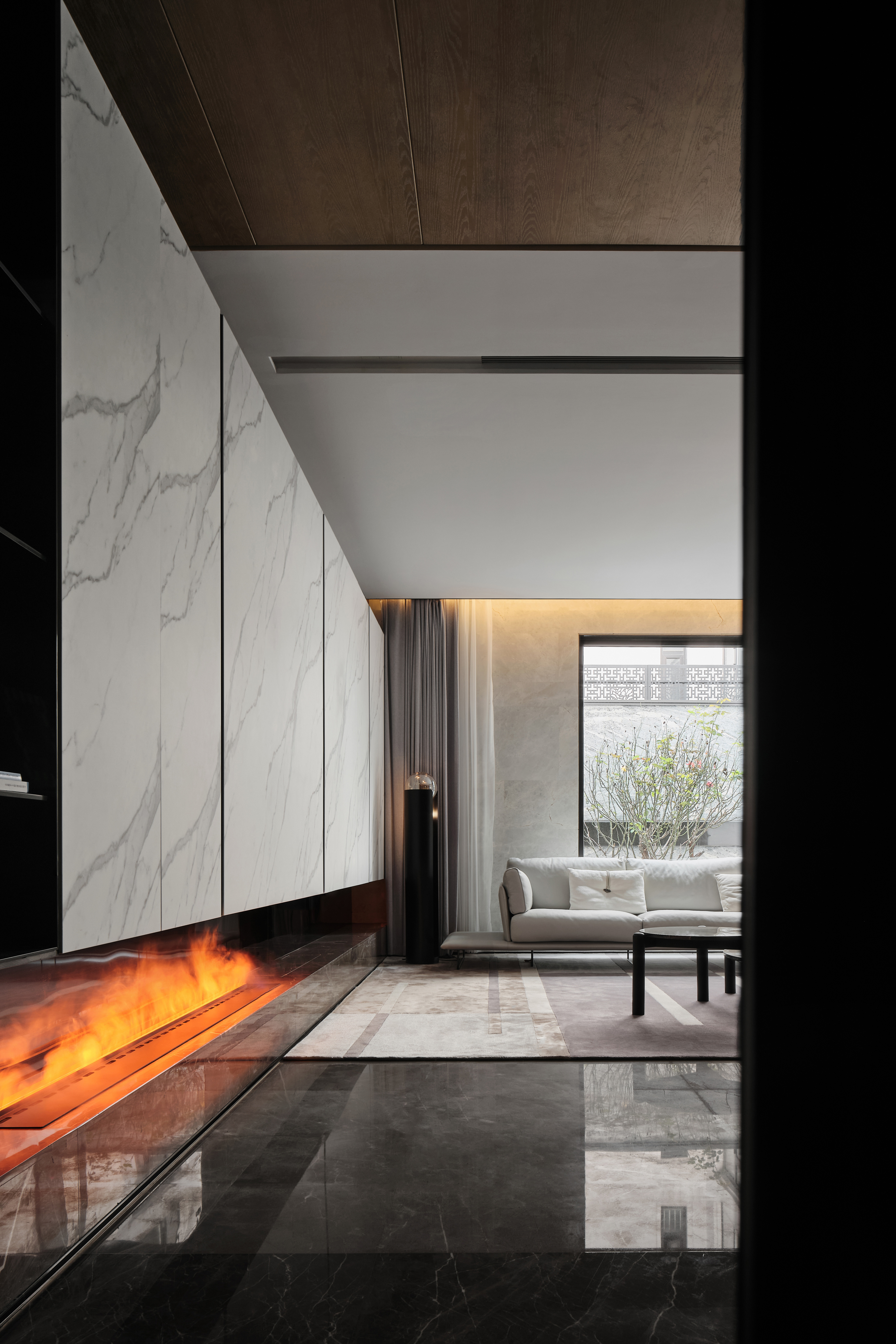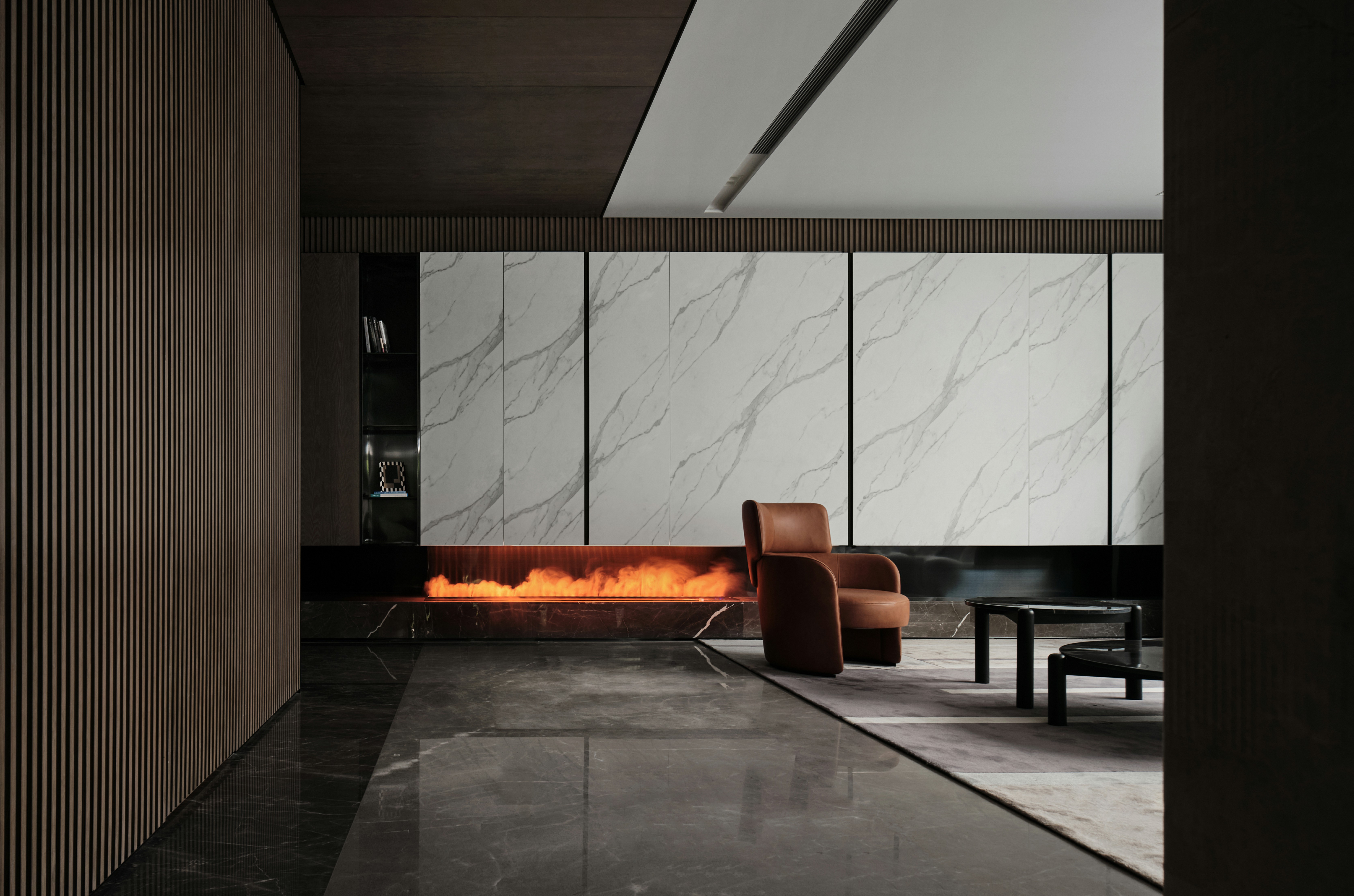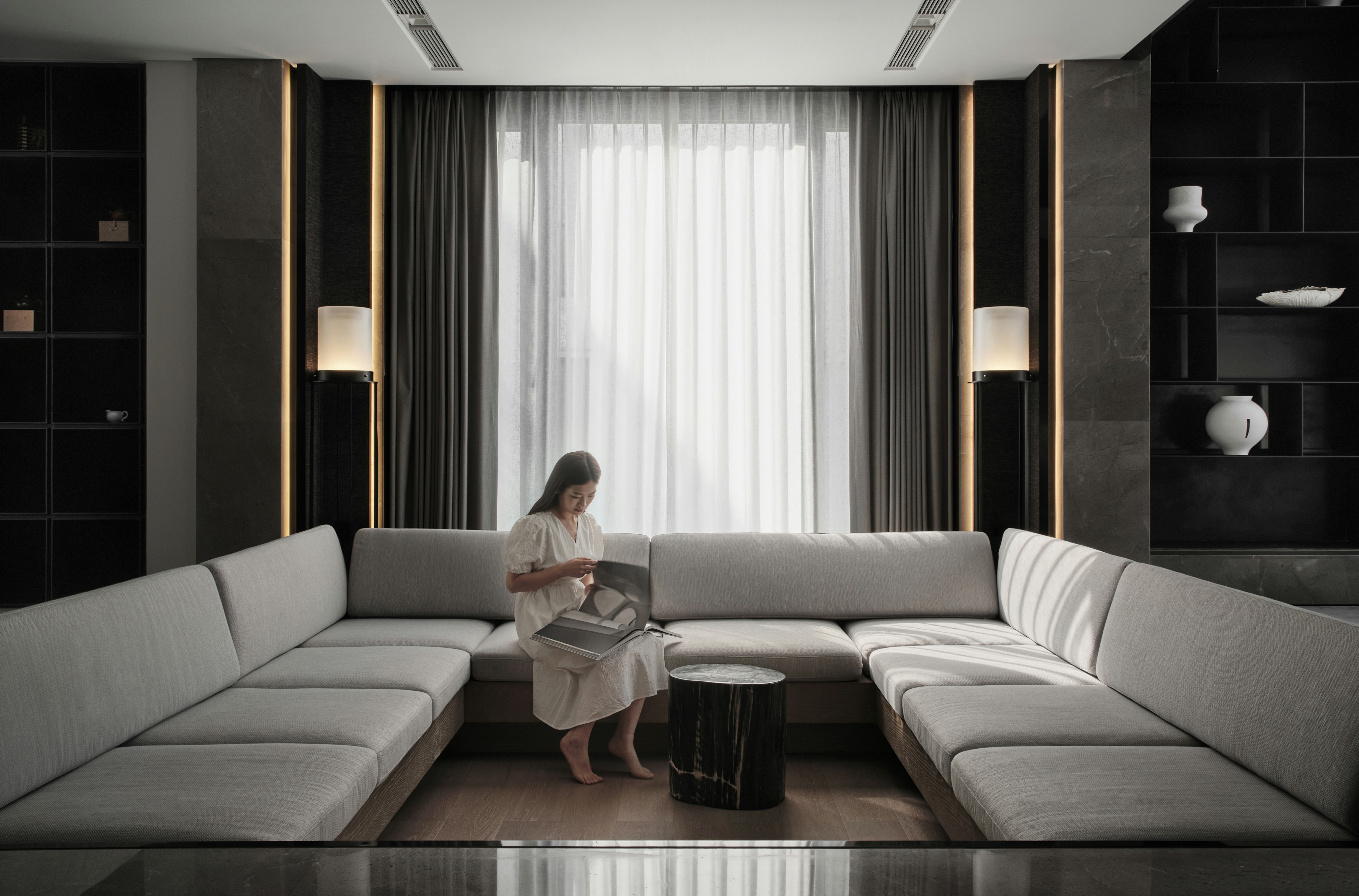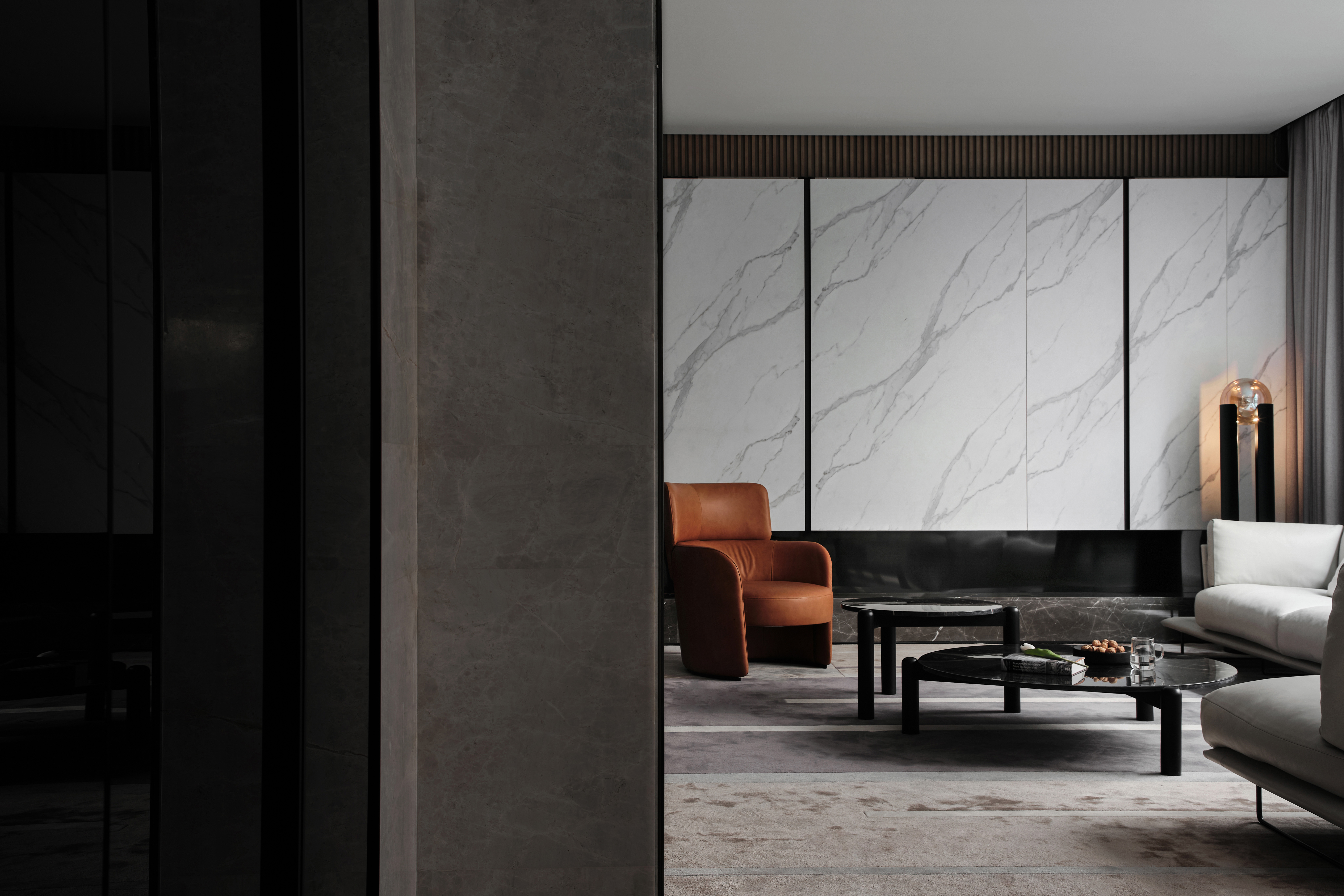 1、超长悬挑连纹岩板抽屉柜凝聚视觉焦点,兼具实用性与艺术美感,并与米色半围合沙发在色彩上形成呼应。当柜门全部闭合时,它延伸为一扇带有壁炉的客厅墙壁;而当柜门打开,悬浮式集成电视露出,紧凑的表面呈现出完整的功能指向和丰富的空间层次,以及公共区域的亲密属性。