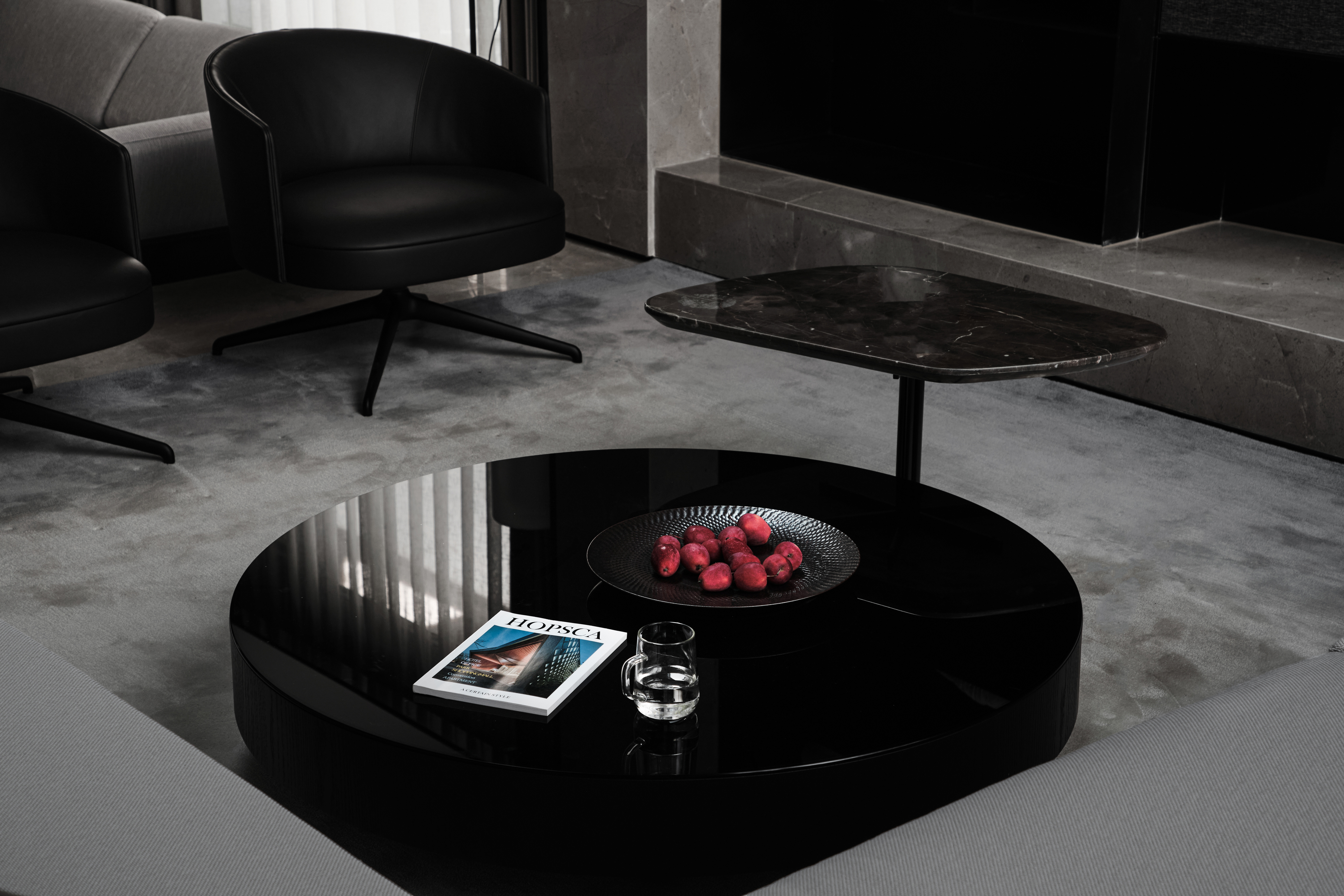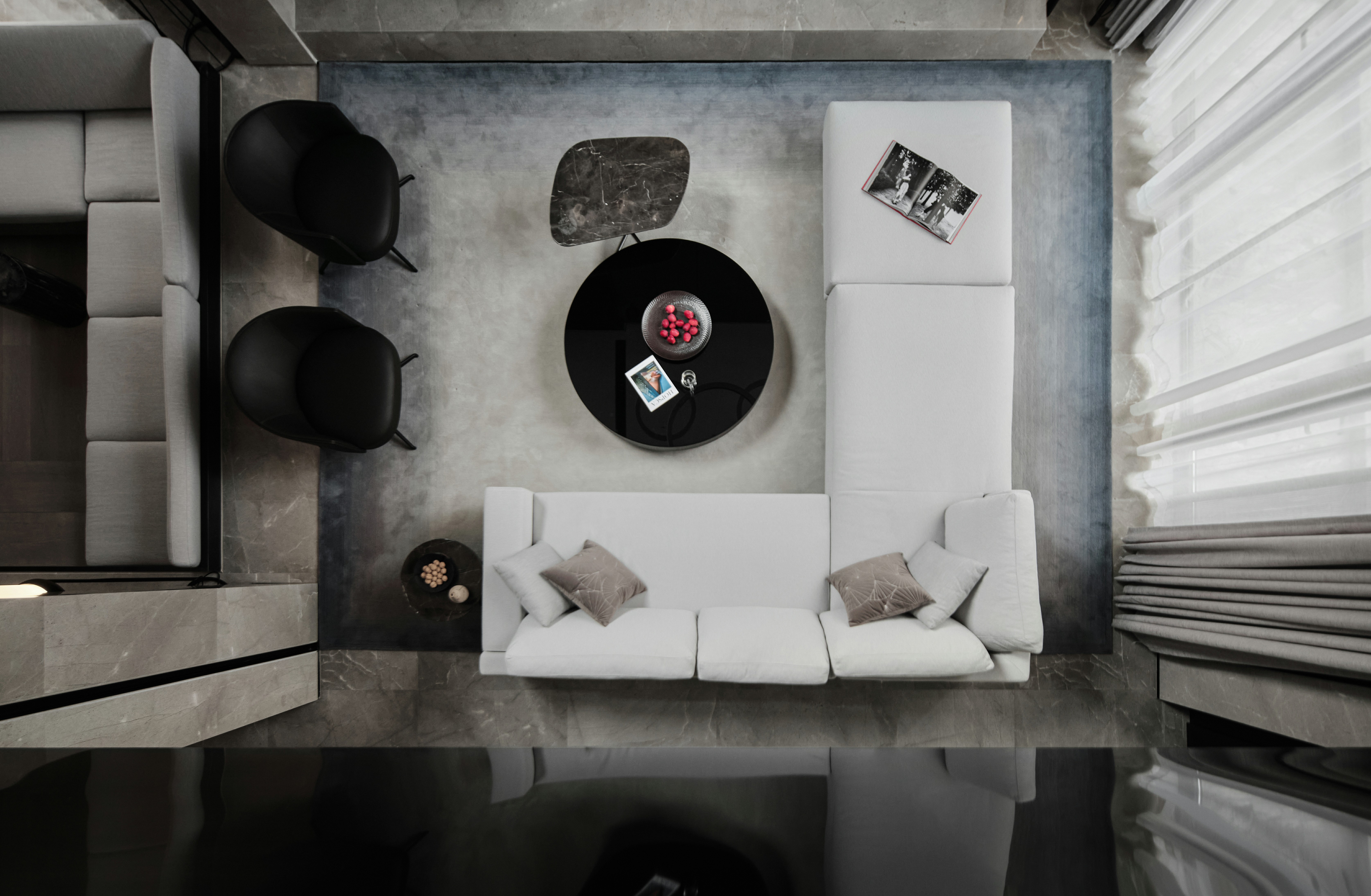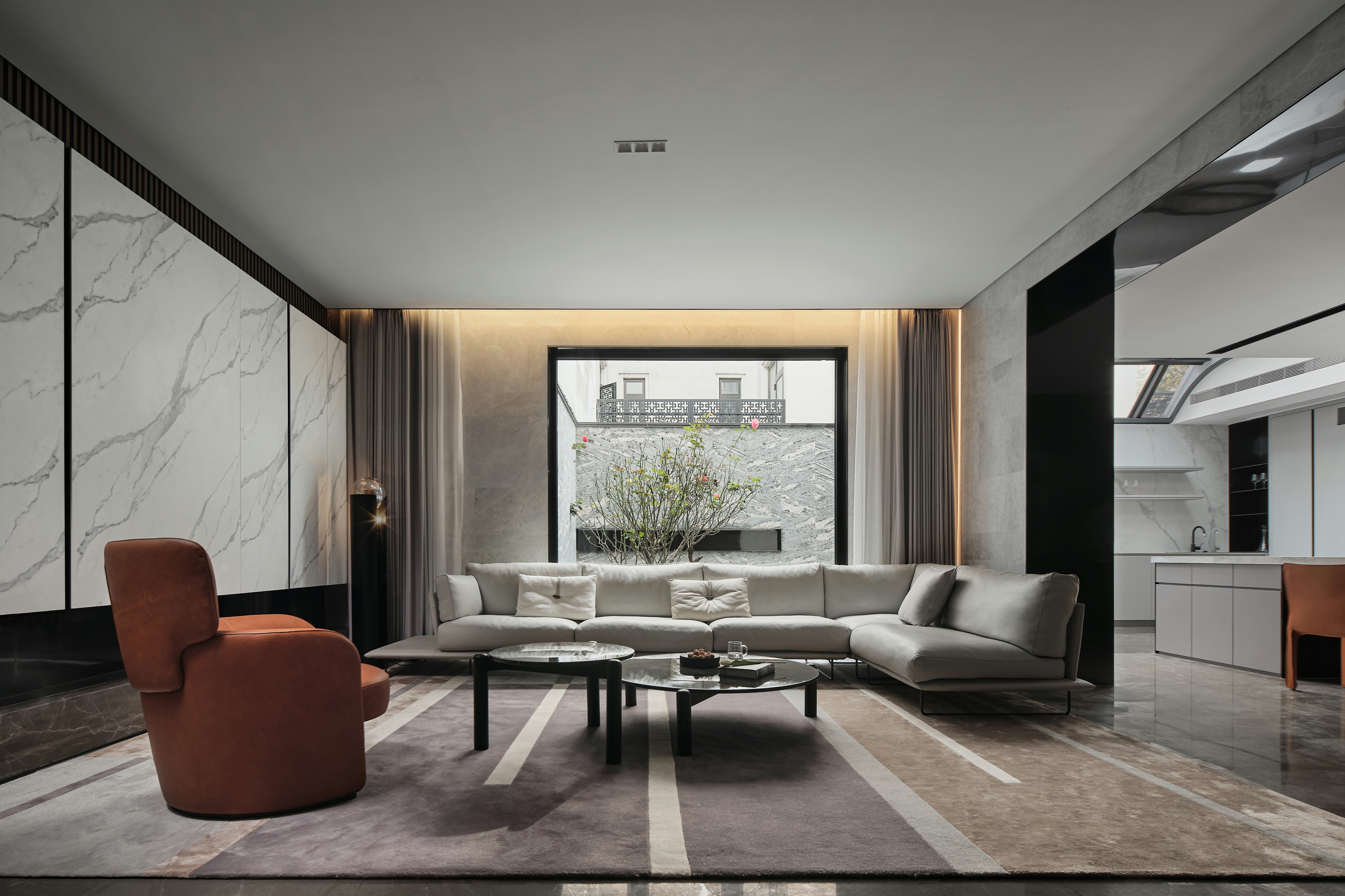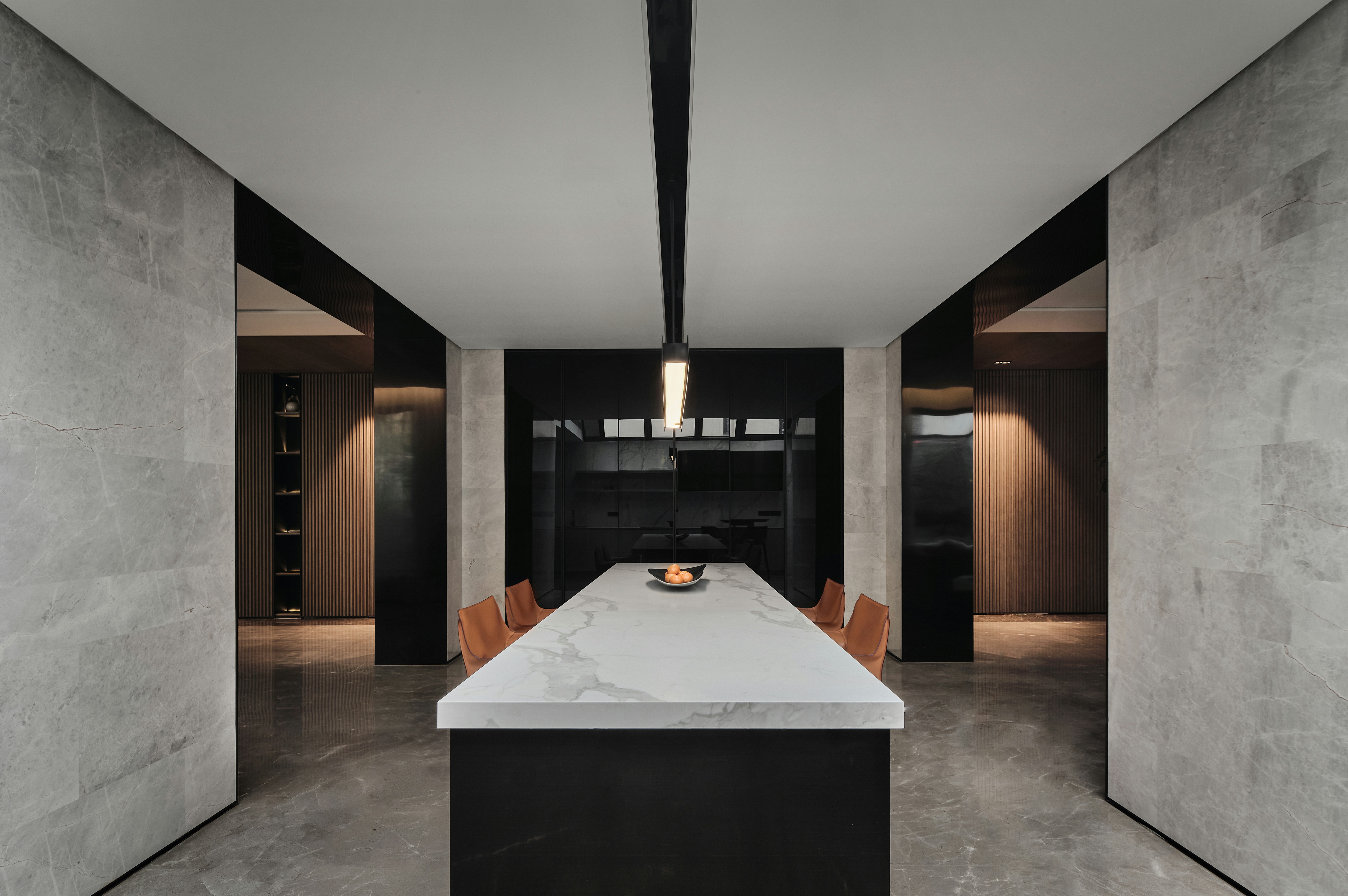 1、超长悬挑连纹岩板抽屉柜凝聚视觉焦点,兼具实用性与艺术美感,并与米色半围合沙发在色彩上形成呼应。当柜门全部闭合时,它延伸为一扇带有壁炉的客厅墙壁;而当柜门打开,悬浮式集成电视露出,紧凑的表面呈现出完整的功能指向和丰富的空间层次,以及公共区域的亲密属性。