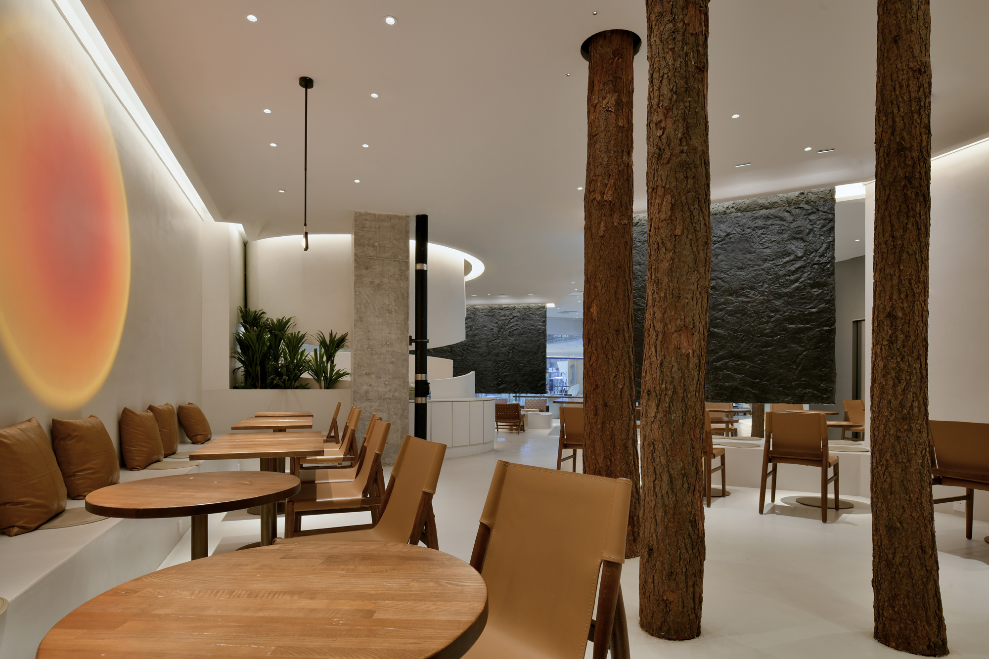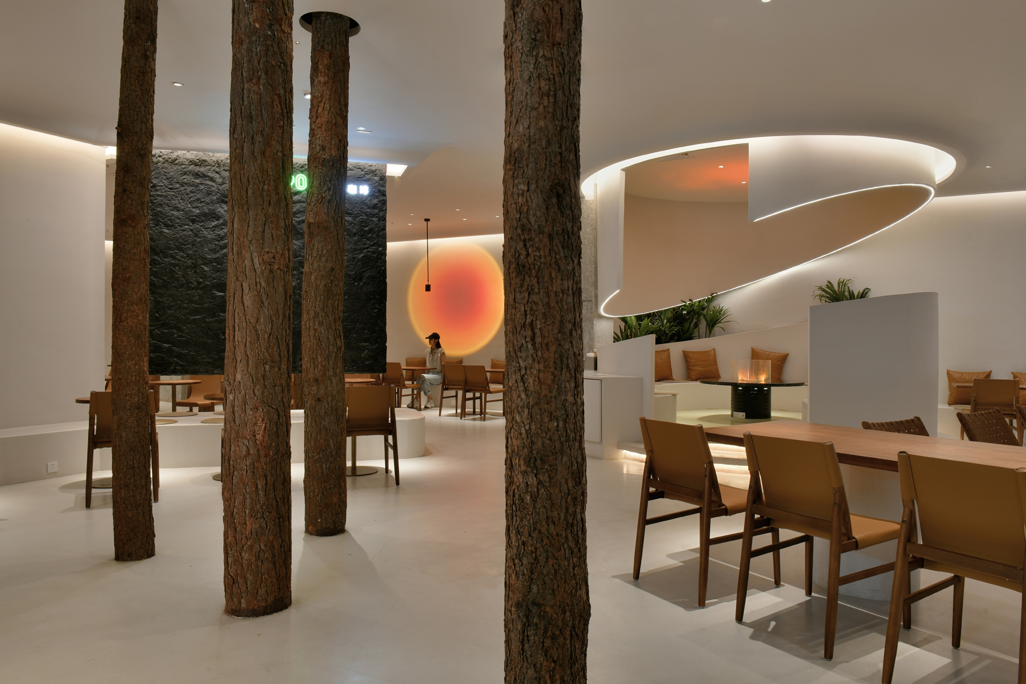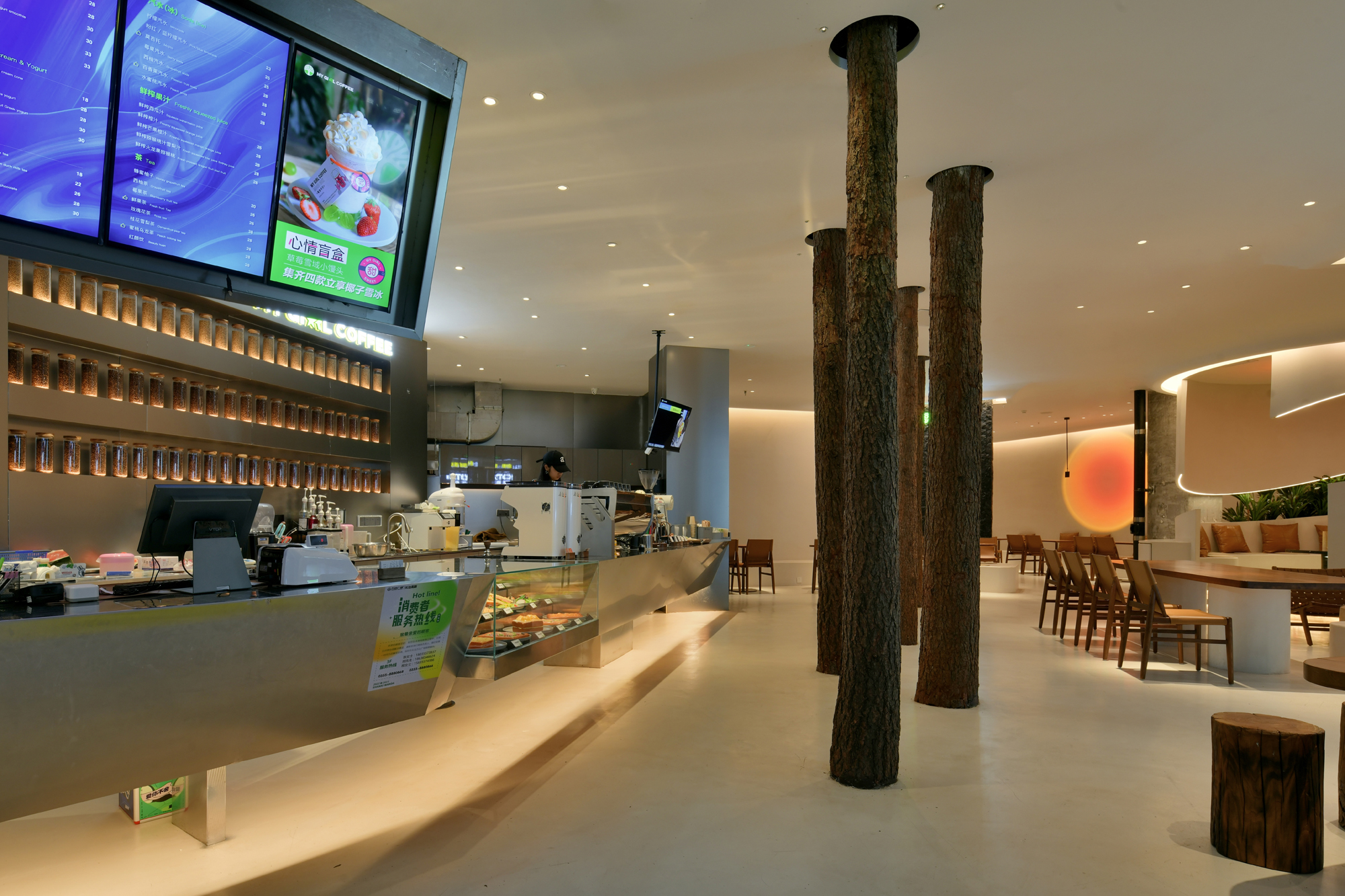 空间设计简约自然,原木树杆引用到空间中,使空间更加的贴近自然