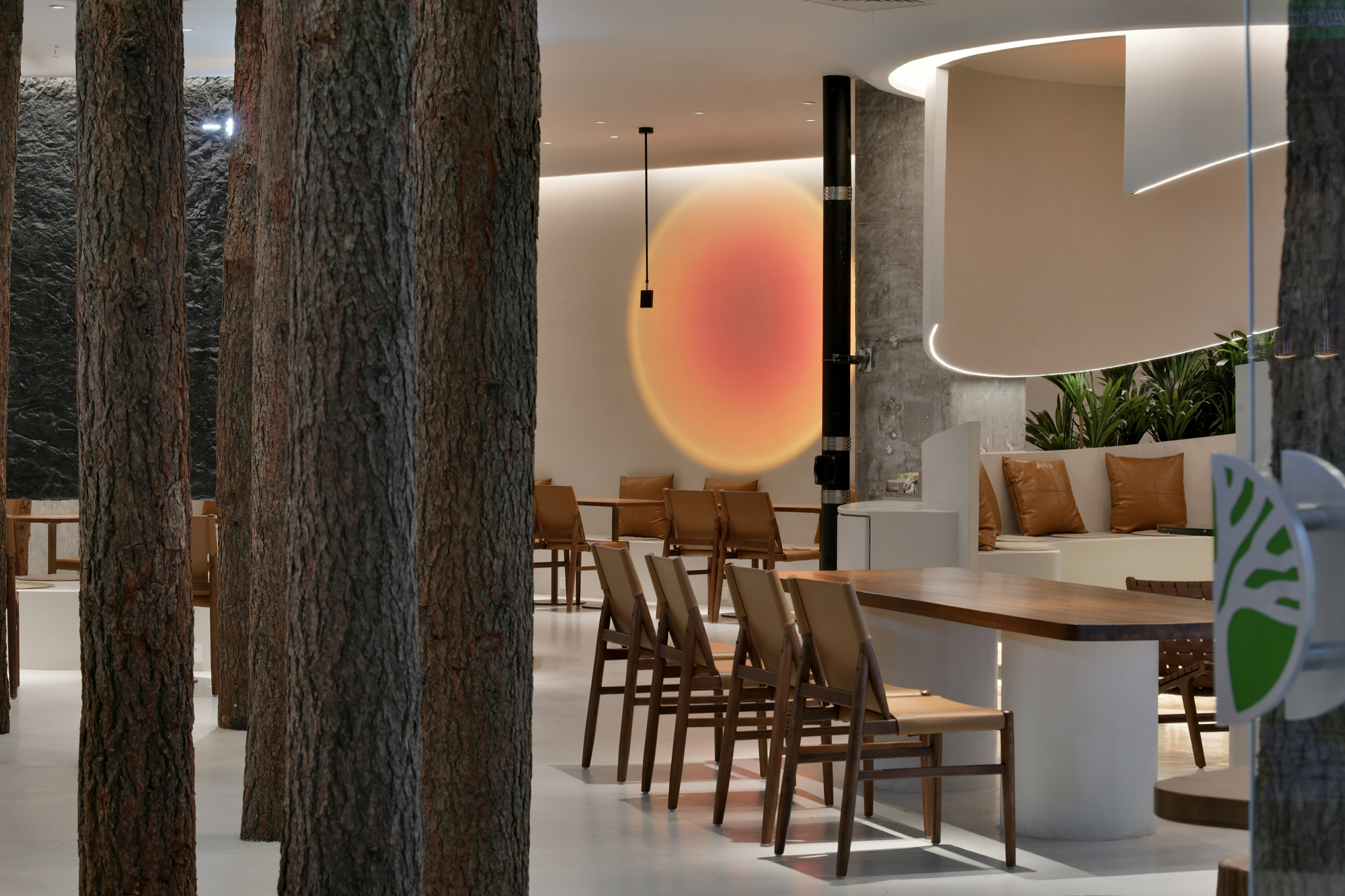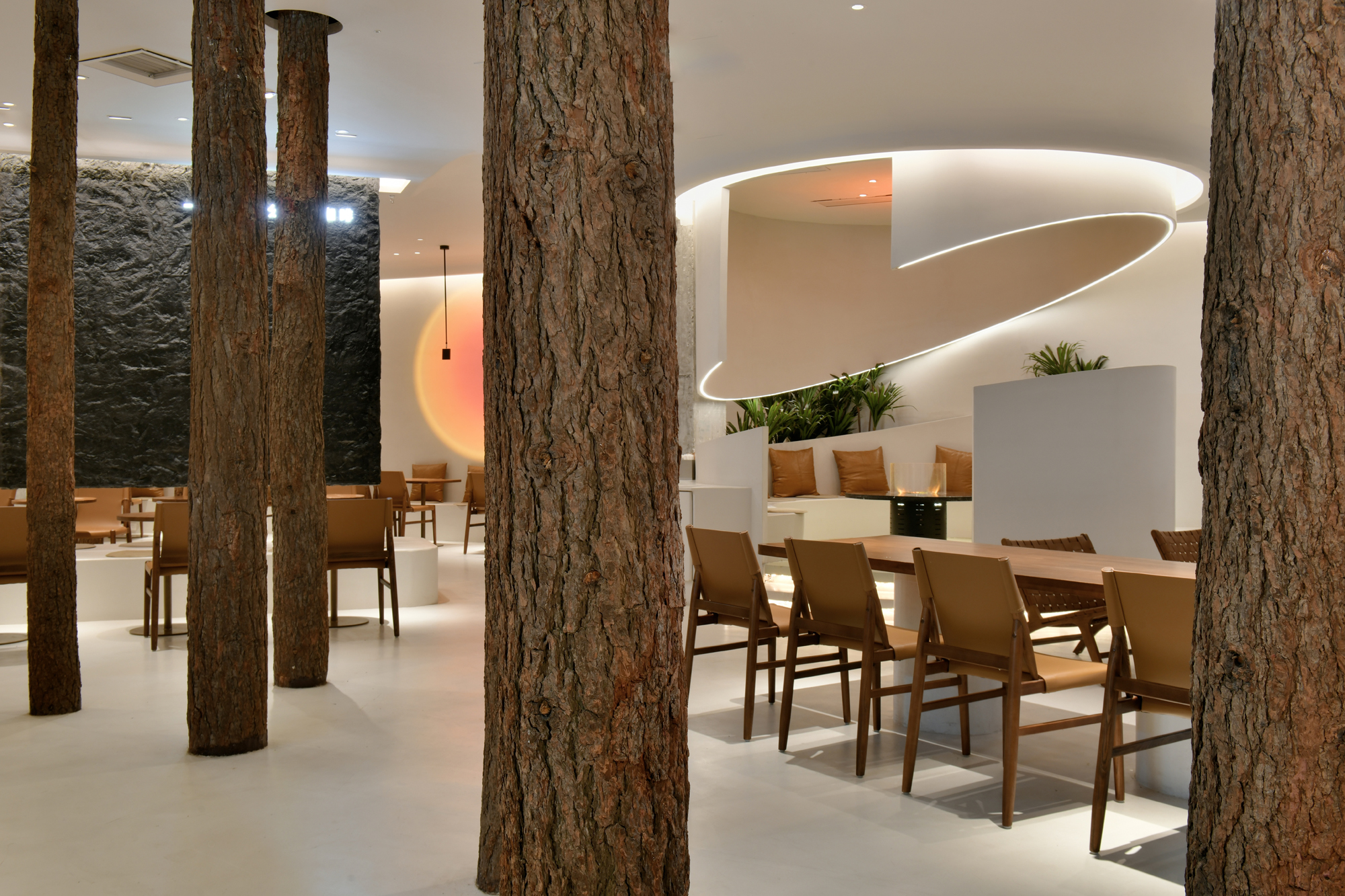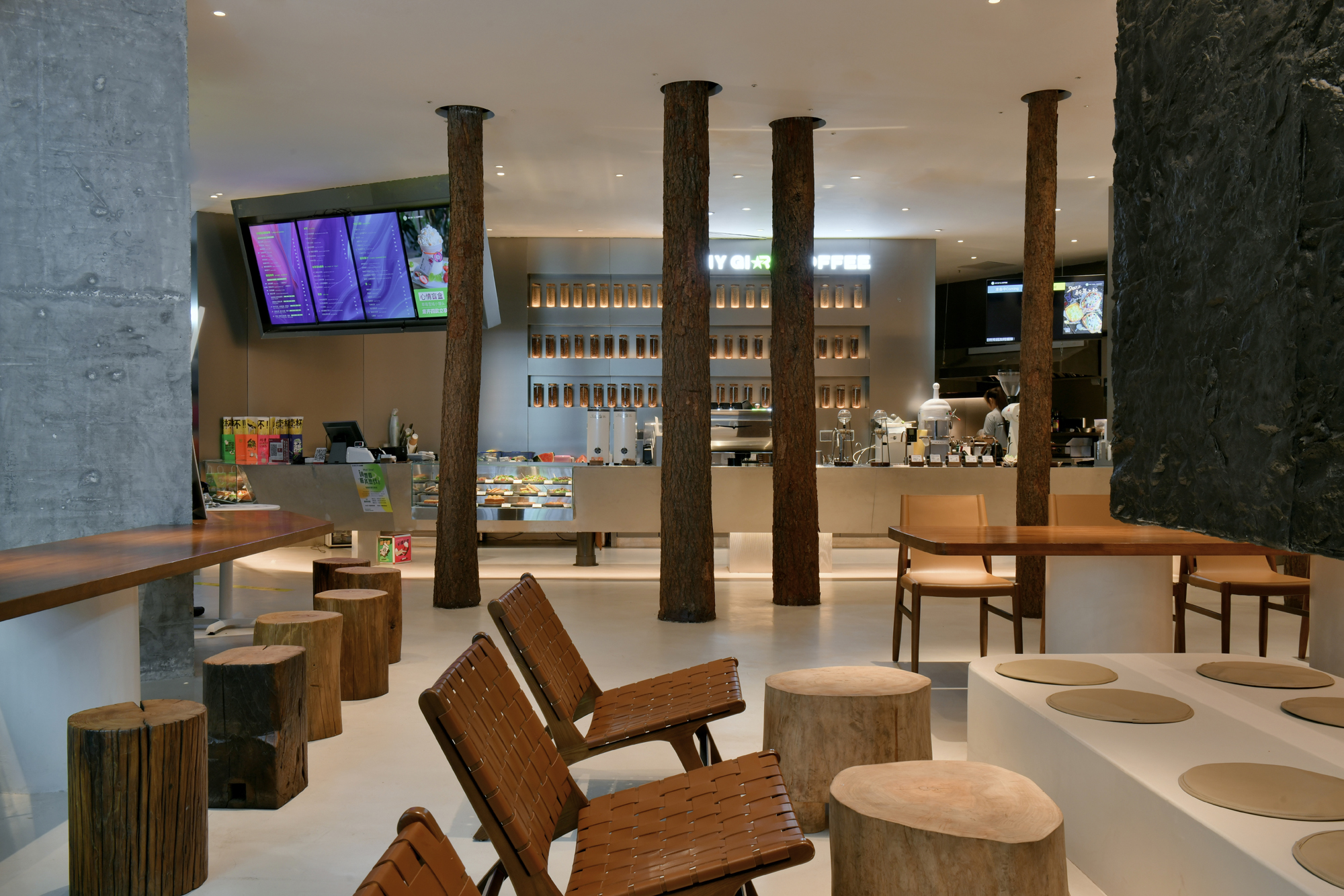 空间设计简约自然,原木树杆引用到空间中,使空间更加的贴近自然