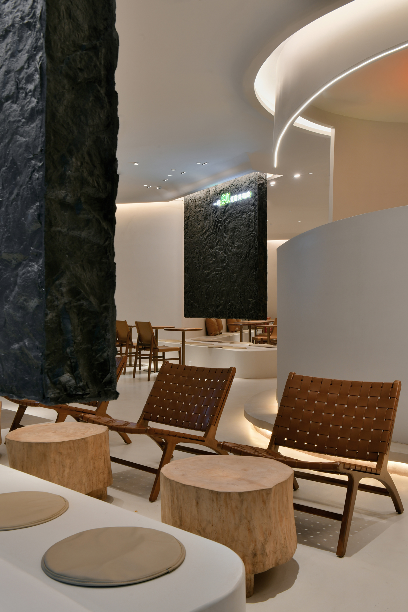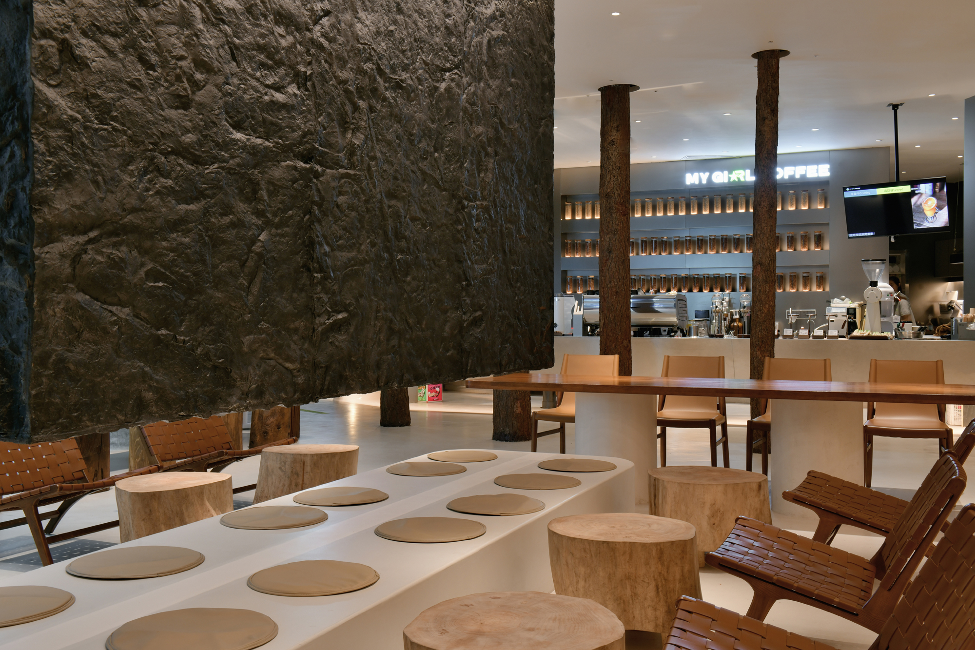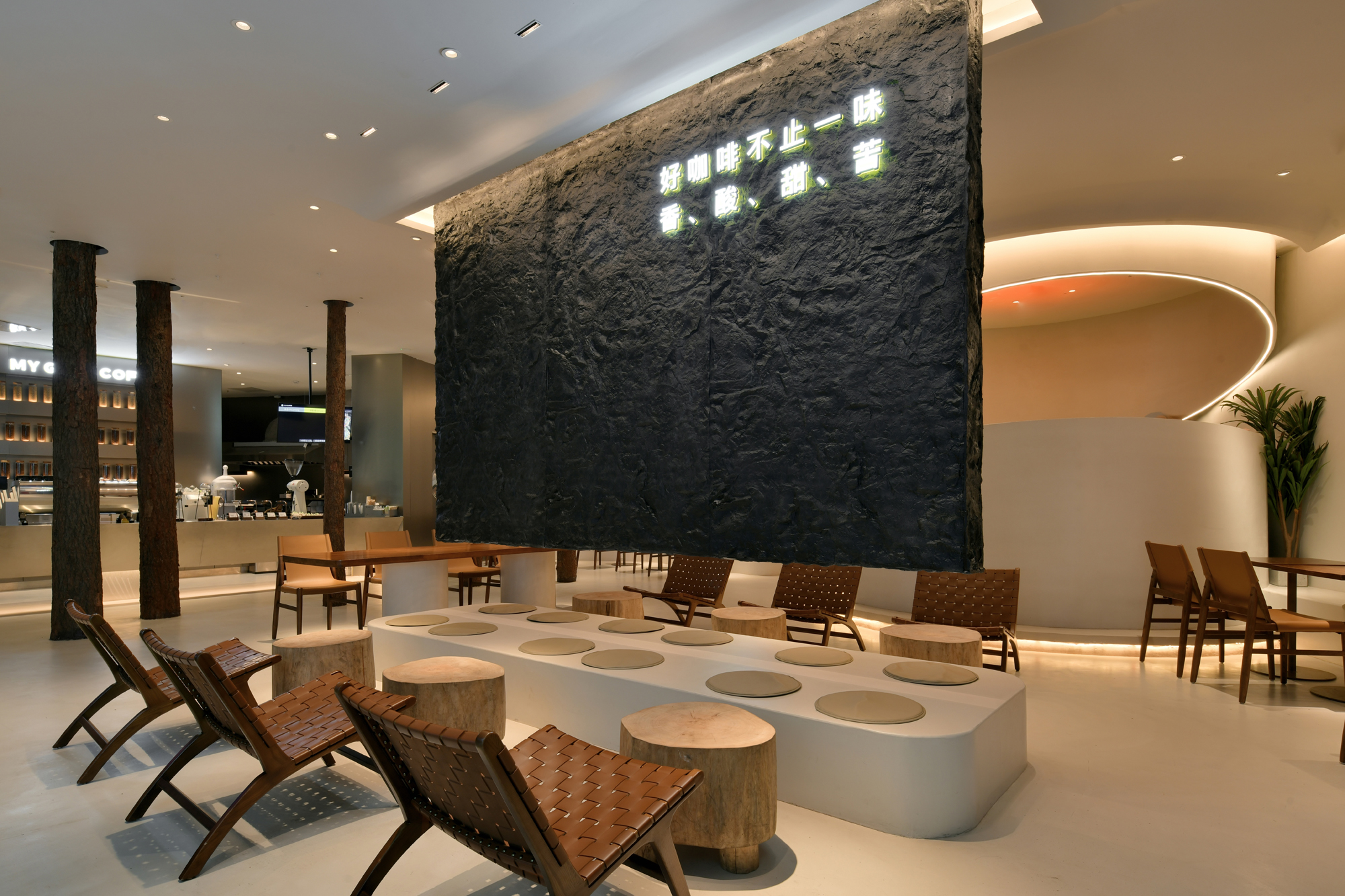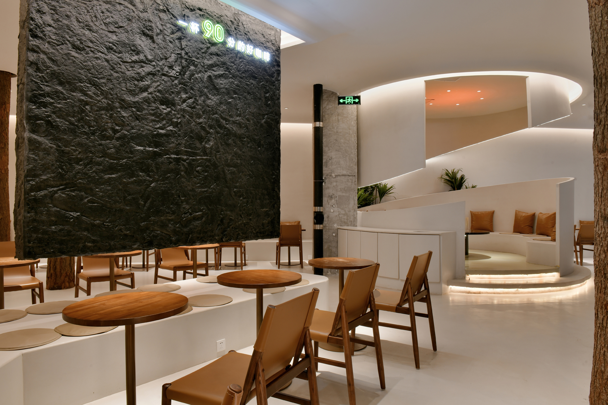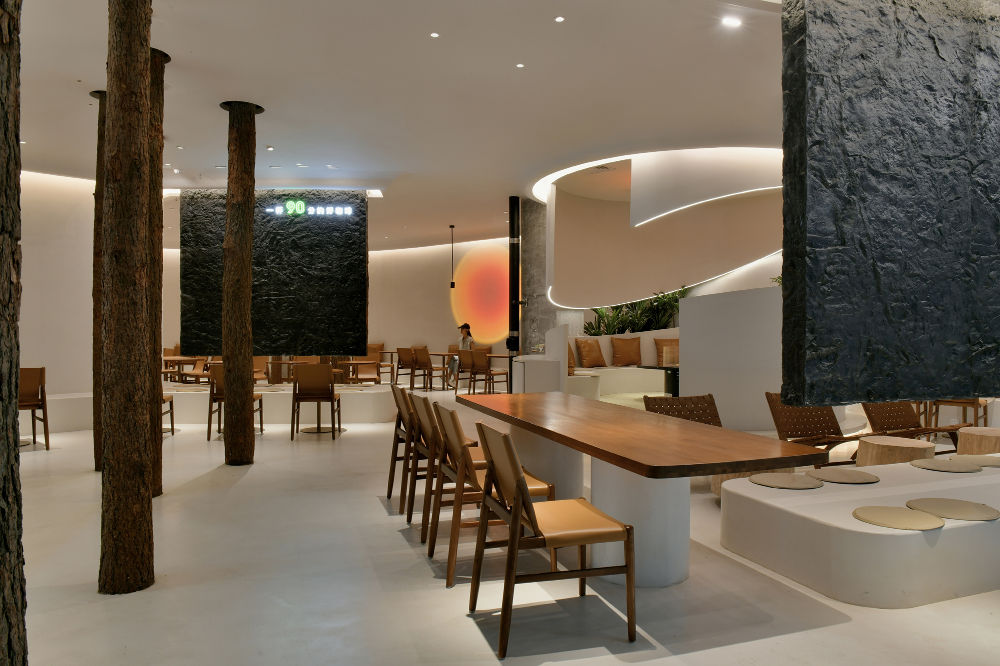 原木树杆原生态的选材,老山岩板的运用让空间材质更丰富。