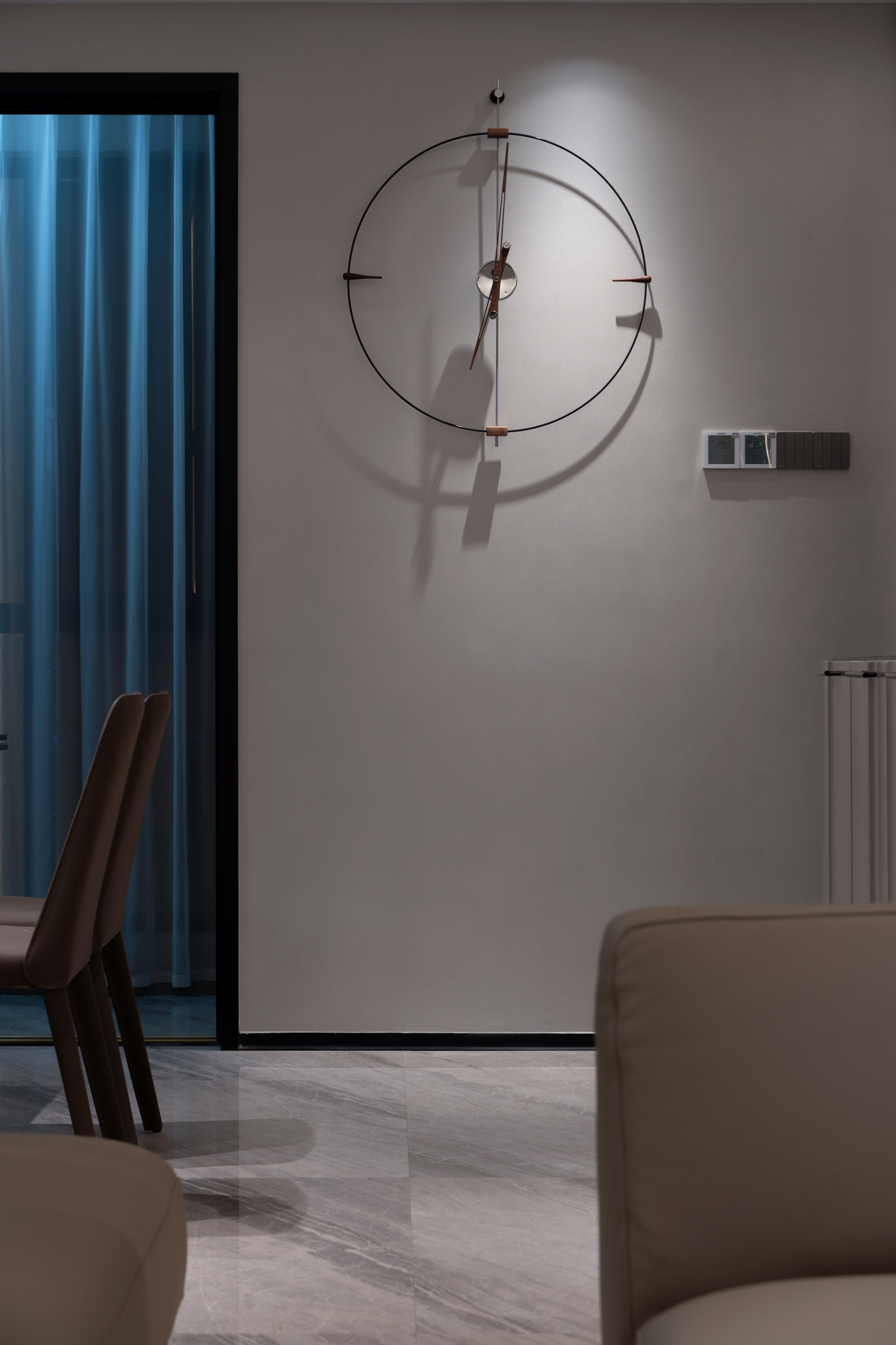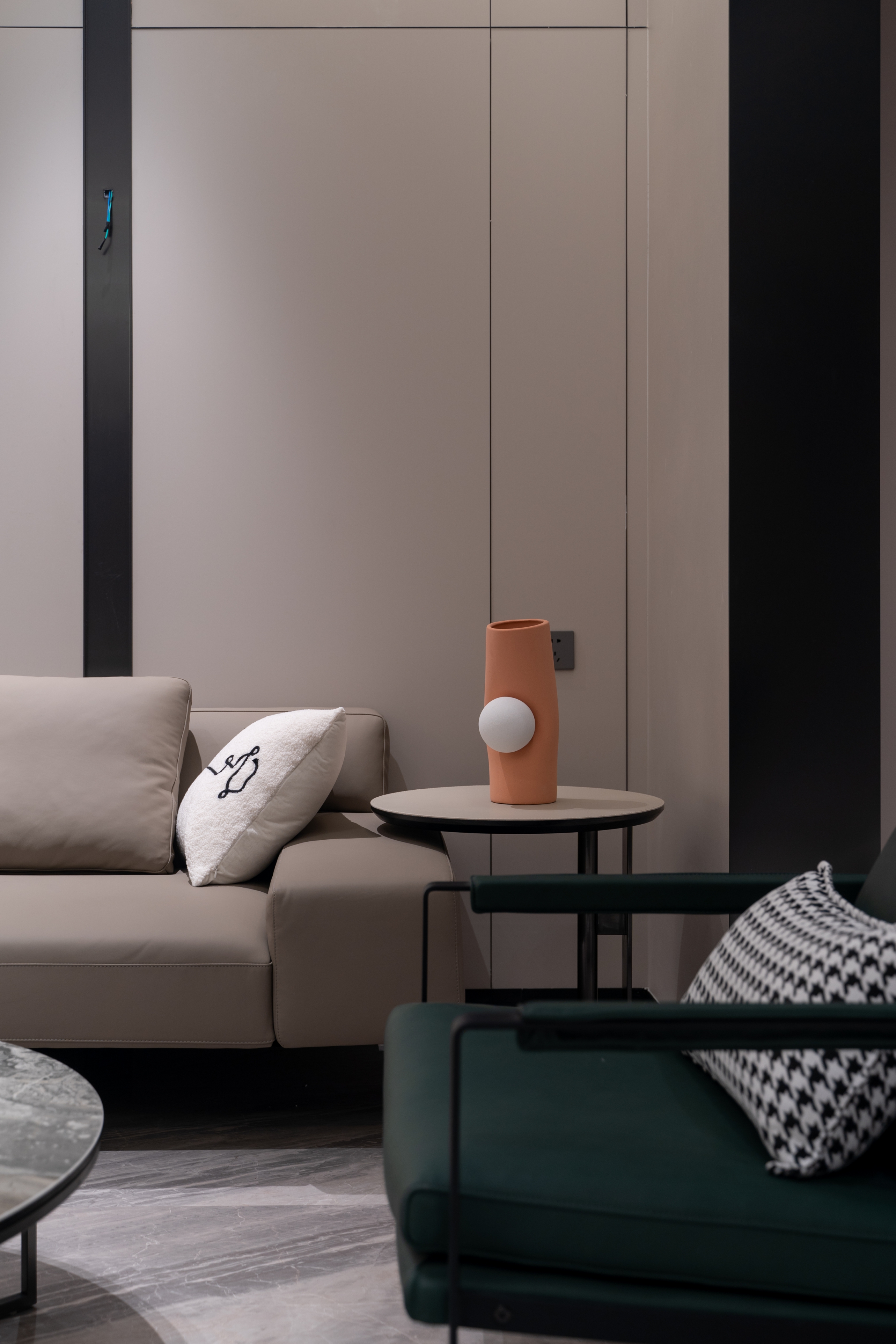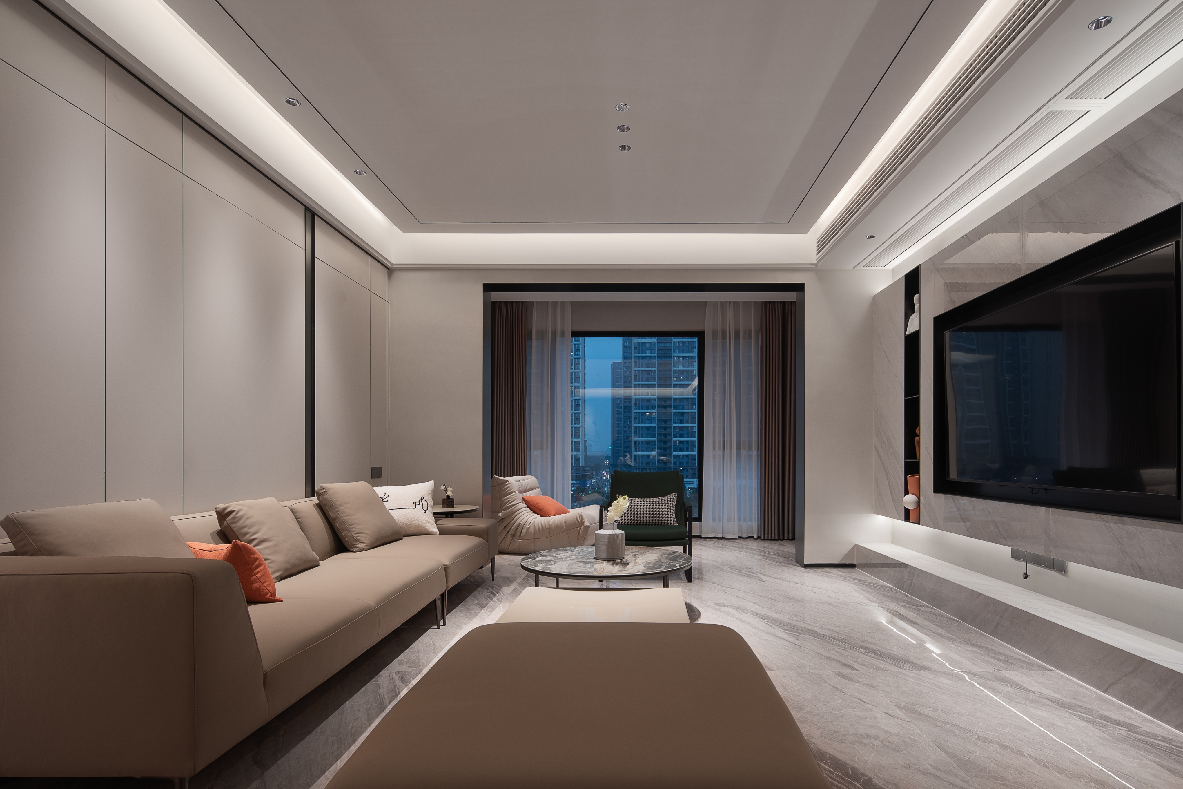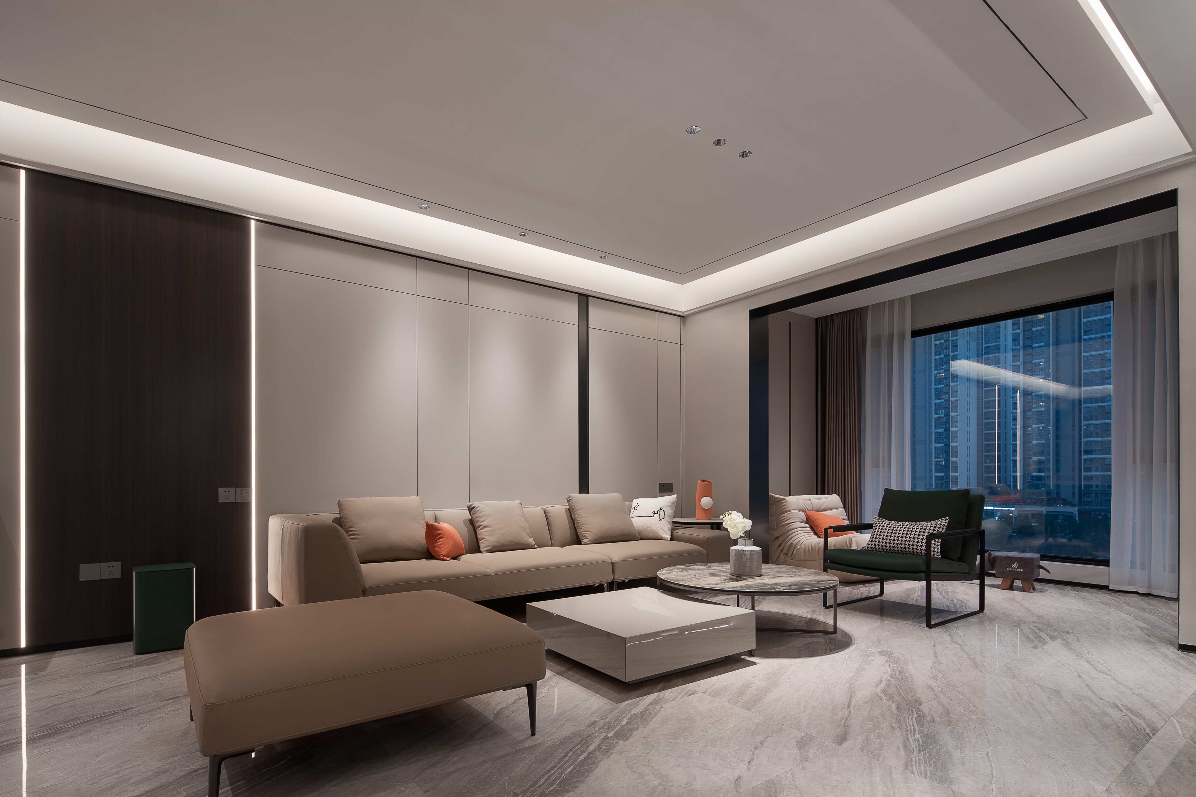 设计选材:流畅顺滑的直线沿着各自的方向伸展,大理石的经络自由蔓延,加以点缀充满热情的橙,清冷与炙热的碰撞,造就家的暖围,光线的运转与生活交错延绵,不同于任何事与物。
