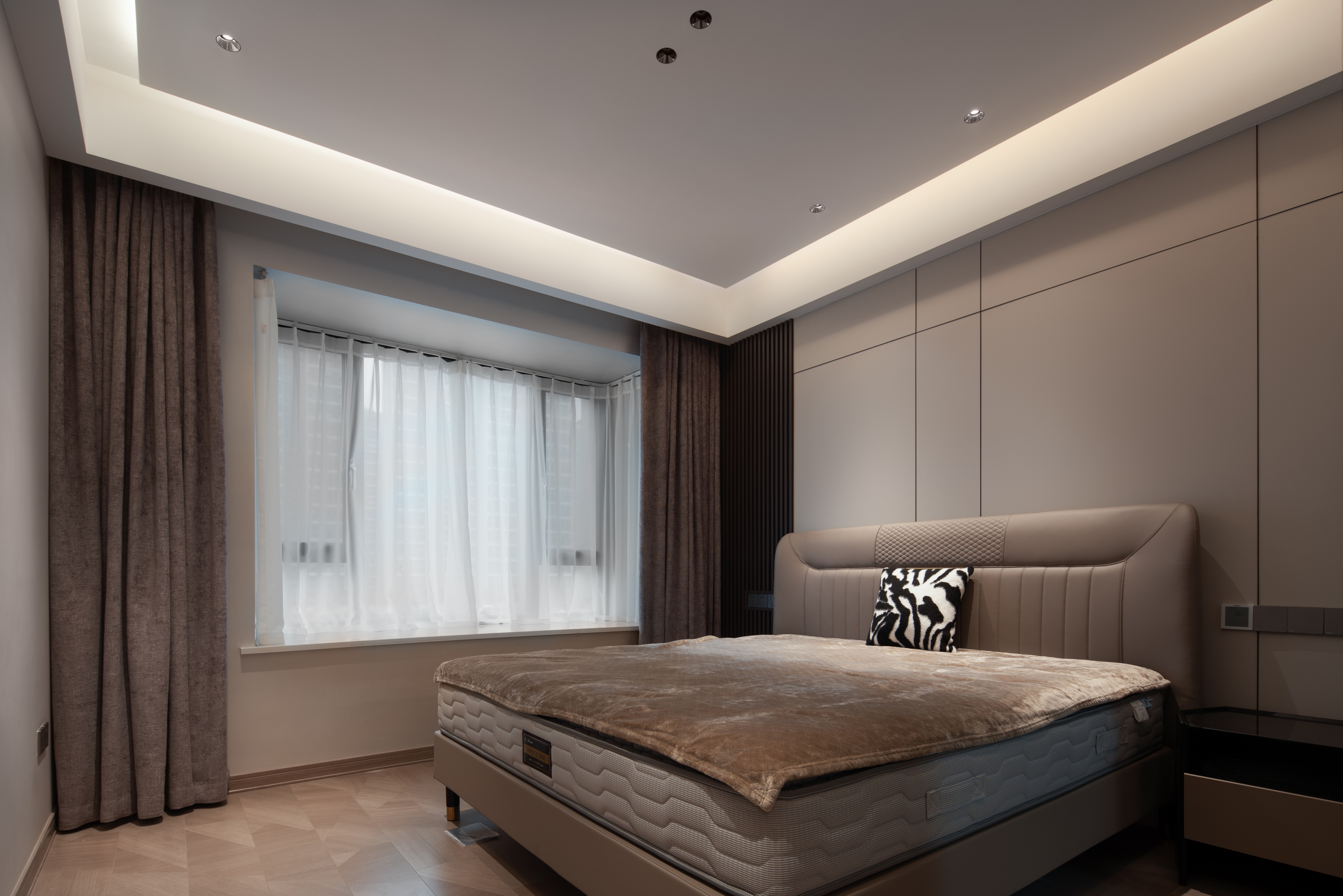 空间布局:整体通透干练的格局,慵懒的咖调,与之搭配着简洁的白,提升了整片空间的品质感。