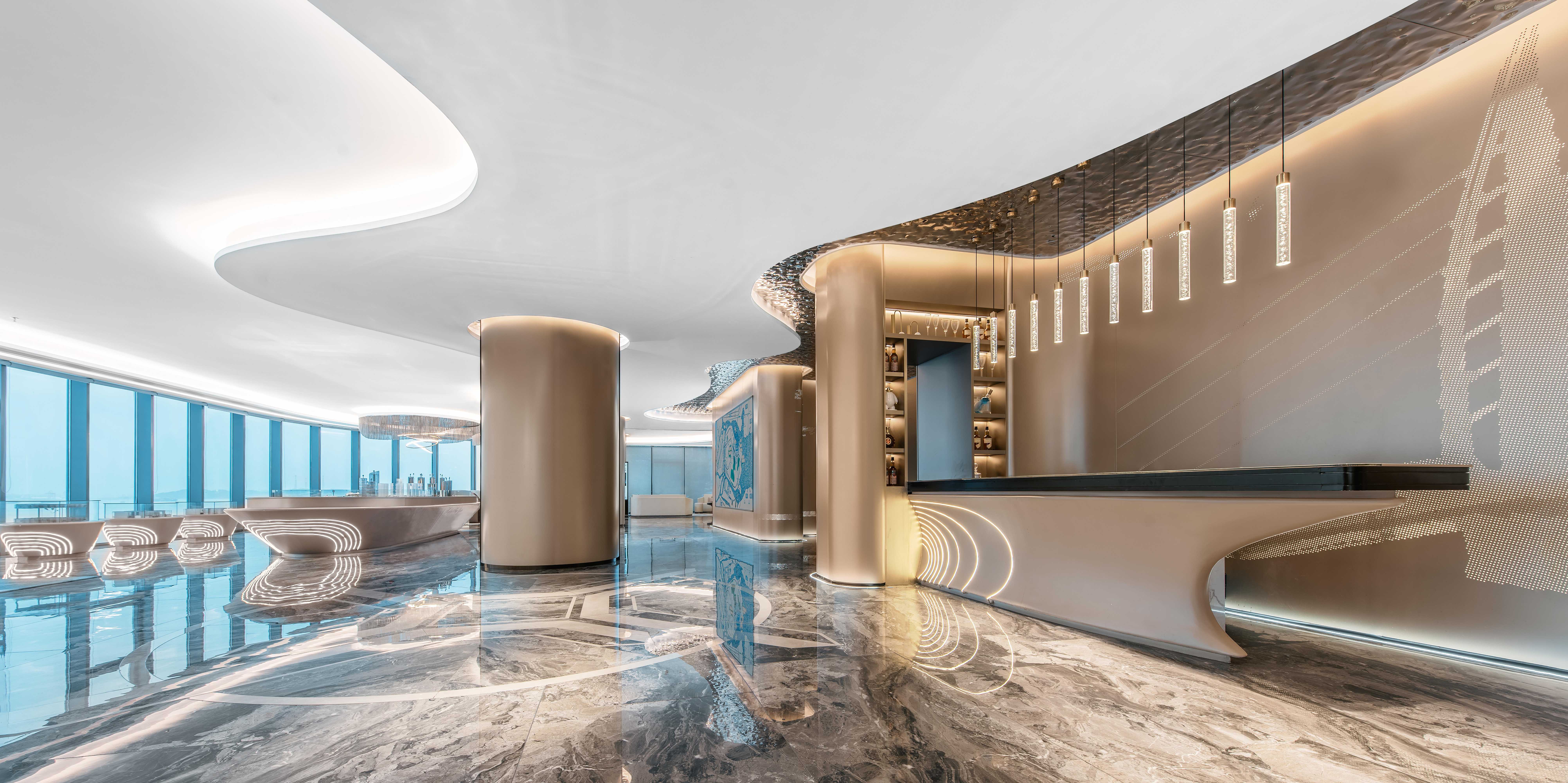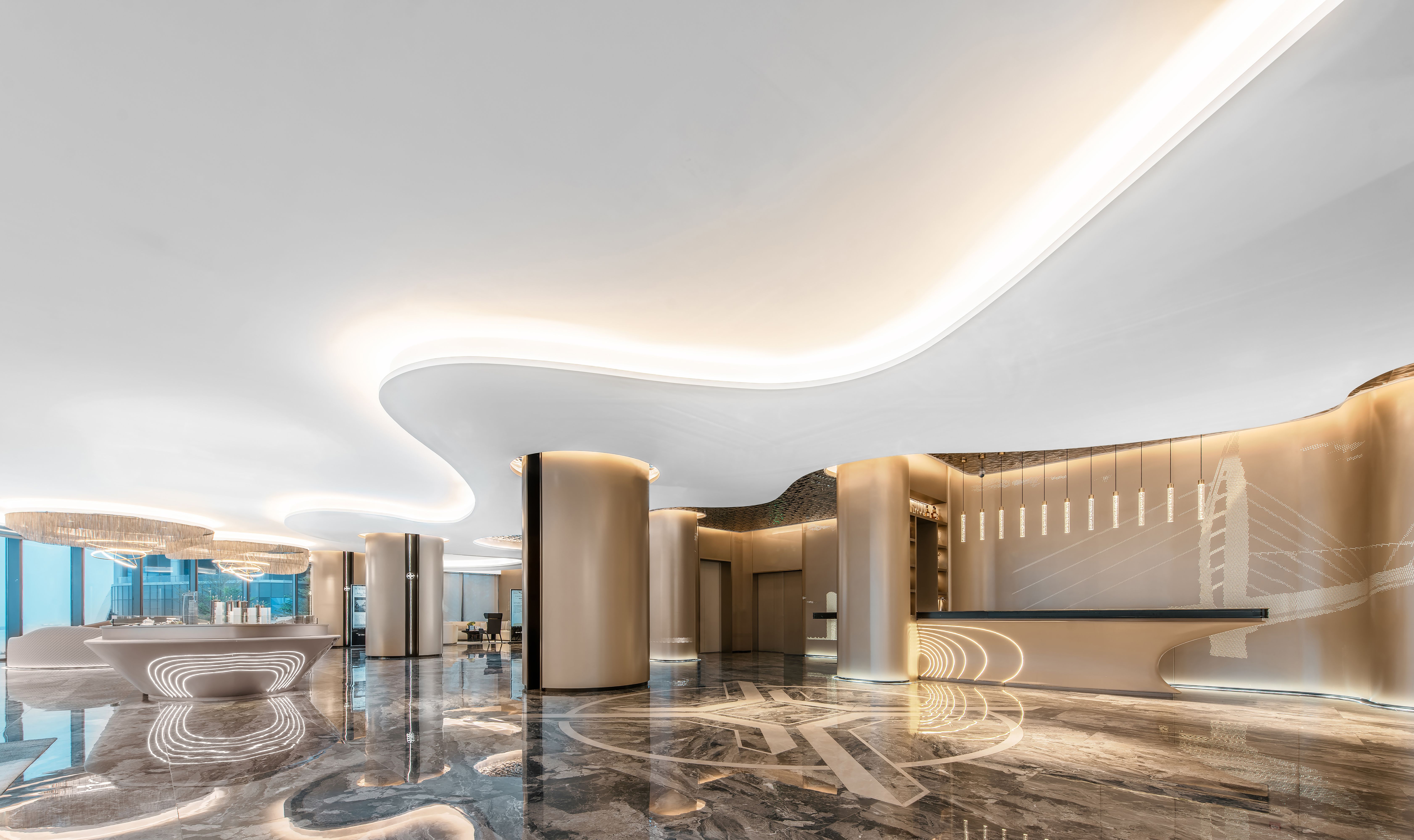 十三层是中交邮轮广场办公展厅位,具有一线海景视野和独特的邮轮文化气息,空间整体设计定位为科技、高端、时尚。水波纹、具有科技感的字符和金属等元素贯穿整个空间,是邮轮文化与现代科技文化的一次交融与碰撞。 -