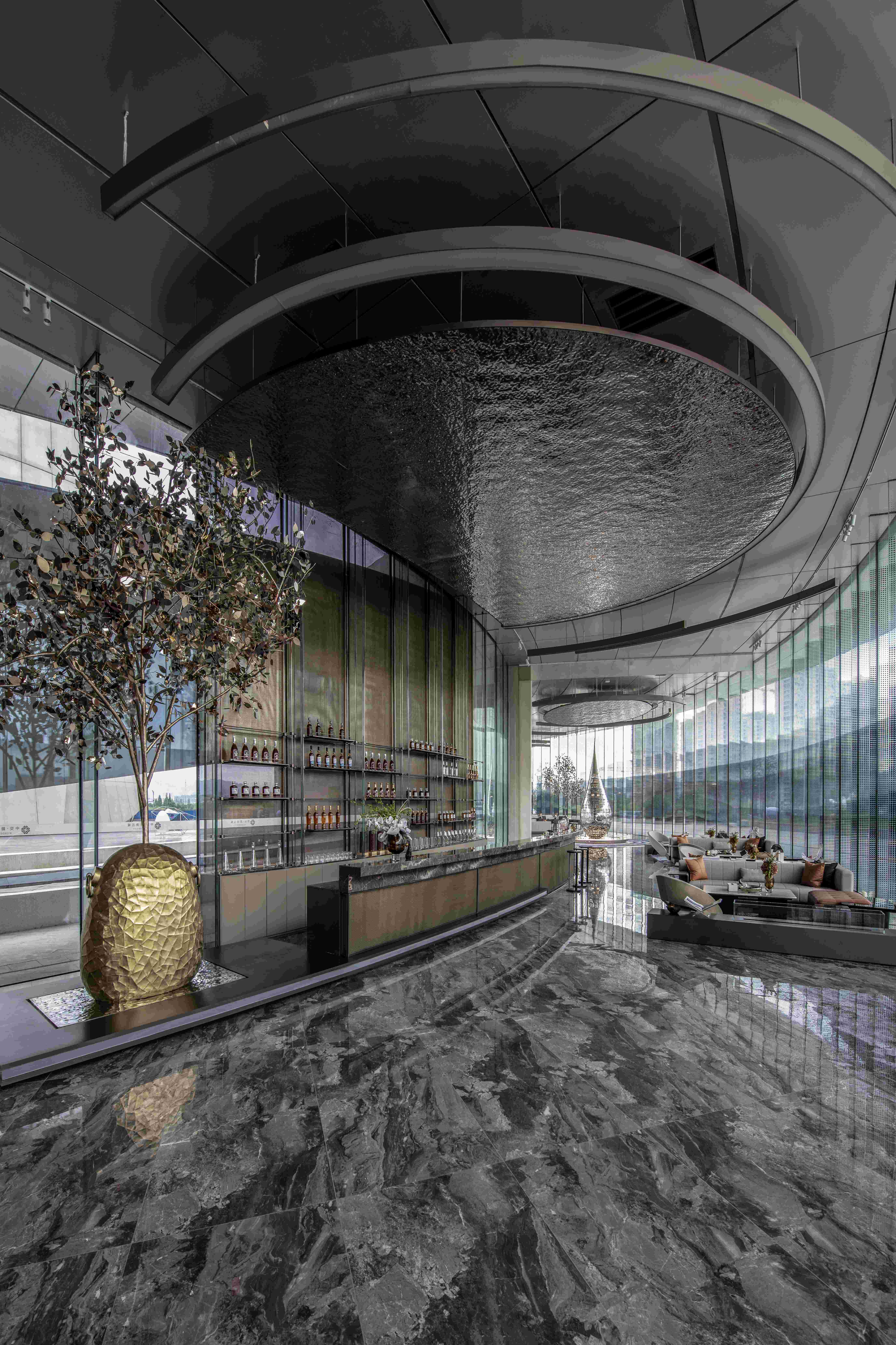 空间意境:二楼展厅设计取意于“日月星辉”,设计师将百里山河画卷在玻璃肋上以贴膜形式展现,呈现出山河壮阔的景象;并引用“星空”中星轨的形态,体现“星辉”设计概念,寓意本地块如明星钻石般闪耀。