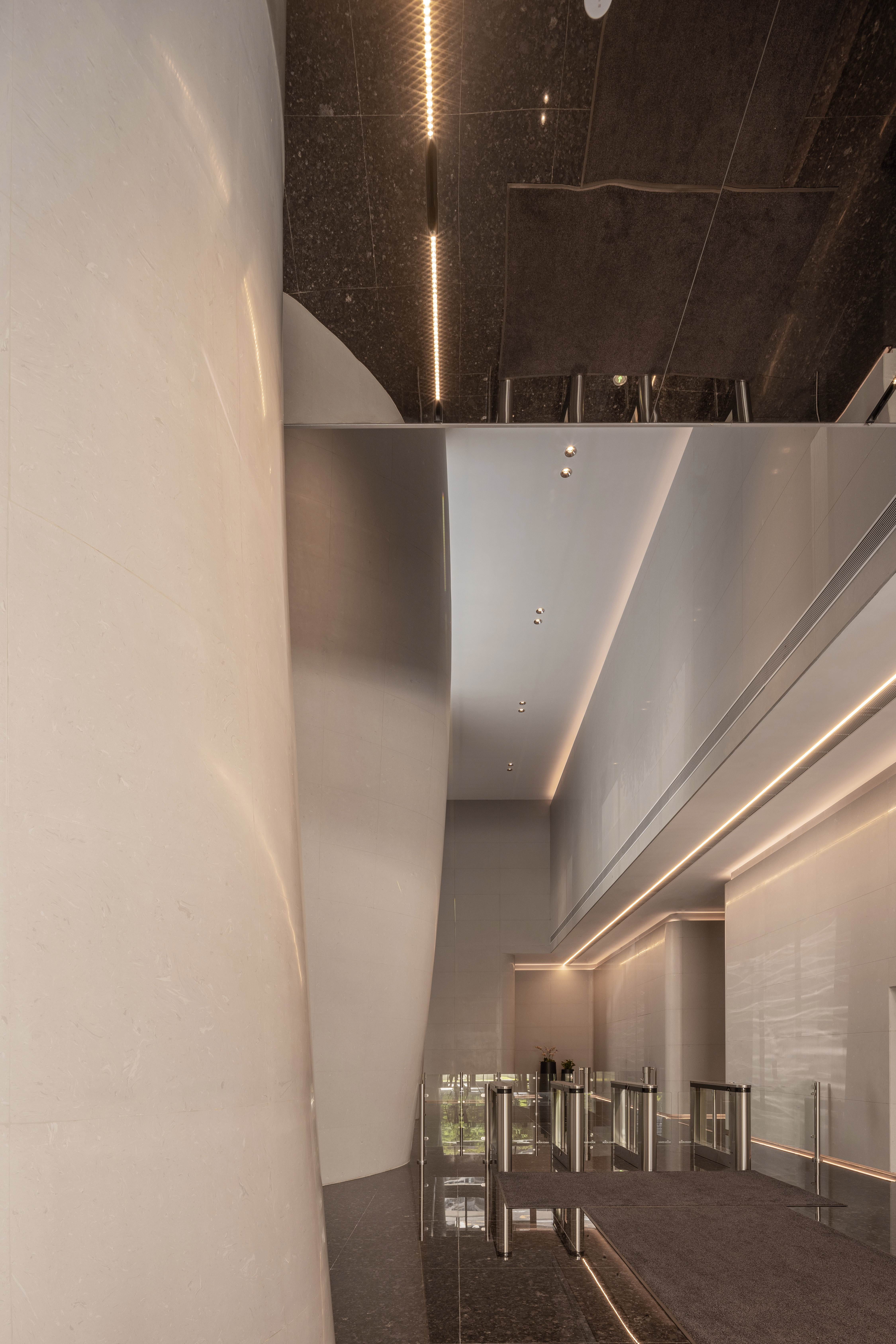 首层大堂,结合裙楼天窗及天花镜面材质,呈现出独特的空间尺度和光影关系。