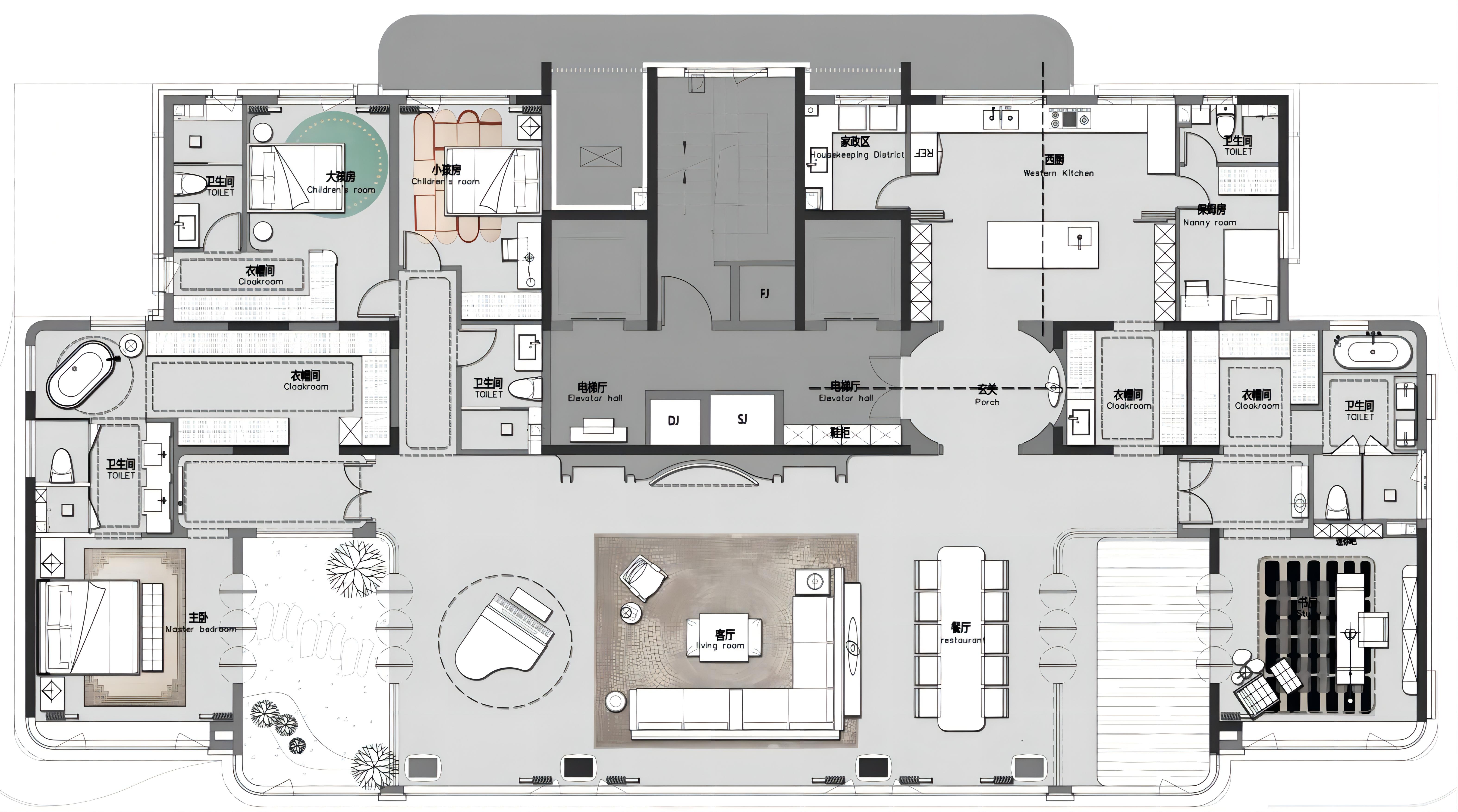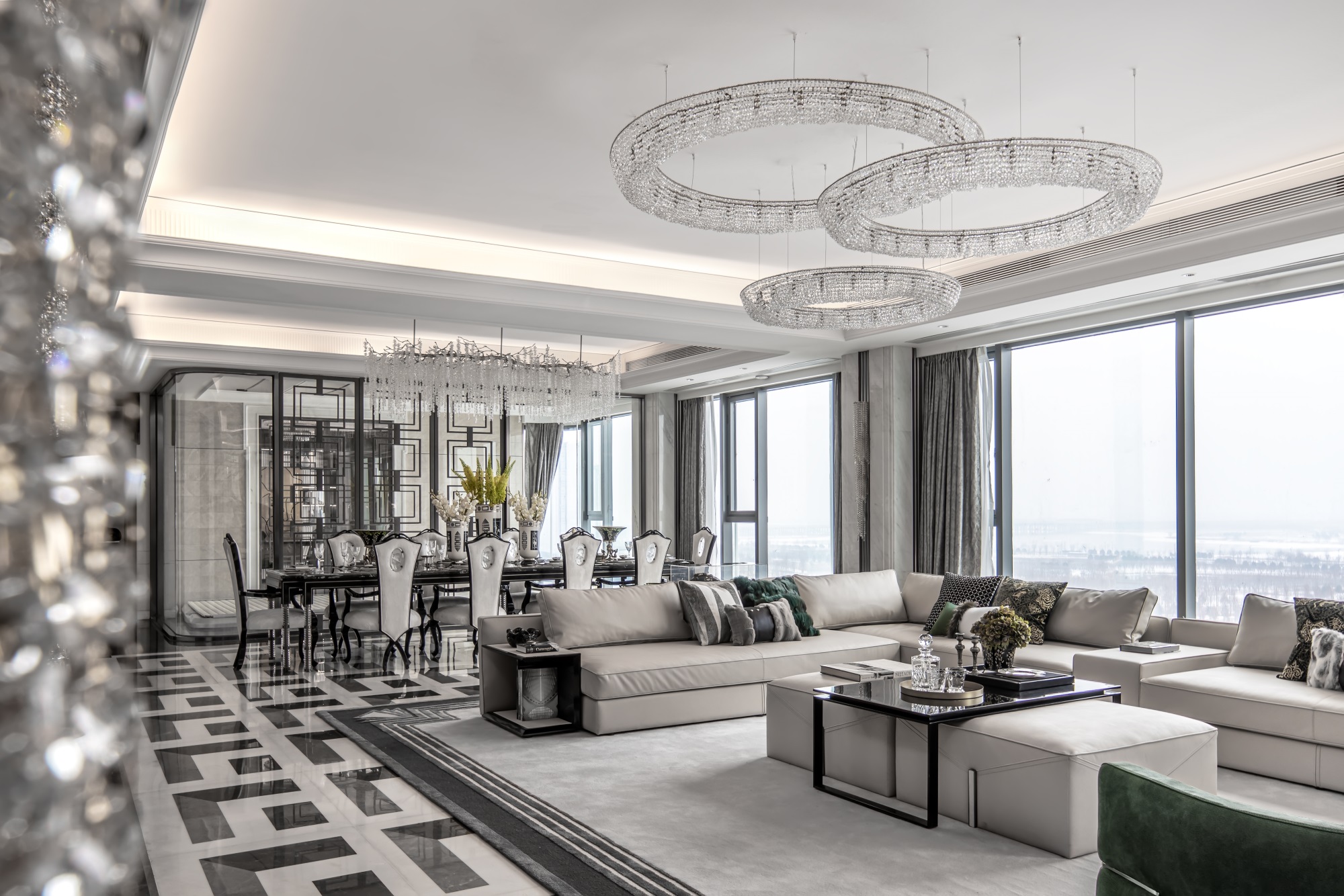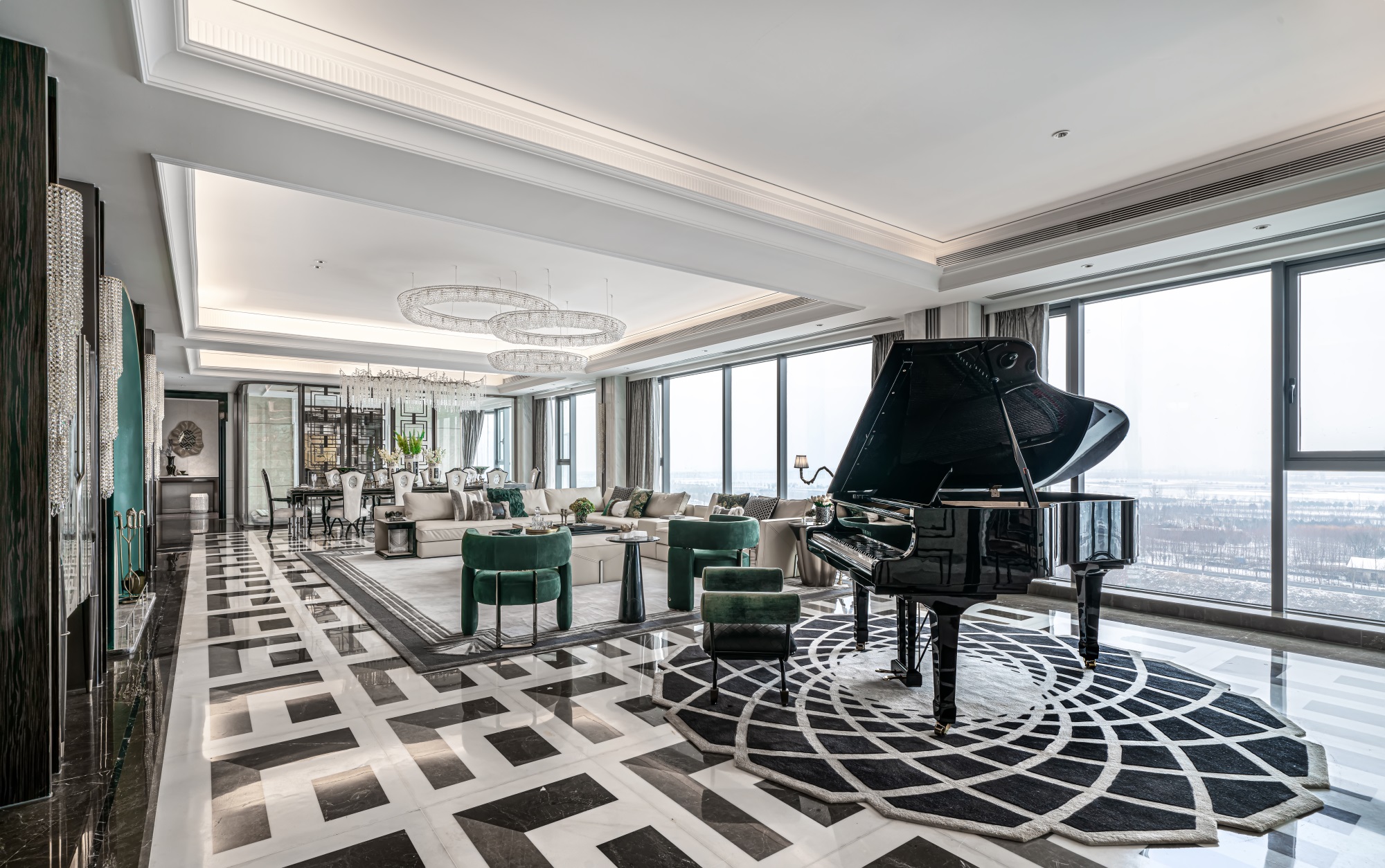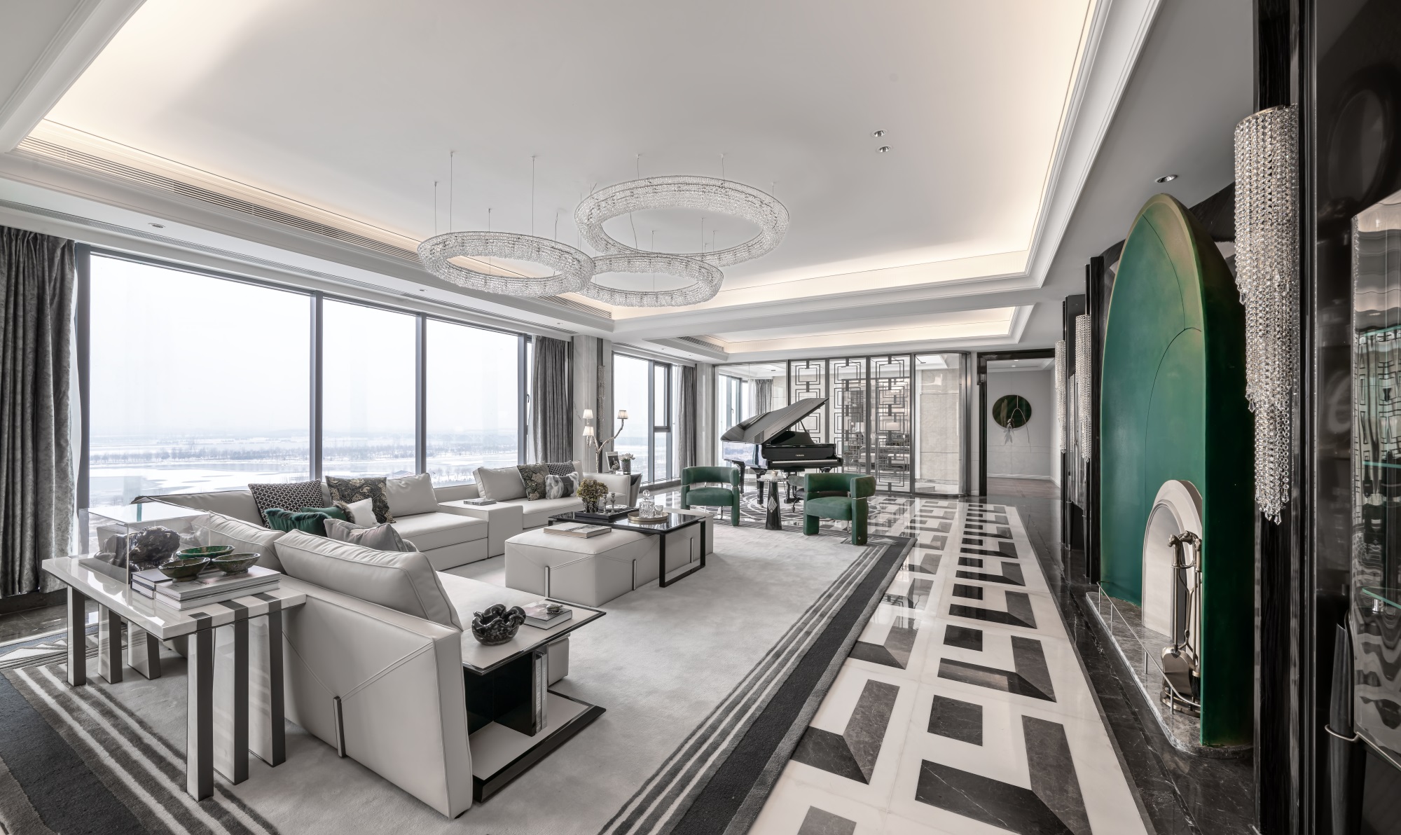 项目定位:项目择址石家庄滹沱河北岸城市资源带、正定自贸区核心板块,交通便利,享多维生活配套。滹沱碧波、滹沱花海、中心湖公园等自然资源星罗棋布,城市发展格局亦于此处交融、汇聚、新生。设计以滹沱盛境为引,让经过百年沉淀的装饰主义风格,融粹出新。大面积落地窗打破室内与室外界线,艺术、自然、生活在同一个空间维度相互融合,以此对话菁英圈层的生活品味和审美情趣。