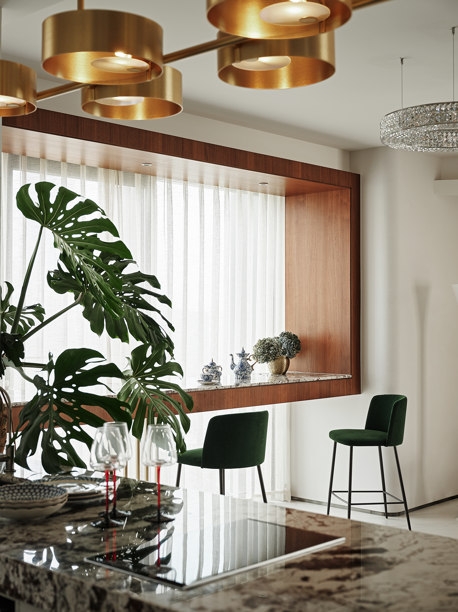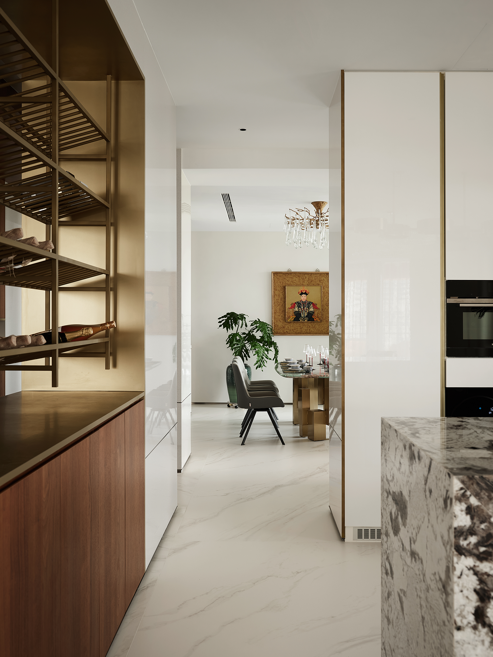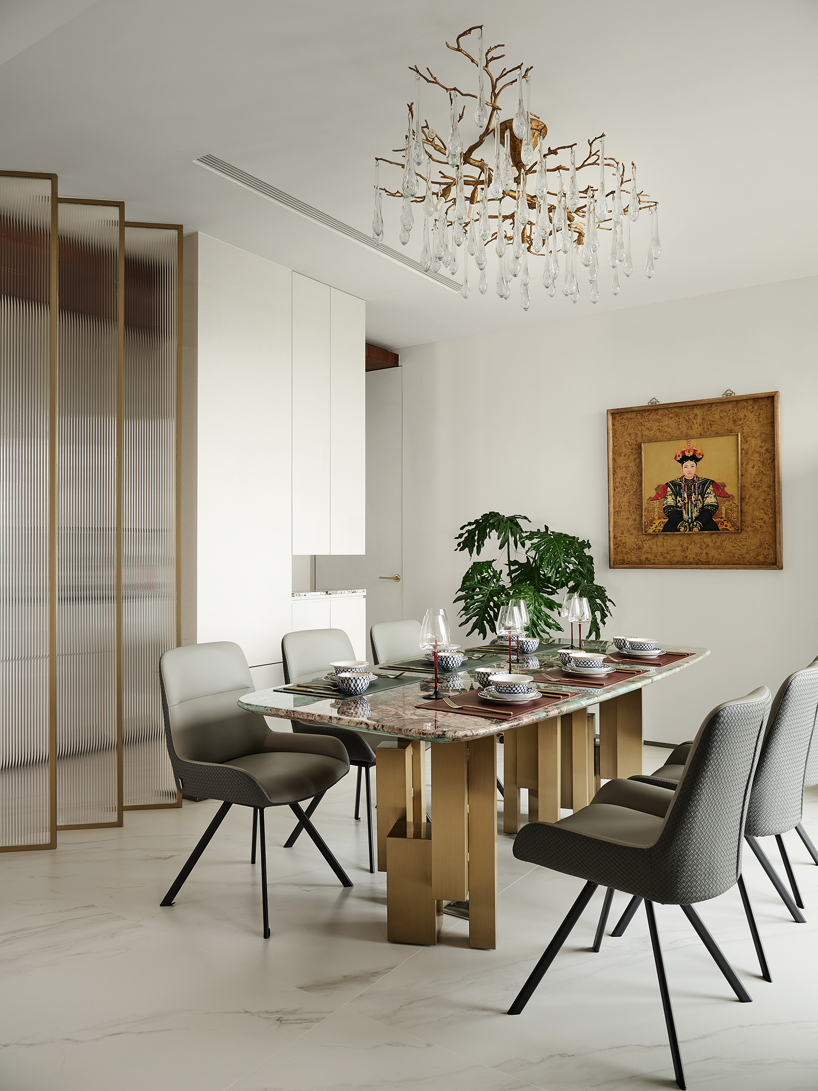 经过对整个空间的重新梳理和规划,我们创造了开阔而灵活的动线,入户设立中式古董端景,进而考虑了两条分支动线,一条是休闲通道,一条是餐娱通道.同时又是环绕型通道。