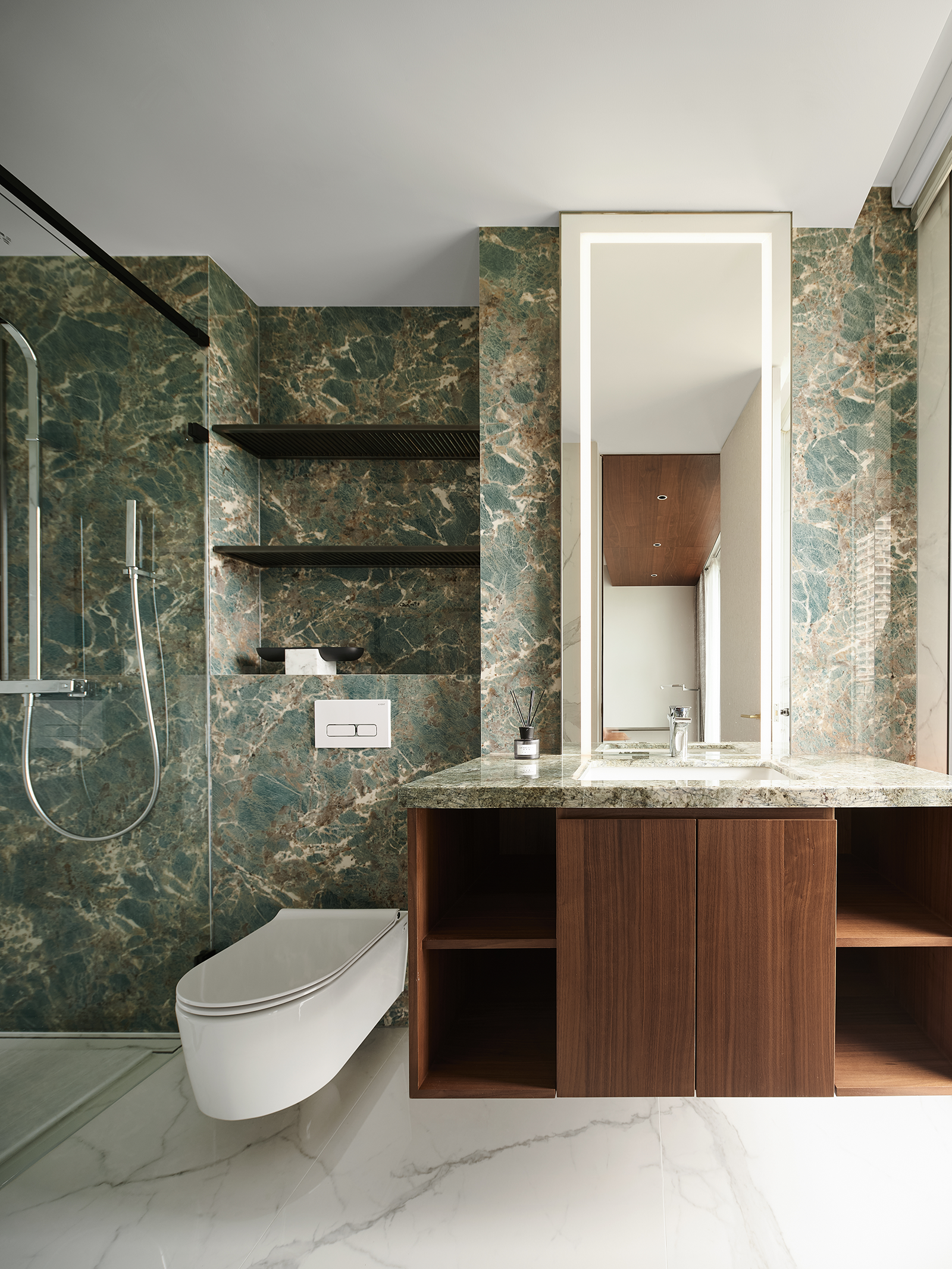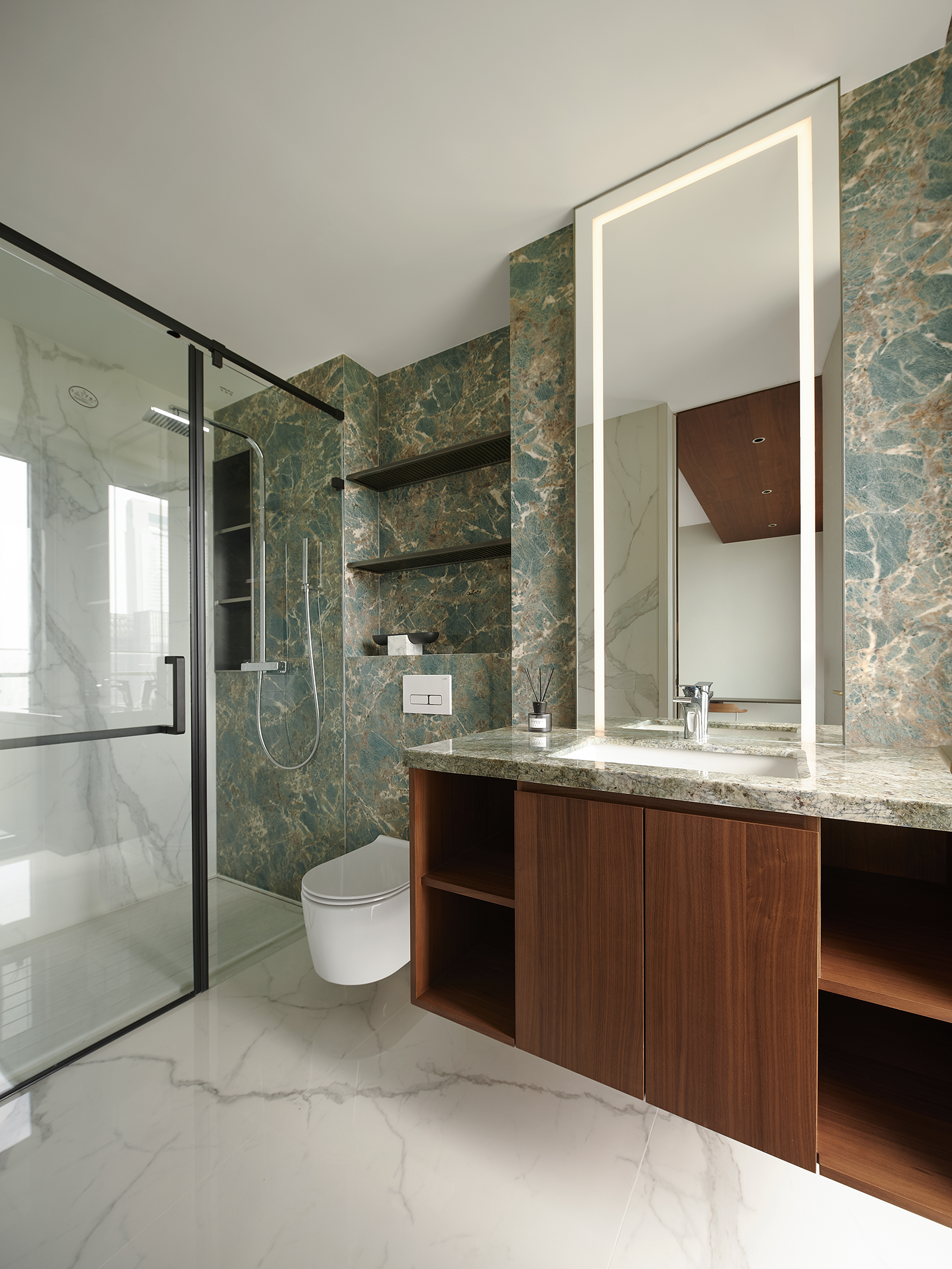 木作上木蜡油、柜体面板采用免漆工艺、使用岩板及多层实木复合地板。
